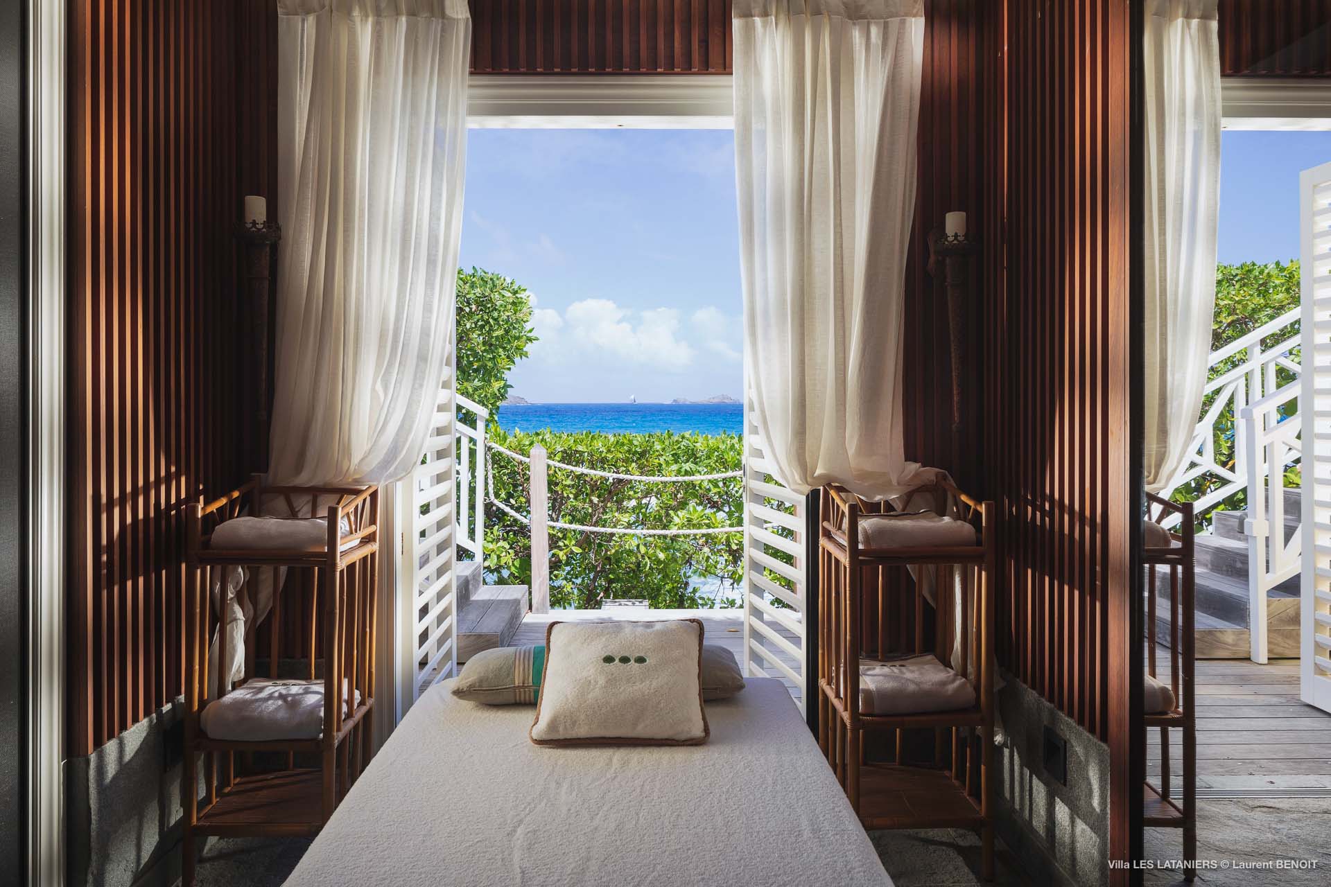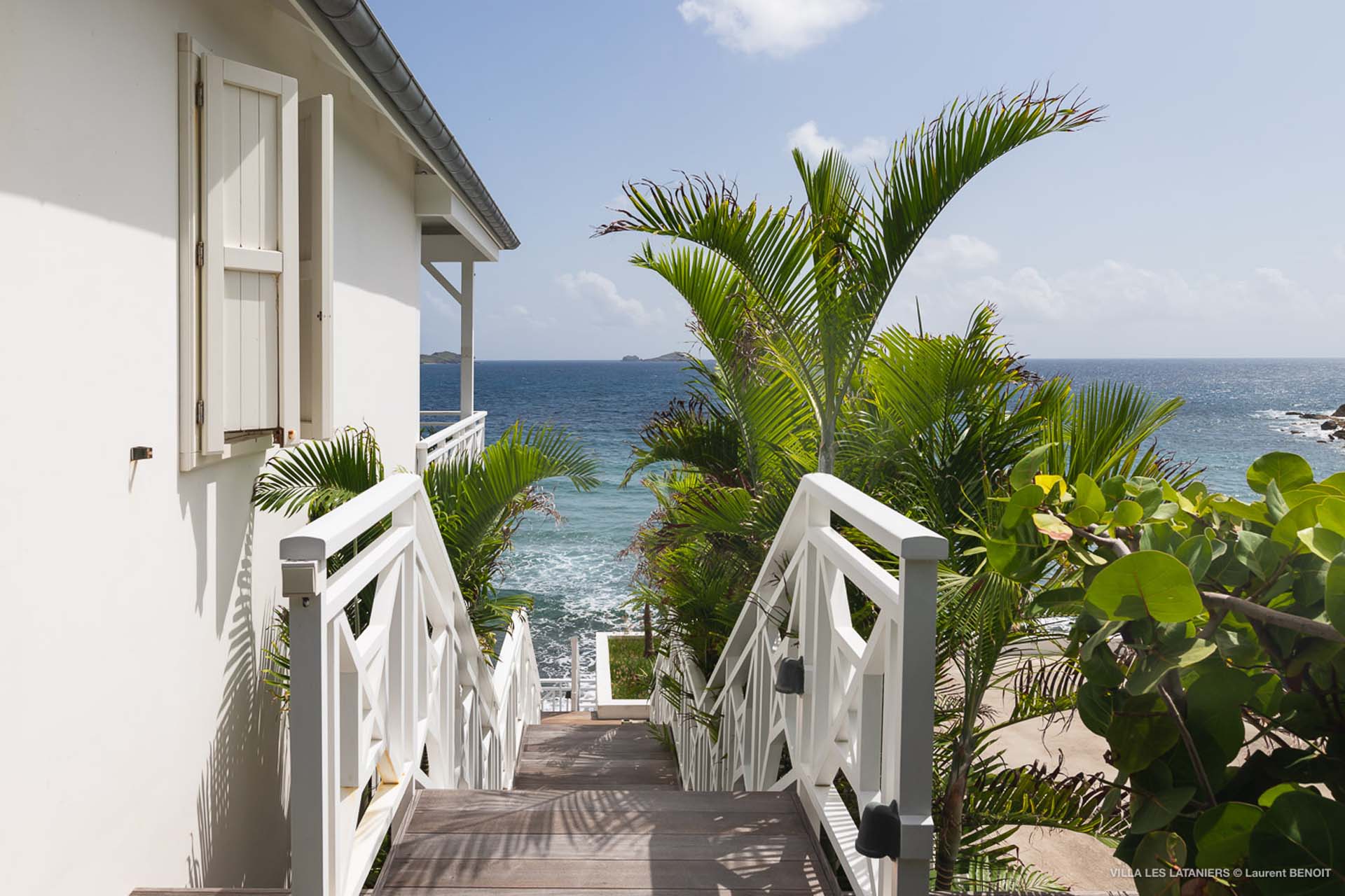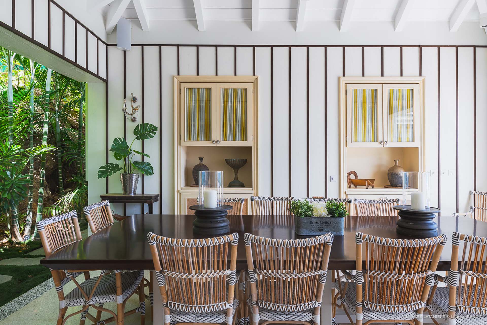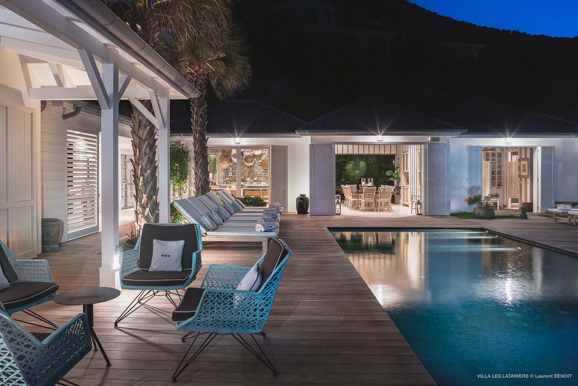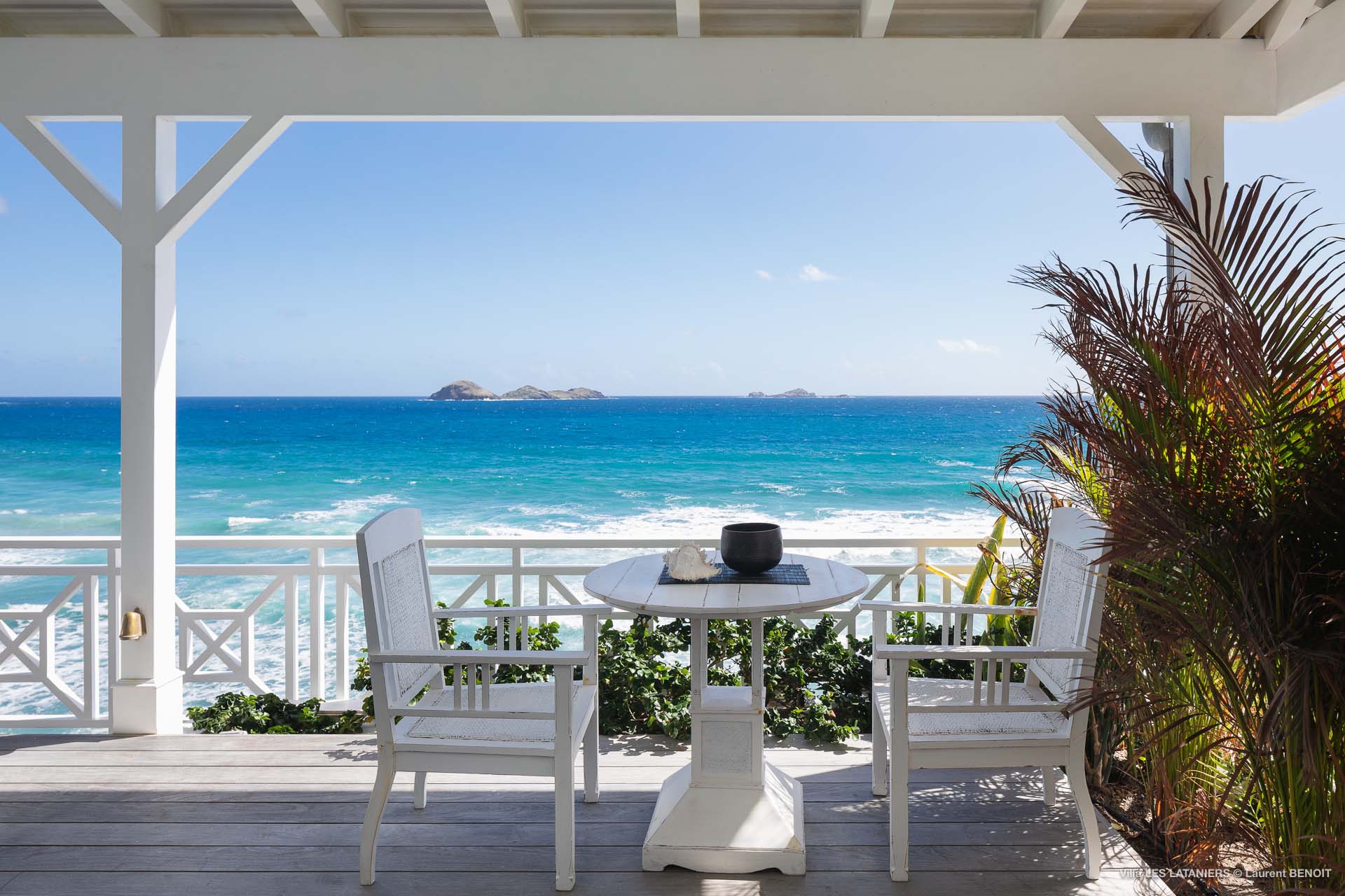 Villa Les Lataniers, (villa code: WV LAT) is a 6+1-bedroom villa located in Anse des Lezards. Perched just above the Anse des Lezards Bay, this large colonial-style estate enjoys panoramic views of the bay and hillsides. The interior features original artwork and memorabilia from around the world. Situated just off the pool is the dining room, which can be fully opened on both sides to tropical breezes. The dining room opens to the well-equipped, modern kitchen with a wood pizza oven. This room can also be closed off and air-conditioned. A covered passage leads to the fully air-conditioned main room, which has a sitting area, TV area, and dining area with seating for up to 8 guests. Located next to the living room is the air-conditioned master bedroom, which has a king-size bed, an en suite bathroom with a shower and oversized bathtub, and a private terrace with ample seating and a large hot tub facing the ocean view. Situated behind the pool house is a second bedroom, which has a European king-size bed, a dressing area, a large granite bathtub with ocean views, and both an indoor and outdoor shower. The remaining 4 bedrooms and a small staff room are located downstairs. Three bedrooms have European king-size beds, exterior access, and ensuite bathrooms, each with a tub and shower. The sixth bedroom has twin beds, a sofa bed, and an ensuite bathroom with a tub and shower, while the staff bedroom has a single twin-size bed, an ensuite bathroom with a shower, exterior access, and a small TV room with a sleep sofa. Each bedroom has screens. A deck with a small bar and loungers frame the heated infinity pool, which has an alarm. Located nearby is a pool house with a shower. The large covered deck features ample seating and a daybed (perfect for lounging). During the Thanksgiving and December holidays, the villa rents at full occupancy rates regardless of how many bedrooms are used.Please fill out the form to begin your inquiry and we will connect you with a seasoned villa rental specialist.