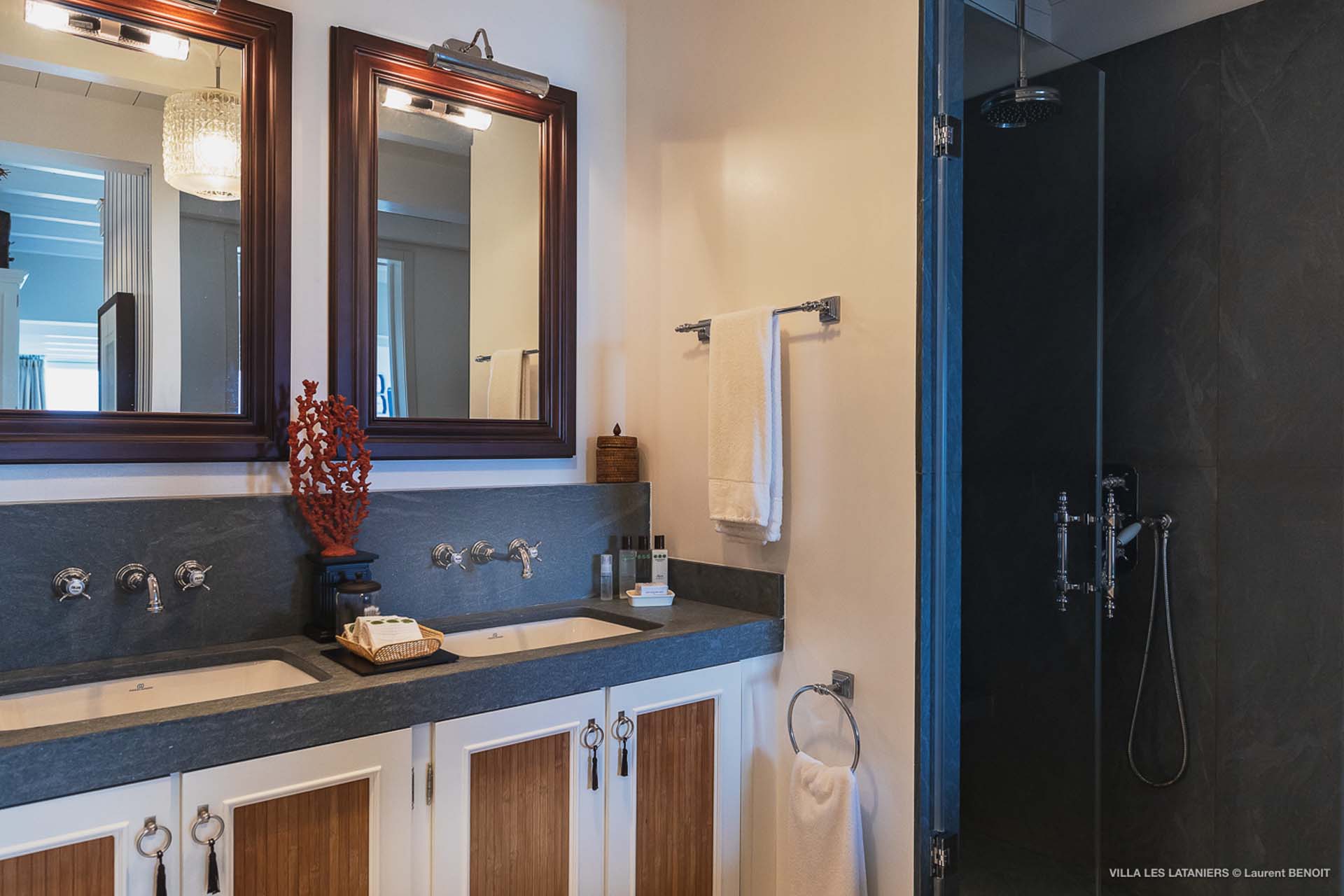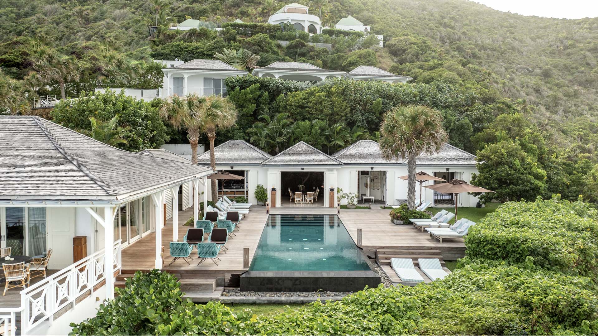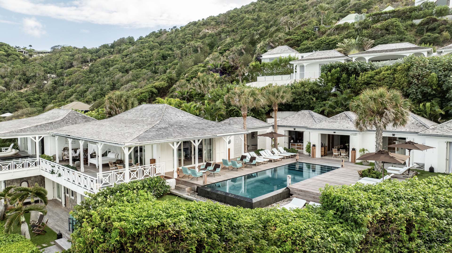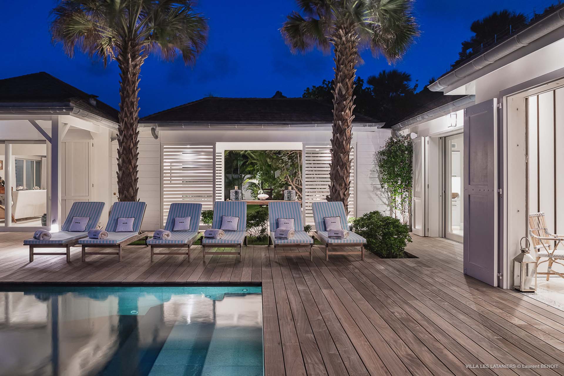 Villa Les Lataniers, (villa code: WV LAT) is a 6+1-bedroom villa located in Anse des Lezards. Perched just above the Anse des Lezards Bay, this large colonial-style estate enjoys panoramic views of the bay and hillsides. The interior features original artwork and memorabilia from around the world. Situated just off the pool is the dining room, which can be fully opened on both sides to tropical breezes. The dining room opens to the well-equipped, modern kitchen with a wood pizza oven. This room can also be closed off and air-conditioned. A covered passage leads to the fully air-conditioned main room, which has a sitting area, TV area, and dining area with seating for up to 8 guests. Located next to the living room is the air-conditioned master bedroom, which has a king-size bed, an en suite bathroom with a shower and oversized bathtub, and a private terrace with ample seating and a large hot tub facing the ocean view. Situated behind the pool house is a second bedroom, which has a European king-size bed, a dressing area, a large granite bathtub with ocean views, and both an indoor and outdoor shower. The remaining 4 bedrooms and a small staff room are located downstairs. Three bedrooms have European king-size beds, exterior access, and ensuite bathrooms, each with a tub and shower. The sixth bedroom has twin beds, a sofa bed, and an ensuite bathroom with a tub and shower, while the staff bedroom has a single twin-size bed, an ensuite bathroom with a shower, exterior access, and a small TV room with a sleep sofa. Each bedroom has screens. A deck with a small bar and loungers frame the heated infinity pool, which has an alarm. Located nearby is a pool house with a shower. The large covered deck features ample seating and a daybed (perfect for lounging). During the Thanksgiving and December holidays, the villa rents at full occupancy rates regardless of how many bedrooms are used.Please fill out the form to begin your inquiry and we will connect you with a seasoned villa rental specialist.