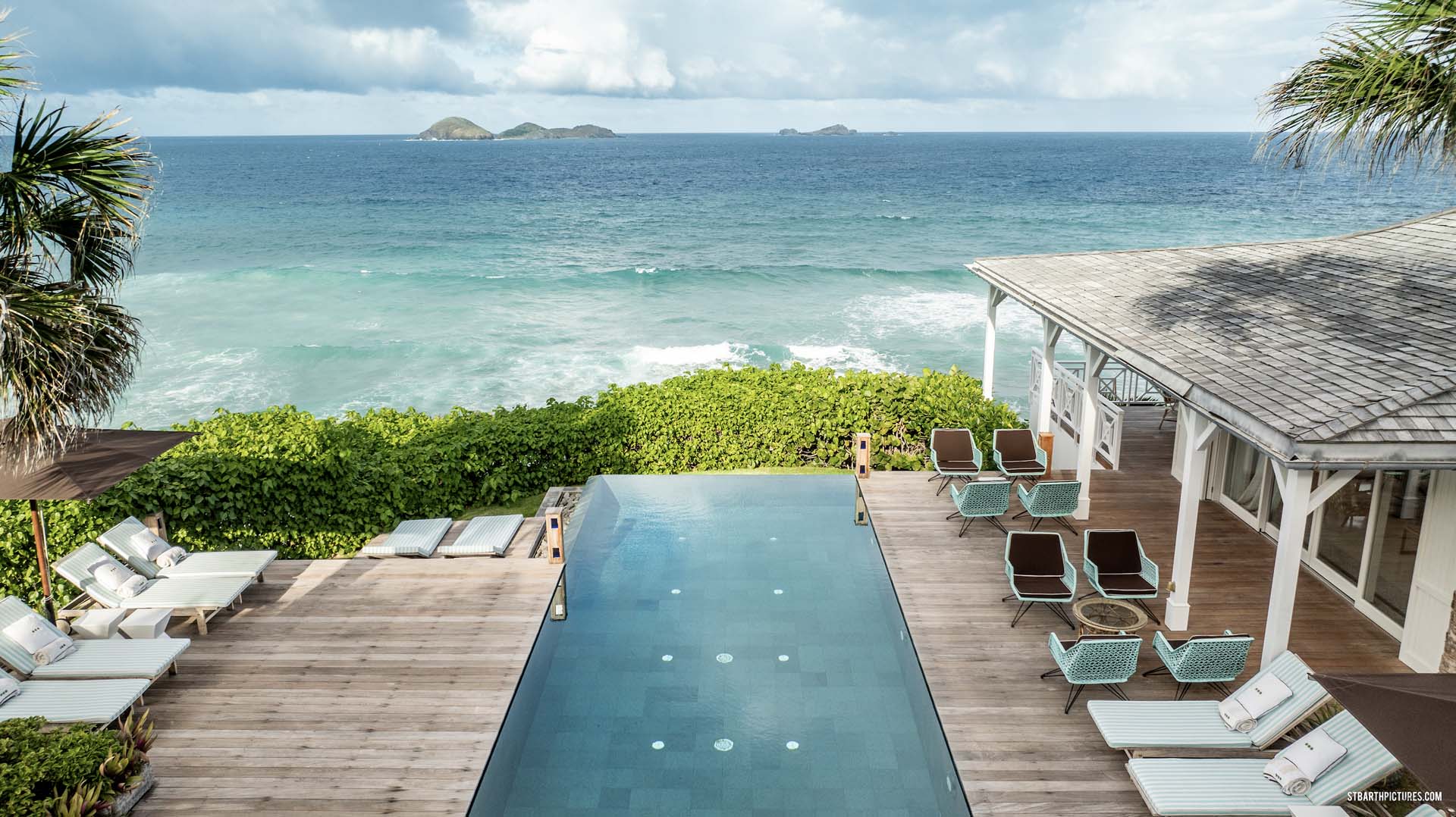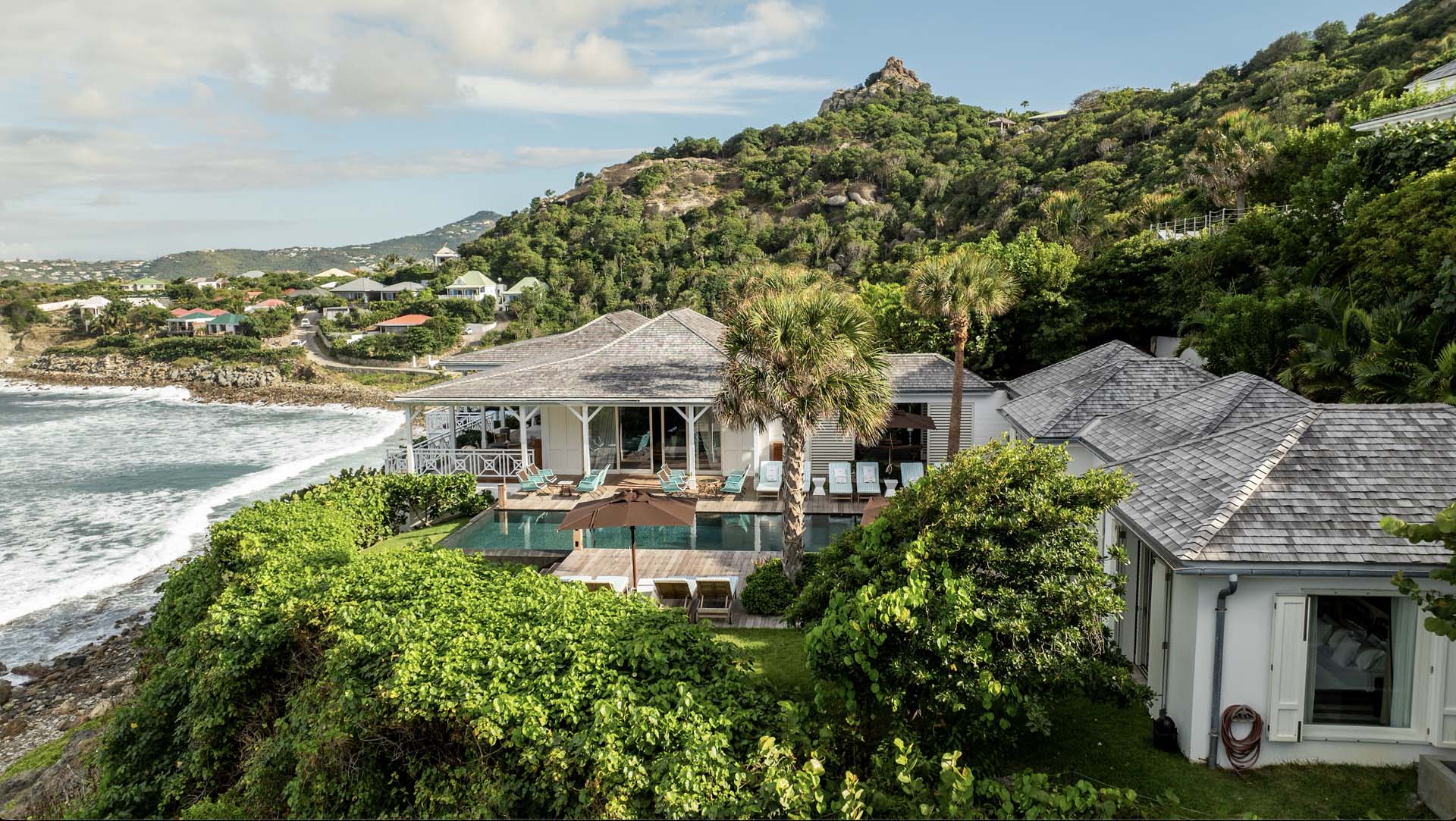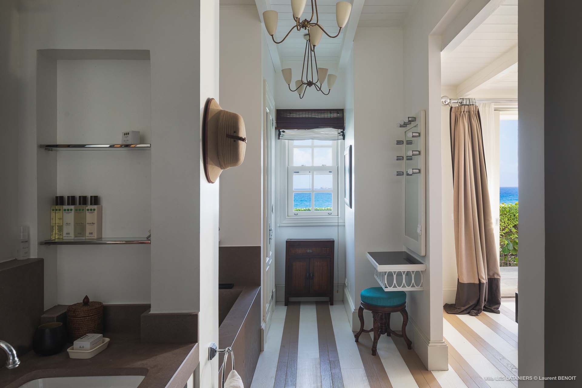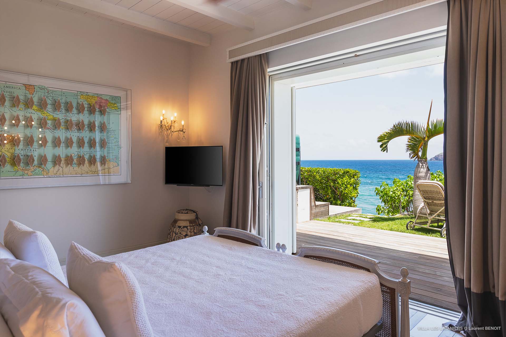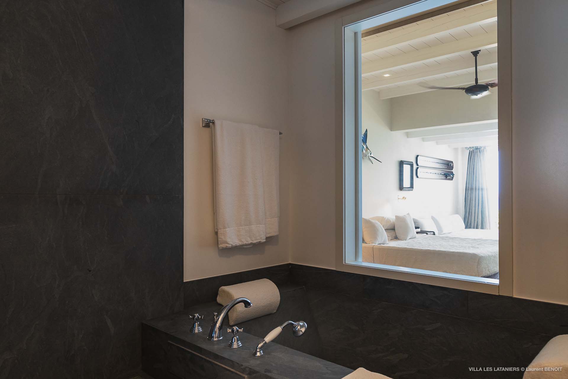 Villa Les Lataniers, (villa code: WV LAT) is a 6+1-bedroom villa located in Anse des Lezards. Perched just above the Anse des Lezards Bay, this large colonial-style estate enjoys panoramic views of the bay and hillsides. The interior features original artwork and memorabilia from around the world. Situated just off the pool is the dining room, which can be fully opened on both sides to tropical breezes. The dining room opens to the well-equipped, modern kitchen with a wood pizza oven. This room can also be closed off and air-conditioned. A covered passage leads to the fully air-conditioned main room, which has a sitting area, TV area, and dining area with seating for up to 8 guests. Located next to the living room is the air-conditioned master bedroom, which has a king-size bed, an en suite bathroom with a shower and oversized bathtub, and a private terrace with ample seating and a large hot tub facing the ocean view. Situated behind the pool house is a second bedroom, which has a European king-size bed, a dressing area, a large granite bathtub with ocean views, and both an indoor and outdoor shower. The remaining 4 bedrooms and a small staff room are located downstairs. Three bedrooms have European king-size beds, exterior access, and ensuite bathrooms, each with a tub and shower. The sixth bedroom has twin beds, a sofa bed, and an ensuite bathroom with a tub and shower, while the staff bedroom has a single twin-size bed, an ensuite bathroom with a shower, exterior access, and a small TV room with a sleep sofa. Each bedroom has screens. A deck with a small bar and loungers frame the heated infinity pool, which has an alarm. Located nearby is a pool house with a shower. The large covered deck features ample seating and a daybed (perfect for lounging). During the Thanksgiving and December holidays, the villa rents at full occupancy rates regardless of how many bedrooms are used.Please fill out the form to begin your inquiry and we will connect you with a seasoned villa rental specialist.