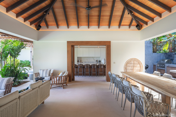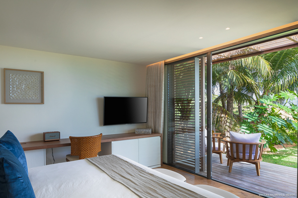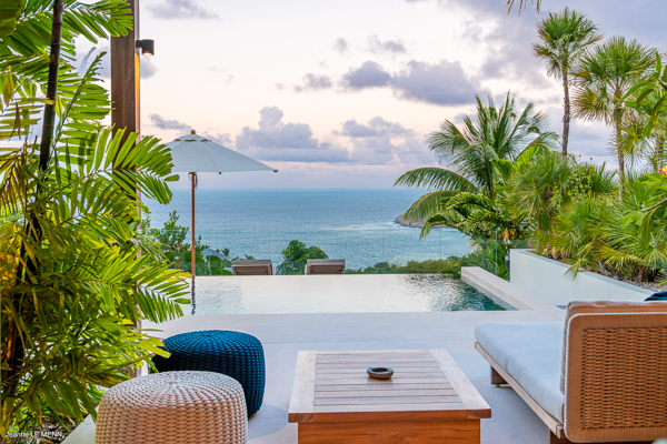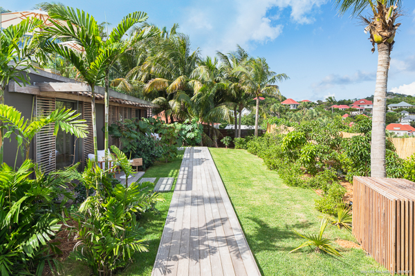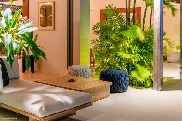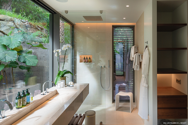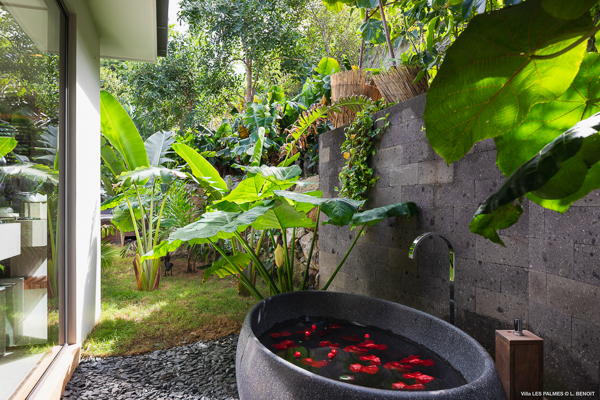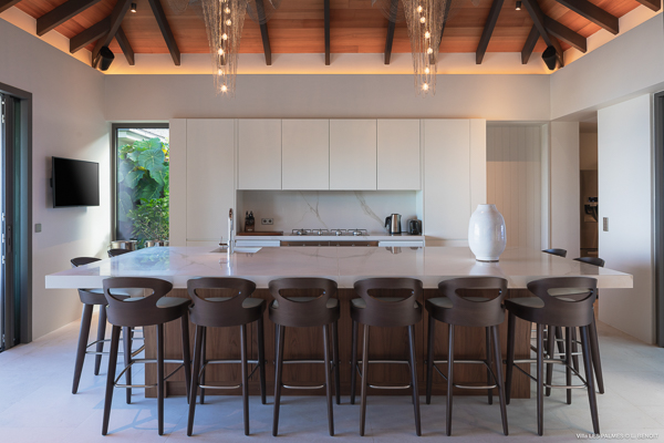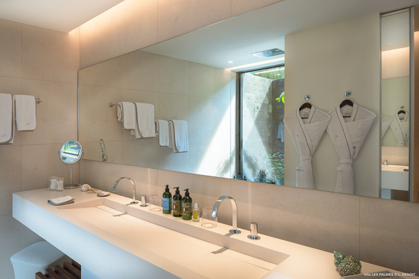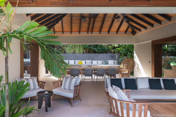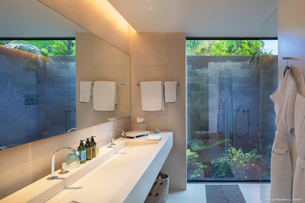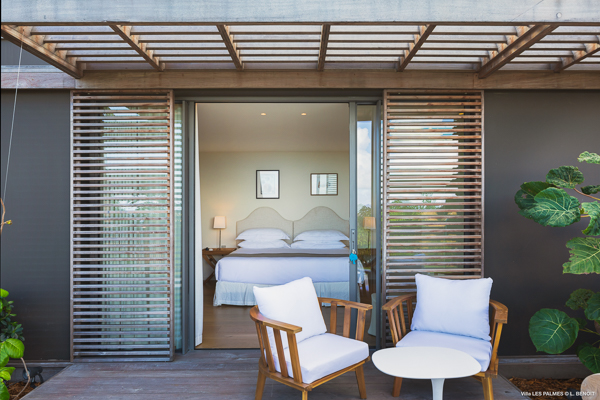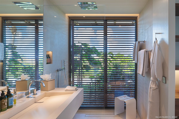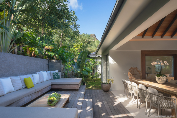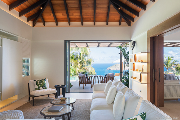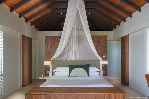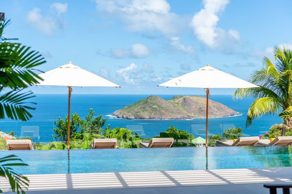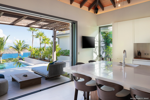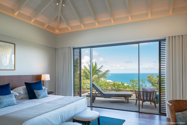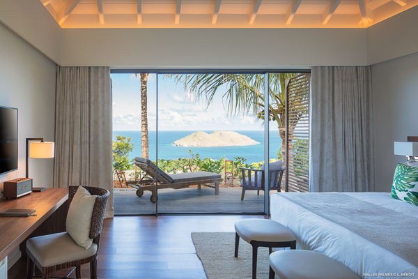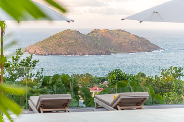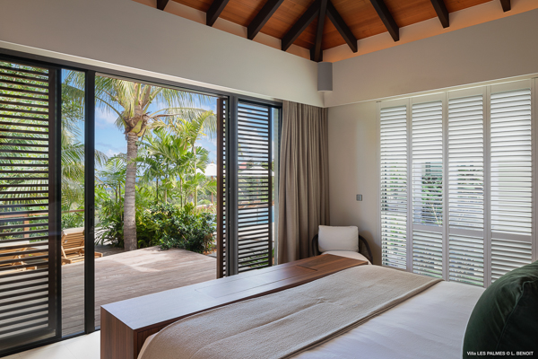 Villa Les Palmes, (villa code: WV LEP) is a newly-built, 5-bedroom villa in the hills of Colombier with lots of privacy and gorgeous ocean views. Villa Les Palmes is situated in Colombier, a short drive from Gustavia and the beach of Flamands. The villa offers generous indoor and outdoor space in a private and calm setting with ocean views. It includes a fitness room and separate massage room. The large, heated pool may be the first thing that catches the eye upon entering, only to be upstaged by the ocean views with the solemn rock of Ile Chevreau breaking the horizon. A large sundeck in front of the pool allows you to benefit from the sun, even in the heart of winter. There is ample seating in the shade at the large, covered outdoor space that separates the living room from the kitchen. A beautiful, solid wooden table can easily seat 12 people, and there is a huge outdoor sofa behind the house that can serve as a daybed for multiple people. The indoor living room offers comfortable seating in an air-conditioned space.The kitchen can also be air-conditioned and has a large island that serves as a breakfast spot, but also as an indoor dining table for 12. The kitchen is fully equipped and is great for the amateur, as well as a professional chef (which your concierge can arrange for you). The first bedroom is situated in a separate bungalow behind the living room with a private terrace and seating out front. This bedroom has a U.S. king-sized bed, a large dressing, and ensuite bathroom with a shower that can be opened up to the private garden in the back, and where a solid granite bathtub invites guests amongst the tropical vegetation. The four additional bedrooms are situated in a separate unit next to the entrance and are similar in size and amenities. Two bedrooms are situated on the main level, with the other two just below. Each level has one bedroom with a U.S. king-sized bed and one with two twin beds that can be made up as a U.S. king. All rooms have ample closet space and ensuite bathroom with shower. Villa Les Palmes is a great villa for couples vacationing together or for large families.Please fill out the form to begin your inquiry and we will connect you with a seasoned villa rental specialist.