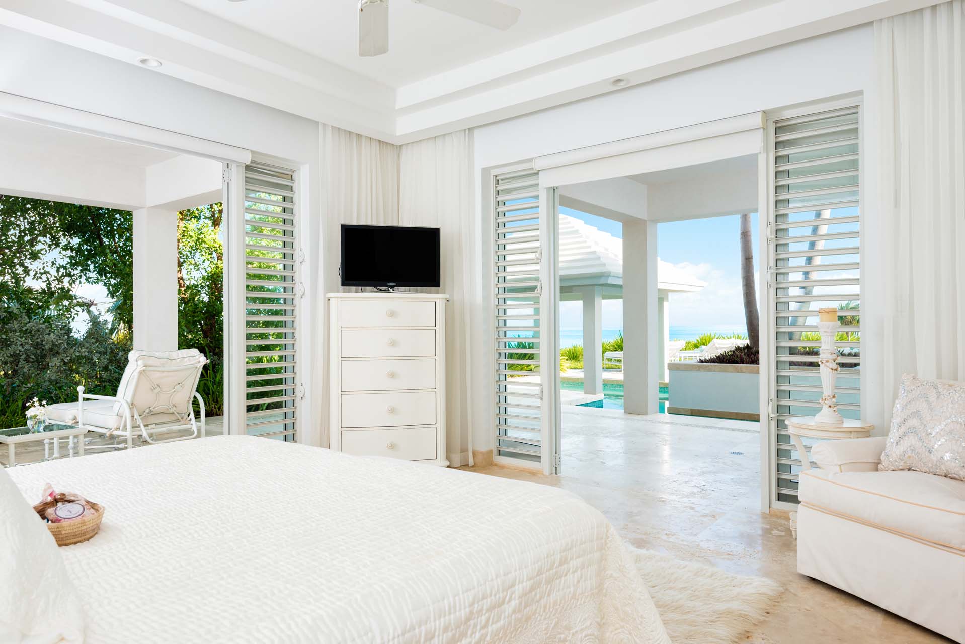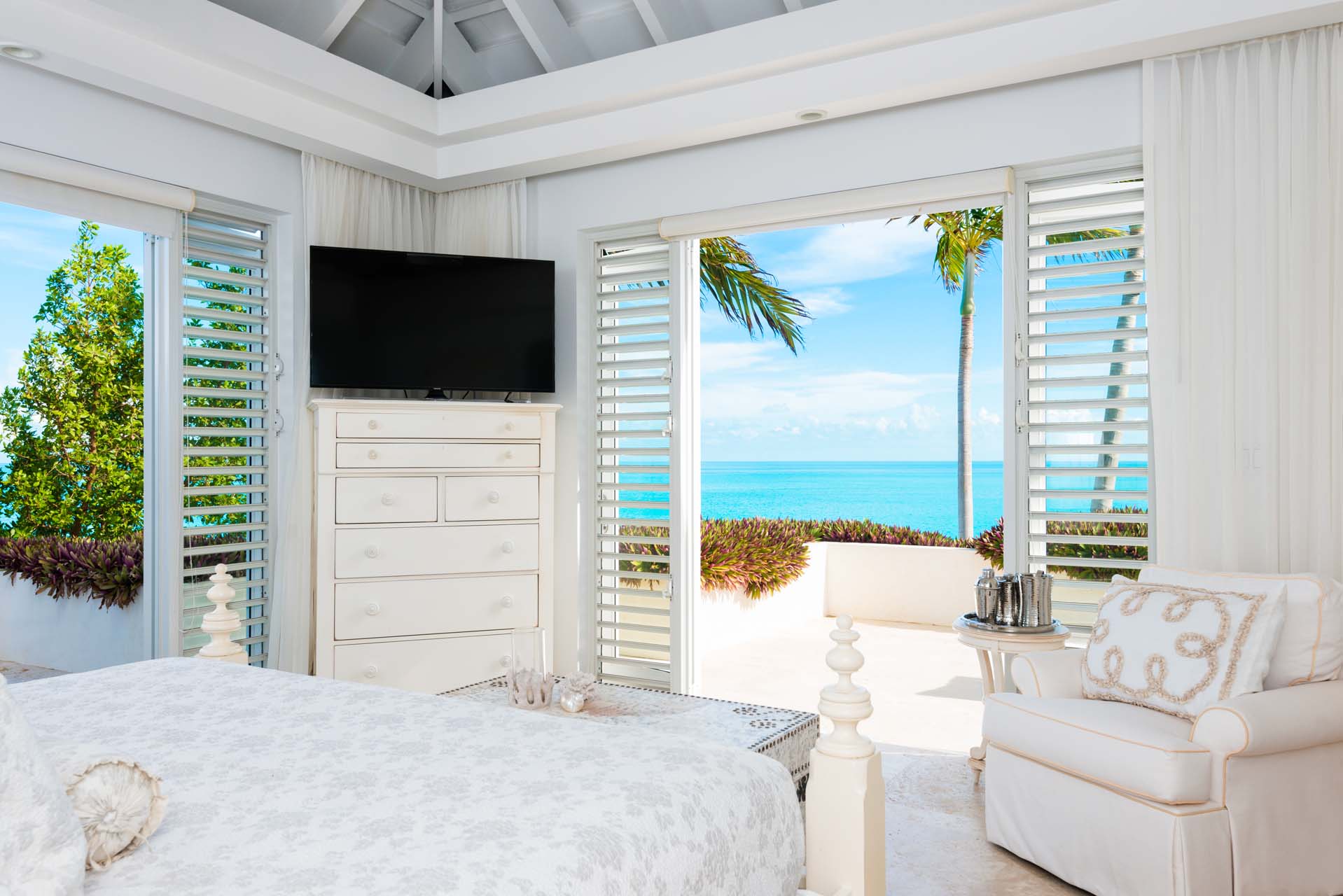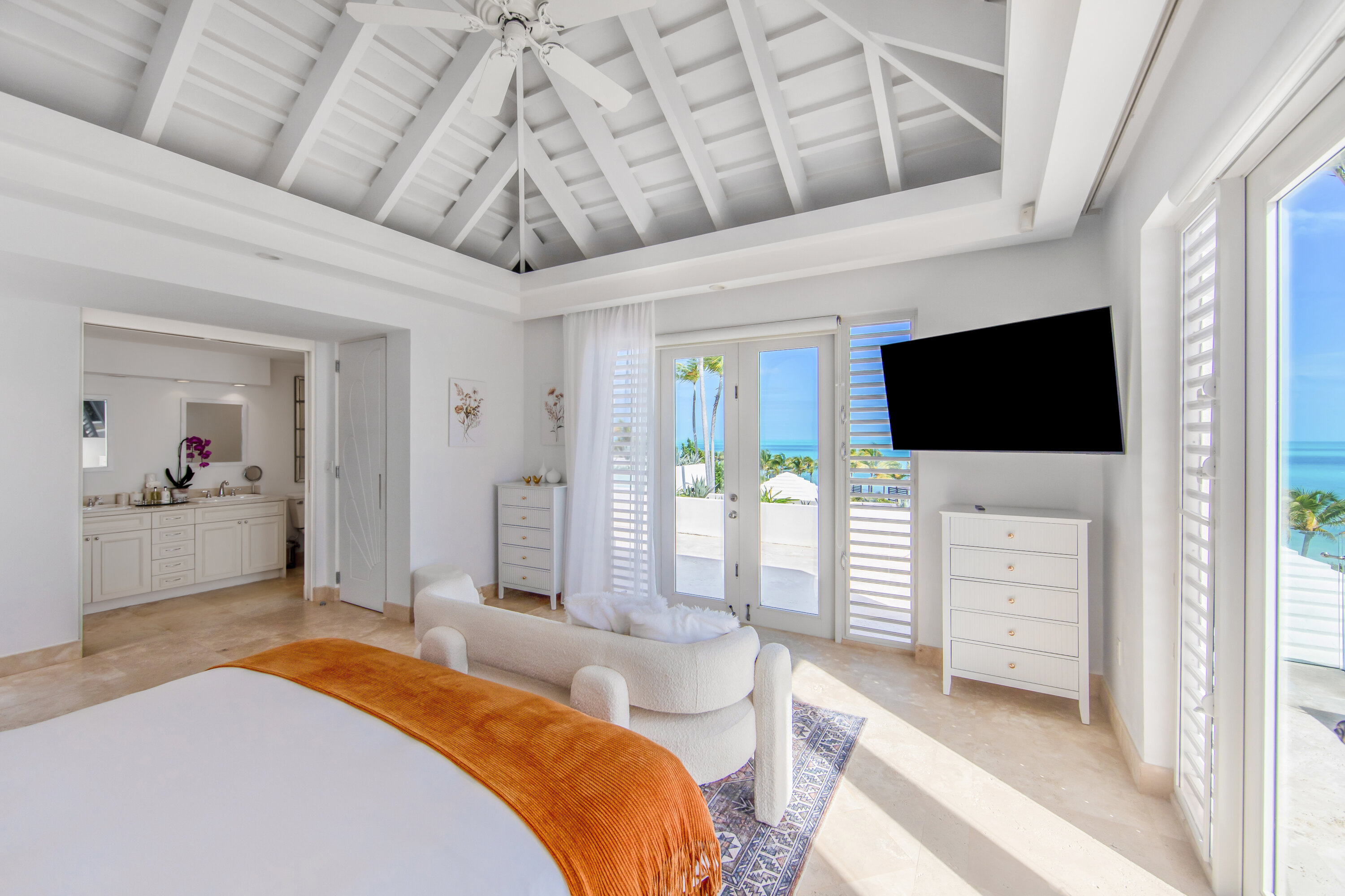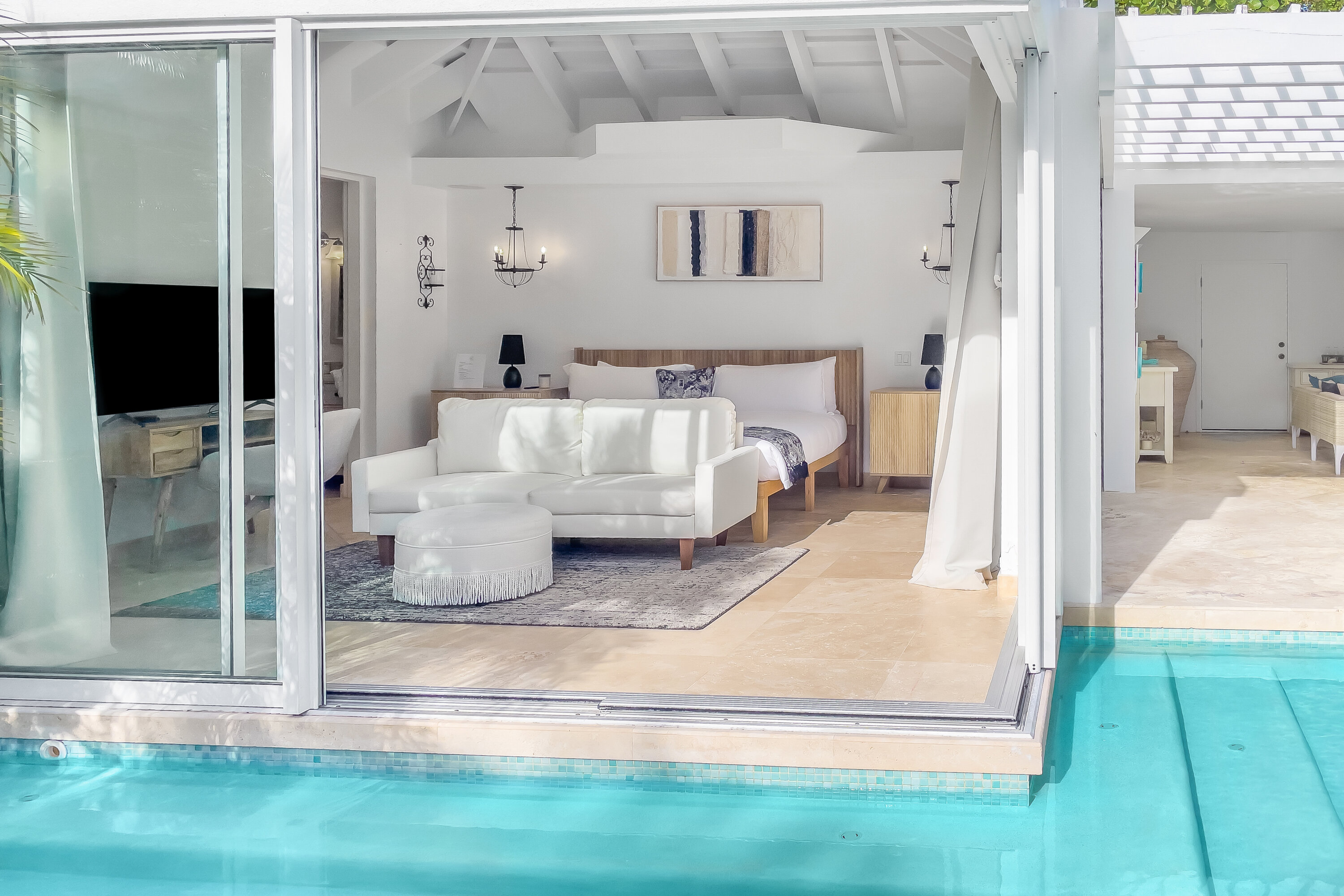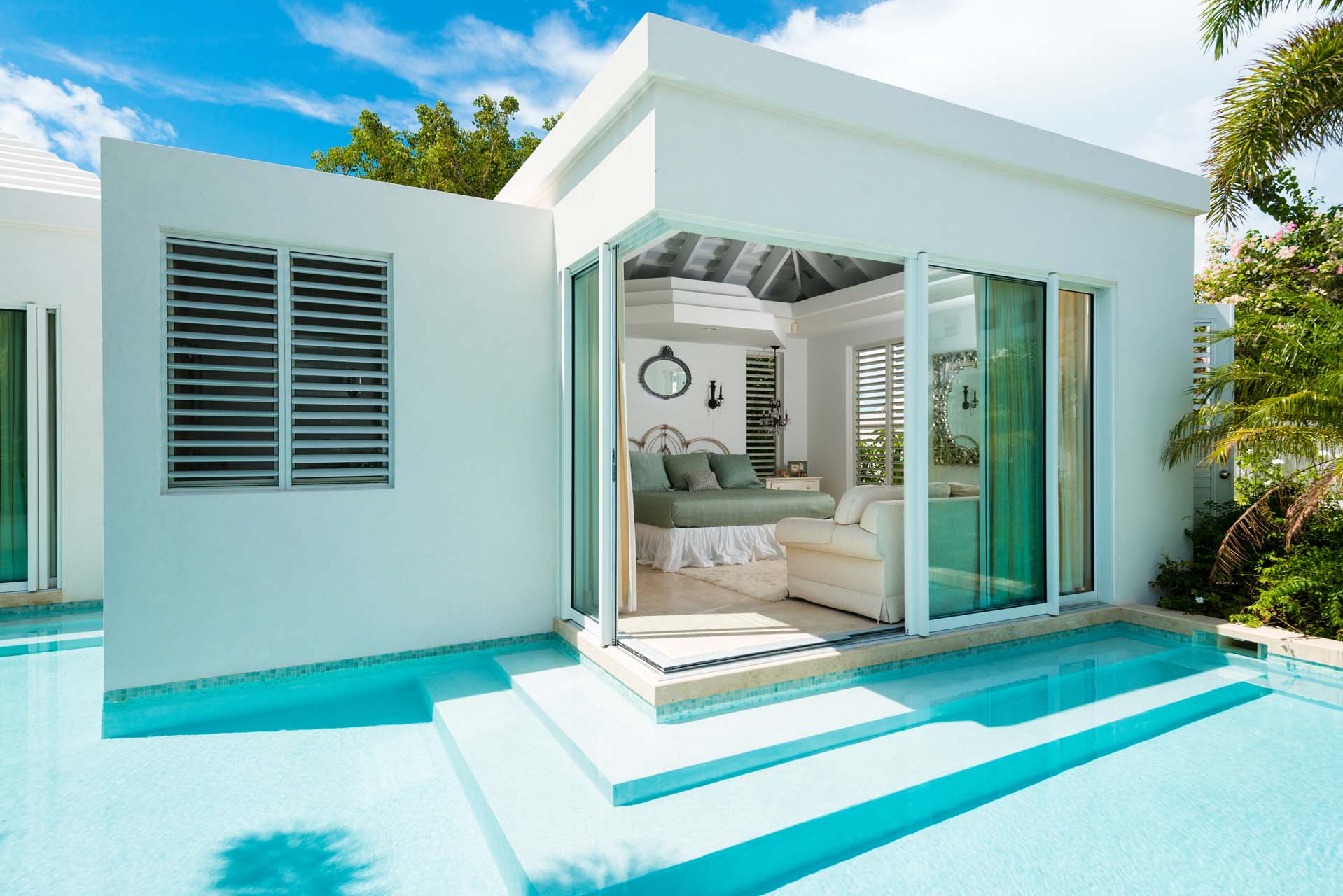 The seven-bedroom suites sleep up to 14 guests. Select suites even open directly onto the pool via private steps. Each suite features double vanities, Smart TVs with Netflix, Apple TV, and cable, ensuring both comfort and convenience. Fall asleep to the soothing sound of waves lapping the shore.