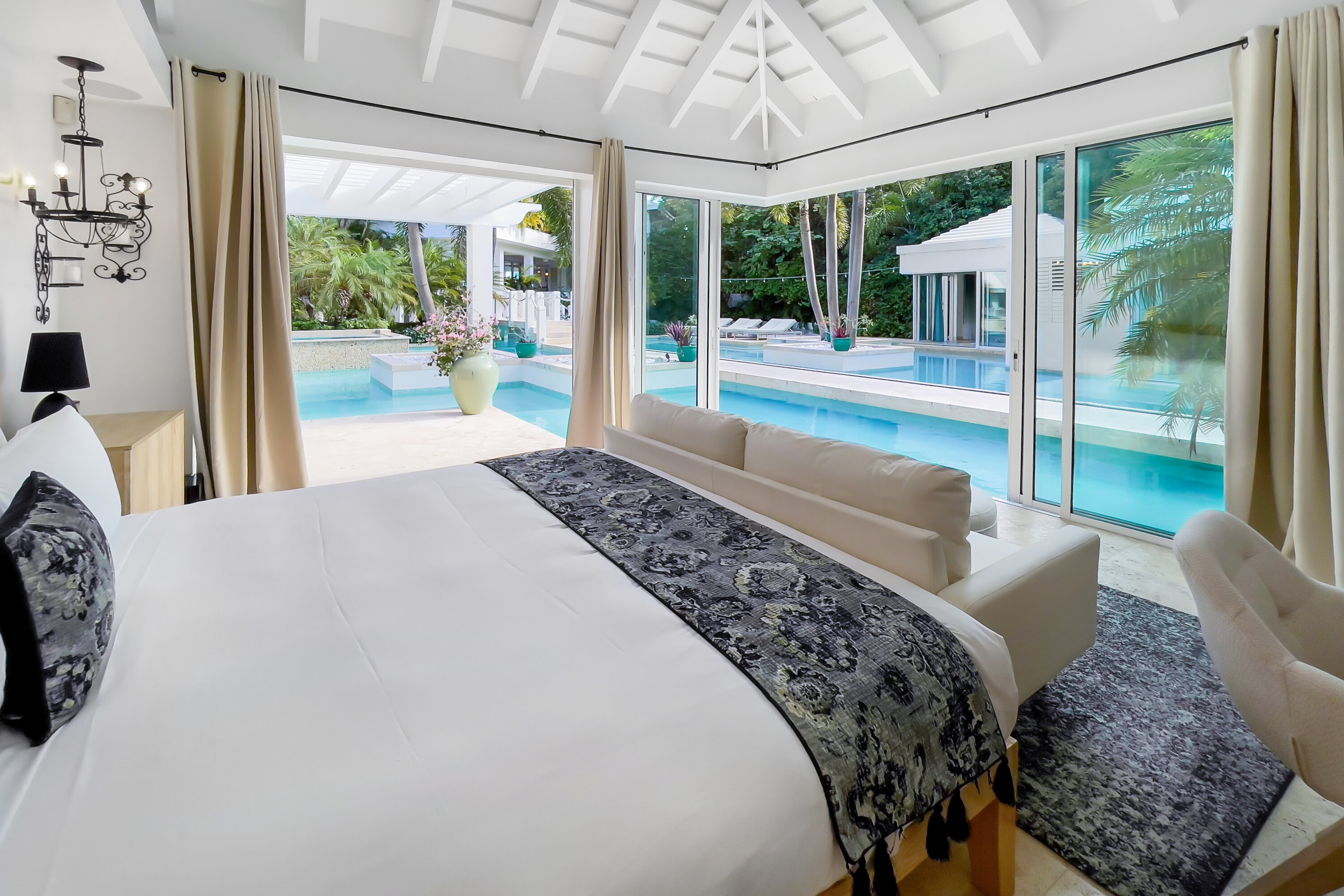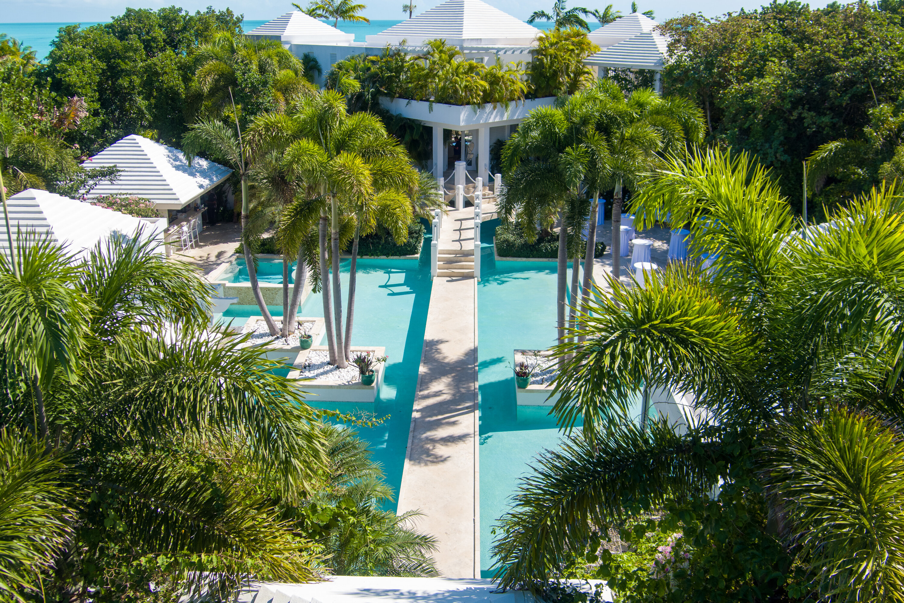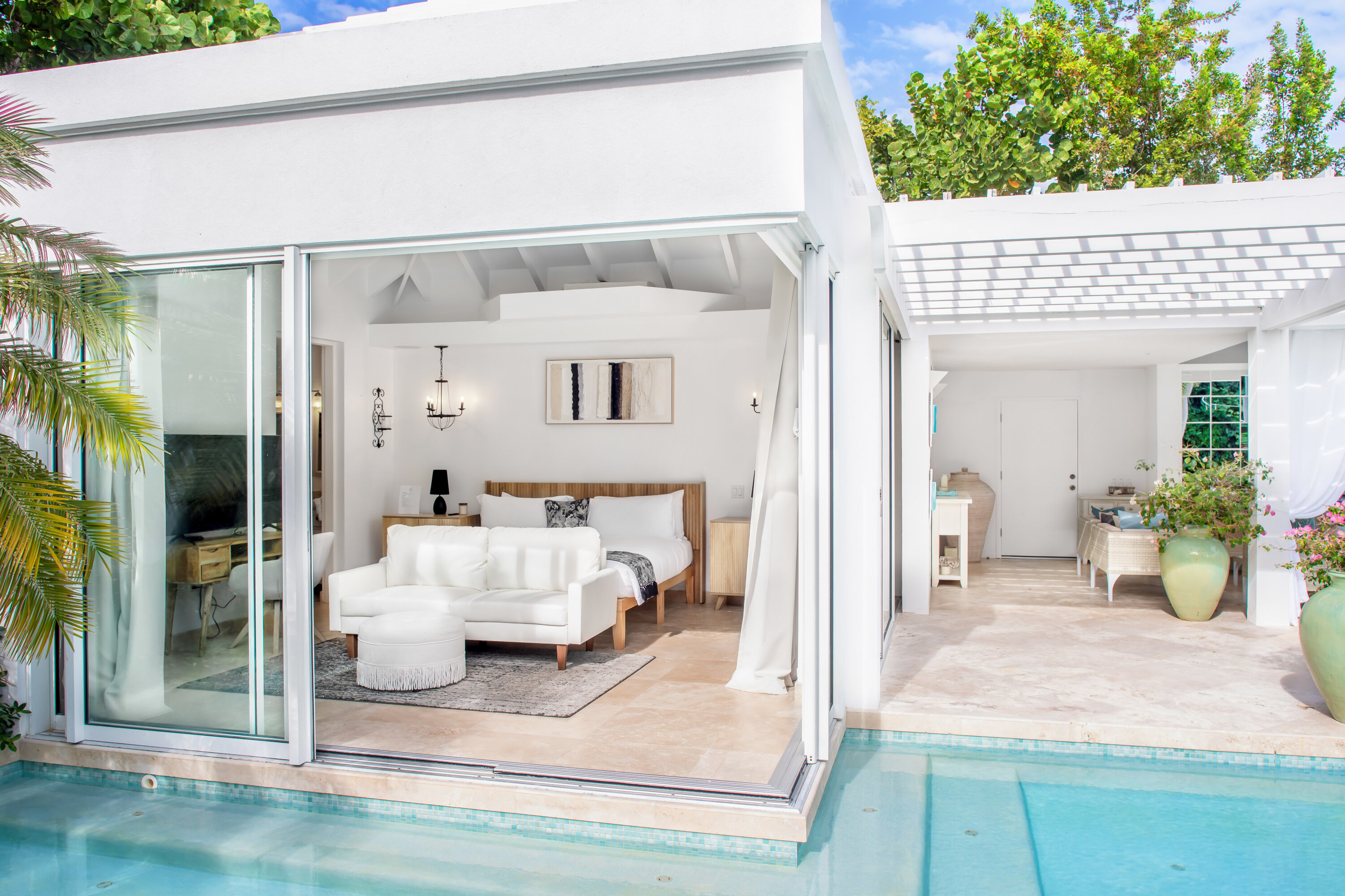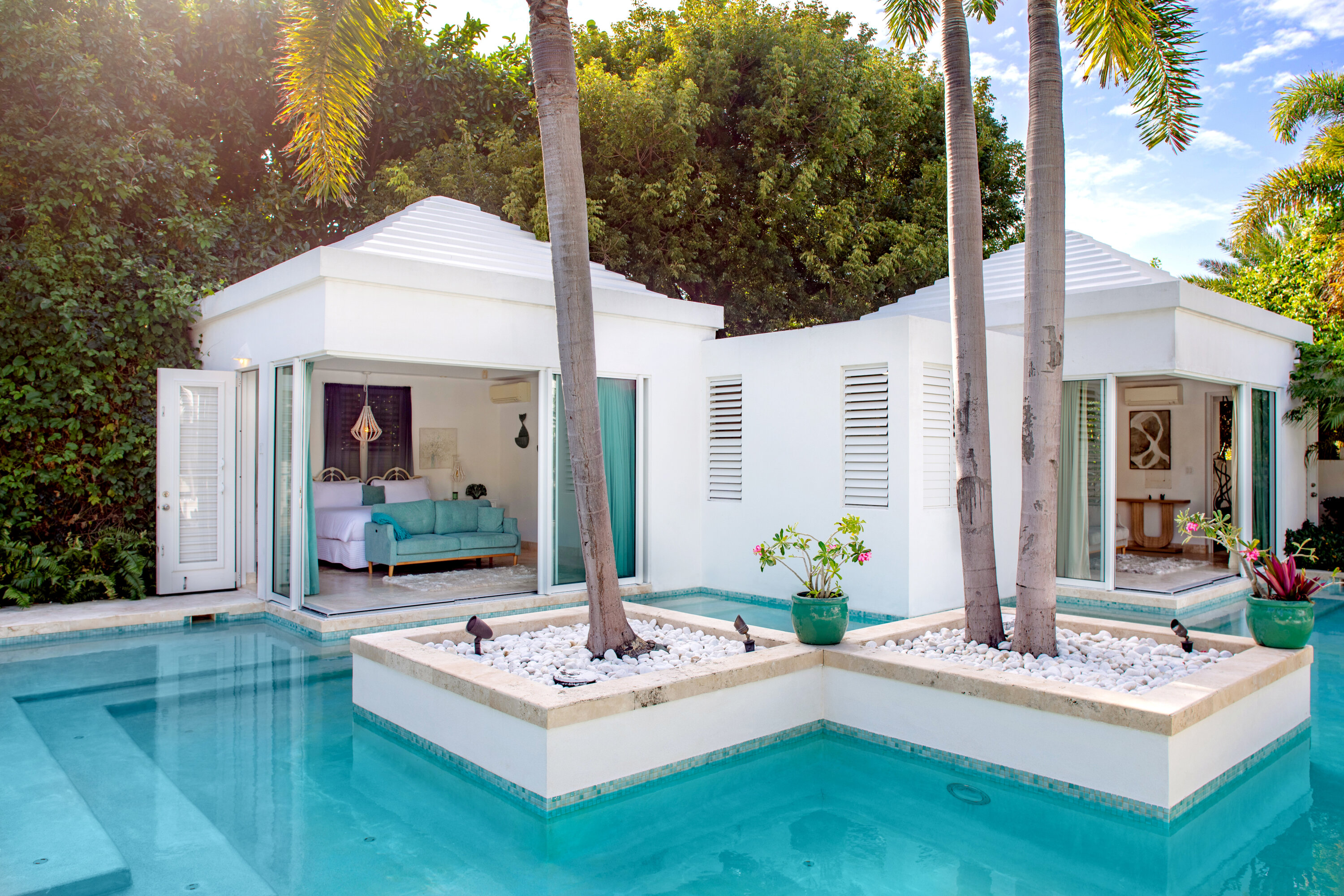 The seven-bedroom suites sleep up to 14 guests. Select suites even open directly onto the pool via private steps. Each suite features double vanities, Smart TVs with Netflix, Apple TV, and cable, ensuring both comfort and convenience. Fall asleep to the soothing sound of waves lapping the shore.