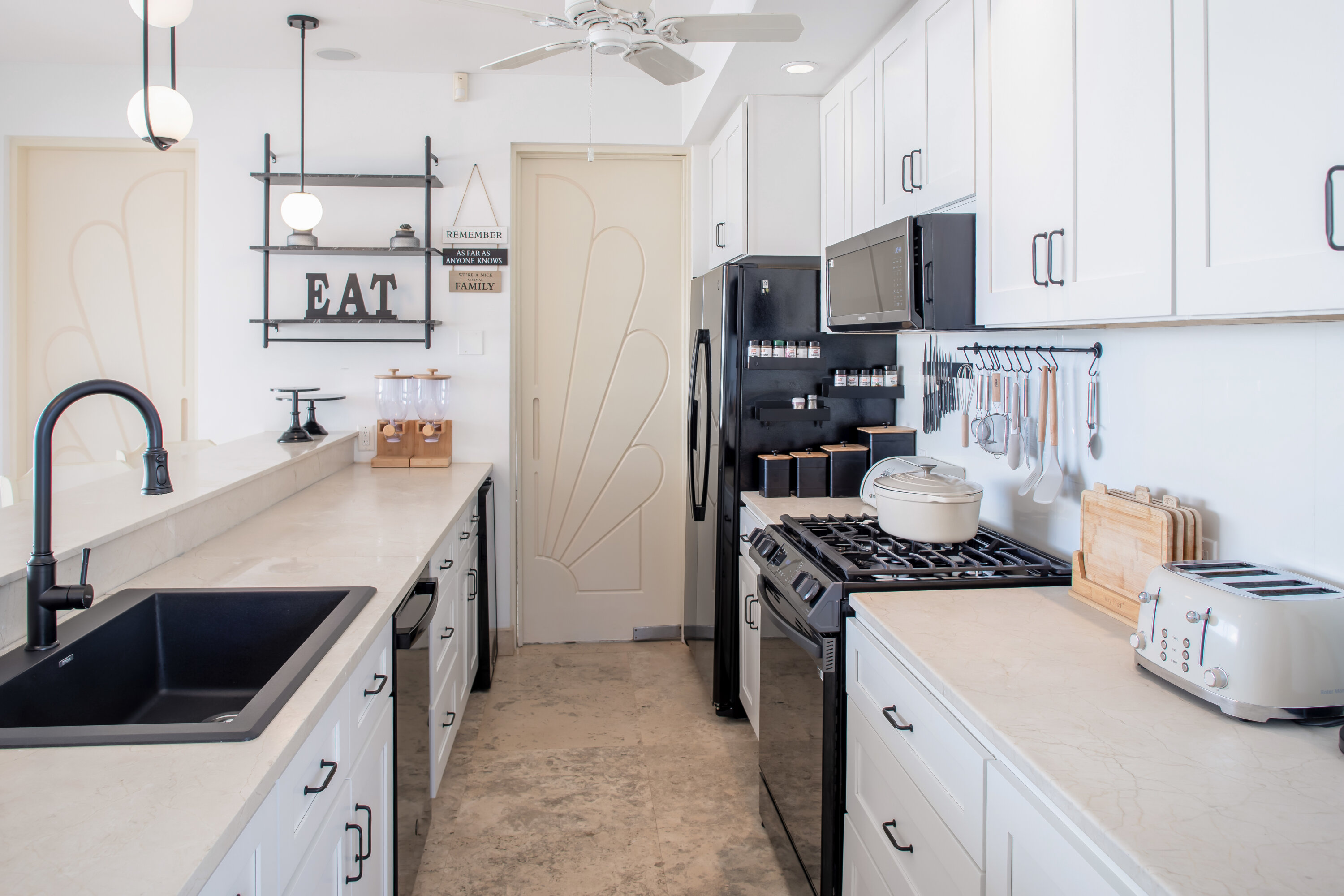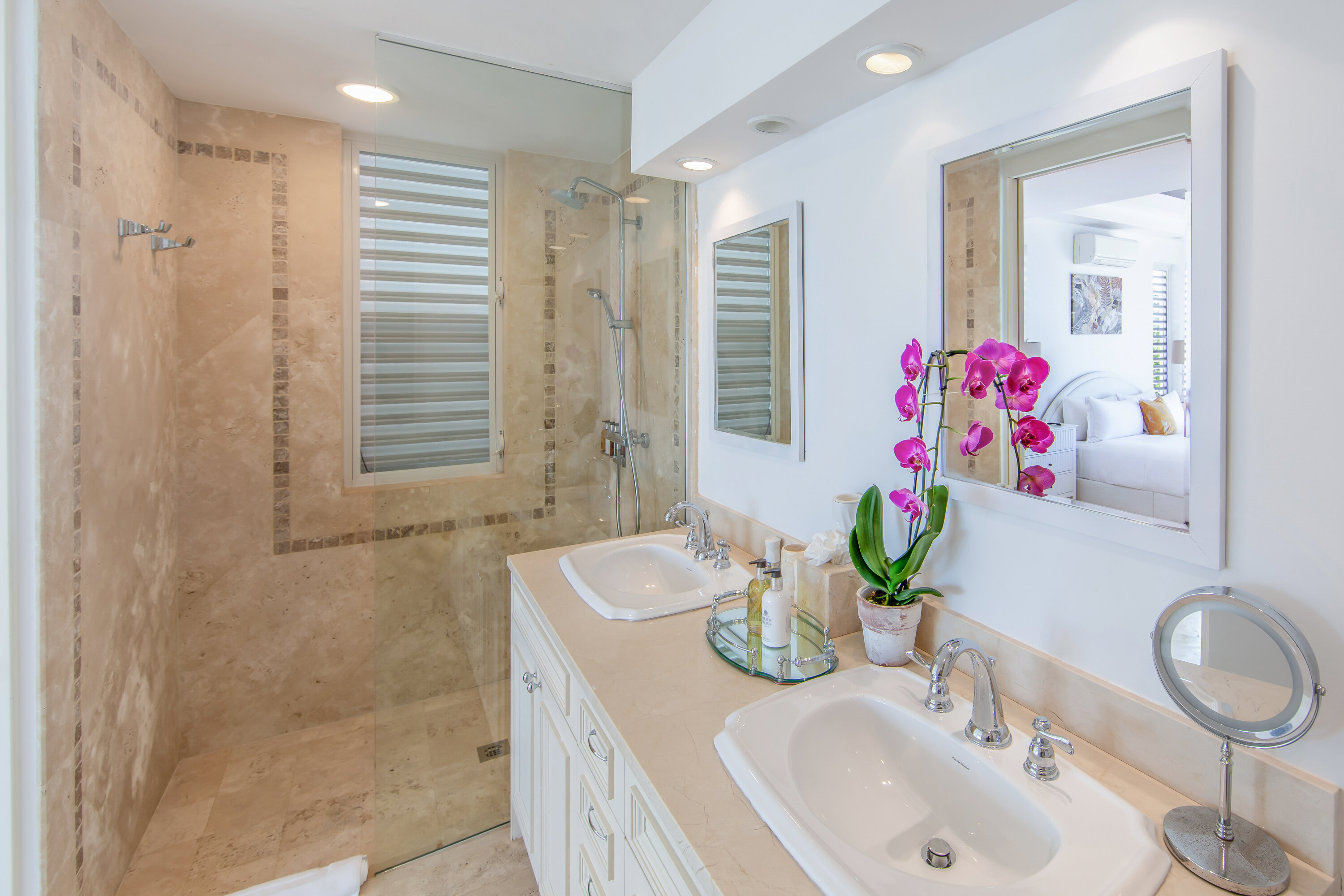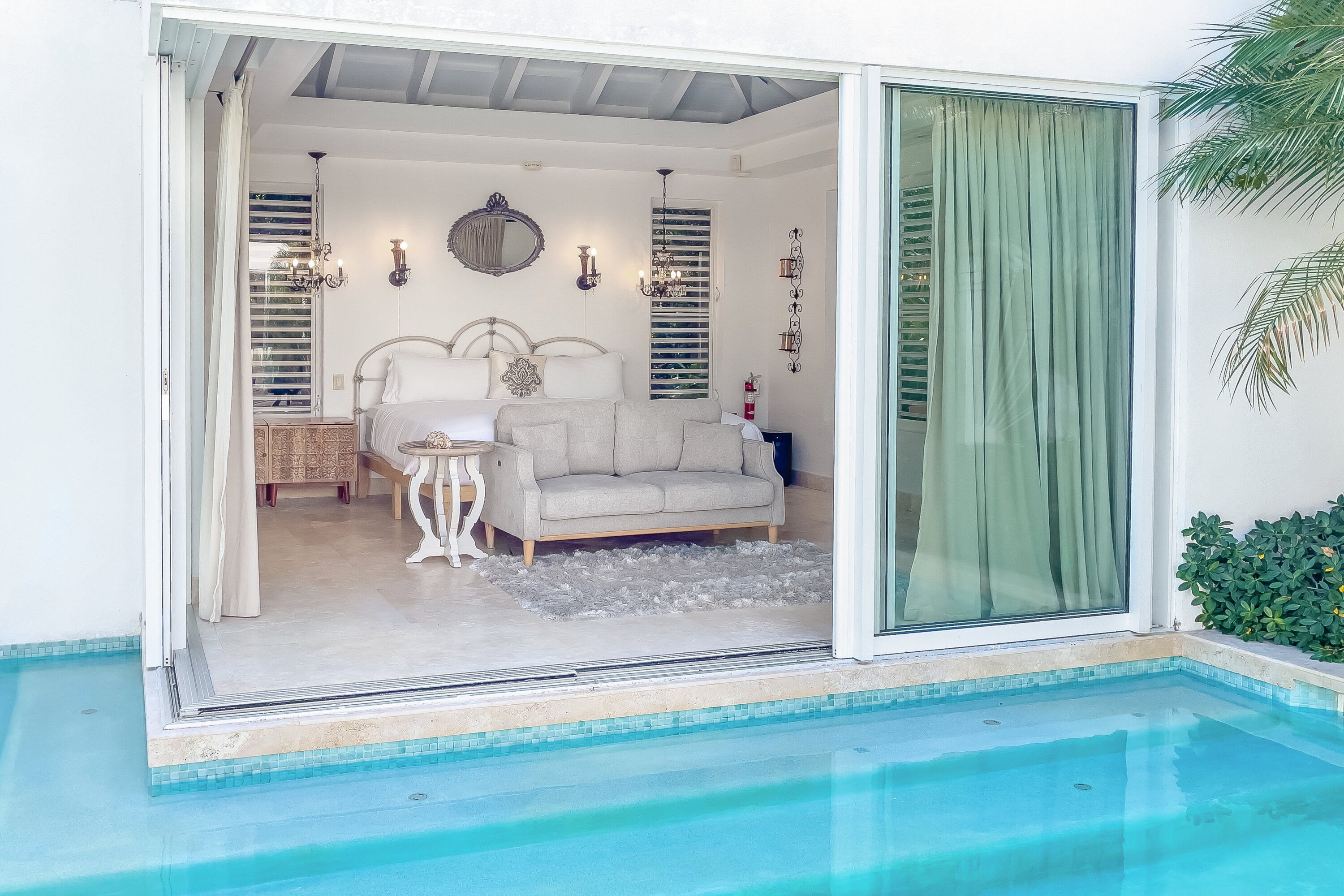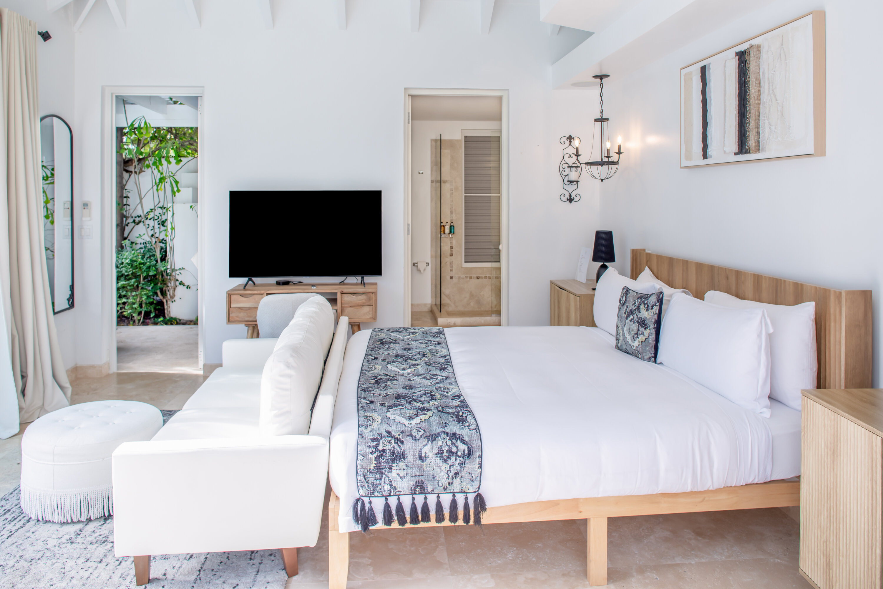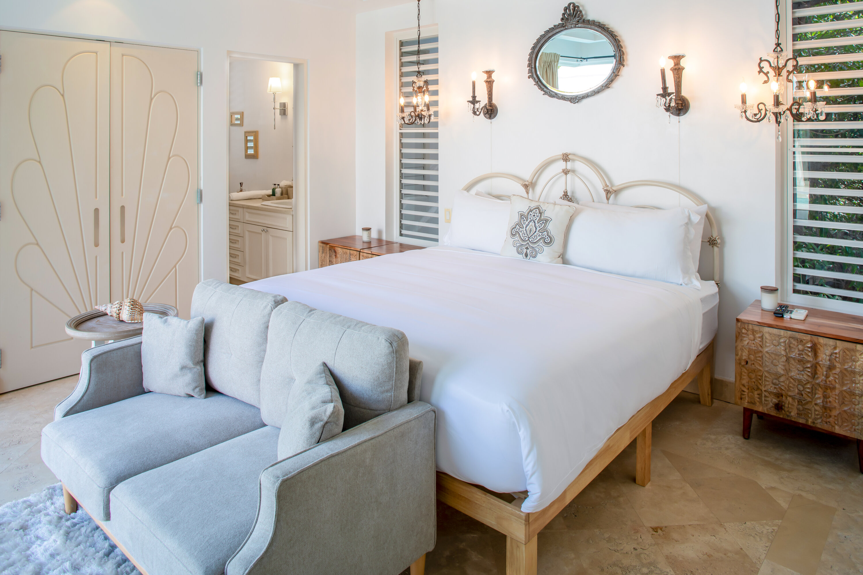 The seven-bedroom suites sleep up to 14 guests. Select suites even open directly onto the pool via private steps. Each suite features double vanities, Smart TVs with Netflix, Apple TV, and cable, ensuring both comfort and convenience. Fall asleep to the soothing sound of waves lapping the shore.