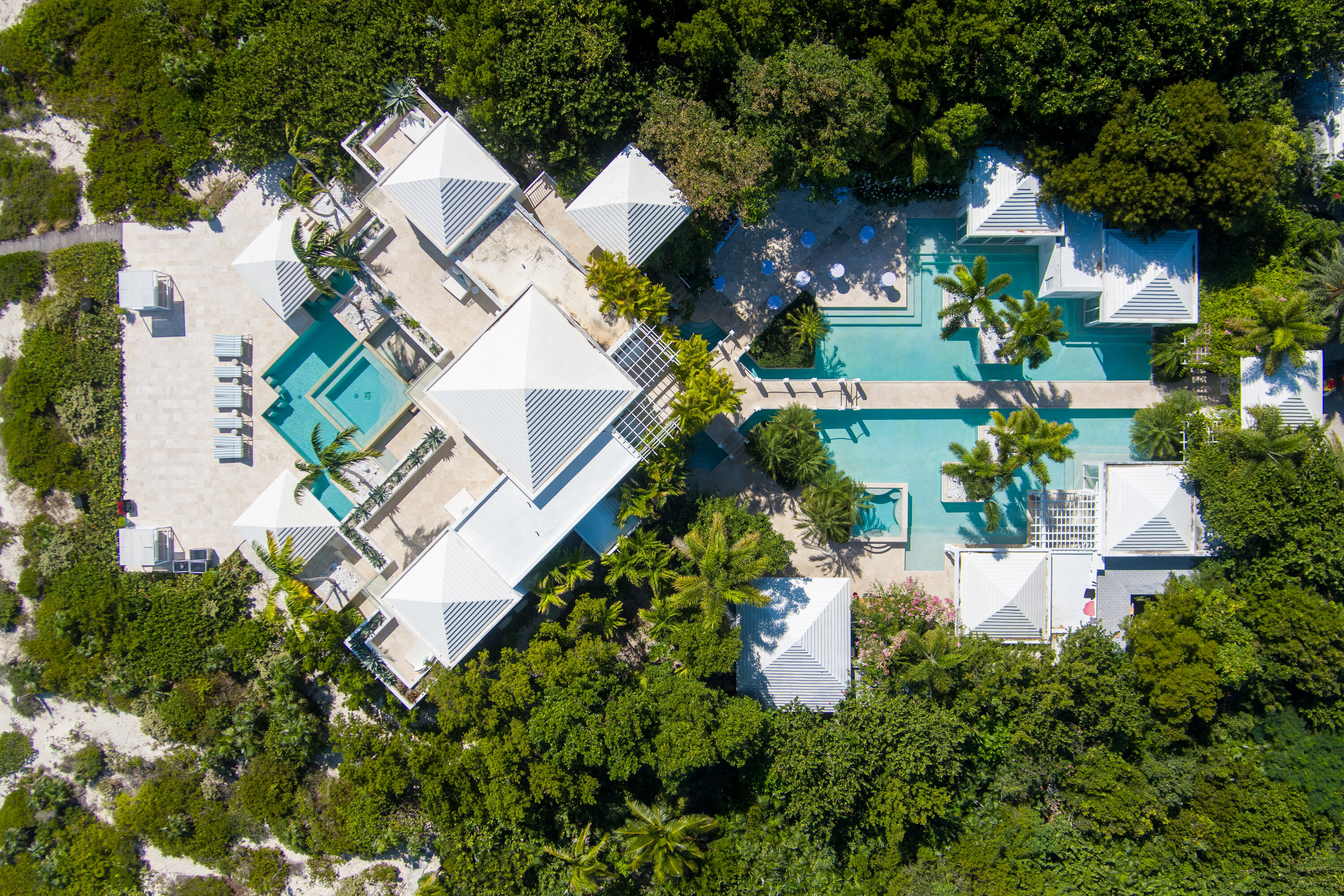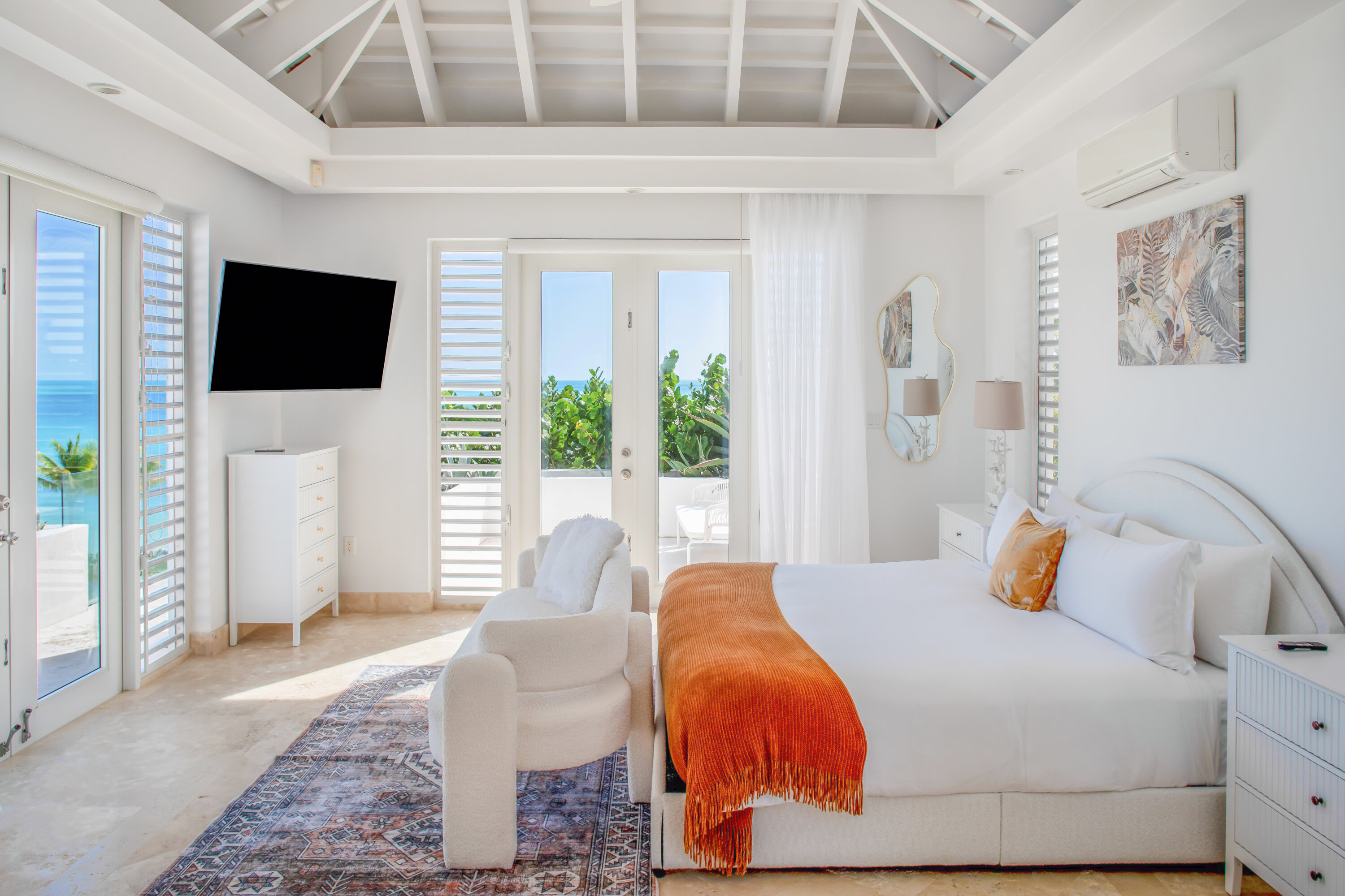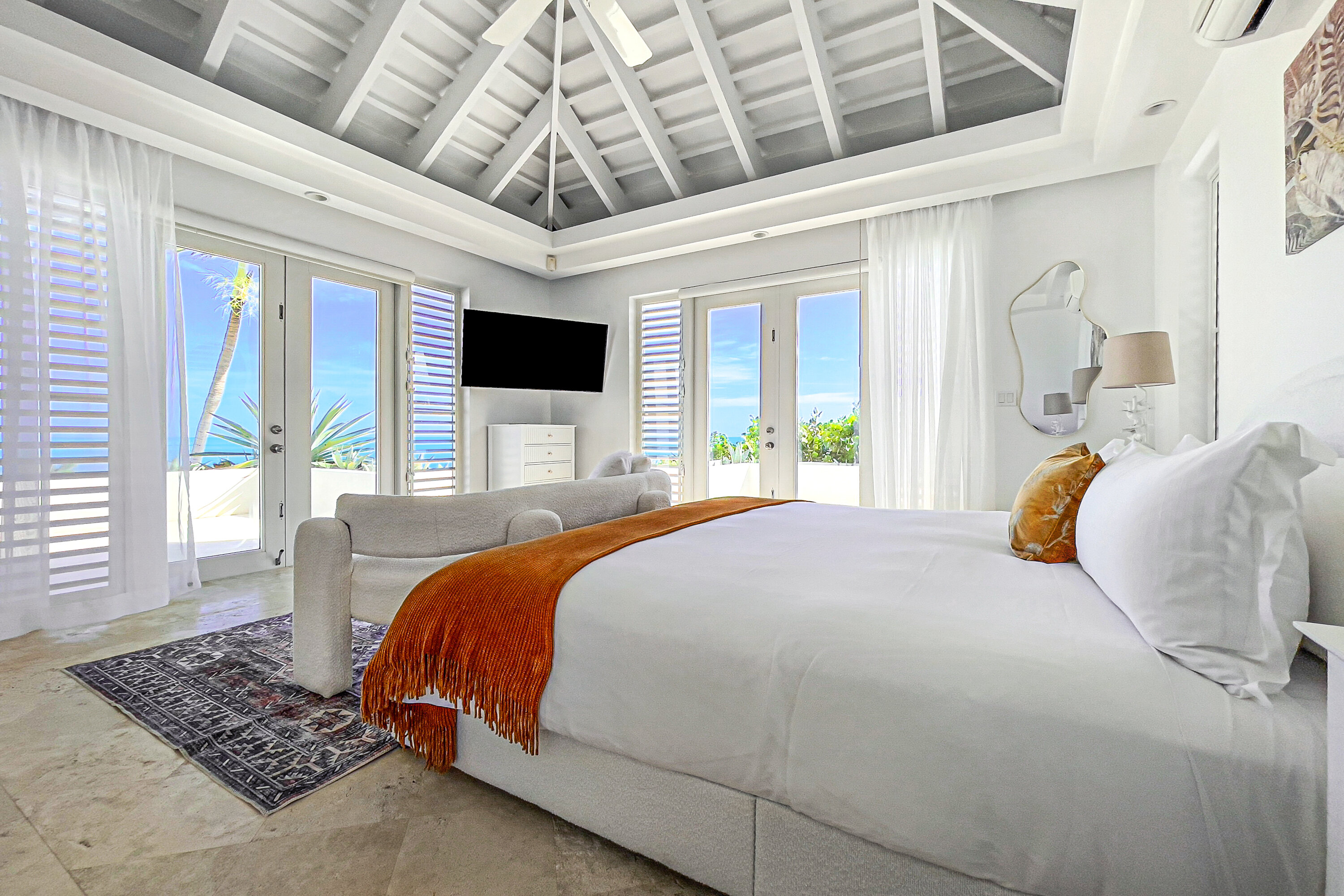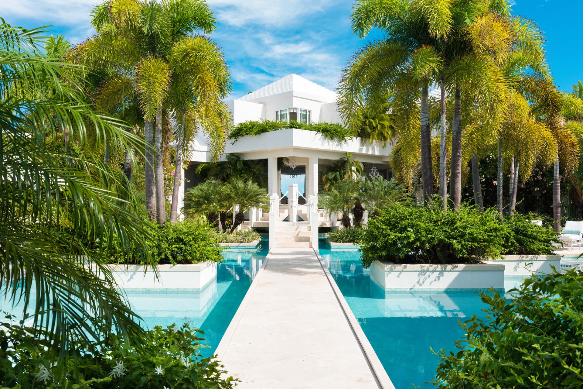Lidija’s House blends Caribbean charm with modern design across 12,000 square feet of elegant indoor-outdoor living space. With seven individually designed bedrooms, an alfresco kitchen and bar, two submerged pool bars, expansive lounging areas, and the island’s largest private pool, the villa is both spacious and sophisticated. Soaring ceilings and overhead fans create a breezy, open ambiance, while lush landscaping, wooden decks, and tranquil lagoons enhance the serene setting.