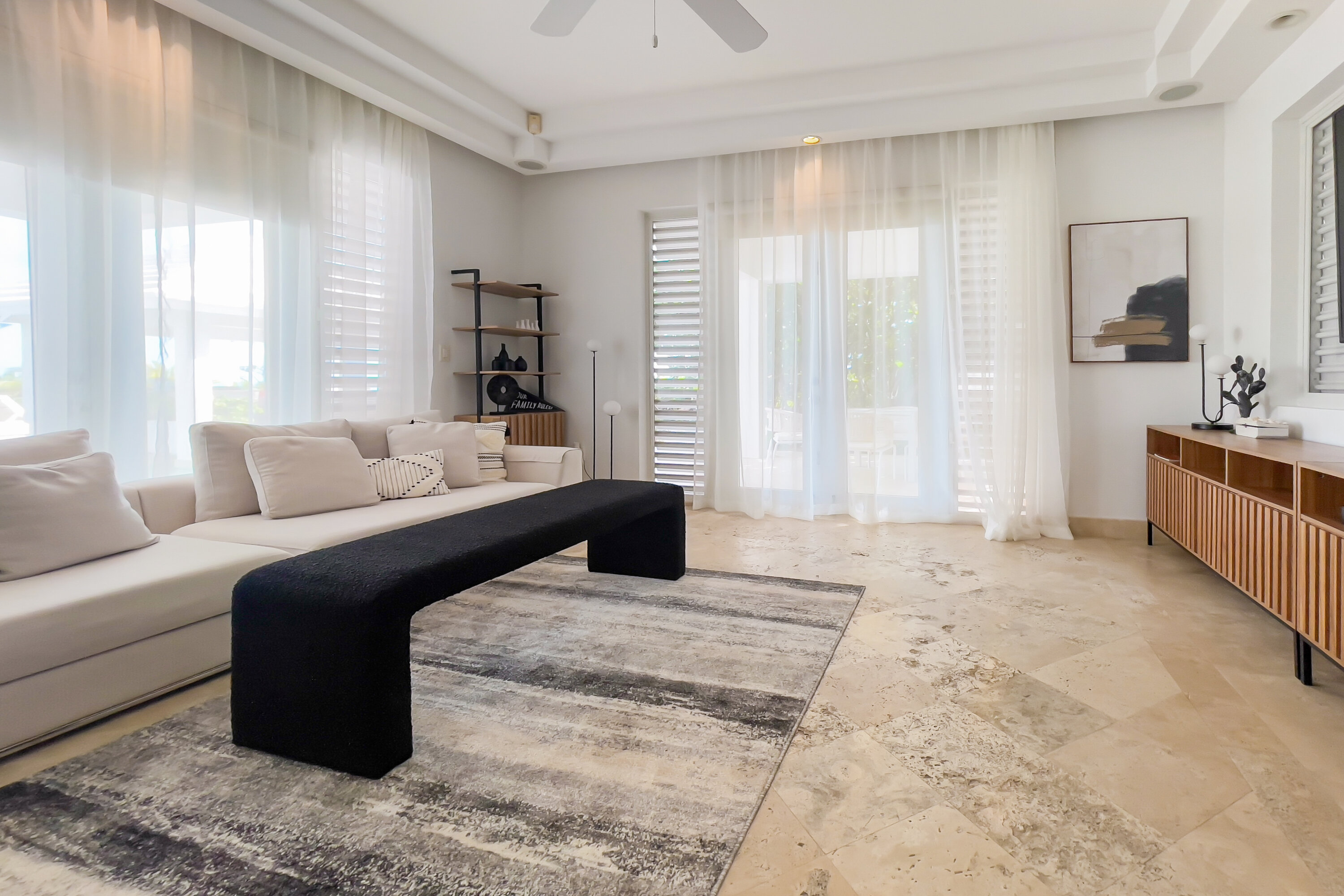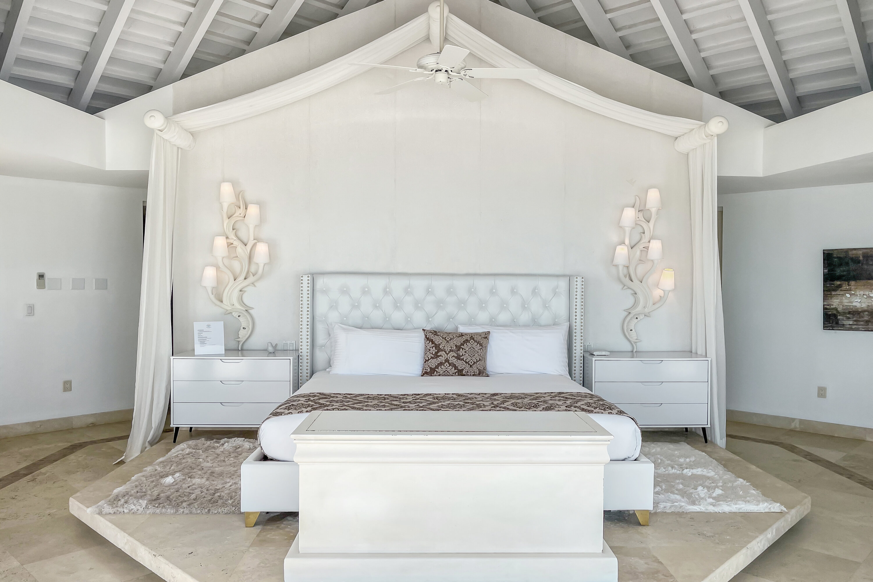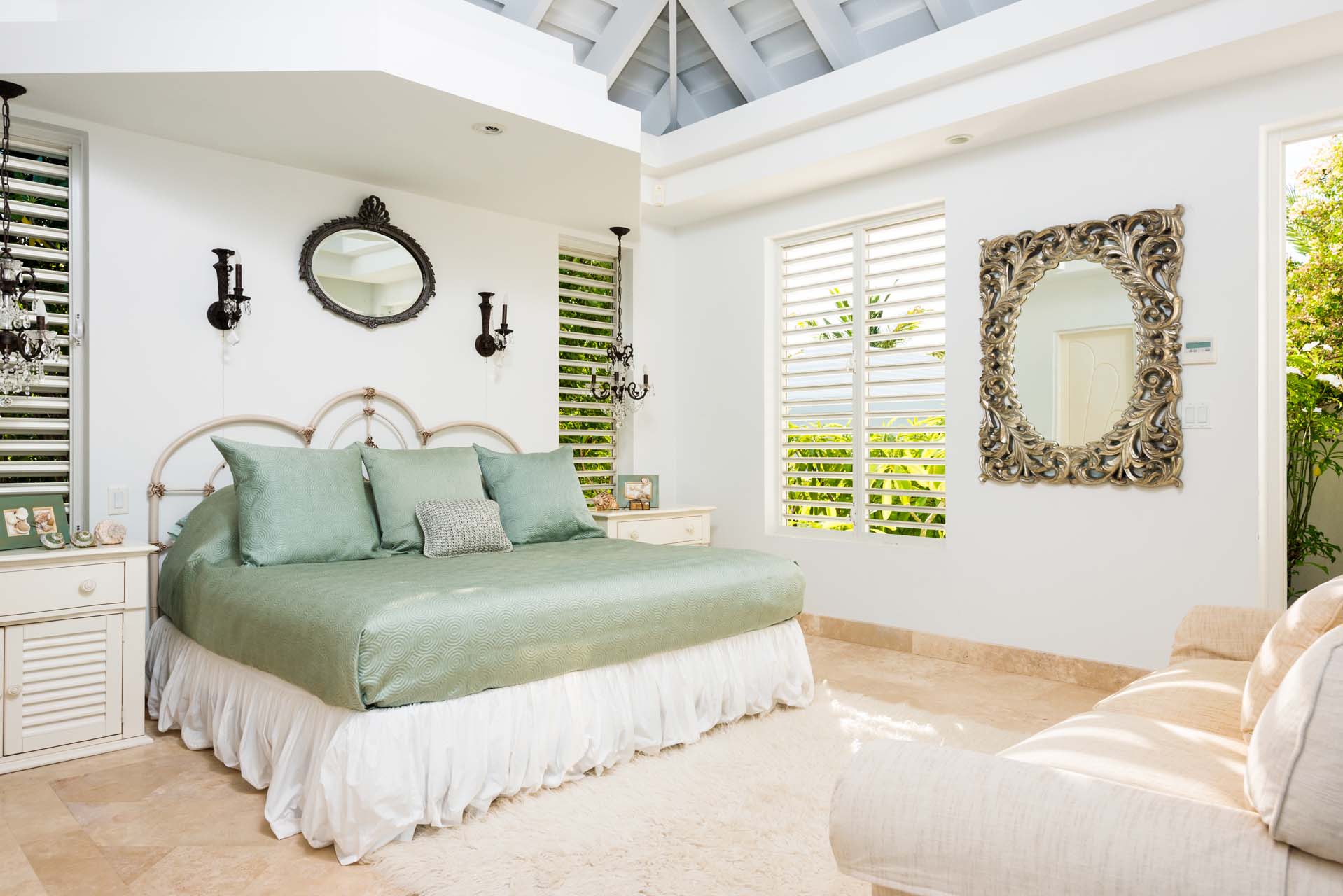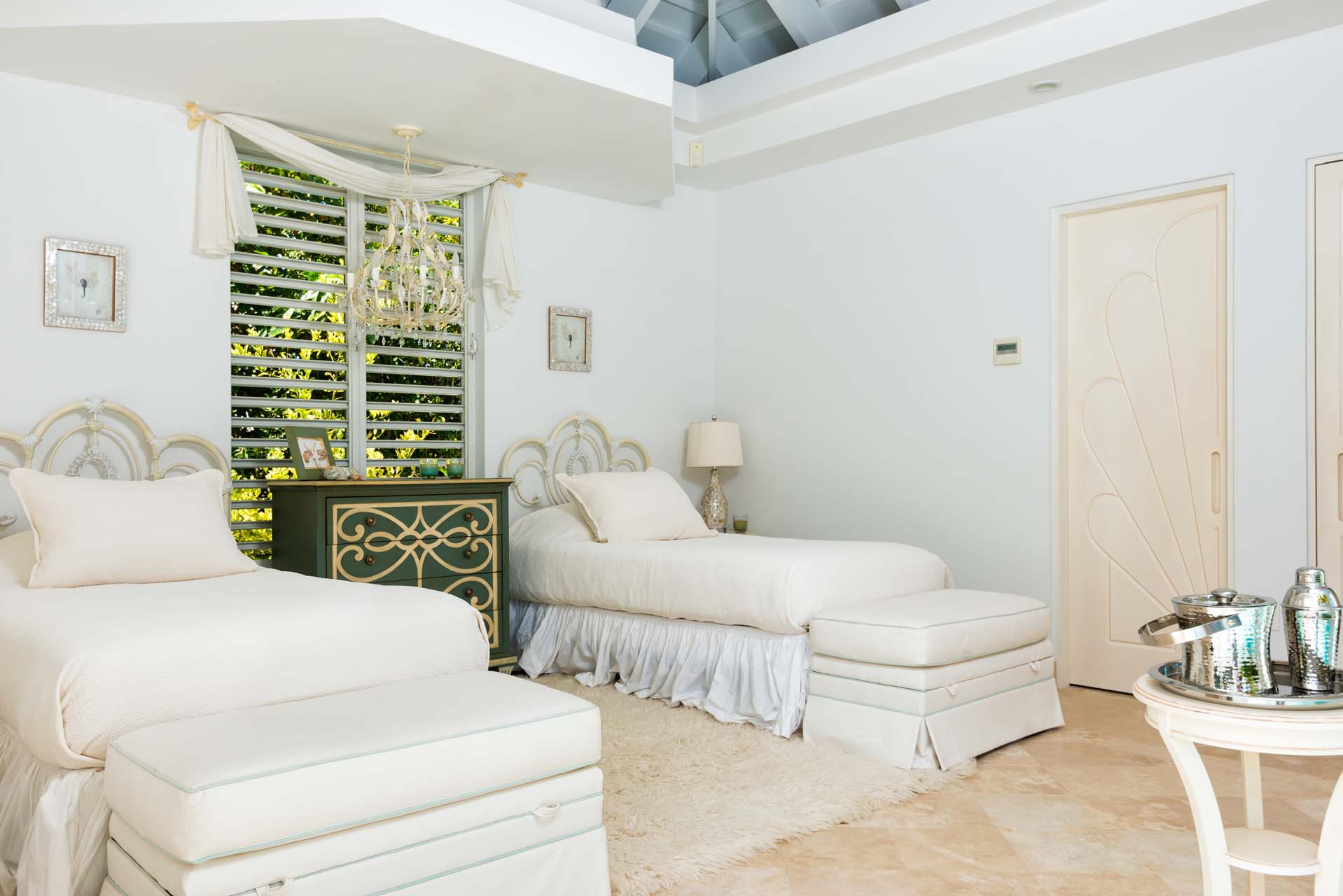Lidija’s House blends Caribbean charm with modern design across 12,000 square feet of elegant indoor-outdoor living space. With seven individually designed bedrooms, an alfresco kitchen and bar, two submerged pool bars, expansive lounging areas, and the island’s largest private pool, the villa is both spacious and sophisticated. Soaring ceilings and overhead fans create a breezy, open ambiance, while lush landscaping, wooden decks, and tranquil lagoons enhance the serene setting.