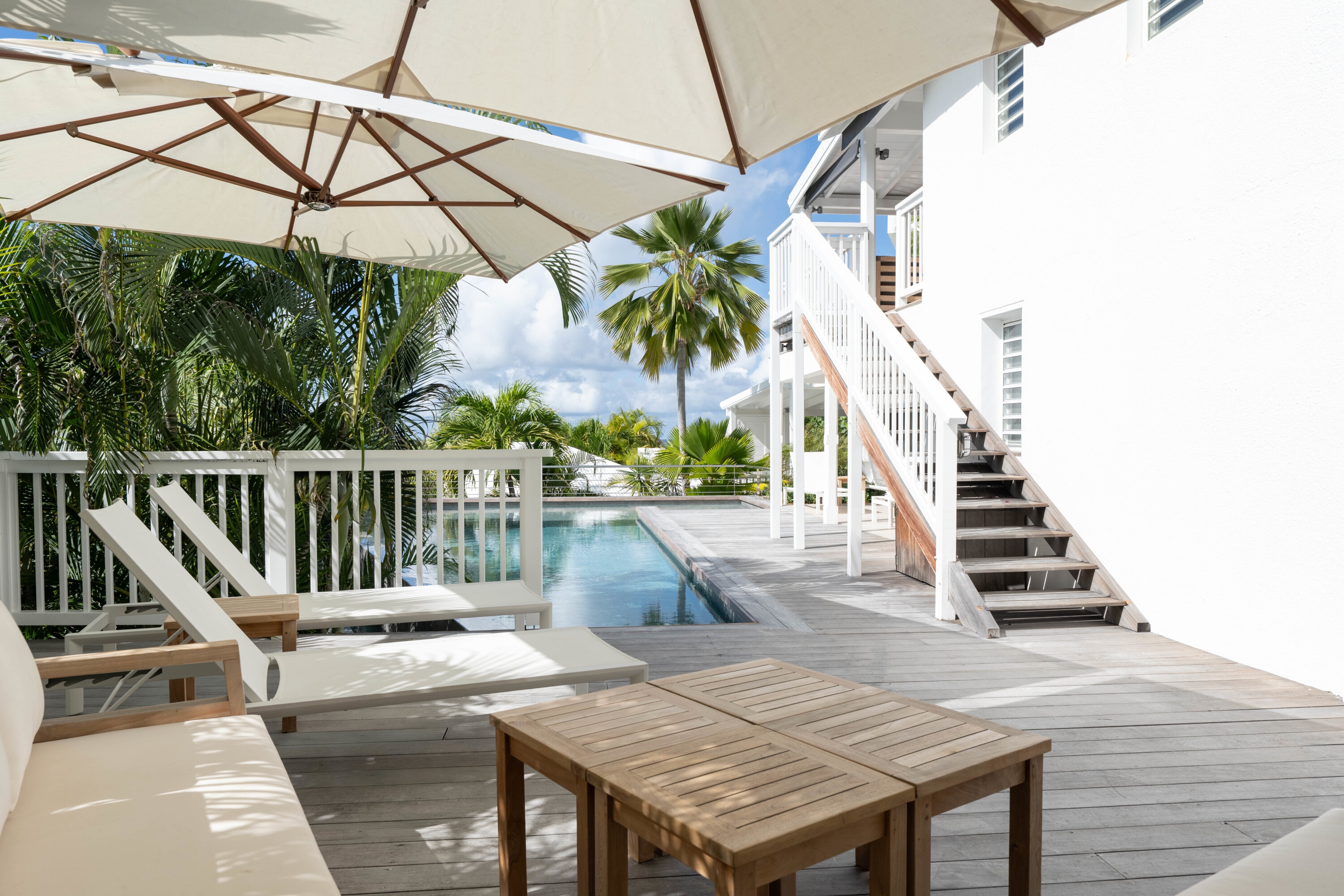 The same bedding situation is found in the second master bedroom on the pool level, facing the parking area. The third bedroom has a queen-sized bed and a fabulous location in front of the pool. The fourth bedroom is in a separate bungalow below the pool level, with a European king-sized bed and views over Lorient Bay.