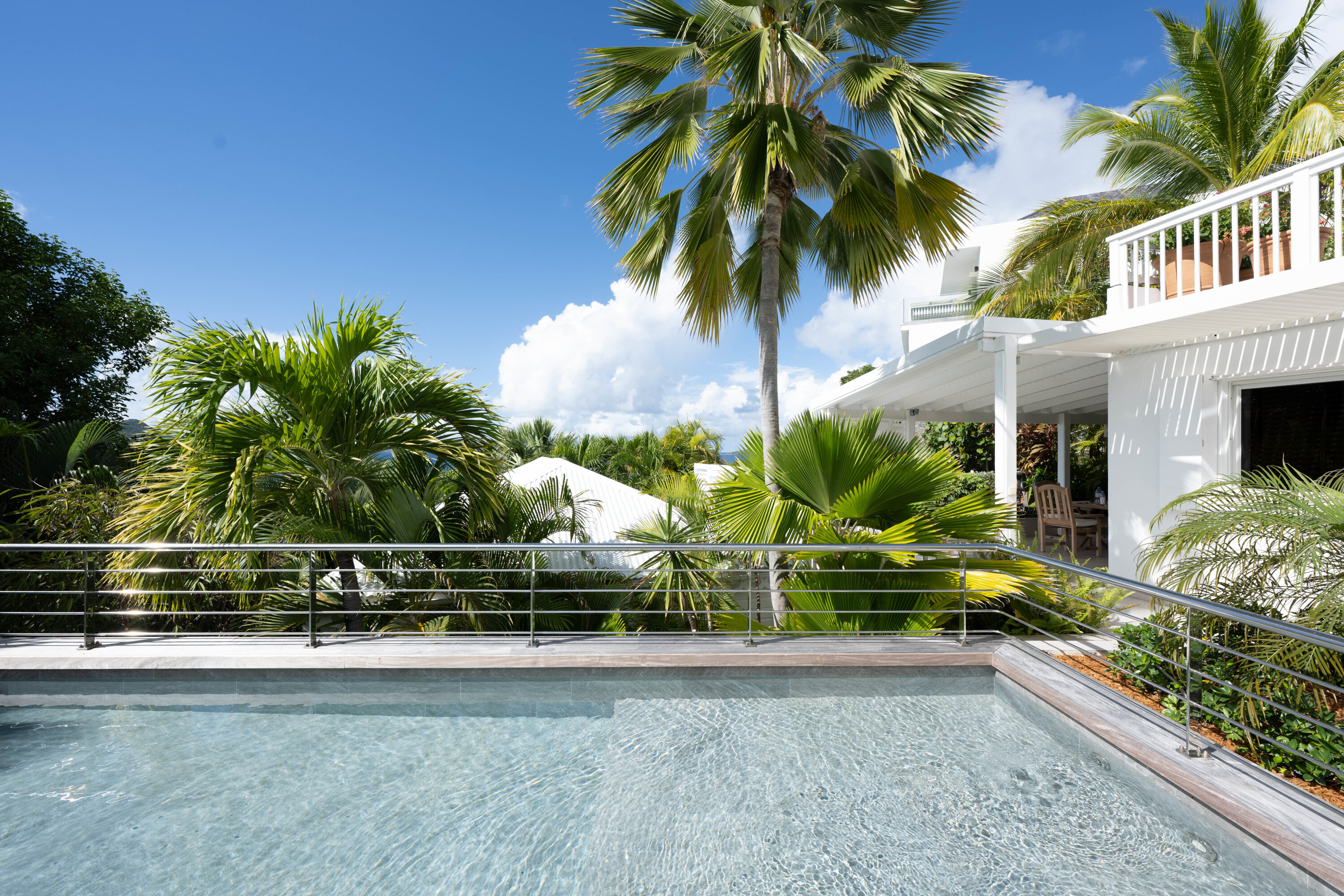Stairs lead down to the pool level, where you can easily spend a day slipping in and out of the water and sunbathing on the loungers. There’s also a small table here, ideal for casual and fresh lunches in the sunshine. Gorgeous tropical plantings surround the entire villa.