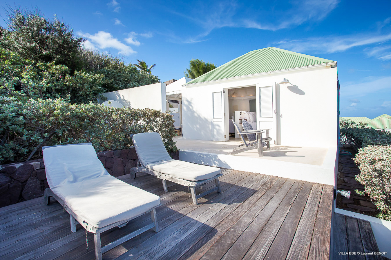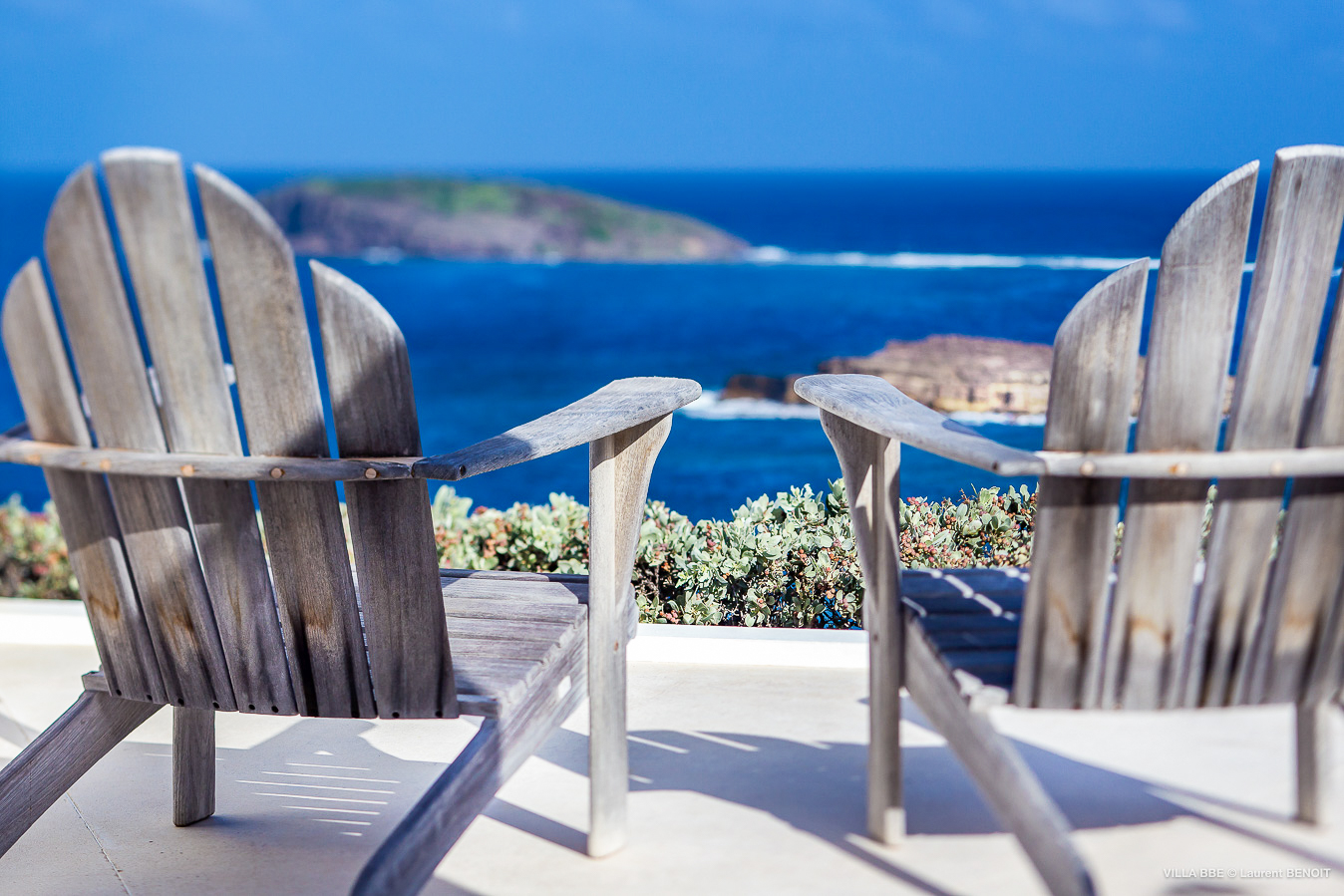 The villa offers a panoramic ocean view from its sun-soaked terrace. Furnished with relaxing Adirondack chairs and chaise lounges, it’s ideal for enjoying the warm island weather.