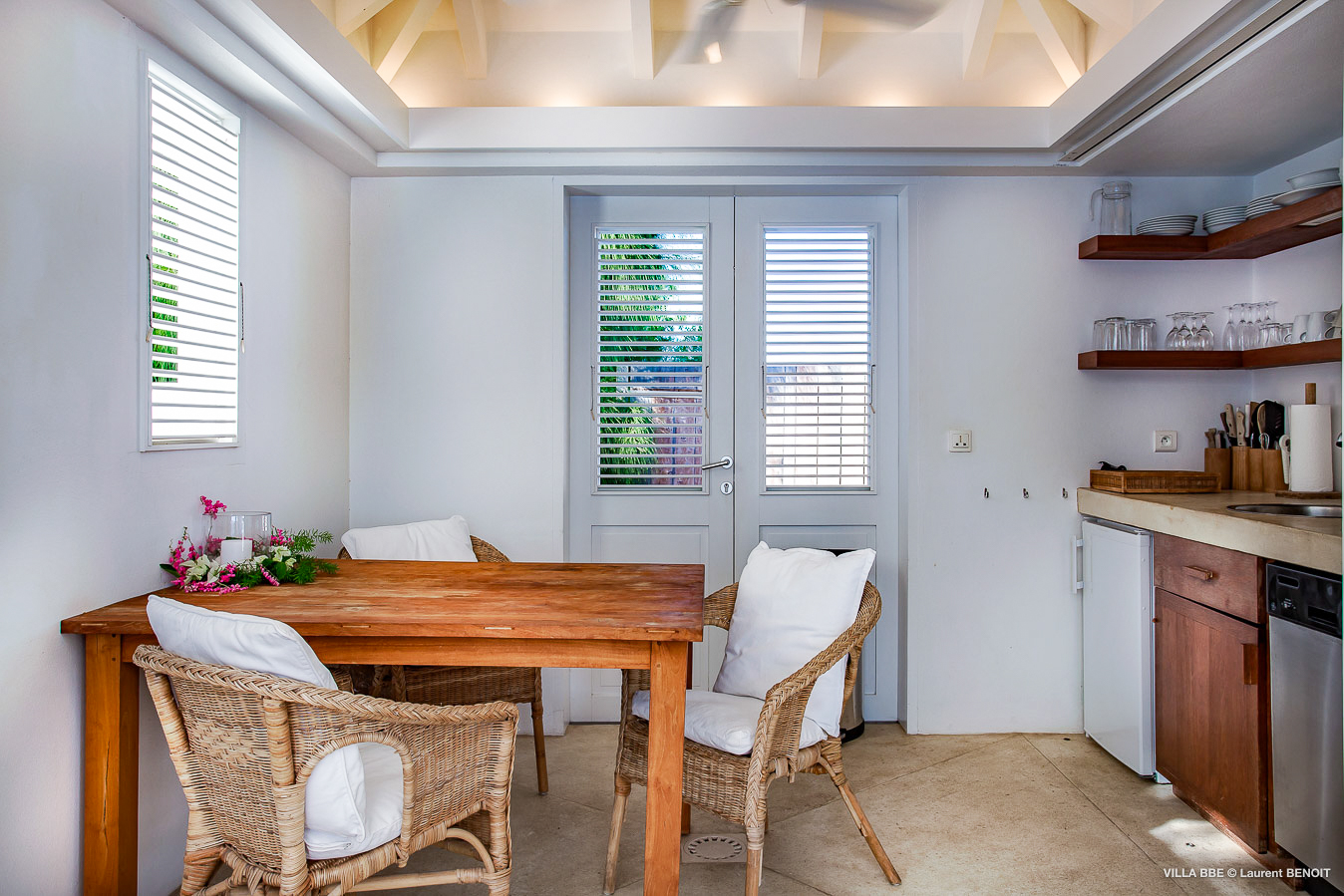 Located separate from the bedroom and accessed from outside is Villa Little Caramba’s kitchen. Modern and compact, cooking fresh meals here is a pleasure. Our concierge can even organize grocery pre-stocking or delivery, catered meals, or arrange a private chef service for a special occasion.