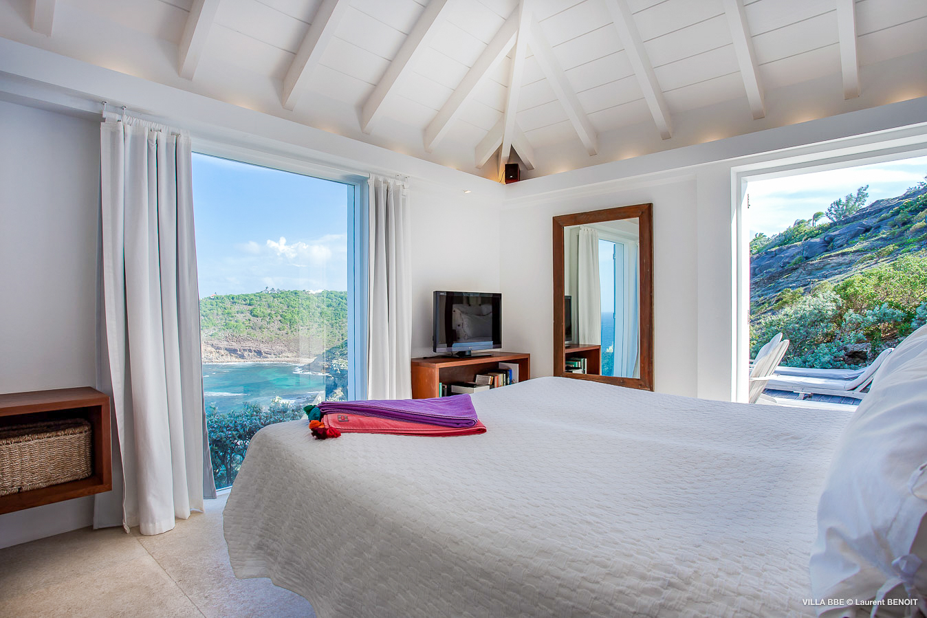 The bedroom at Villa Little Caramba features a king-sized bed, air-conditioning, and another TV. The floor-to-ceiling window lets you admire the waves from under the soft covers on the bed, and fall asleep to the gentle sounds of the tide.