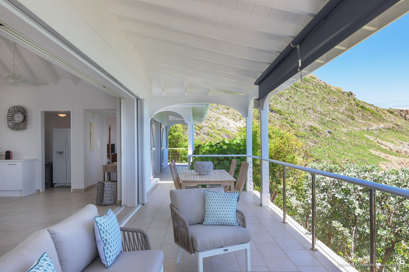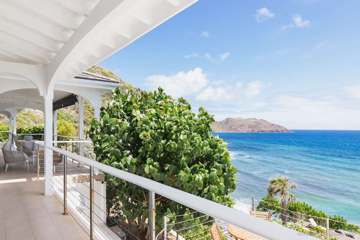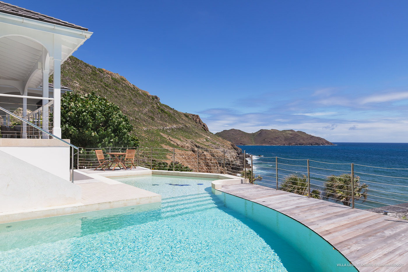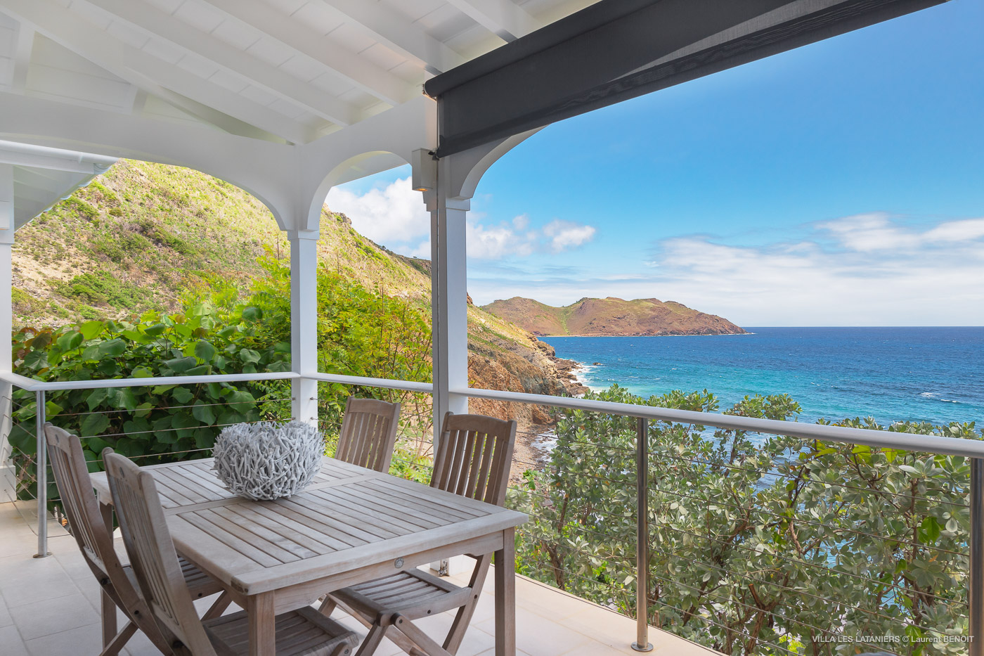 Villa Lo Scoglio (villa code: WV VLL) is a newly-renovated, 2 +2-bedroom villa with gorgeous ocean views, situated at the end of the road in Anse des Lezards. Villa Lo Scoglio is located right next to a nature reserve, just a short drive from Gustavia and St. Jean, yet away from the crowds. Located in a small neighborhood, this villa provides an oasis of calm amid the rugged cliffs and hills of Anse des Cayes, and the constant sounds of the sea below. The villa has an open floor plan, with the pool on the lower level. The cozy open-style main room has a modern kitchen and living room. It opens up to the generous terrace, which offers ample seating, as well as the outdoor dining setting with the ocean as a backdrop. The large heated pool is accessed from the entrance. It has a waterfall feature and a deck that offers lounging and seating in the sun. Two bedrooms offer ocean views and are open to the main room as well as the terrace. Each comes complete with closet space. The master bedroom has a four-poster bed and a slightly larger ensuite bathroom that can be opened up to the outside. The guest bedroom is on the other side of the main room. While this bedroom also has an ensuite bathroom, it has a separate toilet in the hallway by the living room. Situated to the left of the entrance in a separate unit on the second level. There is also a small studio with an ensuite bathroom and kitchenette, best for teens. Behind the guest bedroom by the entrance, is an additional small bedroom and a small queen bed which can only be accessed from the outside. It has no bathroom and is therefore only suitable for a teenager or perhaps a nanny. Villa Lo Scoglio is a great choice for a family with children, but can also be a good option for two couples traveling together. It’s also the sister villa of Villa Lataniers, situated just below, and both villas can be rented together to add extra bedrooms for a large group. During the December holidays, the villa rents at full occupancy rates regardless of how many bedrooms are used.Please fill out the form to begin your inquiry and we will connect you with a seasoned villa rental specialist.
