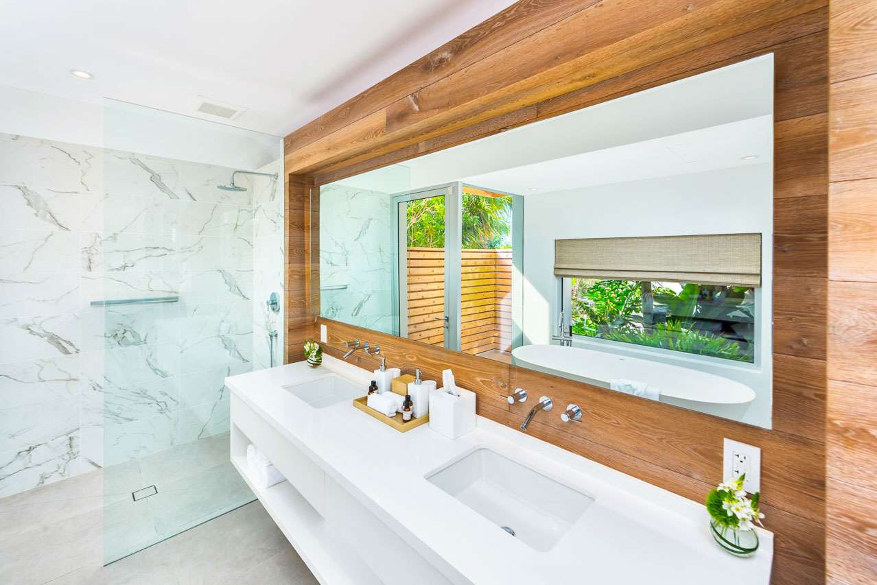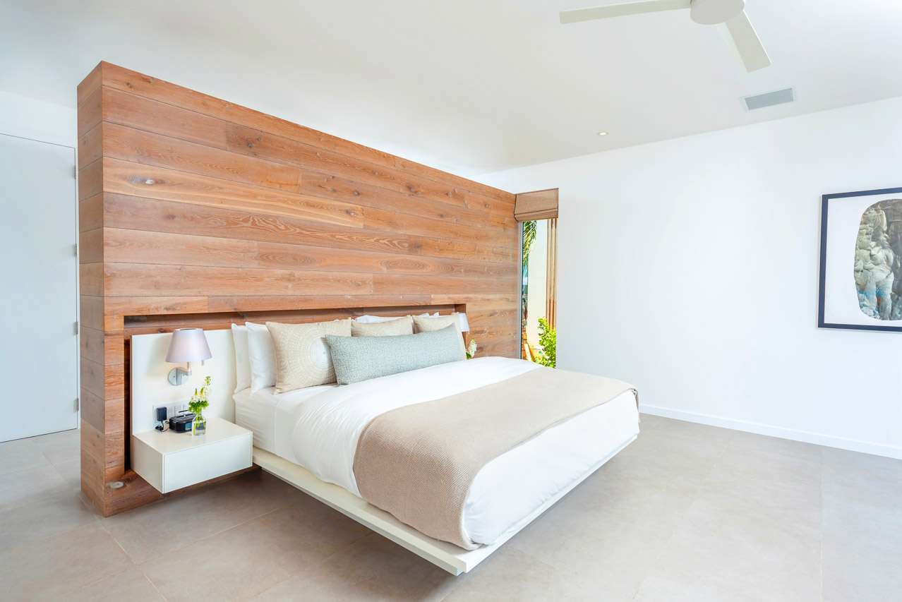 This expansive villa spans an impressive 7,800 square feet, meticulously designed to maximize ocean views. Featuring large retractable glass doors, the beachfront property seamlessly merges indoor and outdoor living. Surrounded by lush tropical vegetation, the villa blends harmoniously with its environment, offering guests delightful scents and shaded areas throughout its landscaped gardens. The private infinity-edge pool overlooks the ocean and features a water heating system, inviting guests for daytime relaxation and nighttime swims under the stars. The wooden deck is adorned with sun loungers and umbrellas, making it a favored spot for gatherings.