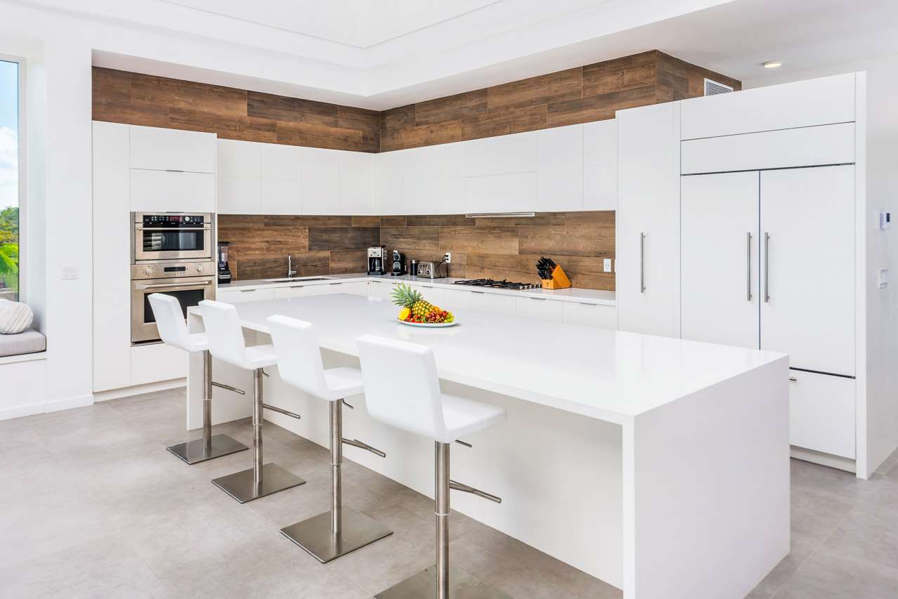 A sleek wooden dining table, seating ten, is positioned by the window and terrace doors, making outdoor dining effortless with the backdrop of swaying palms and refreshing sea breezes. The kitchen features a central island with a white countertop that doubles as a breakfast bar. Equipped with state-of-the-art appliances and stylish cabinetry, this kitchen is a haven for culinary enthusiasts, promising gourmet meals with ease.