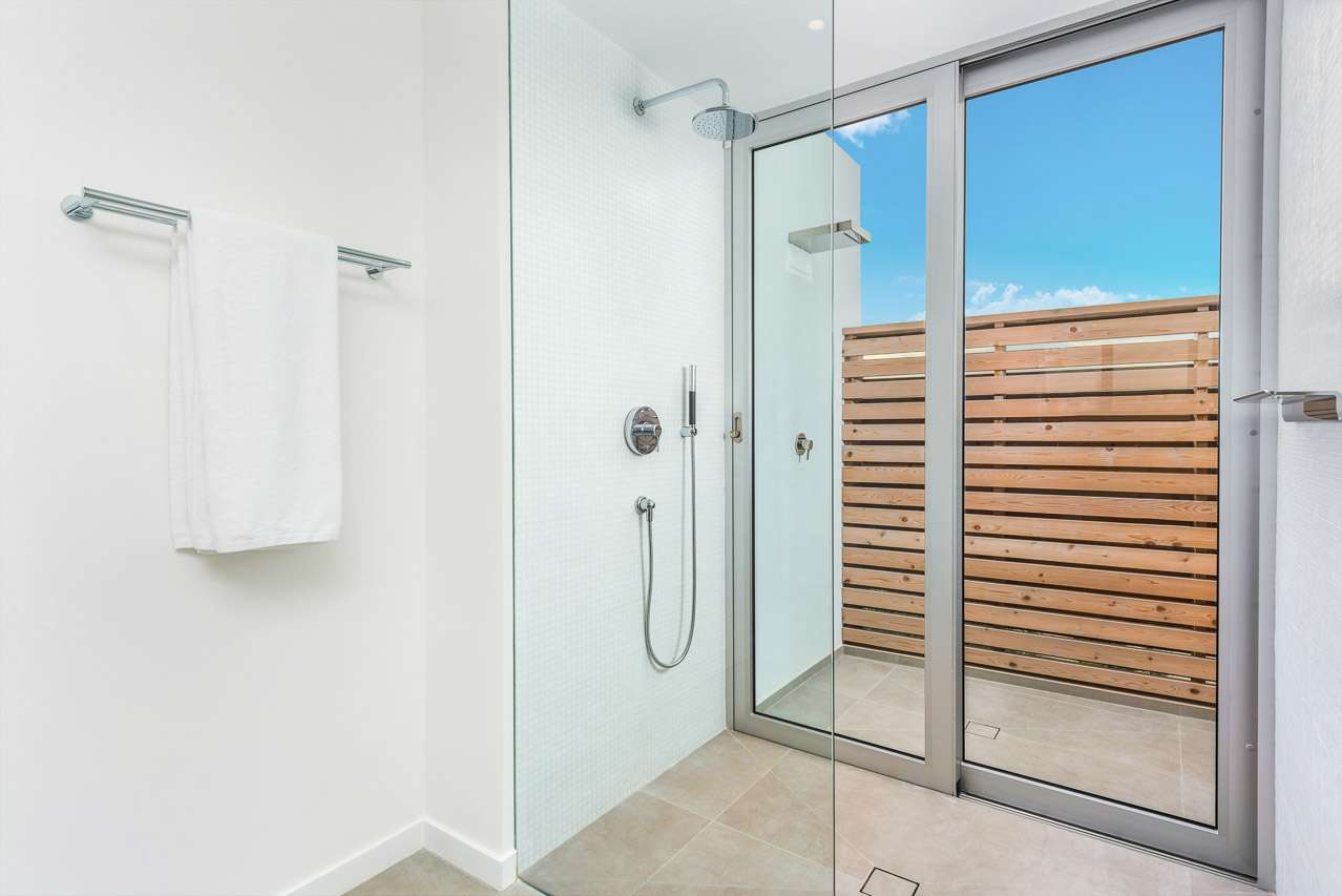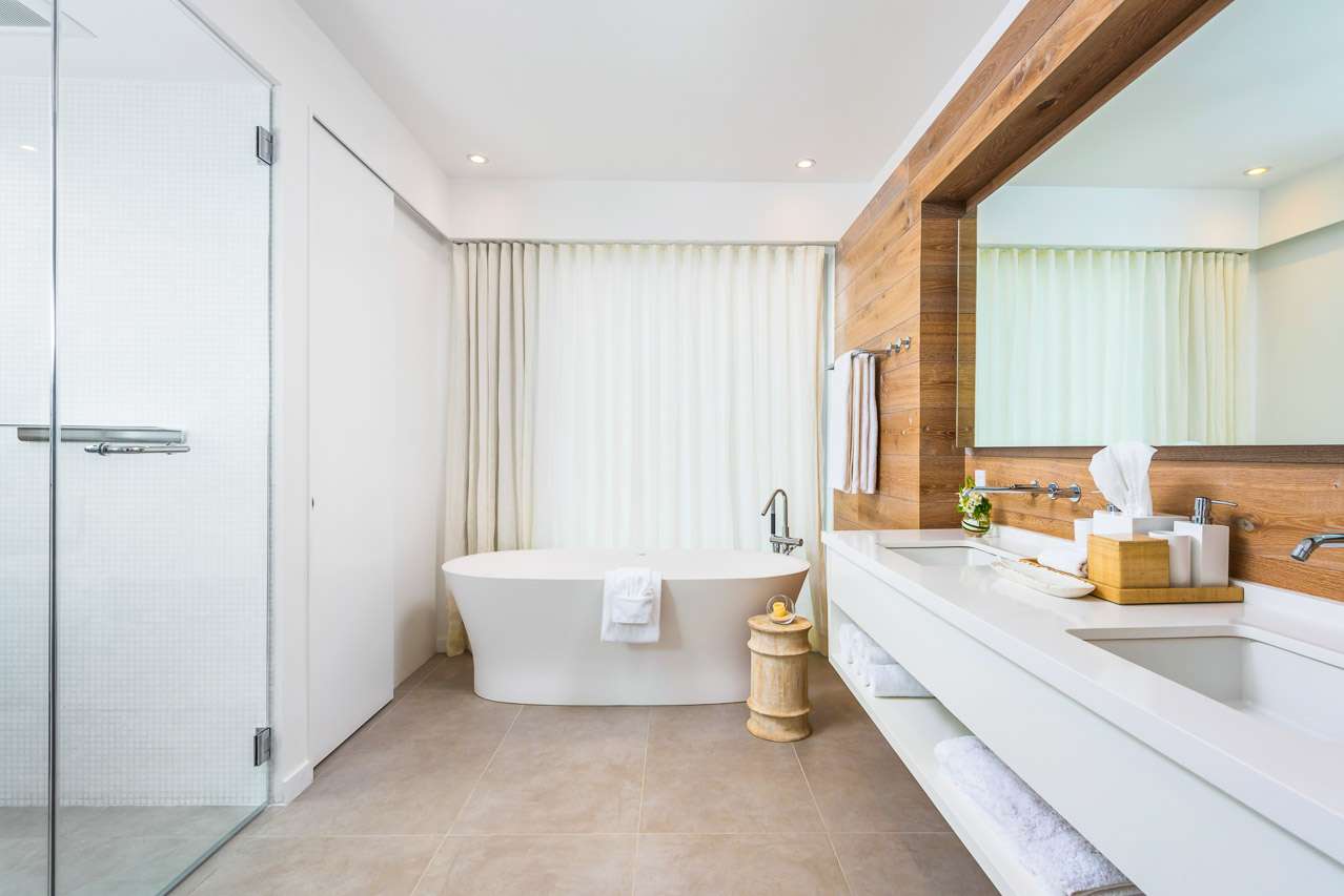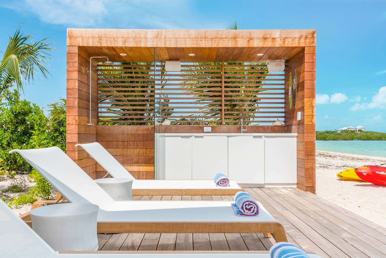 Bedrooms: The 5 contemporary bedrooms in this Beach Enclave Long Bay Villa. Each comes with a king-sized bed and ensuite bathroom. Contemporary design, ocean views, and a soft neutral color palette bring the most out of the island décor. The two master suites (one on the ground floor and another on the second floor) also come with an outdoor shower, a relaxing way to wash off the salt and sand. Terraces with deep-backed and soft chairs let you gaze at the horizon and settle in with a good book or glass of champagne. The 6th bedroom is located in its own secluded cottage. This tranquil space is perfect for those seeking a bit more privacy and includes its own kitchenette, sitting room, and covered terrace.