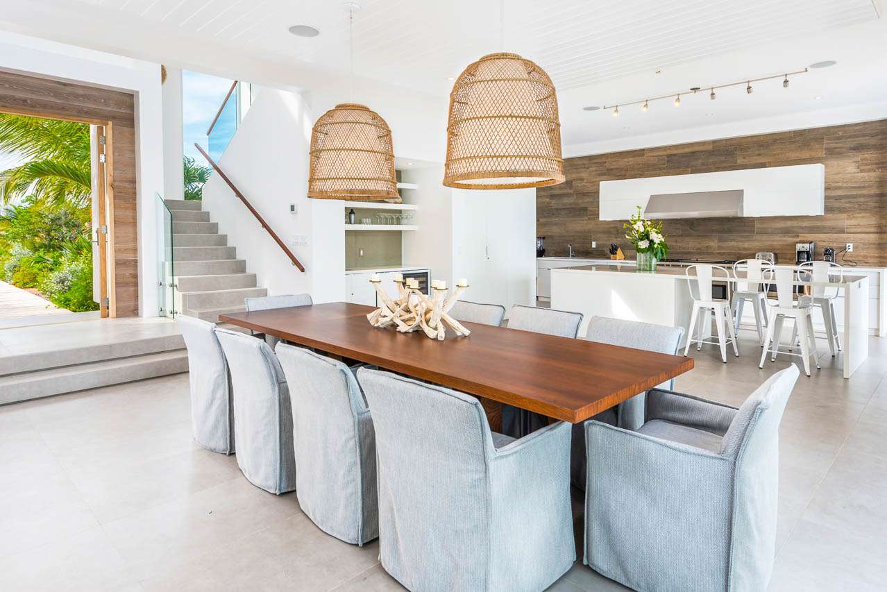 Kitchen and Dining Room: The roomy kitchen is stylish and modern, well-appointed with all the amenities you need to prepare chef-level meals. A large kitchen island doubles as a casual breakfast bar, a space to enjoy an early morning espresso as the sun rises. Your cooking space also extends outside, where you’ll find a bench and large gas grill – the perfect place to barbecue some freshly caught fish. The glossy wooden dining room table at this Beach Enclave Villa in Long Bay has space for up to 10 people. Everyone will love gathering here over a delicious meal, discussing the day’s activities. Alfresco dining is also an option at the large outdoor table. This is a perfect spot for fresh lunches and sunset drinks, watching the stars appear as the rosy gold sunset flares up over the ocean.