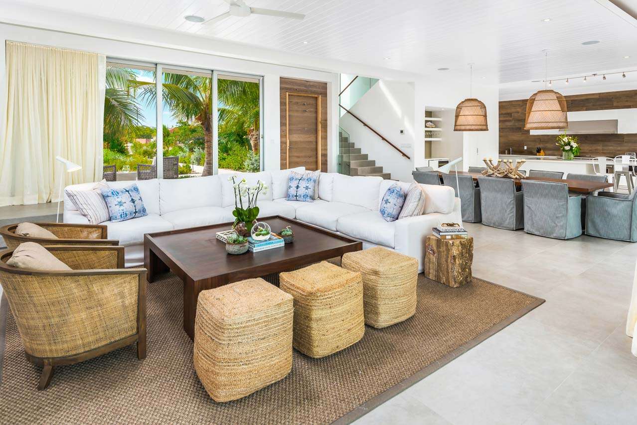 Living Spaces: The large open-plan living space in this Long Bay Beach Enclave Villa consists of the living room, dining room, and kitchen. Generous sliding glass doors open to reveal an expansive outdoor setting, with covered terraces, sun decks, and the inviting infinity pool. The other side of the villa has a tranquil patio overlooking a lush tropical garden. The beautiful living room features a deluxe L-shaped sofa on top of a woven rug, providing some Caribbean texture. A solid wood coffee table, and a pair of beige armchairs add a rustic flair. Natural light fills the room, glancing off the white-washed walls and lofty ceiling. You’ll love gathering here to relax, admire the view, or simply sink into the sofa for some good conversation.