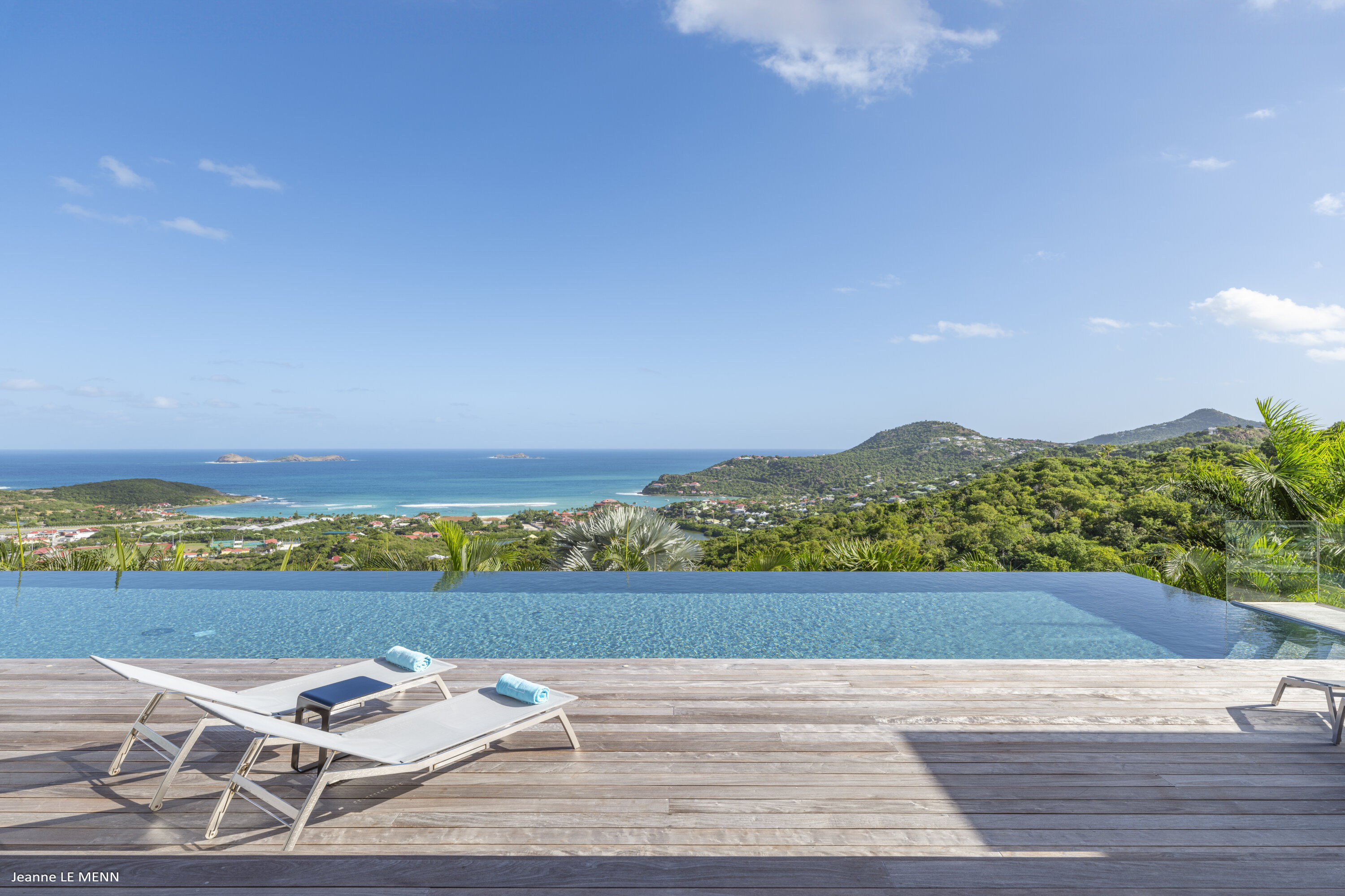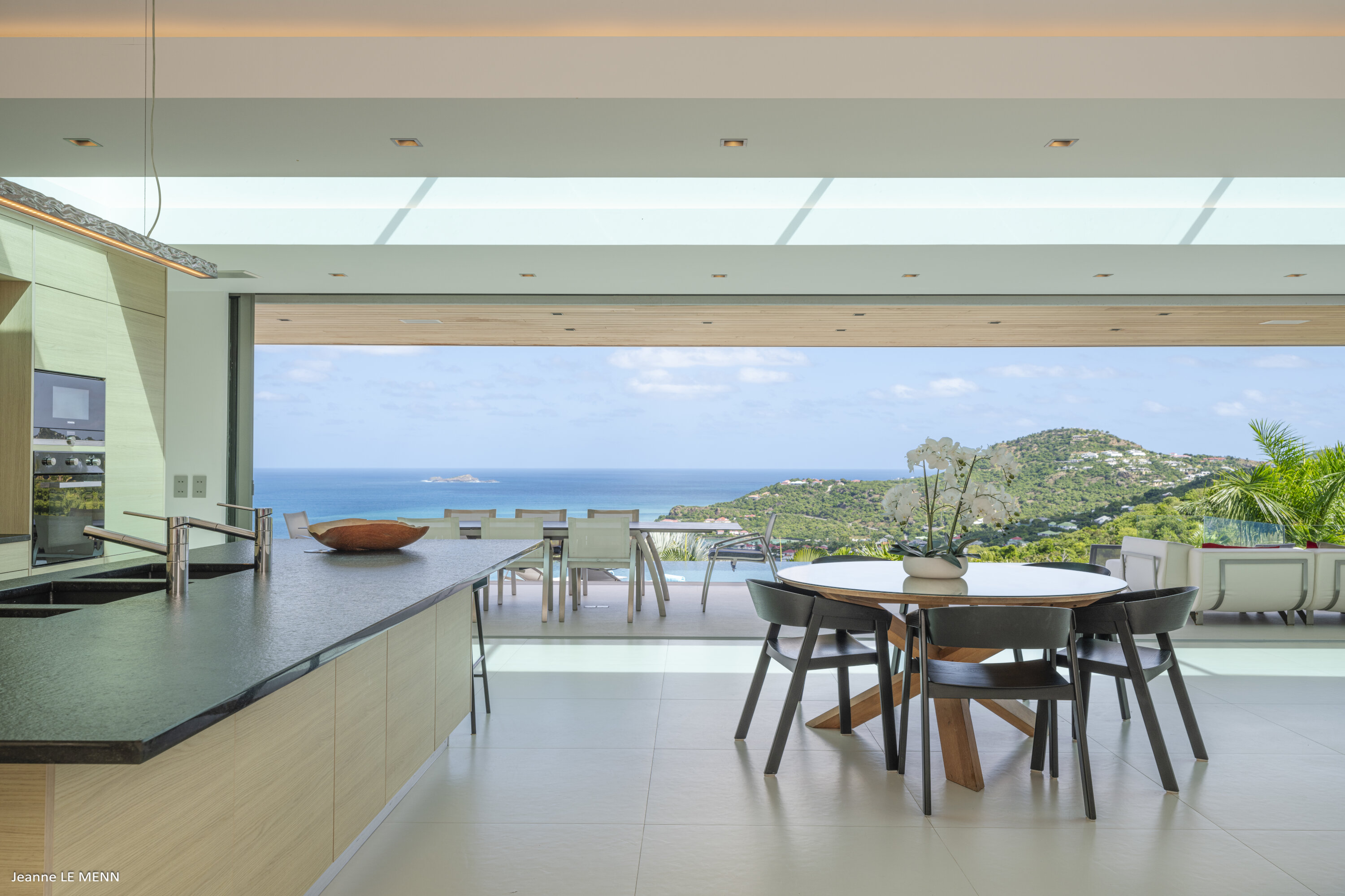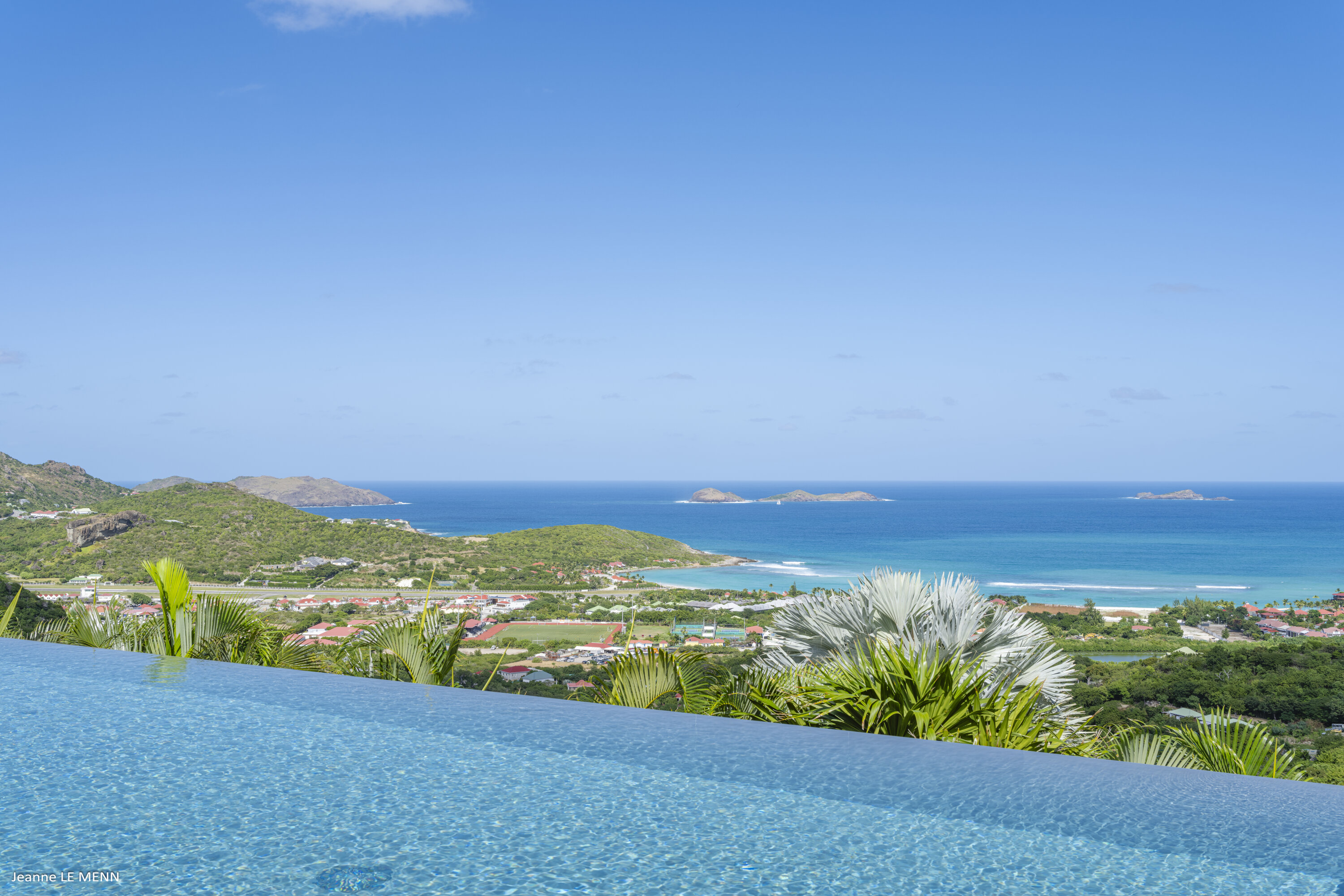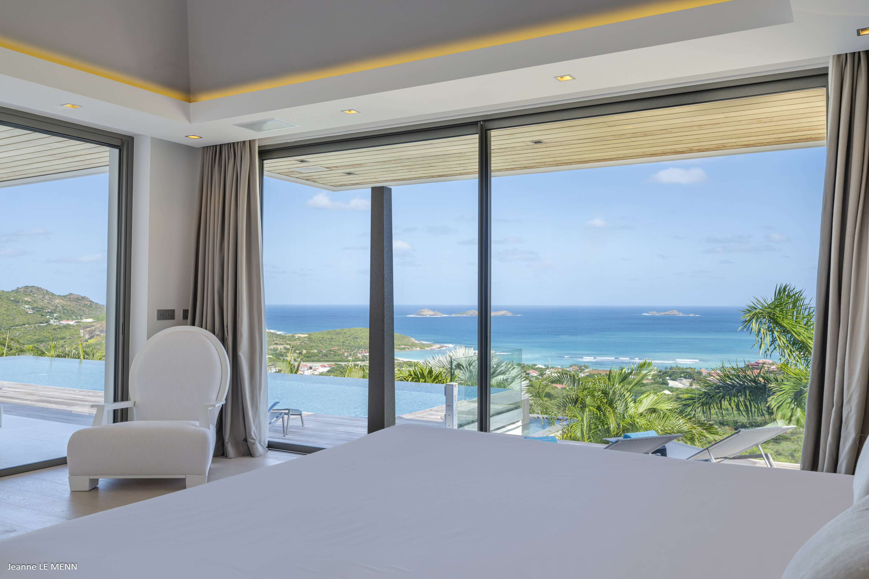 Villa Loukoko, (villa code: WV LOU) is a contemporary, 4-bedroom villa in Lurin, offering panoramic ocean views. High in the hills of Lurin, and just a short drive from Gustavia, villa Loukoko is located in a small gated community. It overlooks the St. Jean area including the airport, the bay, and the ocean. The breathtaking views can be enjoyed from nearly every corner of the villa, including the large terrace and its heated infinity pool. Its dominating position also allows for cooling breezes, but the villa can be fully air-conditioned. The main room with the living room and fully-equipped kitchen has windows on both sides, as well as a skylight overhead, which brings in plenty of light. The space opens up onto the terrace with a covered area for lounging and dining, and there is an outdoor TV hidden on the floor, perfect to watch a movie or game outdoors. One bedroom is directly accessed from the living room. The second room has access just outside the living room, and the third is behind the second. The lower bedroom is accessed near the entrance of the house. Each has a European king-sized bed, ample closet space, Smart TVs, and an ensuite bathroom with shower. On the lower level are both outdoor parking and a parking garage, which doubles as a game room with a ping pong table, a fuss ball, and a pool table. Villa Loukoko is a great choice for couples vacationing together, but will also suit families. During the December holidays, the villa rents at the full occupancy rate regardless of how many bedrooms are used.Please fill out the form to begin your inquiry and we will connect you with a seasoned villa rental specialist.