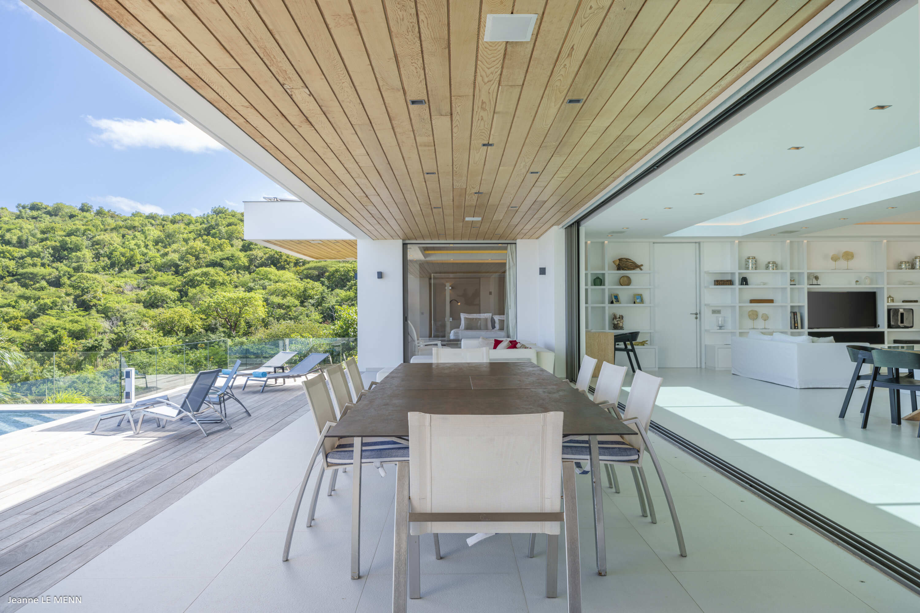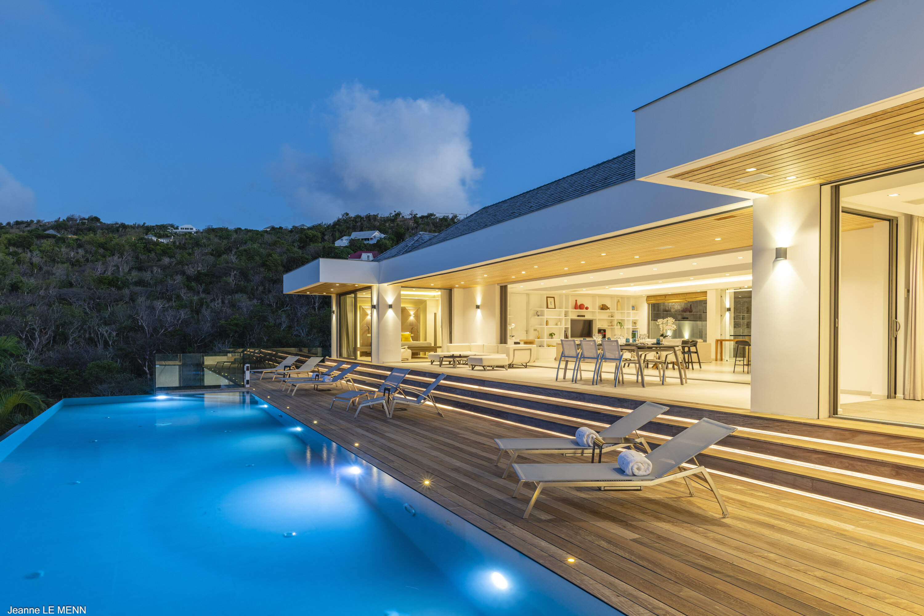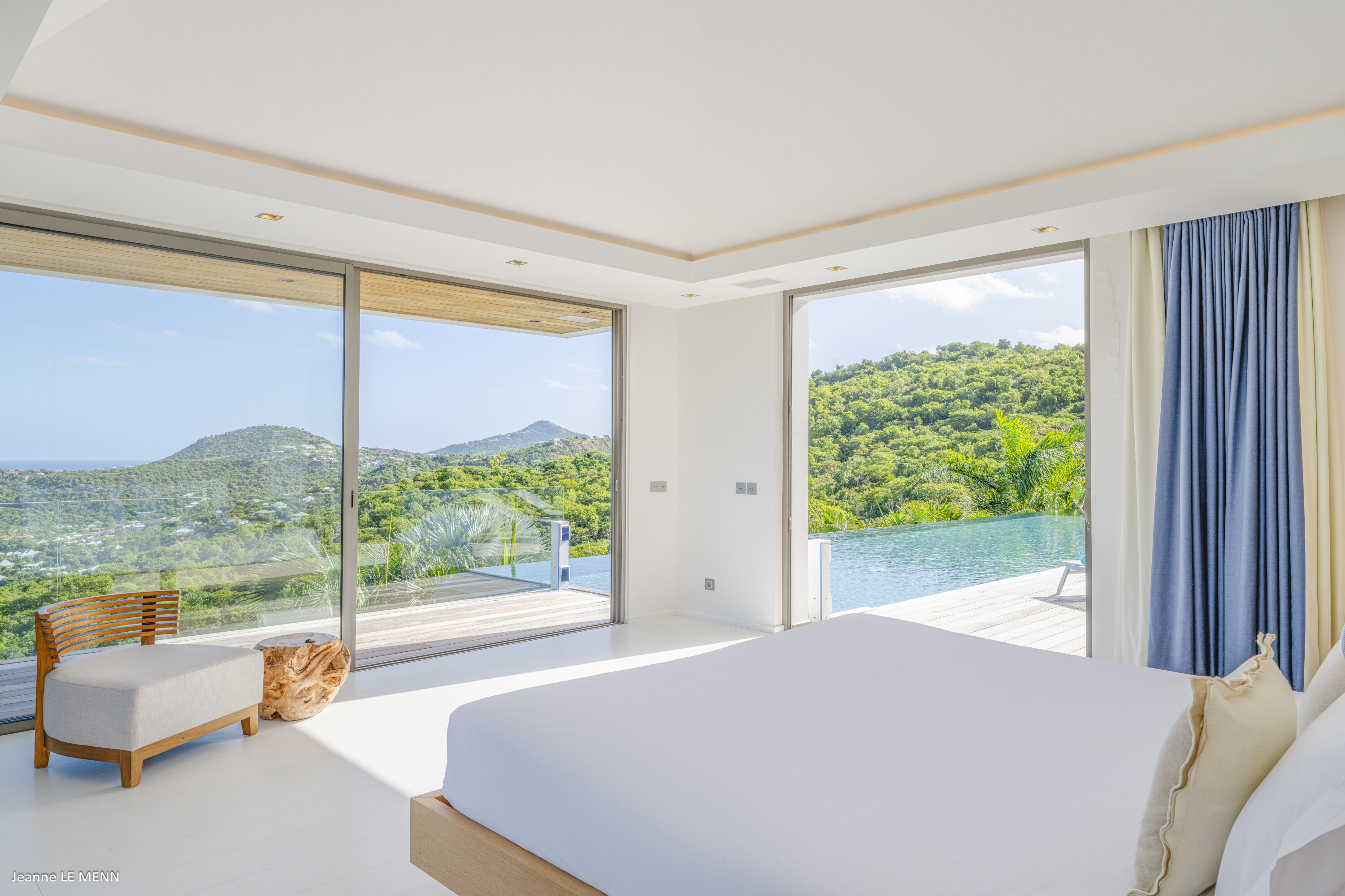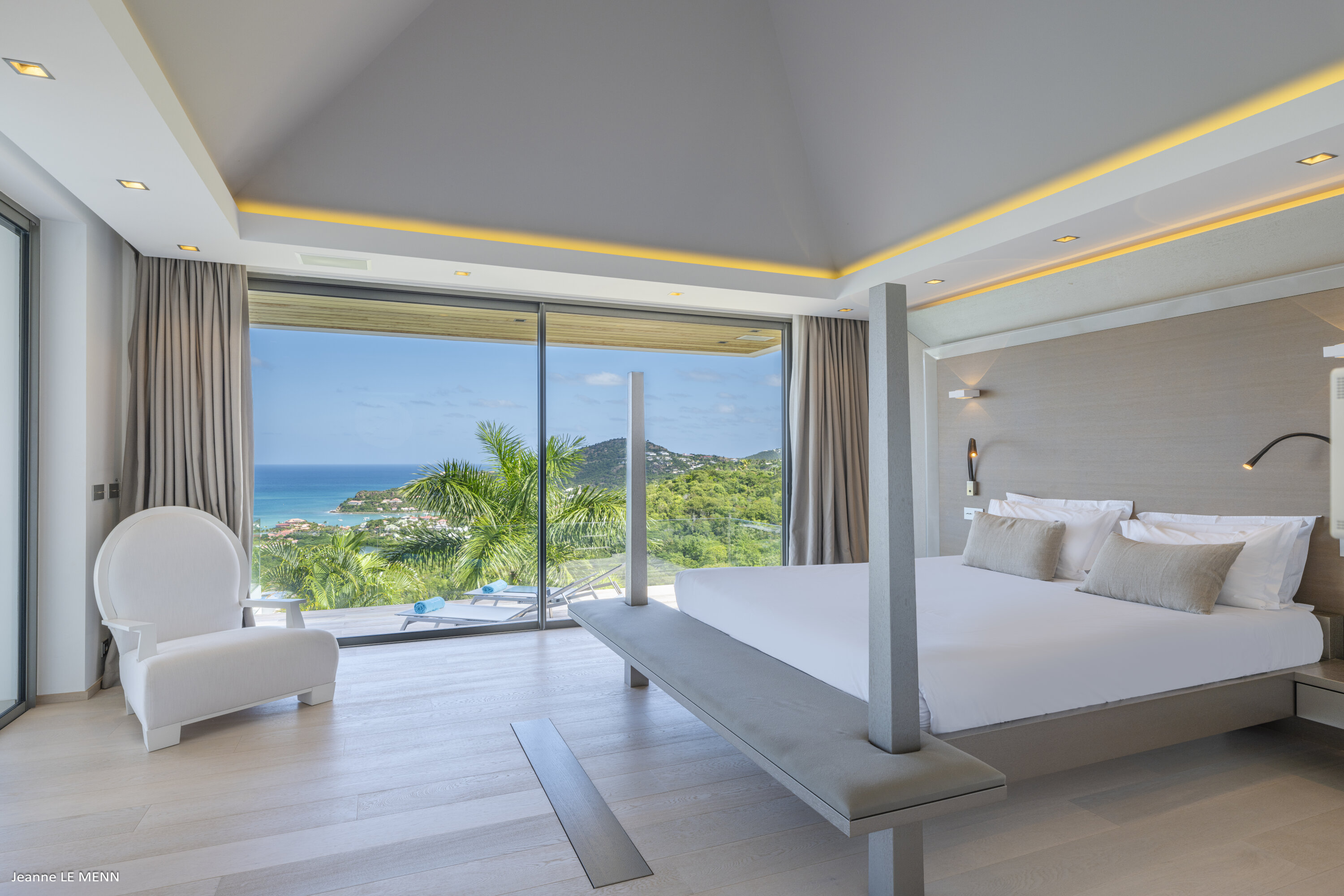 Villa Loukoko, (villa code: WV LOU) is a contemporary, 4-bedroom villa in Lurin, offering panoramic ocean views. High in the hills of Lurin, and just a short drive from Gustavia, villa Loukoko is located in a small gated community. It overlooks the St. Jean area including the airport, the bay, and the ocean. The breathtaking views can be enjoyed from nearly every corner of the villa, including the large terrace and its heated infinity pool. Its dominating position also allows for cooling breezes, but the villa can be fully air-conditioned. The main room with the living room and fully-equipped kitchen has windows on both sides, as well as a skylight overhead, which brings in plenty of light. The space opens up onto the terrace with a covered area for lounging and dining, and there is an outdoor TV hidden on the floor, perfect to watch a movie or game outdoors. One bedroom is directly accessed from the living room. The second room has access just outside the living room, and the third is behind the second. The lower bedroom is accessed near the entrance of the house. Each has a European king-sized bed, ample closet space, Smart TVs, and an ensuite bathroom with shower. On the lower level are both outdoor parking and a parking garage, which doubles as a game room with a ping pong table, a fuss ball, and a pool table. Villa Loukoko is a great choice for couples vacationing together, but will also suit families. During the December holidays, the villa rents at the full occupancy rate regardless of how many bedrooms are used.Please fill out the form to begin your inquiry and we will connect you with a seasoned villa rental specialist.