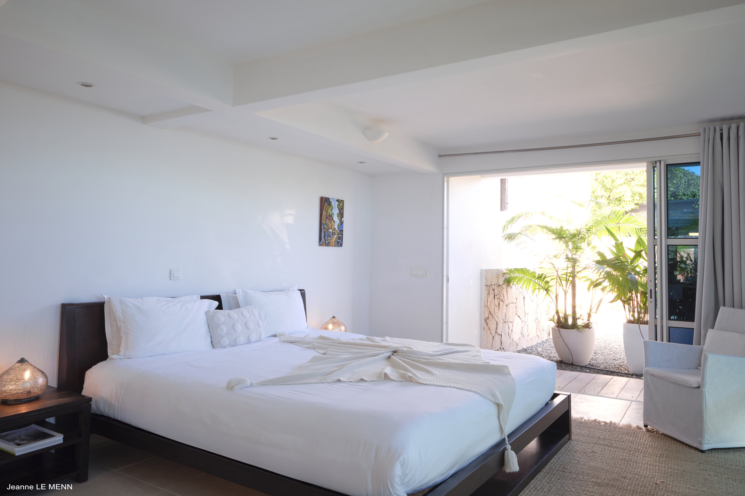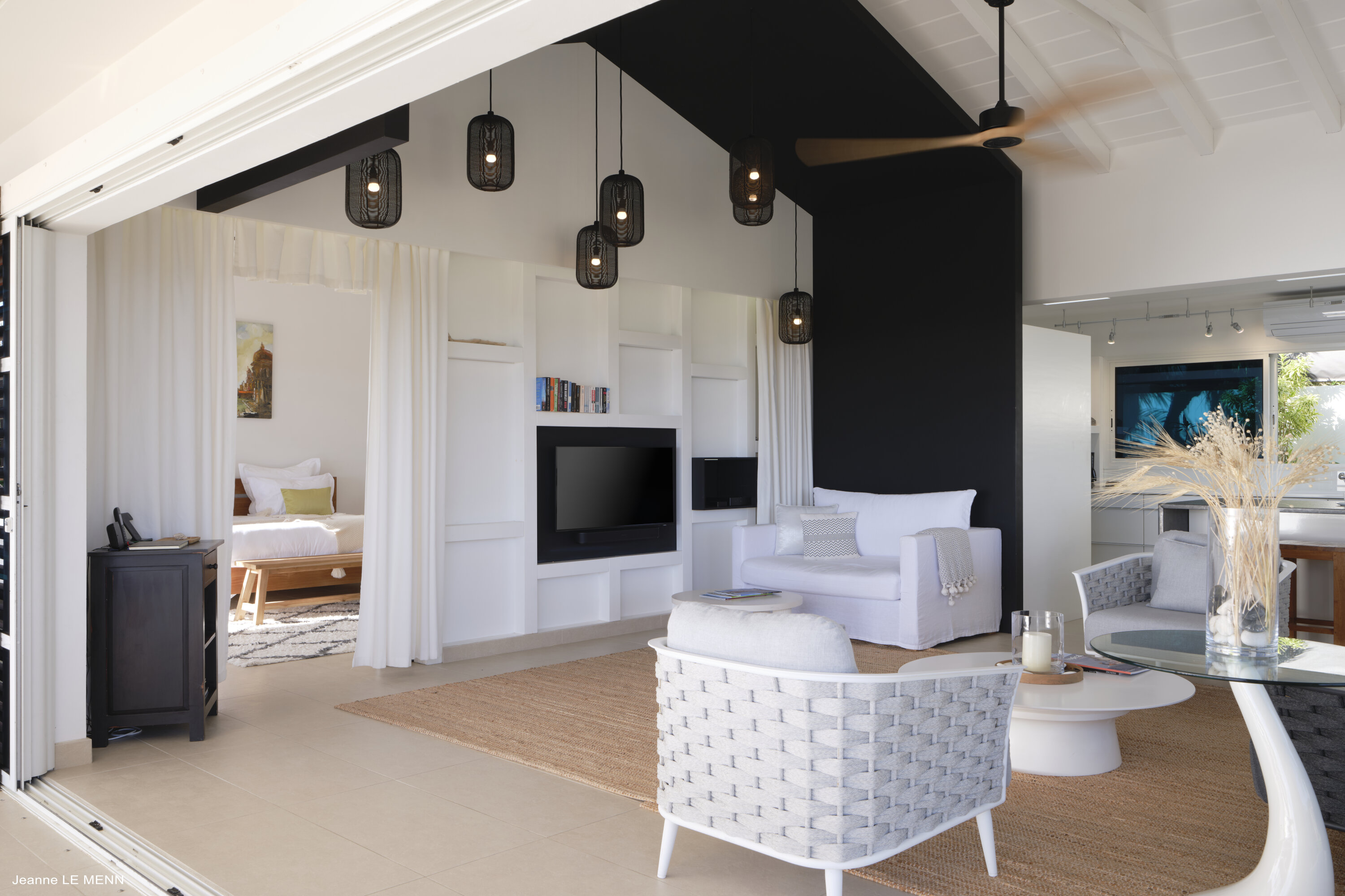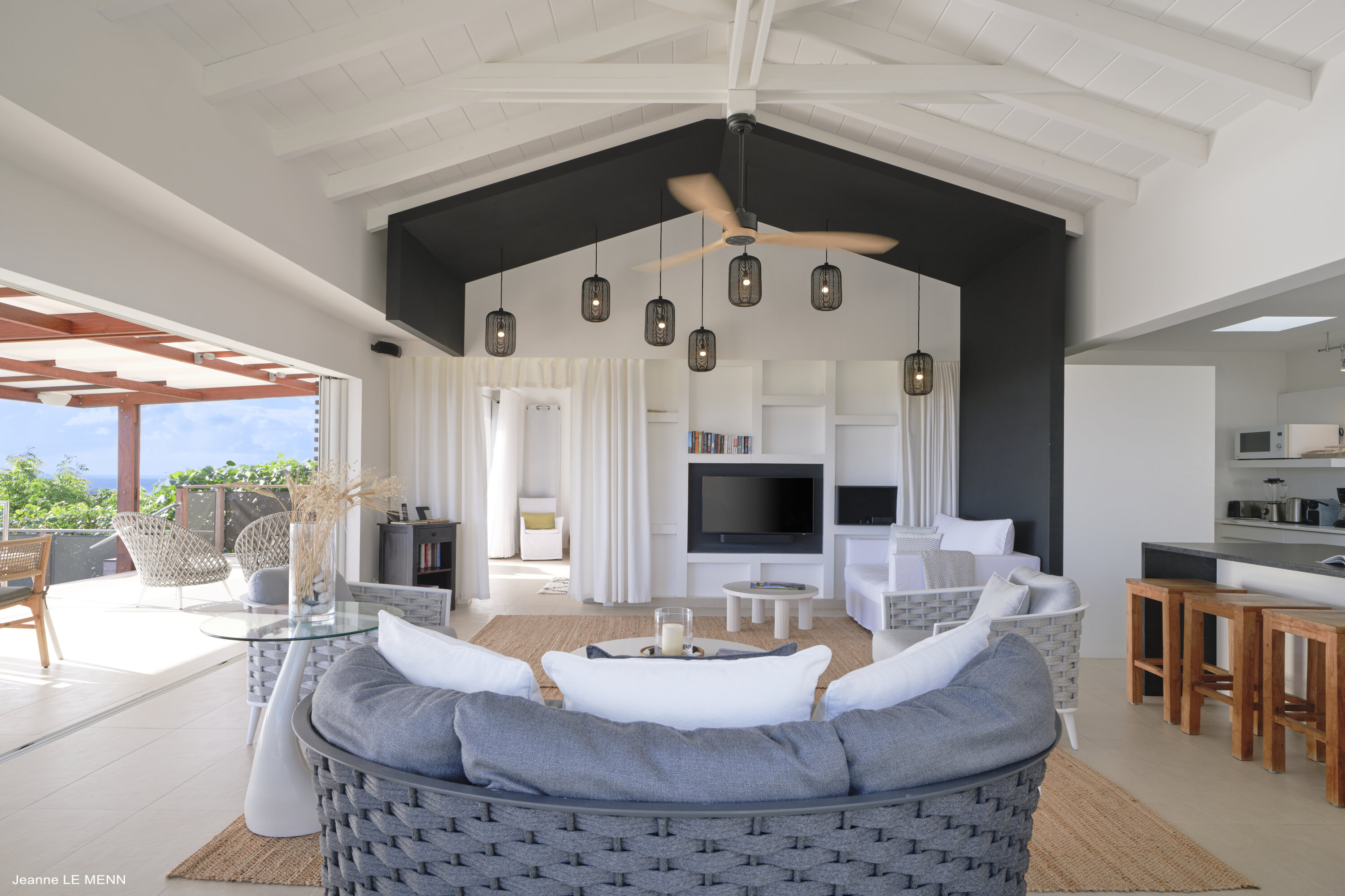 Plenty of floor-to-ceiling doors and large windows make the interior living spaces feel like they’re a part of the tropical landscape. Breezy and filled with natural light, the villa evokes feelings of island luxury; modern furnishings combine with a serene sense of style and pared-back décor.