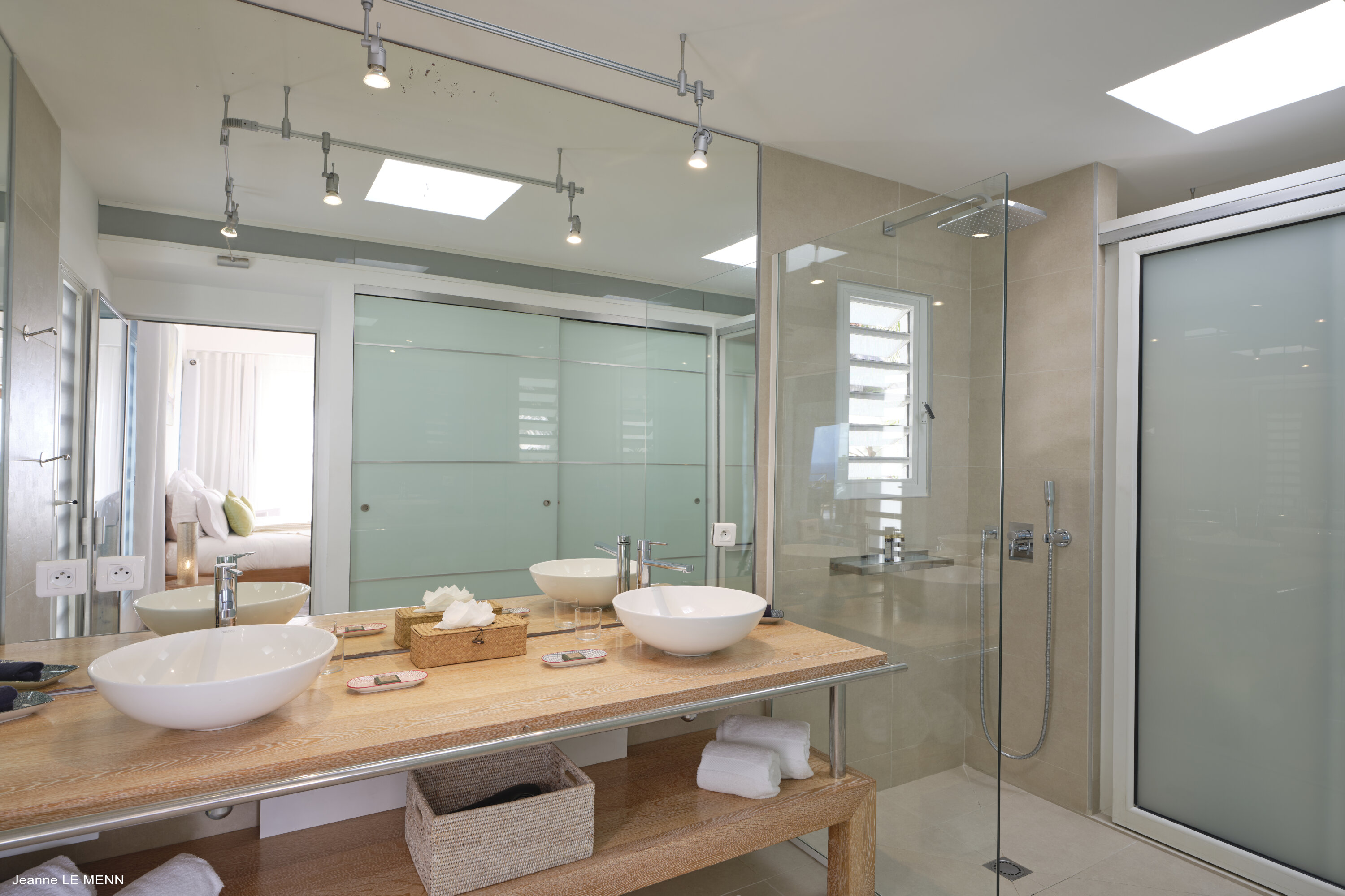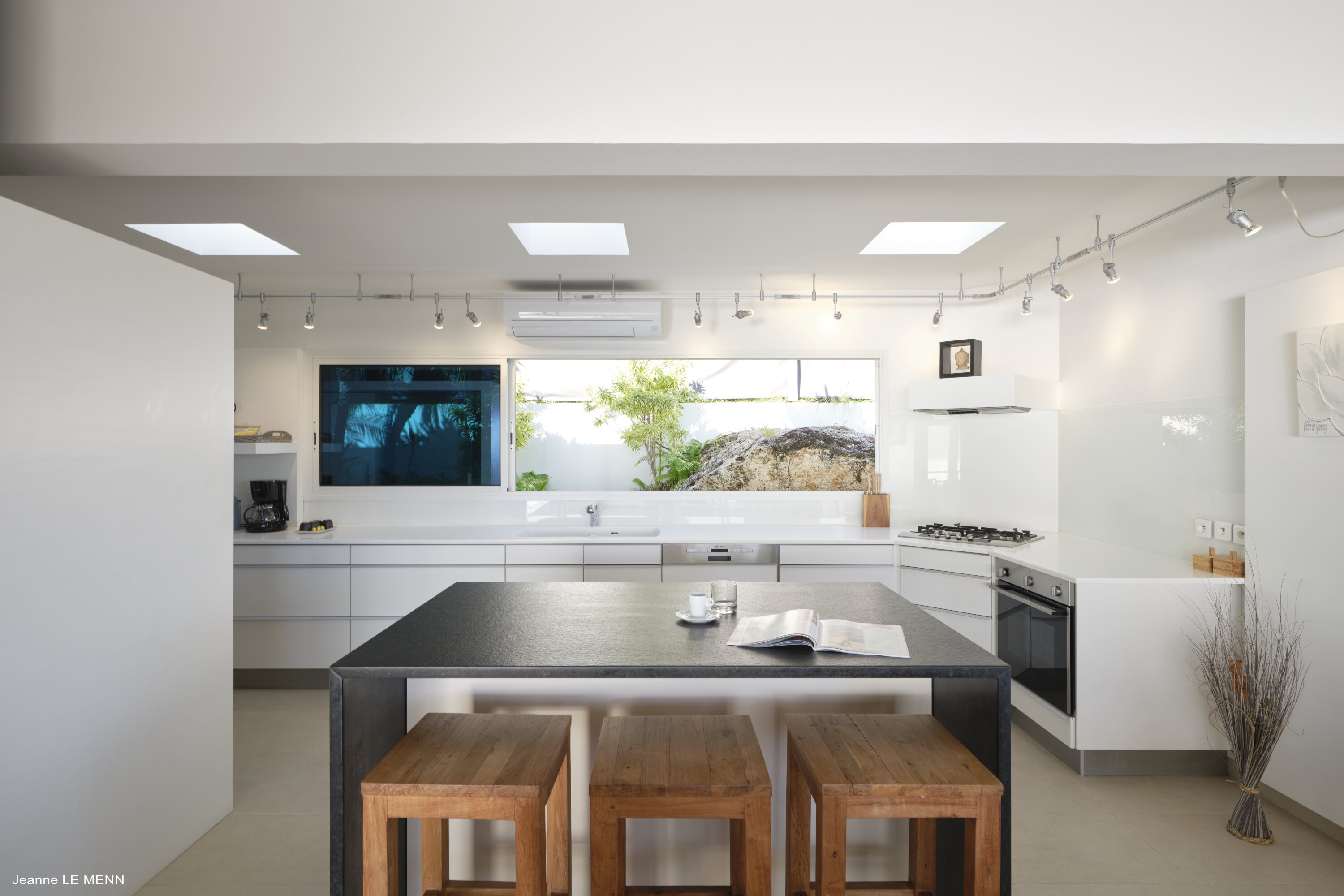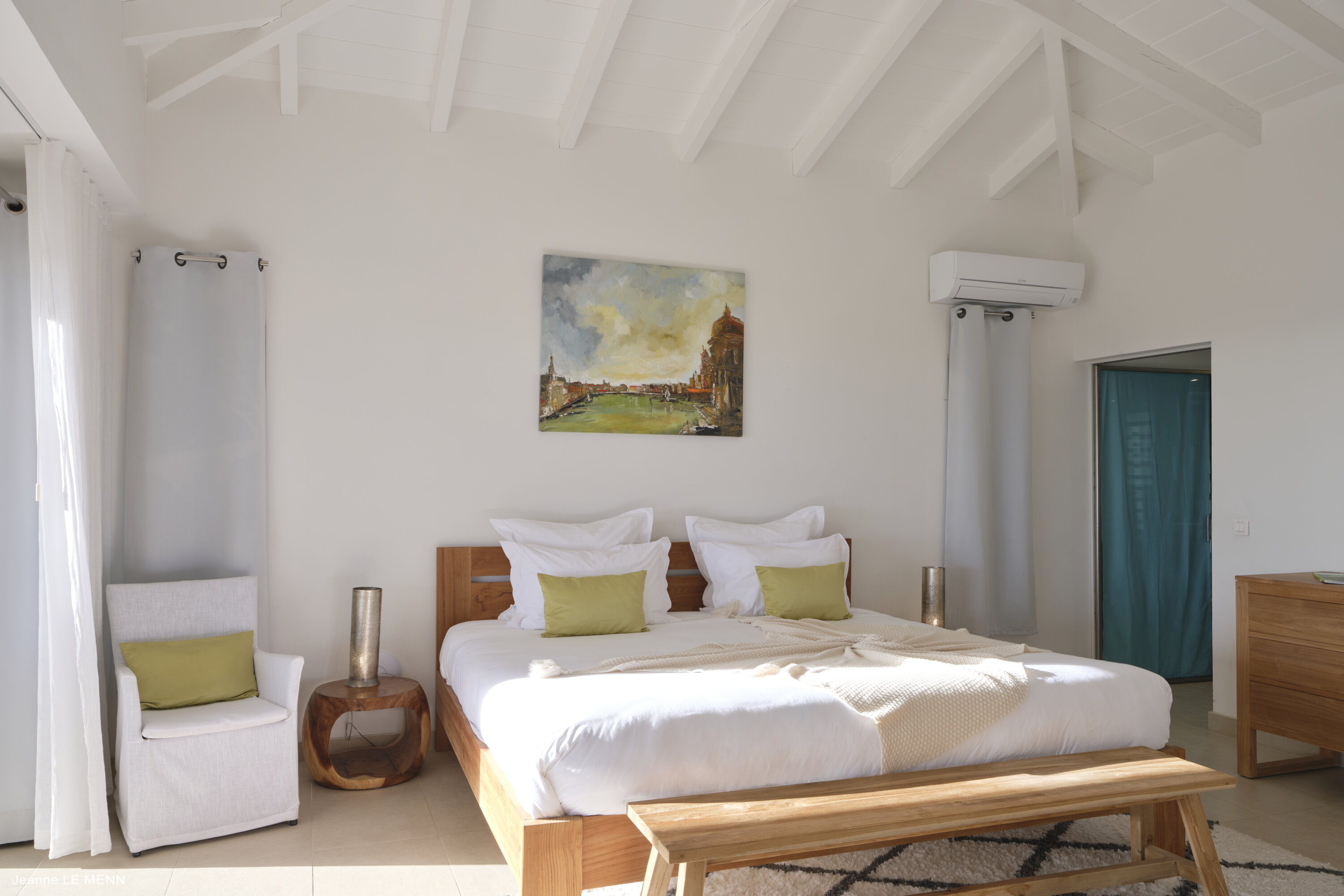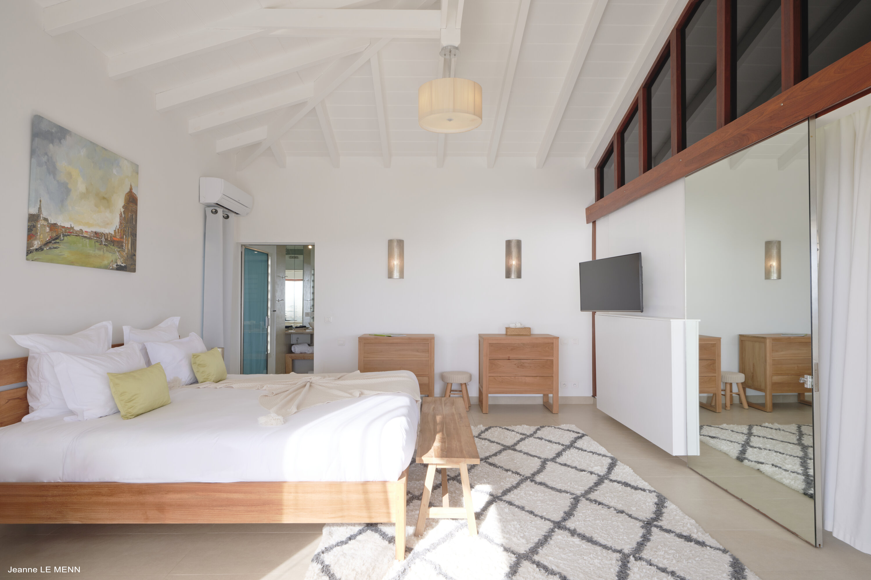 Plenty of floor-to-ceiling doors and large windows make the interior living spaces feel like they’re a part of the tropical landscape. Breezy and filled with natural light, the villa evokes feelings of island luxury; modern furnishings combine with a serene sense of style and pared-back décor.