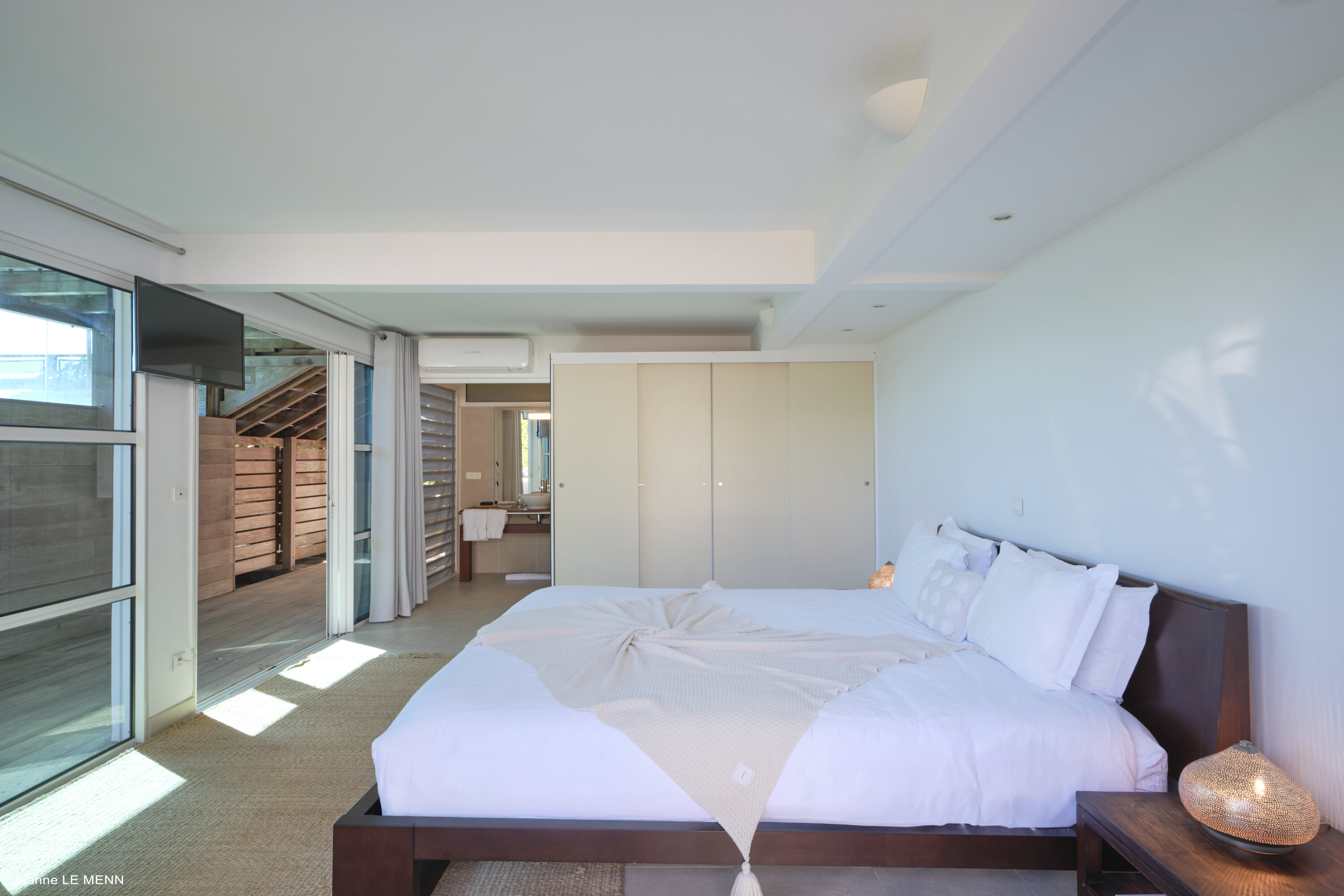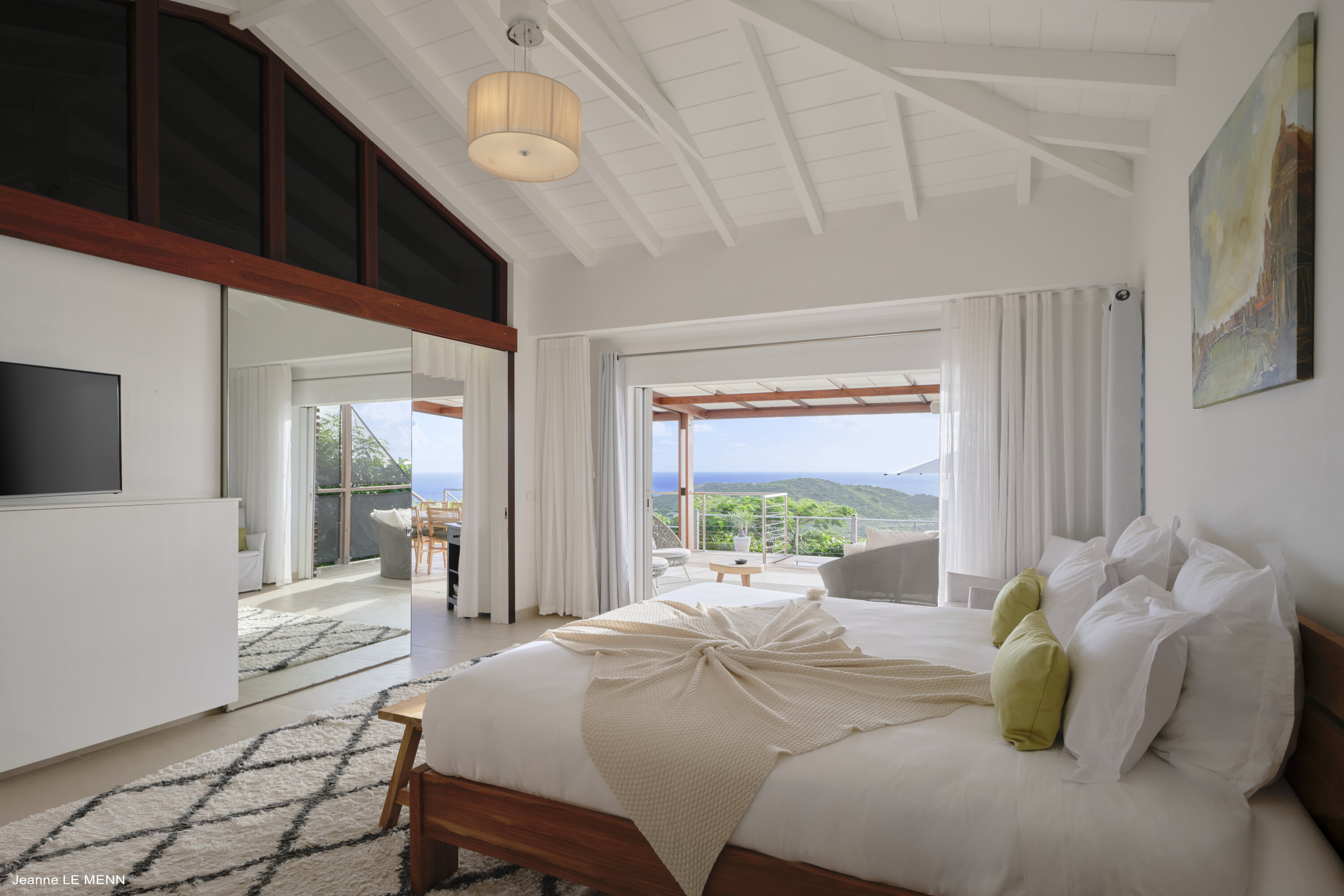 The master bedroom is located off the living room and features modern décor, a king-sized bed, and an ensuite bathroom. Sliding doors open wide to the outdoor terrace, welcoming in the breezes and wonderful views.