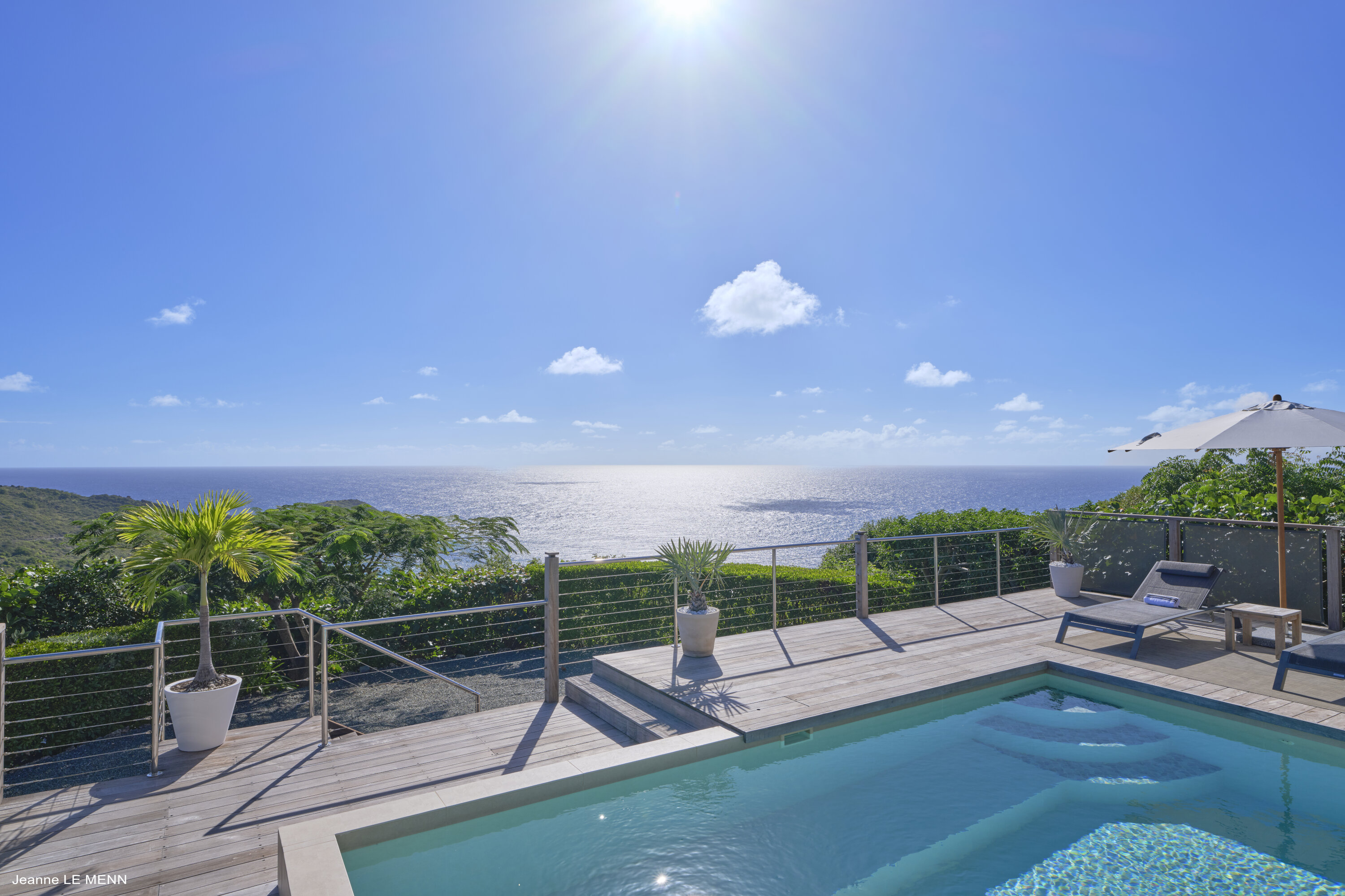 On the lower level of the outdoor space is the swimming pool, bathed in the island sun. There are chaise lounges for soaking up the island rays, dropping off for a nap, or sipping a cool drink while gazing out at the sea.