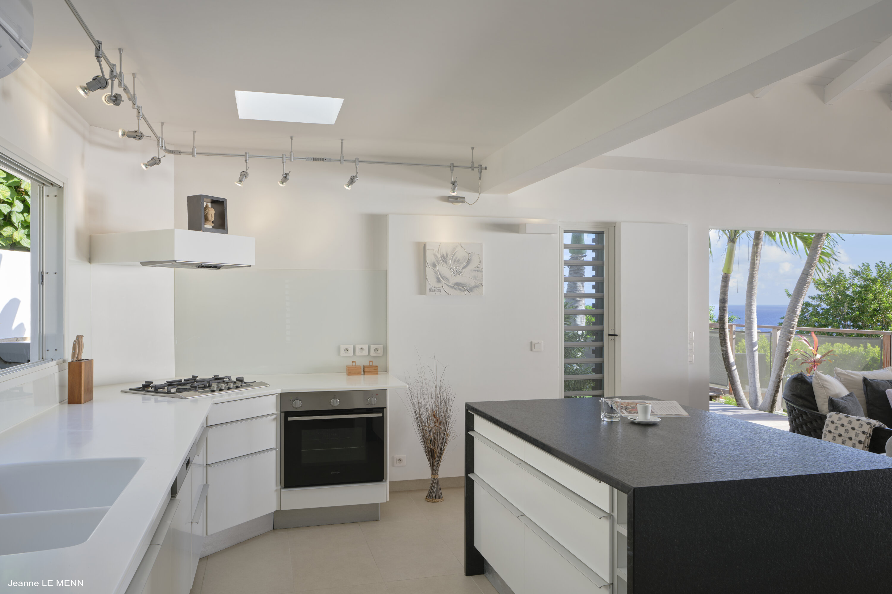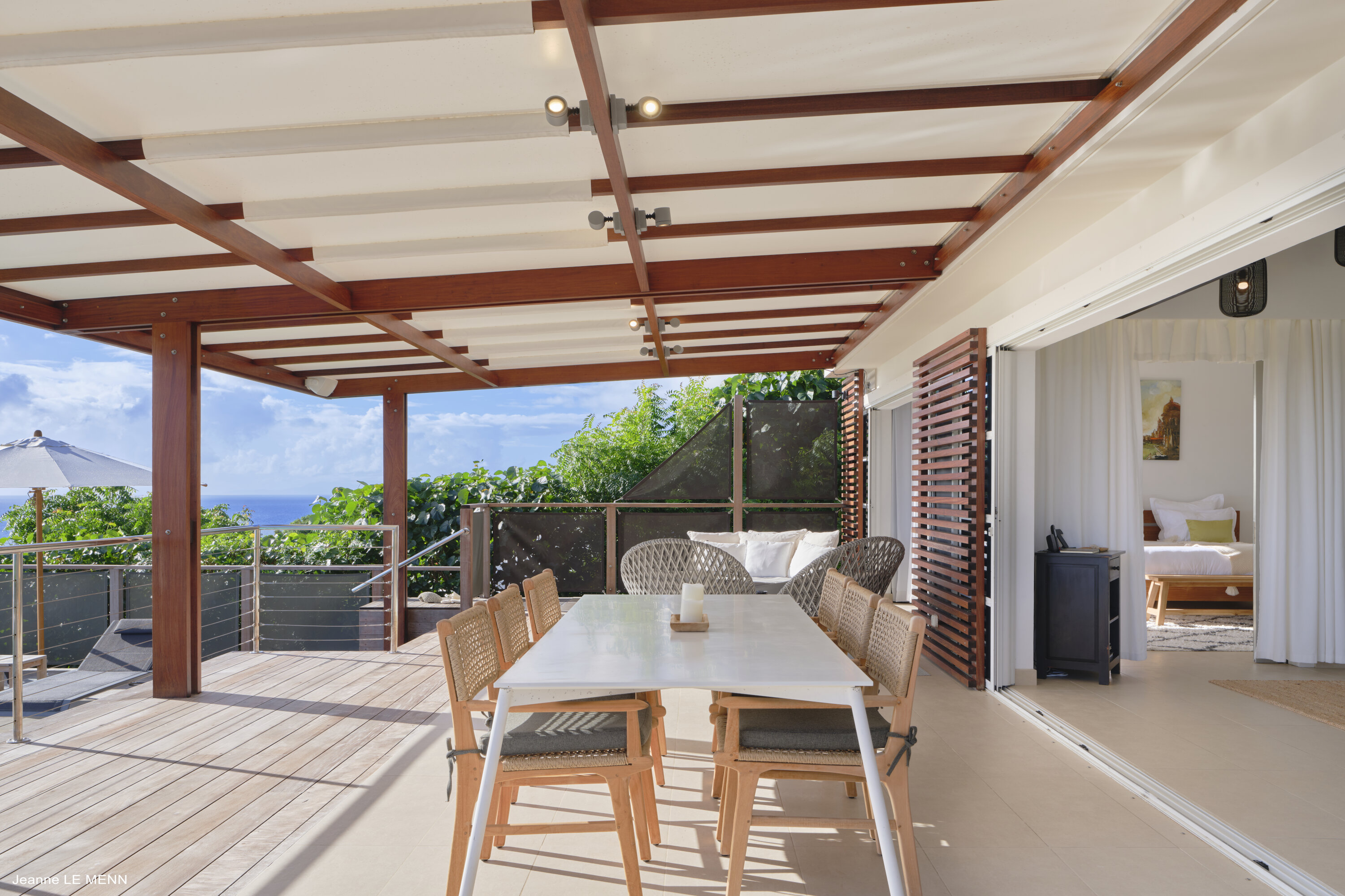 There’s an island with stool seating, a good spot for fresh eggs and coffee in the mornings, or a cocktail hour in the evening. The dining table on the covered terrace outside offers a picturesque setting for meals together, with the sparkling Caribbean and rolling green hills as a backdrop.