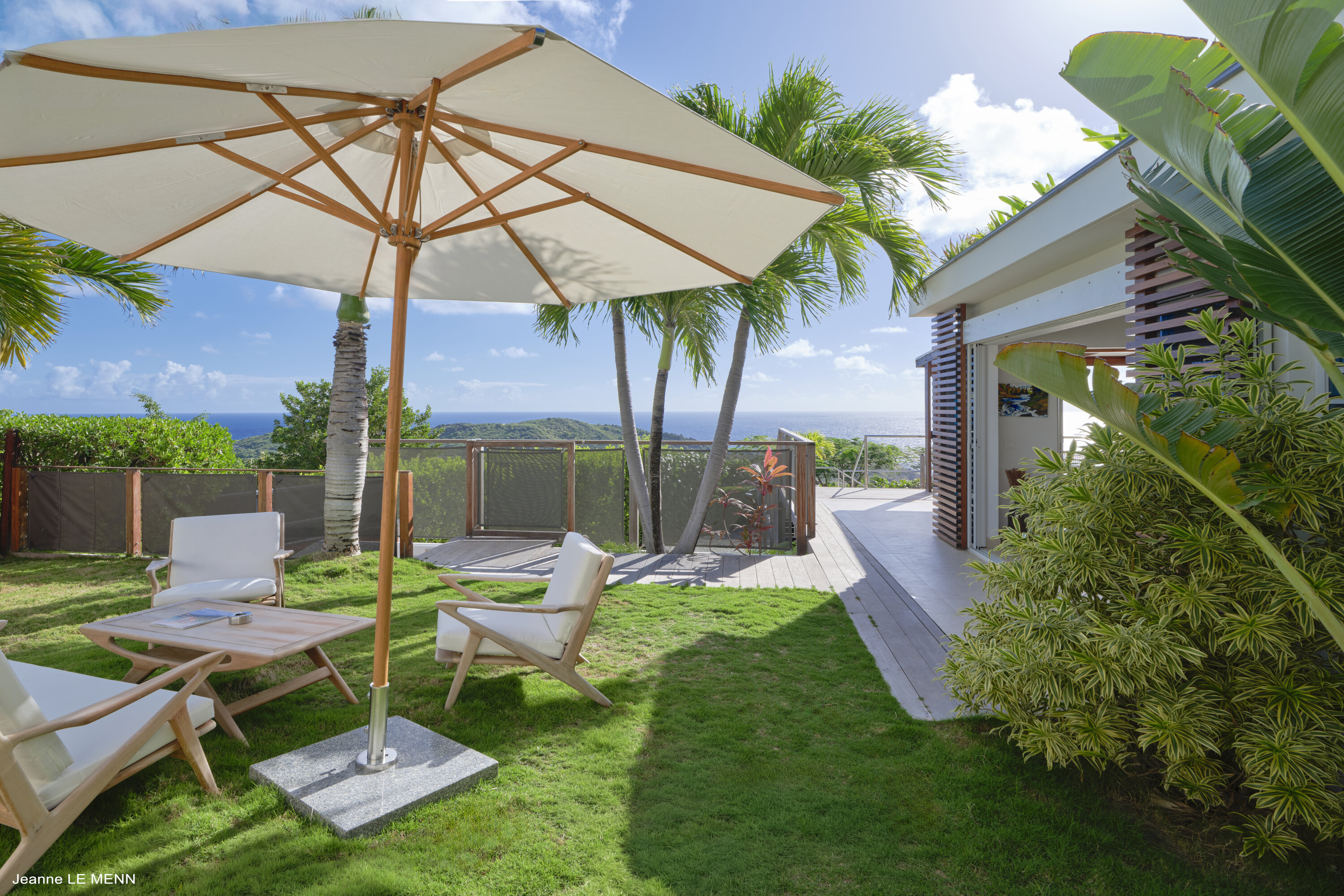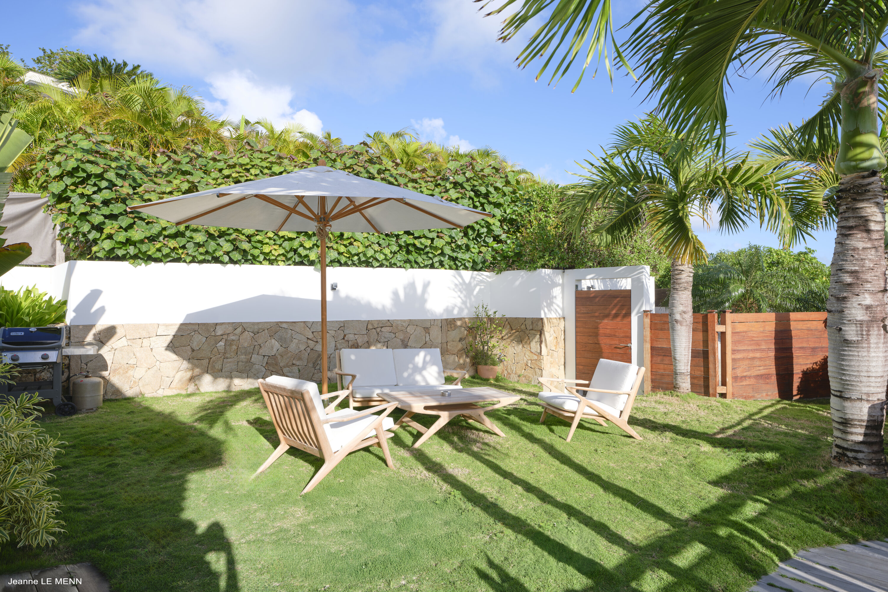 The split-level outdoor area at Villa Magnifica makes it easy to spend a day outside, soaking up the gorgeous weather. The covered terrace features more seating and a daybed, an ideal spot to chill out in the shade. This space opens to a side lawn, with a table for a quiet drink and aperitif in the warm evening air.