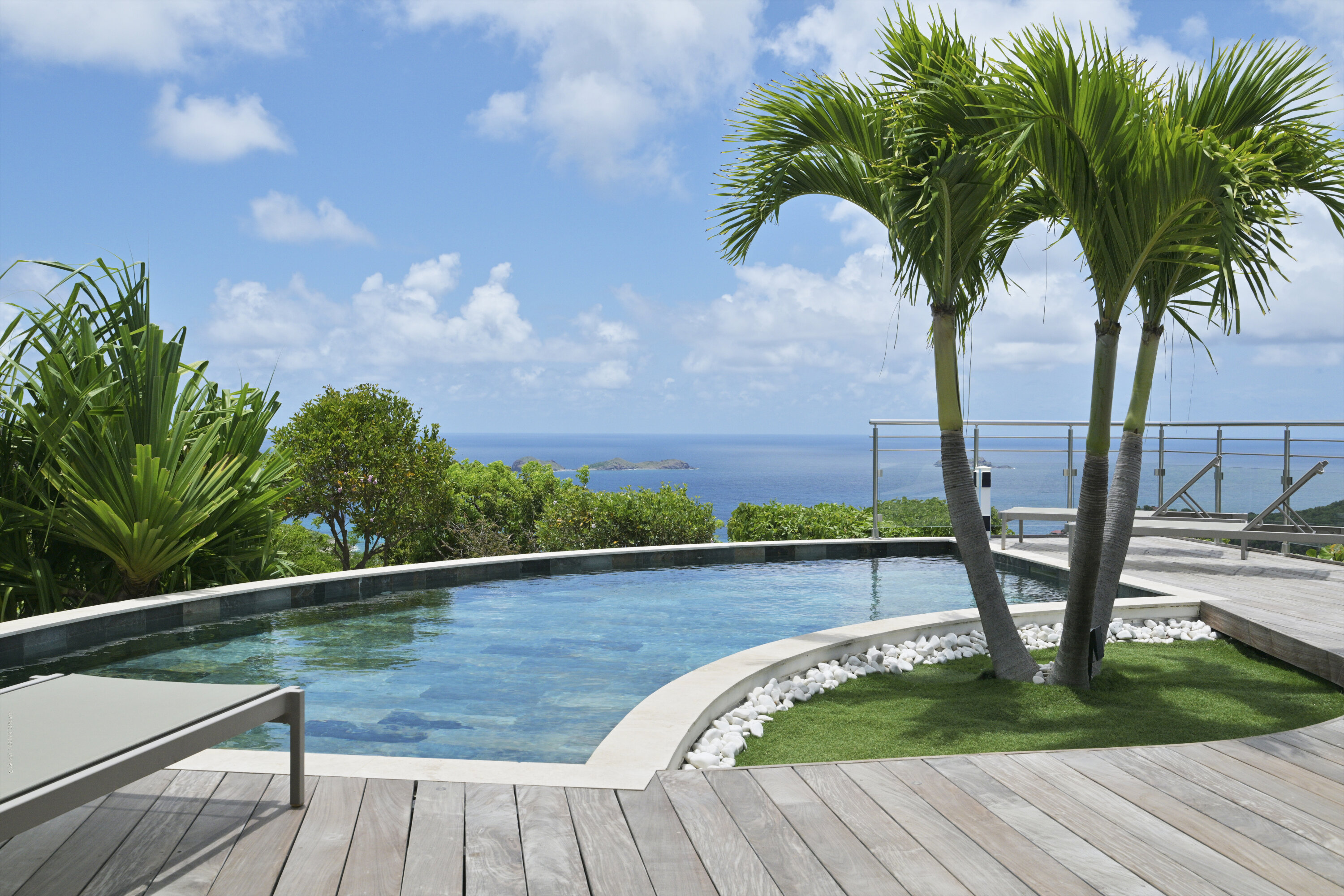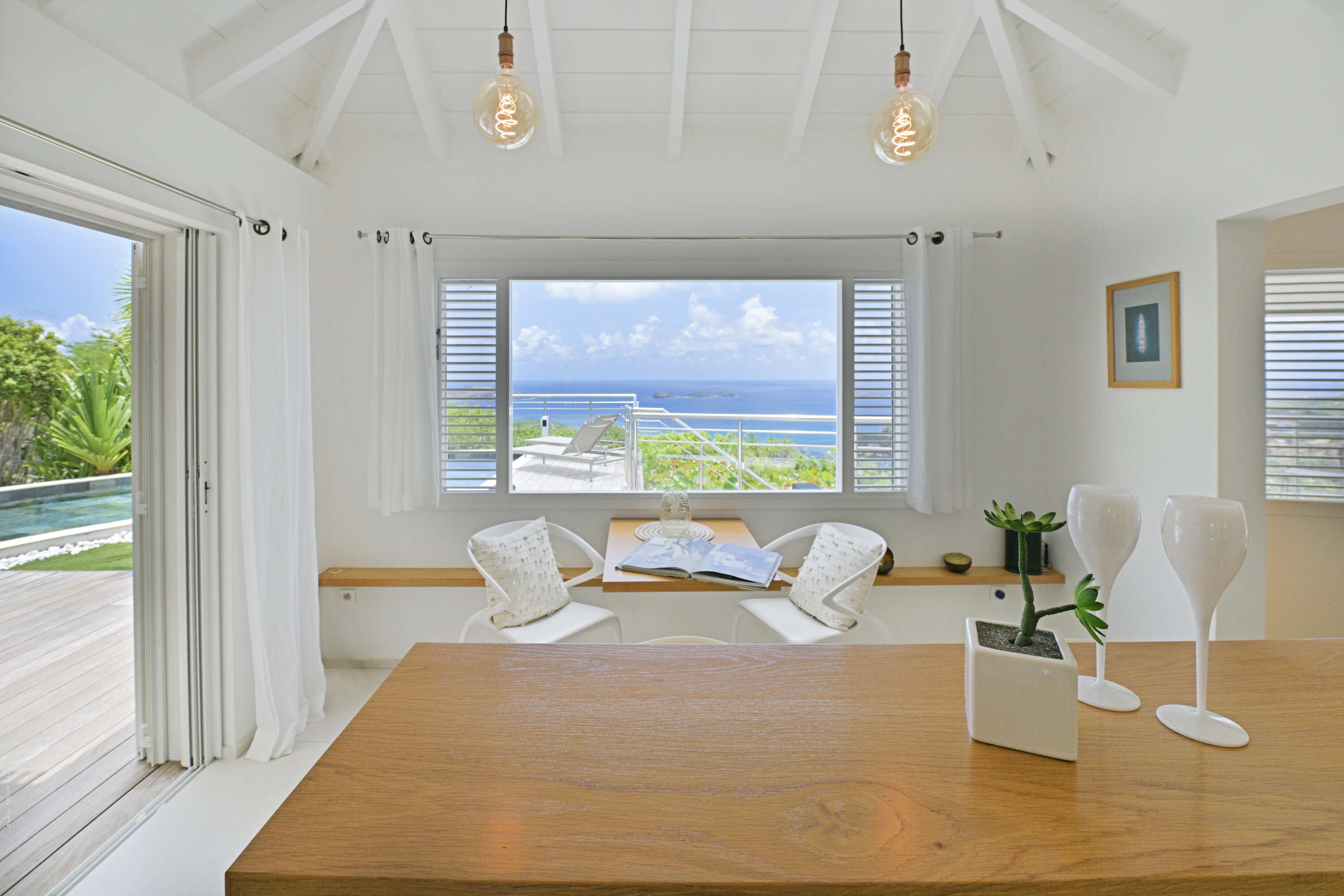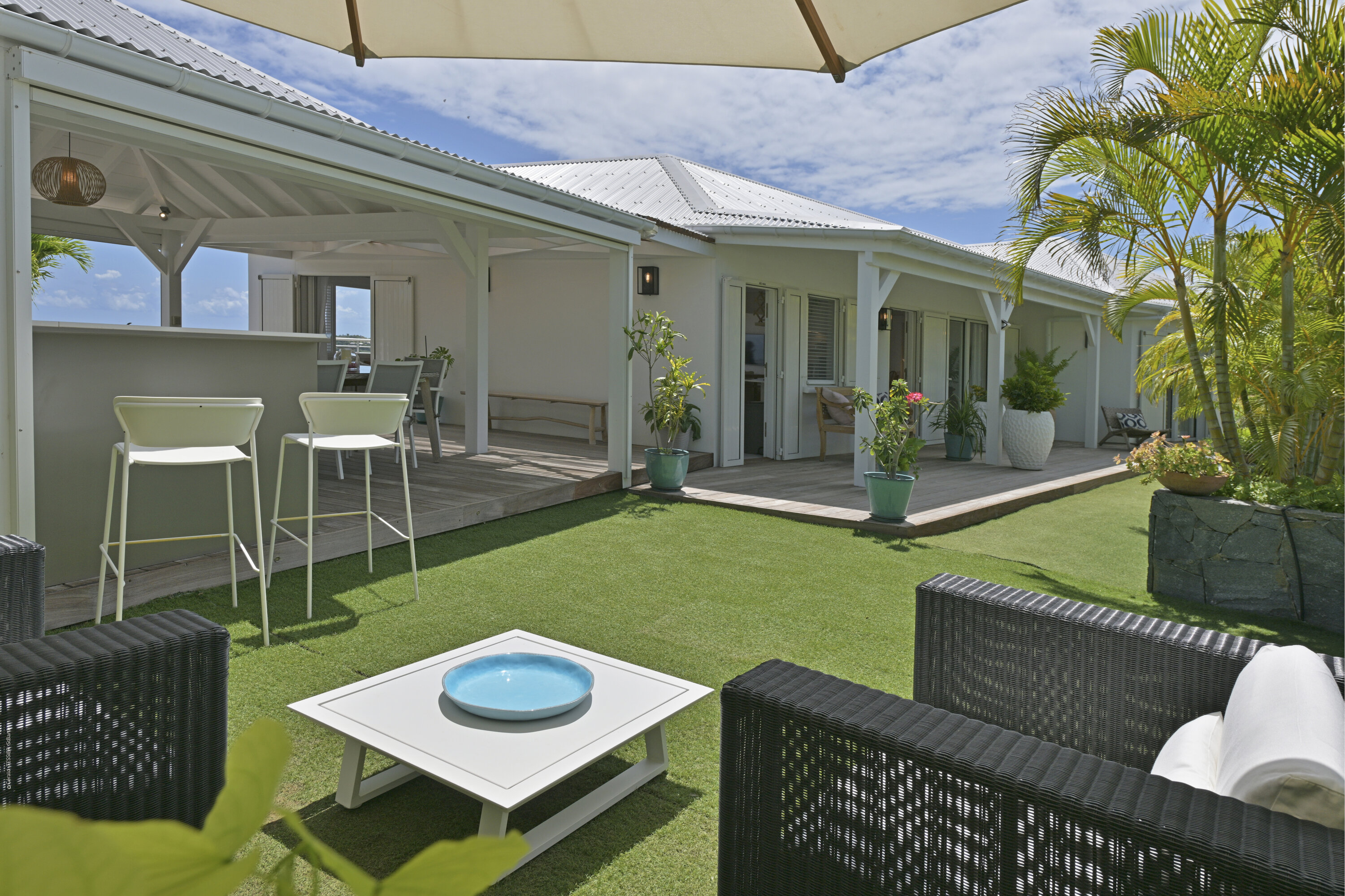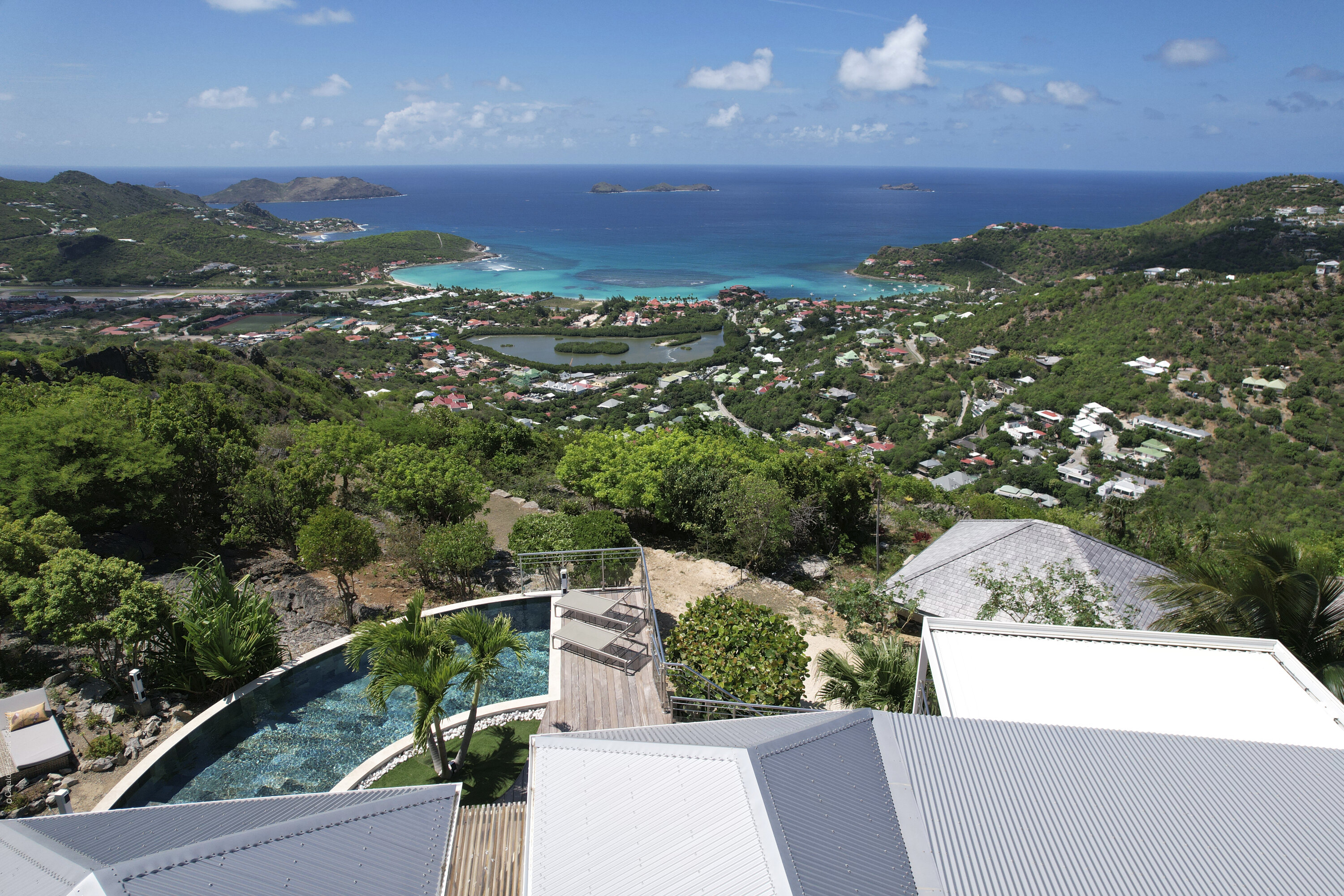 Villa Marris, (villa code: WV MRS) is a new, 3-bedroom villa at the top of Lurin above St. Jean, with stunning panoramic views. Hidden at the end of a long driveway, from the main road that runs through Lurin between St. Jean and Gustavia, Villa Marris is a tranquil oasis with truly breathtaking views. The contemporary design centers around the views, which can be enjoyed from nearly all corners of the villa. This villa was designed not just to benefit from the views, but also from the refreshing breezes and Caribbean-style, outdoor living. A spacious, sectioned main room offers a large dining table just off the modern kitchen, and a living area with comfortable seating. Off the living room is a small hallway with on one end the first master bedroom with ocean views. It comes with a Euro king bed, ensuite bathroom with shower, and dressing. A second room is situated on the other side of the hallway, which offers garden views and has a bathroom with a shower in the hallway. This room has two twin beds that can be made up as a Euro king and is perfect for children, but can also suit adults. The second master bedroom is on the lower floor and has a large private terrace, ocean views, a Euro king bed, dressing and ensuite bathroom with shower. There is ample outdoor space, with a covered terrace extending from the living room, which connects to the half-moon-shaped pool on the far end. A large gazebo offers seating and outdoor dining, and there is extra seating just behind. Villa Marris is a perfect family vacation home, but will also suit two couples vacationing together. During the December holidays, the villa rents at the full occupancy rate regardless of how many bedrooms are used.Please fill out the form to begin your inquiry and we will connect you with a seasoned villa rental specialist.