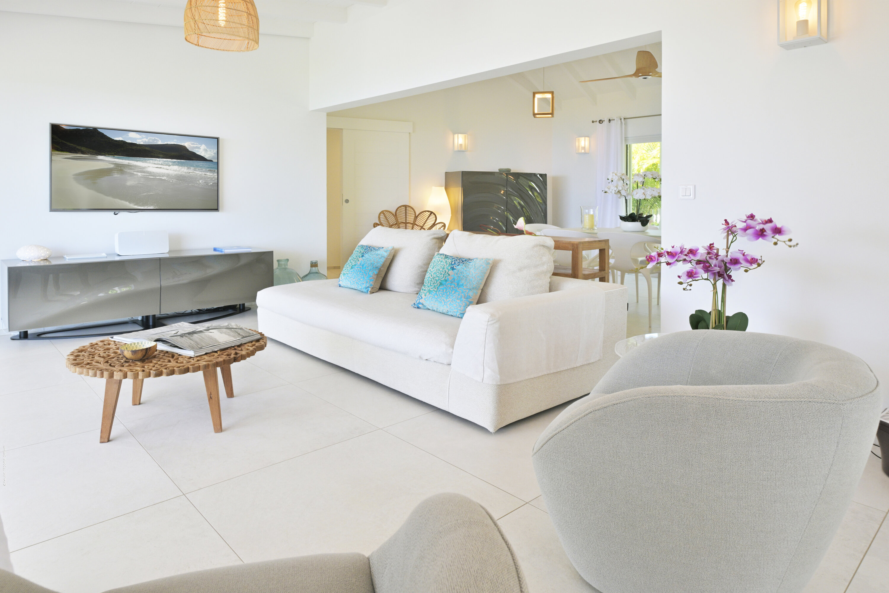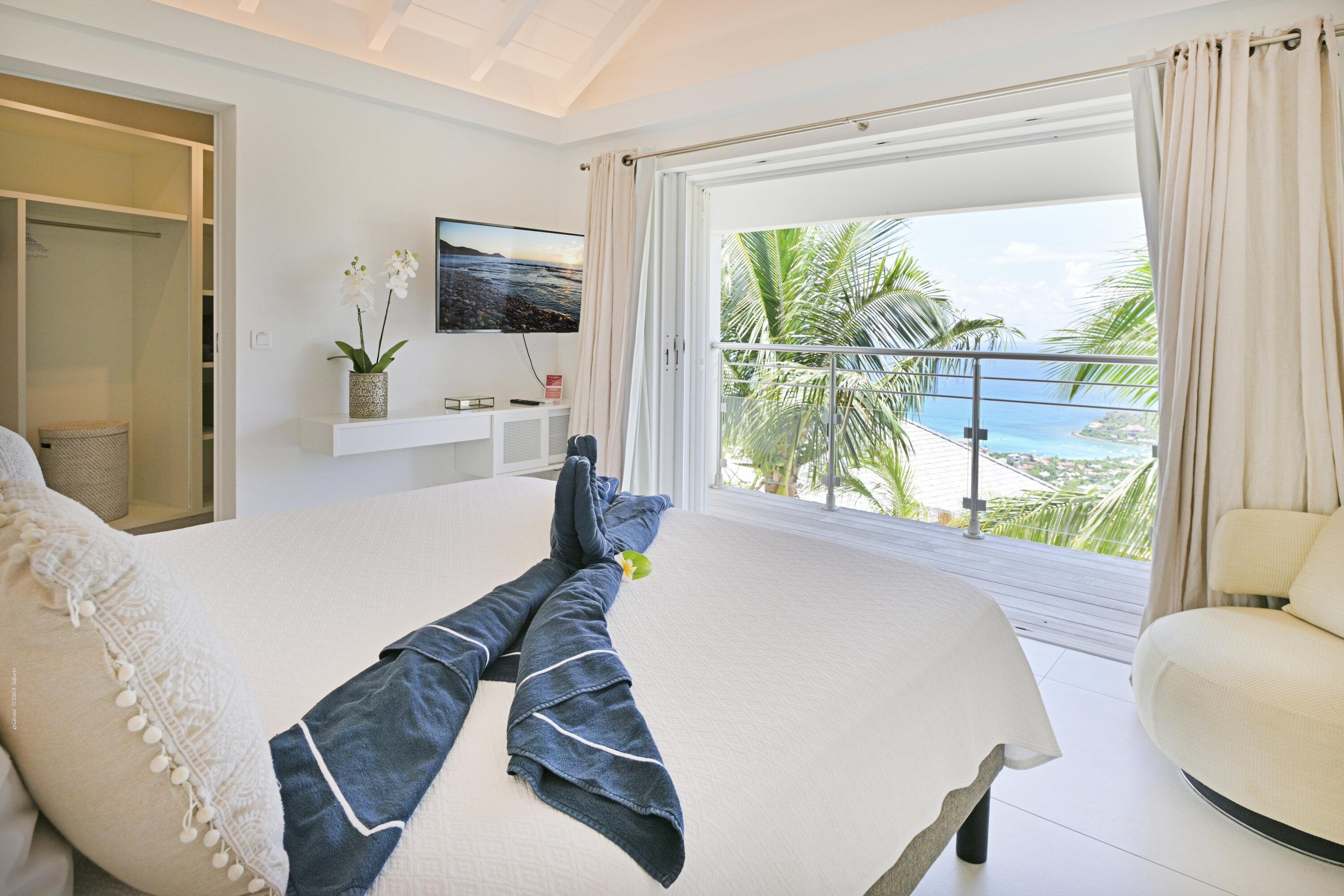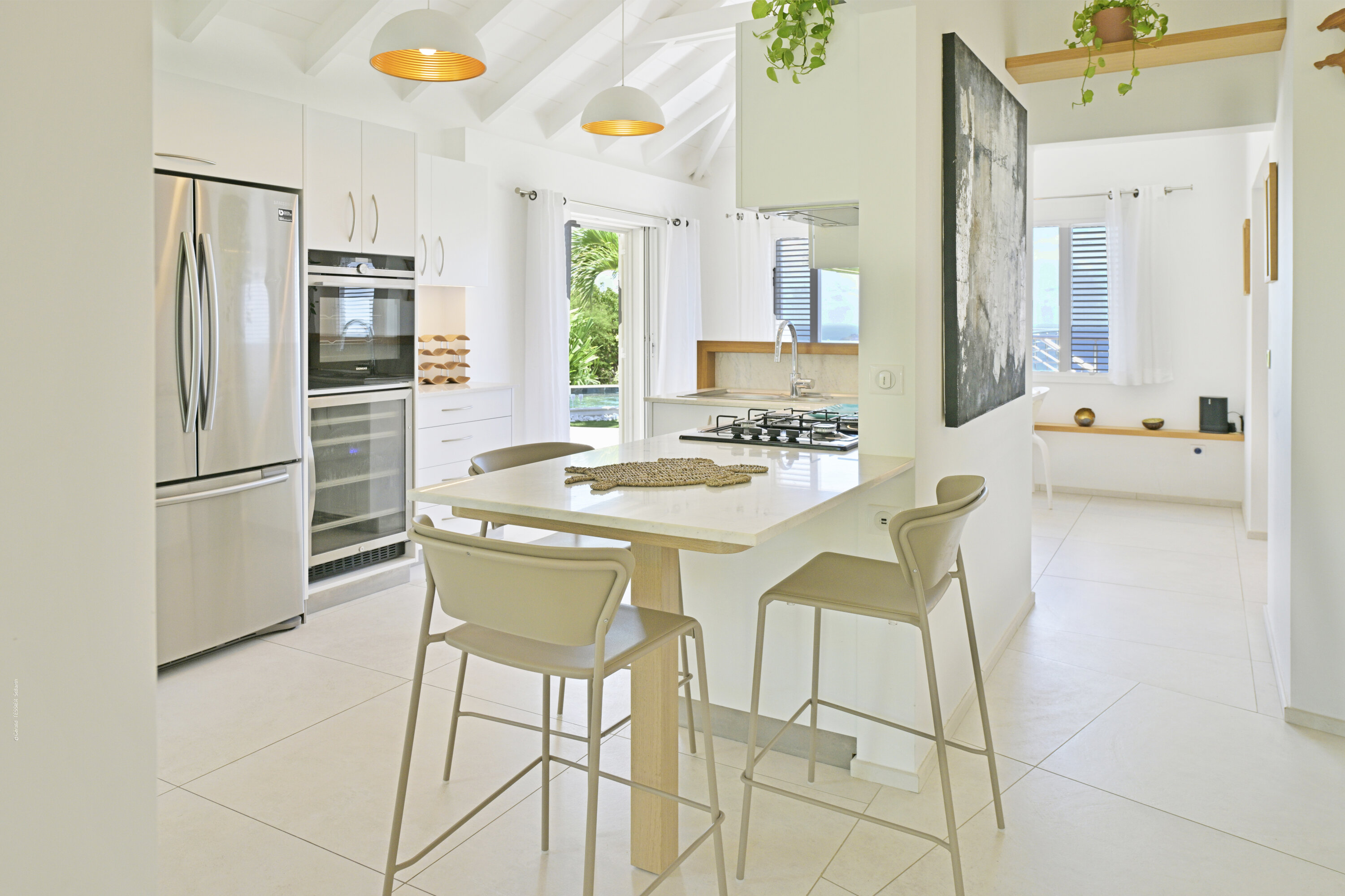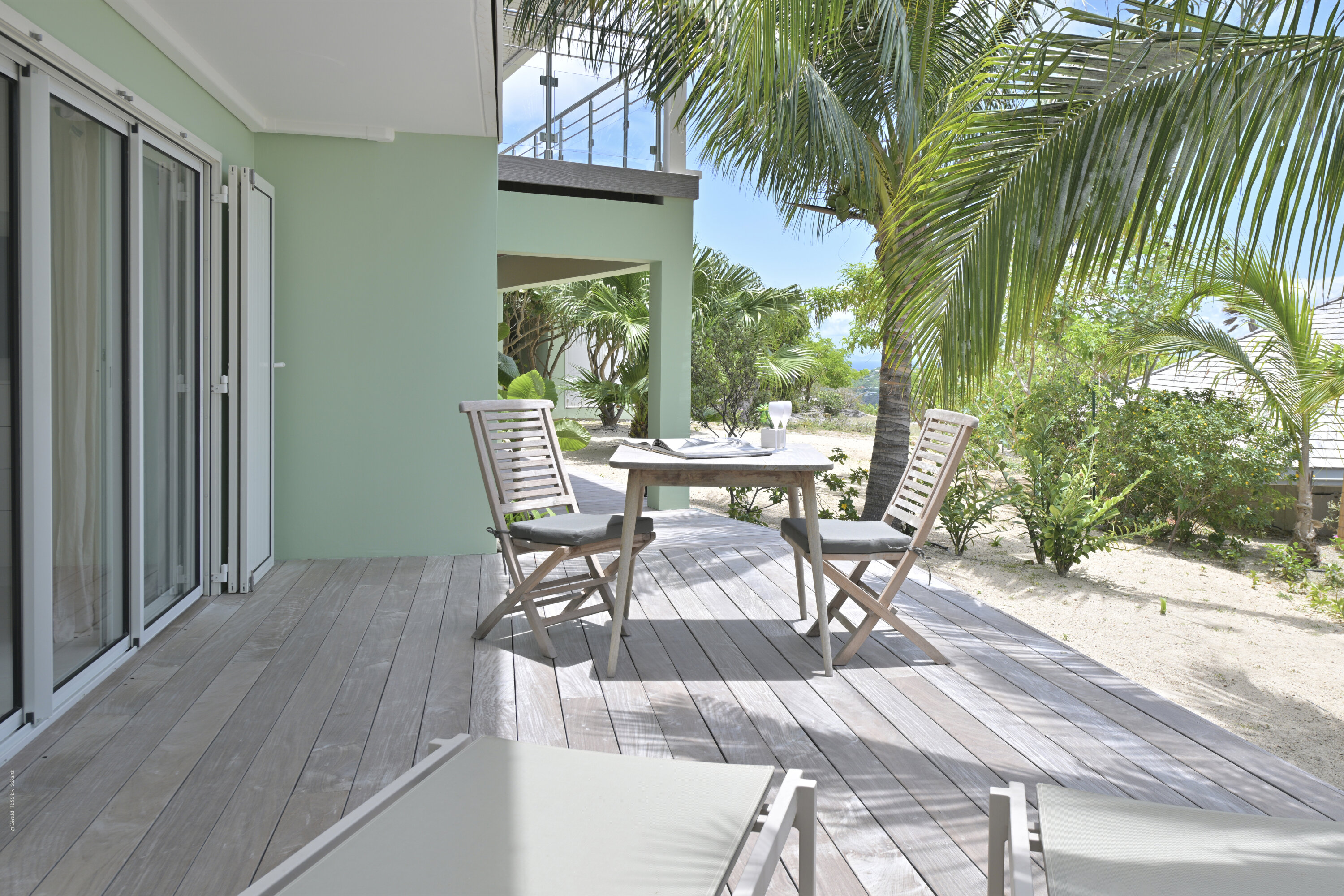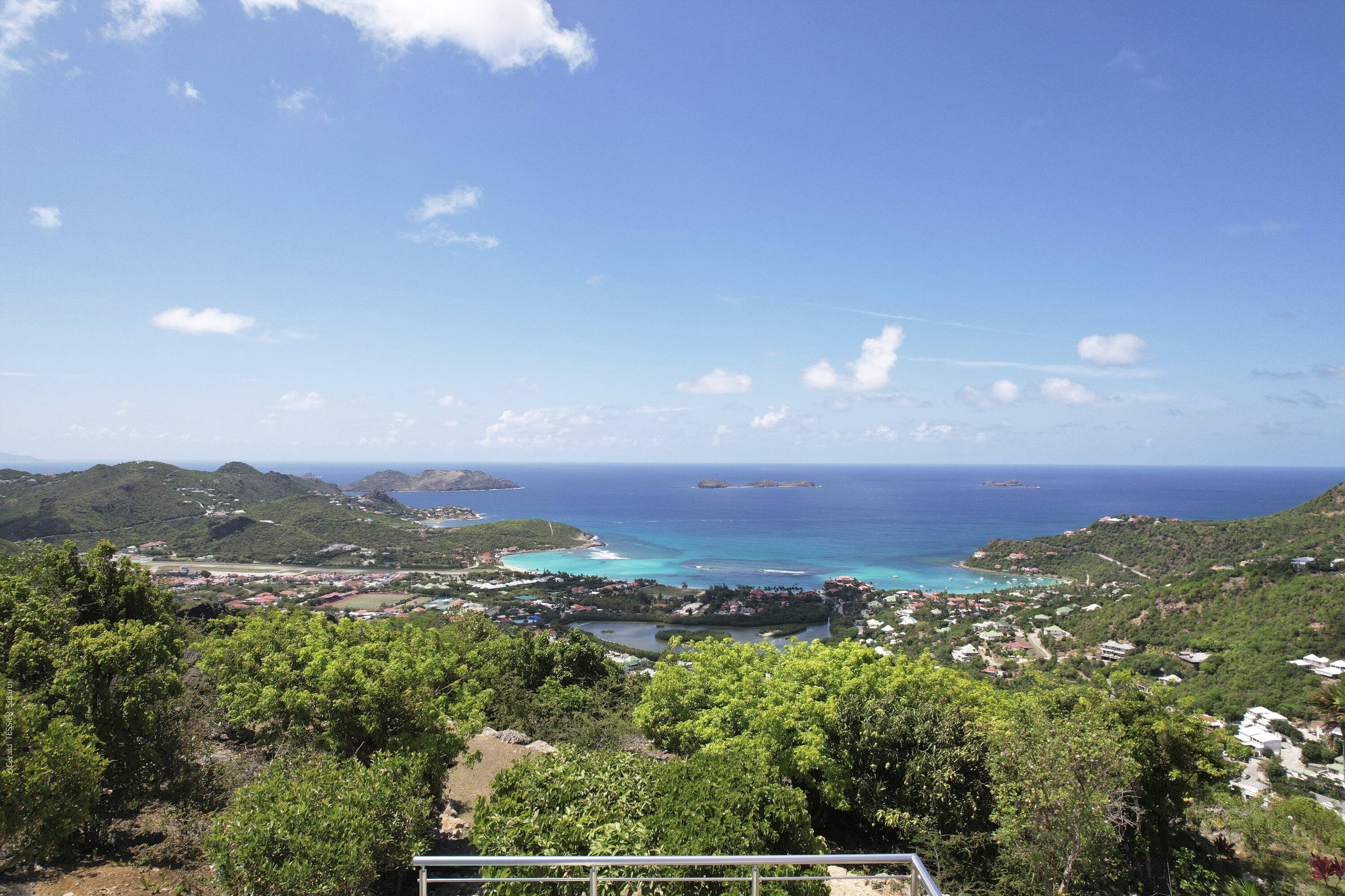 Villa Marris, (villa code: WV MRS) is a new, 3-bedroom villa at the top of Lurin above St. Jean, with stunning panoramic views. Hidden at the end of a long driveway, from the main road that runs through Lurin between St. Jean and Gustavia, Villa Marris is a tranquil oasis with truly breathtaking views. The contemporary design centers around the views, which can be enjoyed from nearly all corners of the villa. This villa was designed not just to benefit from the views, but also from the refreshing breezes and Caribbean-style, outdoor living. A spacious, sectioned main room offers a large dining table just off the modern kitchen, and a living area with comfortable seating. Off the living room is a small hallway with on one end the first master bedroom with ocean views. It comes with a Euro king bed, ensuite bathroom with shower, and dressing. A second room is situated on the other side of the hallway, which offers garden views and has a bathroom with a shower in the hallway. This room has two twin beds that can be made up as a Euro king and is perfect for children, but can also suit adults. The second master bedroom is on the lower floor and has a large private terrace, ocean views, a Euro king bed, dressing and ensuite bathroom with shower. There is ample outdoor space, with a covered terrace extending from the living room, which connects to the half-moon-shaped pool on the far end. A large gazebo offers seating and outdoor dining, and there is extra seating just behind. Villa Marris is a perfect family vacation home, but will also suit two couples vacationing together. During the December holidays, the villa rents at the full occupancy rate regardless of how many bedrooms are used.Please fill out the form to begin your inquiry and we will connect you with a seasoned villa rental specialist.