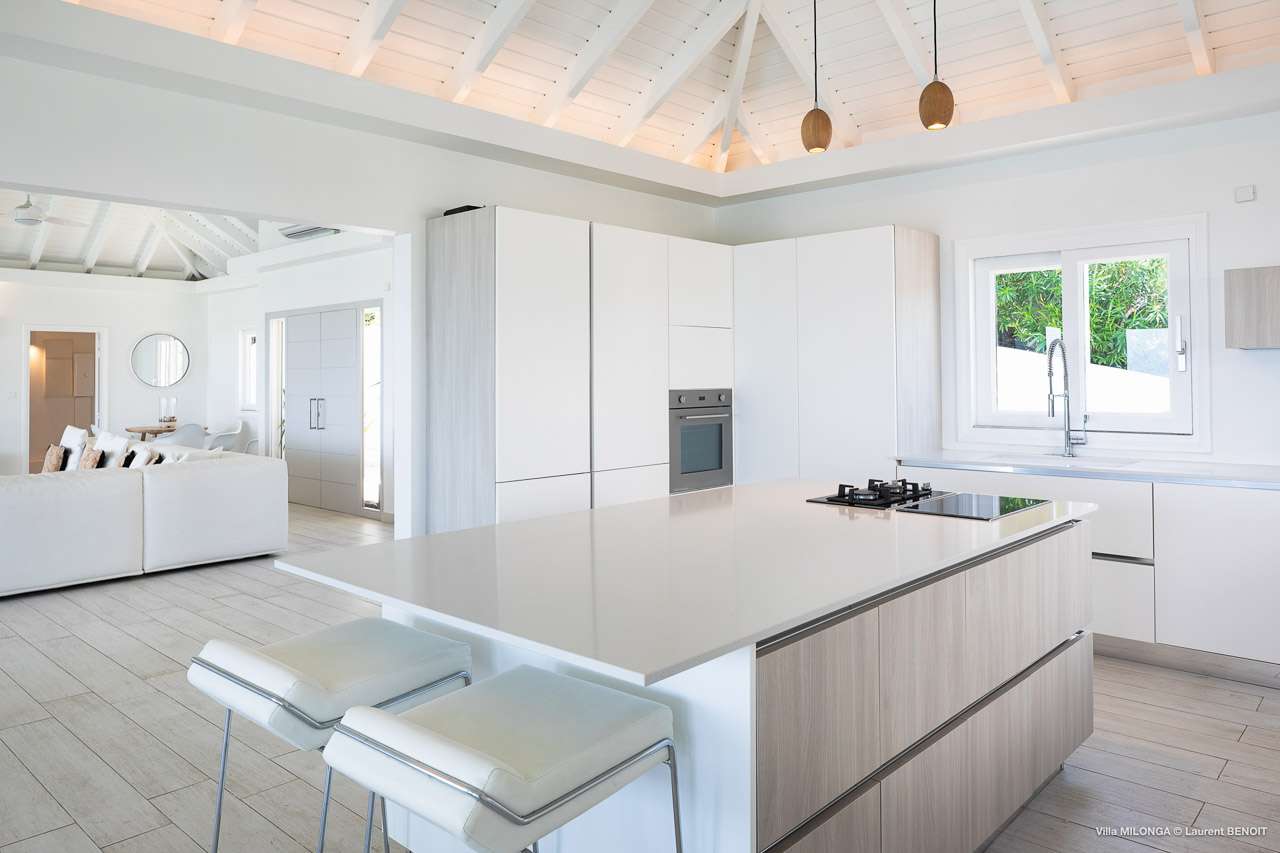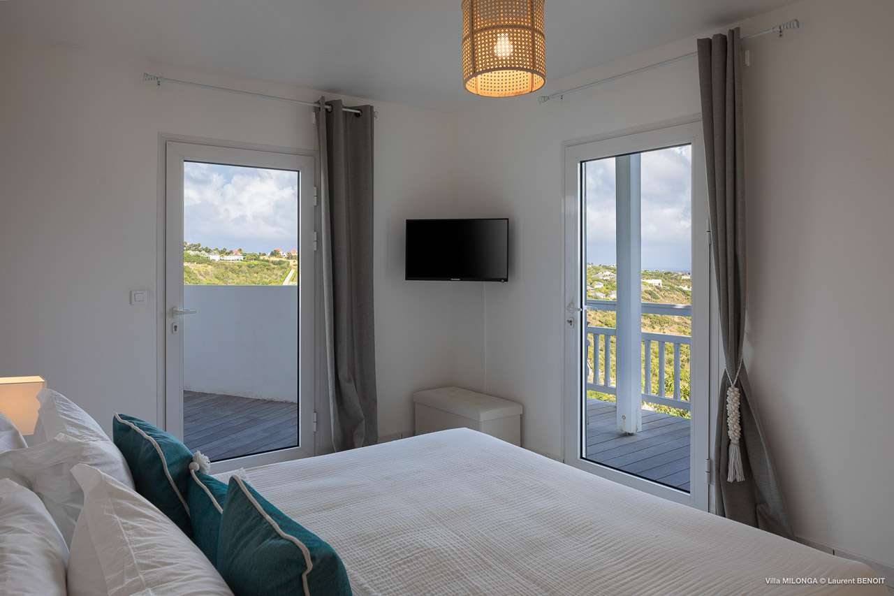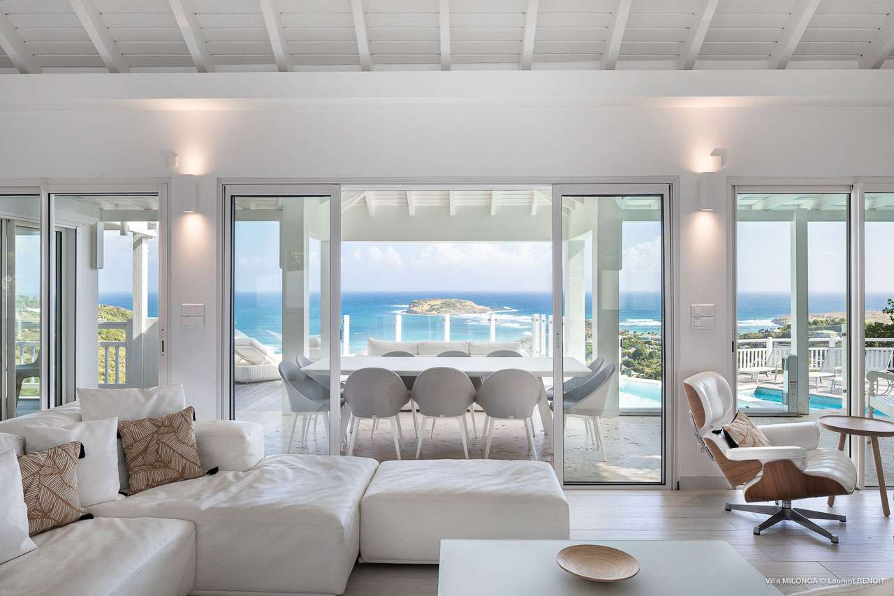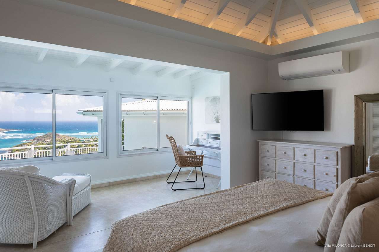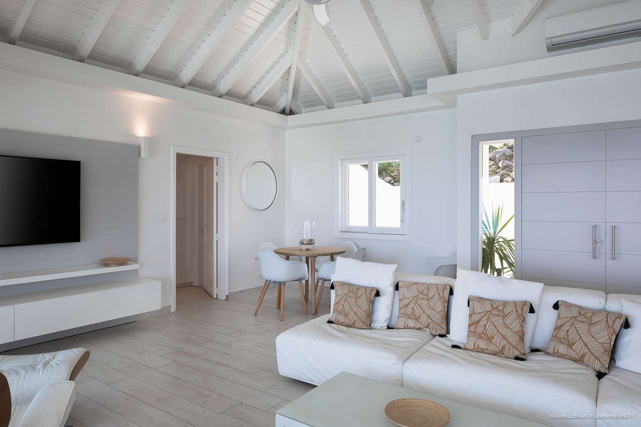 Welcome to Villa Milonga (villa code: WV MLA), a blissful 4-bedroom villa located in Marigot, St. Barts. This hillside villa offers panoramic views of the bay and is a few minutes' drive from two of the island’s most pristine beaches. A recent renovation at Villa Milonga has left it feeling refreshed and new, with dazzling all-white interiors creating a sense of peace and serenity inside. The design and details are stunning, and there’s an airy and minimalist feel to the style that enhances the brilliant views over the Caribbean Sea. Nestled in the hills above Marigot Bay, Villa Milonga enjoys a fantastic location in St Barts. Both Marigot Bay and Lorient Beach are within easy driving distance, while the shops and restaurants of St. Jean are 10 minutes by car. The spacious living areas inside Villa Milonga are relaxing and serene. The all-white minimalist décor is broken up with tropical touches – a light touch of wood here, a palm pattern there – creating a stripped-back feel to the home. Recessed lighting in the vaulted ceilings above also adds a touch of refinement to the style. The large open living room and dining space overlook the pool and the views, offering beautifully soft white sofas for relaxing. A TV comes with U.S. satellite and Apple TV, although those immersive views of the Caribbean are equally as enticing. A large, modern kitchen inside Villa Milonga is open and bright, with an effortless style and a range of high-end appliances. Cooking here is a real pleasure – our concierge can even organize a grocery delivery of the island’s freshest ingredients. There’s some bar-style seating at the kitchen island for your morning coffee or an evening aperitif before dinner. The kitchen also opens to the indoor dining area, where the hues of blue in the sea backdrop meals. There are 4 bedrooms inside Villa Milonga, where the all-white interiors are broken up with rattan textures in the furnishings and soft, sandy-colored linens. The master bedroom is located off the living room and has extra seating, a TV with U.S. satellite and Apple TV, and an ensuite bathroom with a shower. In a separate bungalow next to the pool are two additional bedrooms that connect. One of the bedrooms has a king bed, a TV with U.S. satellite and Apple TV, and an ensuite bathroom with a shower. The other room has a king bed or 2 twin beds, an Apple TV, and an ensuite bathroom with a shower. The fourth bedroom is on the lower level and has a little private terrace, a king-sized bed, an Apple TV, and an ensuite bathroom with a shower. The expansive and peaceful living areas extend to the outdoor spaces at Villa Milonga, where you’ll breathe in the beautiful island air. The views are outstanding, and there’s plenty of seating for kicking back and taking it all in, drink in hand. There’s an outdoor dining area on the covered terrace, ideal for alfresco meals. And for indulgent evenings under the starry skies, a newly-added hot tub. Steps lead down to the swimming pool, where you could spend a day alternating between refreshing dips in the water and sunbathing sessions on the loungers. It’s all facing out over the turquoise hues of Marigot Bay, a peaceful and remote area of St. Barts. During the December holidays, the villa rents at the full occupancy rate regardless of how many bedrooms are used.Please fill out the form to begin your inquiry and we will connect you with a seasoned villa rental specialist.