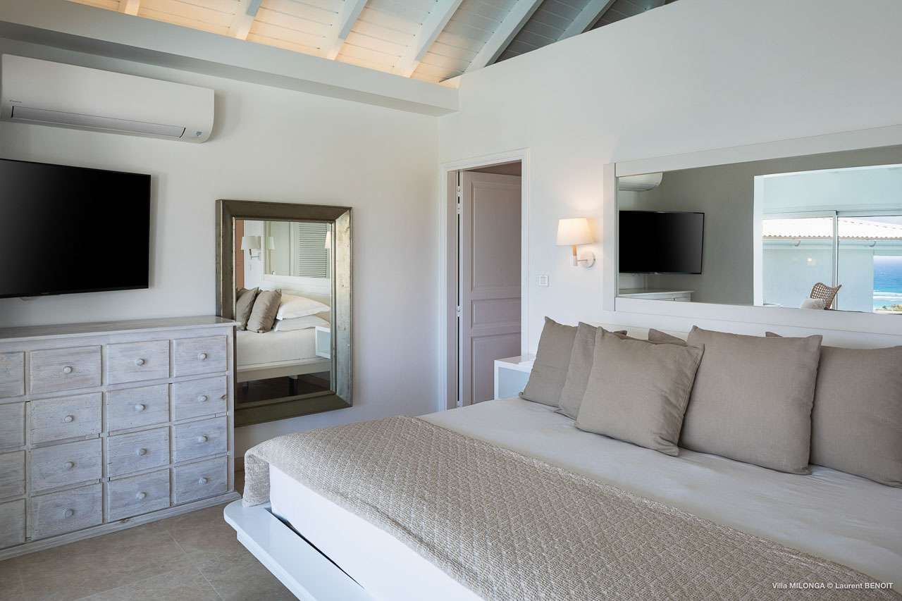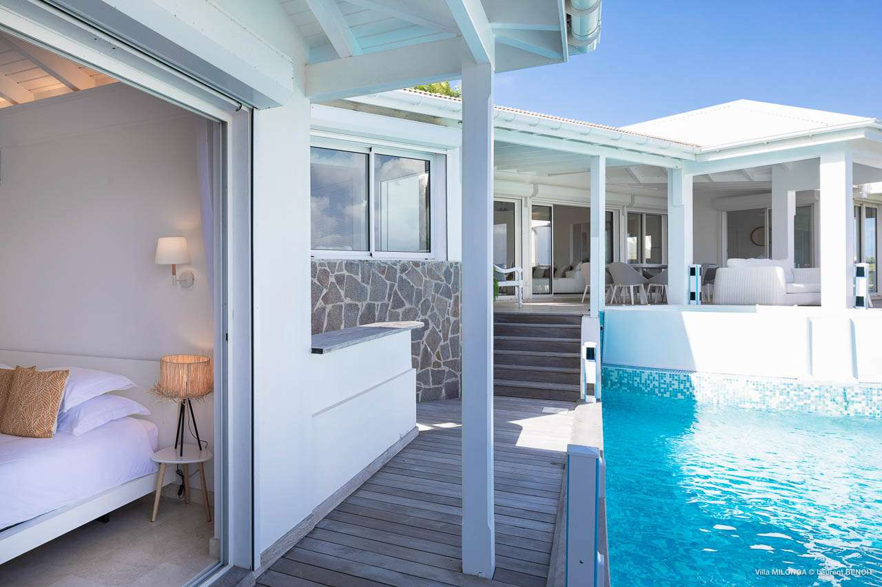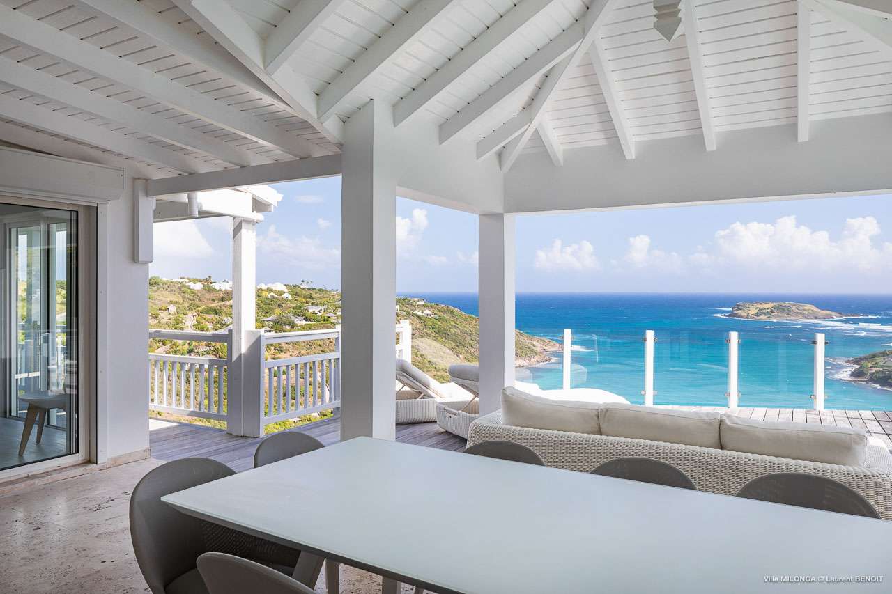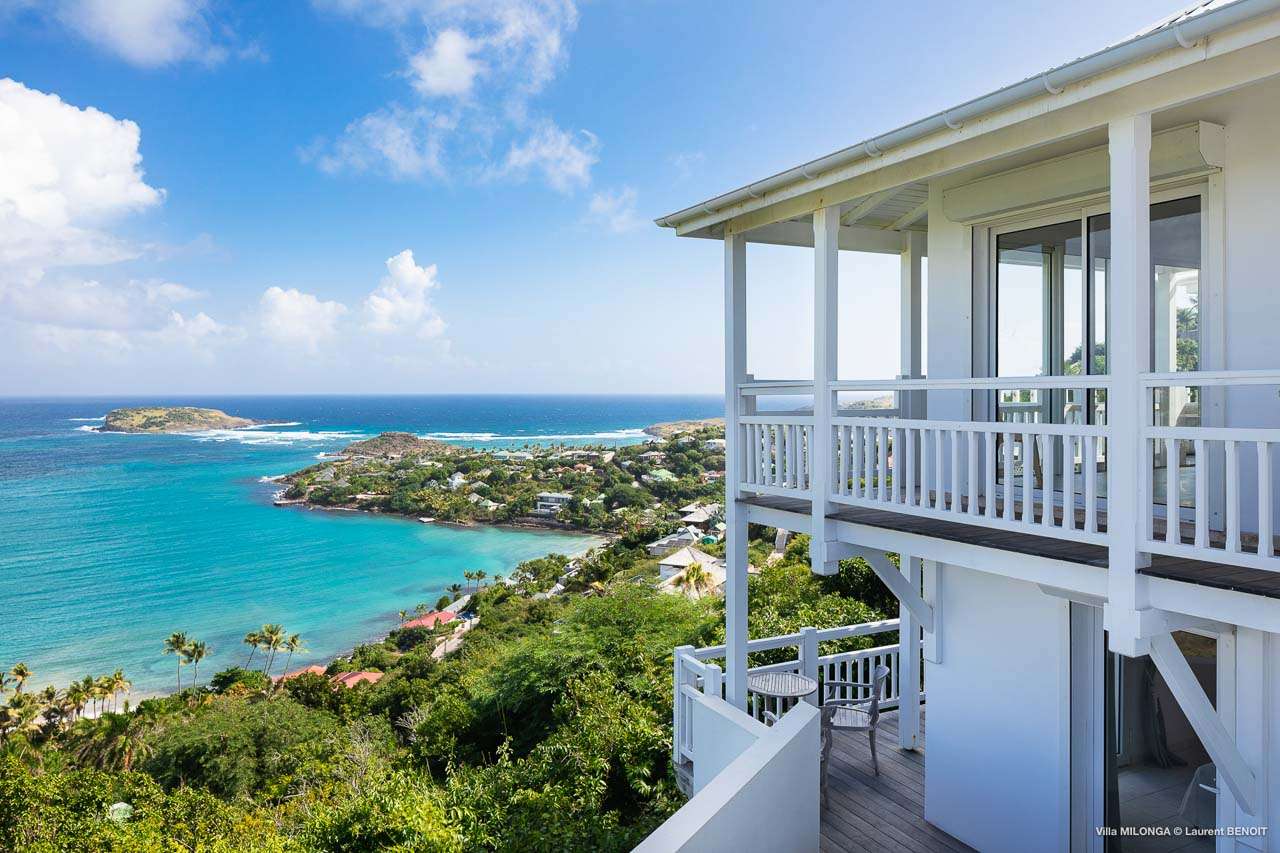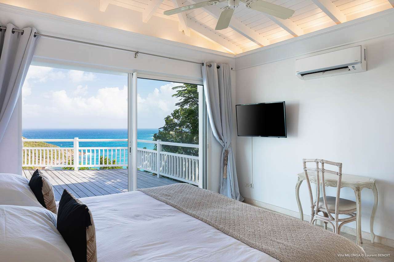 Welcome to Villa Milonga (villa code: WV MLA), a blissful 4-bedroom villa located in Marigot, St. Barts. This hillside villa offers panoramic views of the bay and is a few minutes' drive from two of the island’s most pristine beaches. A recent renovation at Villa Milonga has left it feeling refreshed and new, with dazzling all-white interiors creating a sense of peace and serenity inside. The design and details are stunning, and there’s an airy and minimalist feel to the style that enhances the brilliant views over the Caribbean Sea. Nestled in the hills above Marigot Bay, Villa Milonga enjoys a fantastic location in St Barts. Both Marigot Bay and Lorient Beach are within easy driving distance, while the shops and restaurants of St. Jean are 10 minutes by car. The spacious living areas inside Villa Milonga are relaxing and serene. The all-white minimalist décor is broken up with tropical touches – a light touch of wood here, a palm pattern there – creating a stripped-back feel to the home. Recessed lighting in the vaulted ceilings above also adds a touch of refinement to the style. The large open living room and dining space overlook the pool and the views, offering beautifully soft white sofas for relaxing. A TV comes with U.S. satellite and Apple TV, although those immersive views of the Caribbean are equally as enticing. A large, modern kitchen inside Villa Milonga is open and bright, with an effortless style and a range of high-end appliances. Cooking here is a real pleasure – our concierge can even organize a grocery delivery of the island’s freshest ingredients. There’s some bar-style seating at the kitchen island for your morning coffee or an evening aperitif before dinner. The kitchen also opens to the indoor dining area, where the hues of blue in the sea backdrop meals. There are 4 bedrooms inside Villa Milonga, where the all-white interiors are broken up with rattan textures in the furnishings and soft, sandy-colored linens. The master bedroom is located off the living room and has extra seating, a TV with U.S. satellite and Apple TV, and an ensuite bathroom with a shower. In a separate bungalow next to the pool are two additional bedrooms that connect. One of the bedrooms has a king bed, a TV with U.S. satellite and Apple TV, and an ensuite bathroom with a shower. The other room has a king bed or 2 twin beds, an Apple TV, and an ensuite bathroom with a shower. The fourth bedroom is on the lower level and has a little private terrace, a king-sized bed, an Apple TV, and an ensuite bathroom with a shower. The expansive and peaceful living areas extend to the outdoor spaces at Villa Milonga, where you’ll breathe in the beautiful island air. The views are outstanding, and there’s plenty of seating for kicking back and taking it all in, drink in hand. There’s an outdoor dining area on the covered terrace, ideal for alfresco meals. And for indulgent evenings under the starry skies, a newly-added hot tub. Steps lead down to the swimming pool, where you could spend a day alternating between refreshing dips in the water and sunbathing sessions on the loungers. It’s all facing out over the turquoise hues of Marigot Bay, a peaceful and remote area of St. Barts. During the December holidays, the villa rents at the full occupancy rate regardless of how many bedrooms are used.Please fill out the form to begin your inquiry and we will connect you with a seasoned villa rental specialist.