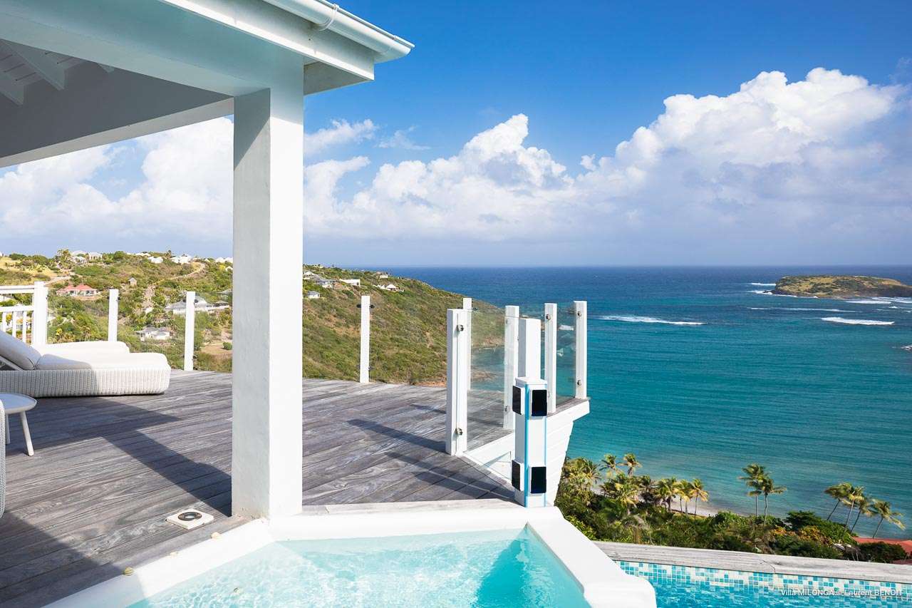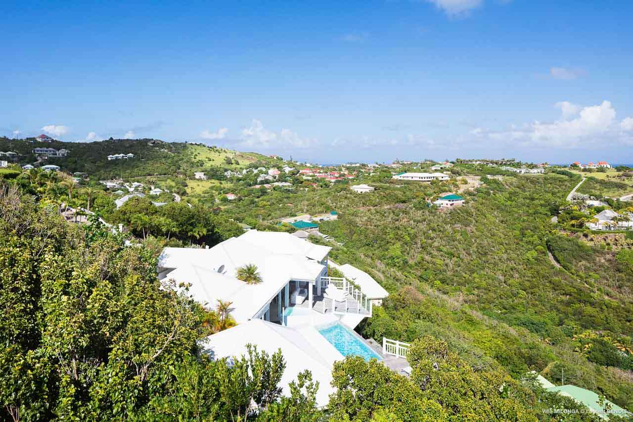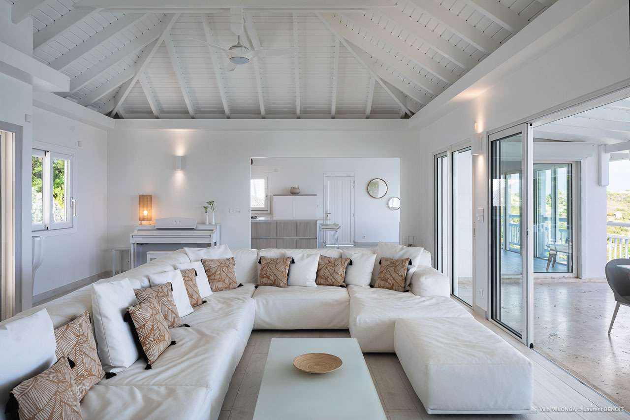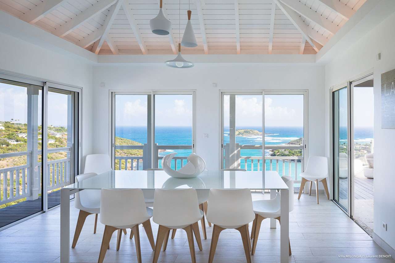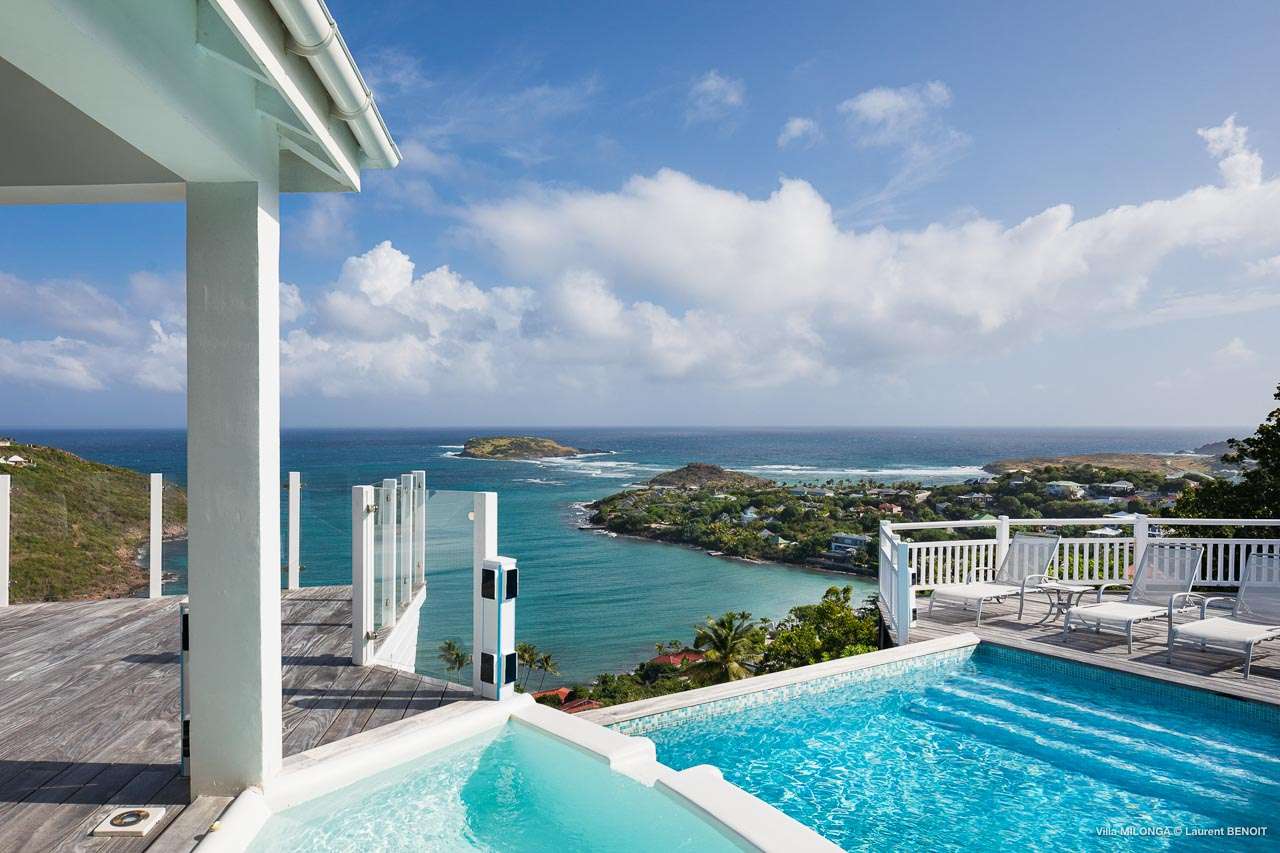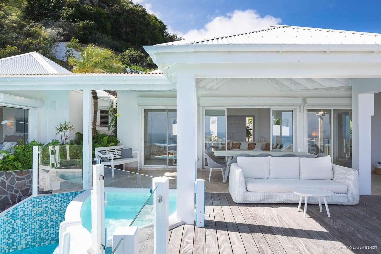 Welcome to Villa Milonga (villa code: WV MLA), a blissful 4-bedroom villa located in Marigot, St. Barts. This hillside villa offers panoramic views of the bay and is a few minutes' drive from two of the island’s most pristine beaches. A recent renovation at Villa Milonga has left it feeling refreshed and new, with dazzling all-white interiors creating a sense of peace and serenity inside. The design and details are stunning, and there’s an airy and minimalist feel to the style that enhances the brilliant views over the Caribbean Sea. Nestled in the hills above Marigot Bay, Villa Milonga enjoys a fantastic location in St Barts. Both Marigot Bay and Lorient Beach are within easy driving distance, while the shops and restaurants of St. Jean are 10 minutes by car. The spacious living areas inside Villa Milonga are relaxing and serene. The all-white minimalist décor is broken up with tropical touches – a light touch of wood here, a palm pattern there – creating a stripped-back feel to the home. Recessed lighting in the vaulted ceilings above also adds a touch of refinement to the style. The large open living room and dining space overlook the pool and the views, offering beautifully soft white sofas for relaxing. A TV comes with U.S. satellite and Apple TV, although those immersive views of the Caribbean are equally as enticing. A large, modern kitchen inside Villa Milonga is open and bright, with an effortless style and a range of high-end appliances. Cooking here is a real pleasure – our concierge can even organize a grocery delivery of the island’s freshest ingredients. There’s some bar-style seating at the kitchen island for your morning coffee or an evening aperitif before dinner. The kitchen also opens to the indoor dining area, where the hues of blue in the sea backdrop meals. There are 4 bedrooms inside Villa Milonga, where the all-white interiors are broken up with rattan textures in the furnishings and soft, sandy-colored linens. The master bedroom is located off the living room and has extra seating, a TV with U.S. satellite and Apple TV, and an ensuite bathroom with a shower. In a separate bungalow next to the pool are two additional bedrooms that connect. One of the bedrooms has a king bed, a TV with U.S. satellite and Apple TV, and an ensuite bathroom with a shower. The other room has a king bed or 2 twin beds, an Apple TV, and an ensuite bathroom with a shower. The fourth bedroom is on the lower level and has a little private terrace, a king-sized bed, an Apple TV, and an ensuite bathroom with a shower. The expansive and peaceful living areas extend to the outdoor spaces at Villa Milonga, where you’ll breathe in the beautiful island air. The views are outstanding, and there’s plenty of seating for kicking back and taking it all in, drink in hand. There’s an outdoor dining area on the covered terrace, ideal for alfresco meals. And for indulgent evenings under the starry skies, a newly-added hot tub. Steps lead down to the swimming pool, where you could spend a day alternating between refreshing dips in the water and sunbathing sessions on the loungers. It’s all facing out over the turquoise hues of Marigot Bay, a peaceful and remote area of St. Barts. During the December holidays, the villa rents at the full occupancy rate regardless of how many bedrooms are used.Please fill out the form to begin your inquiry and we will connect you with a seasoned villa rental specialist.