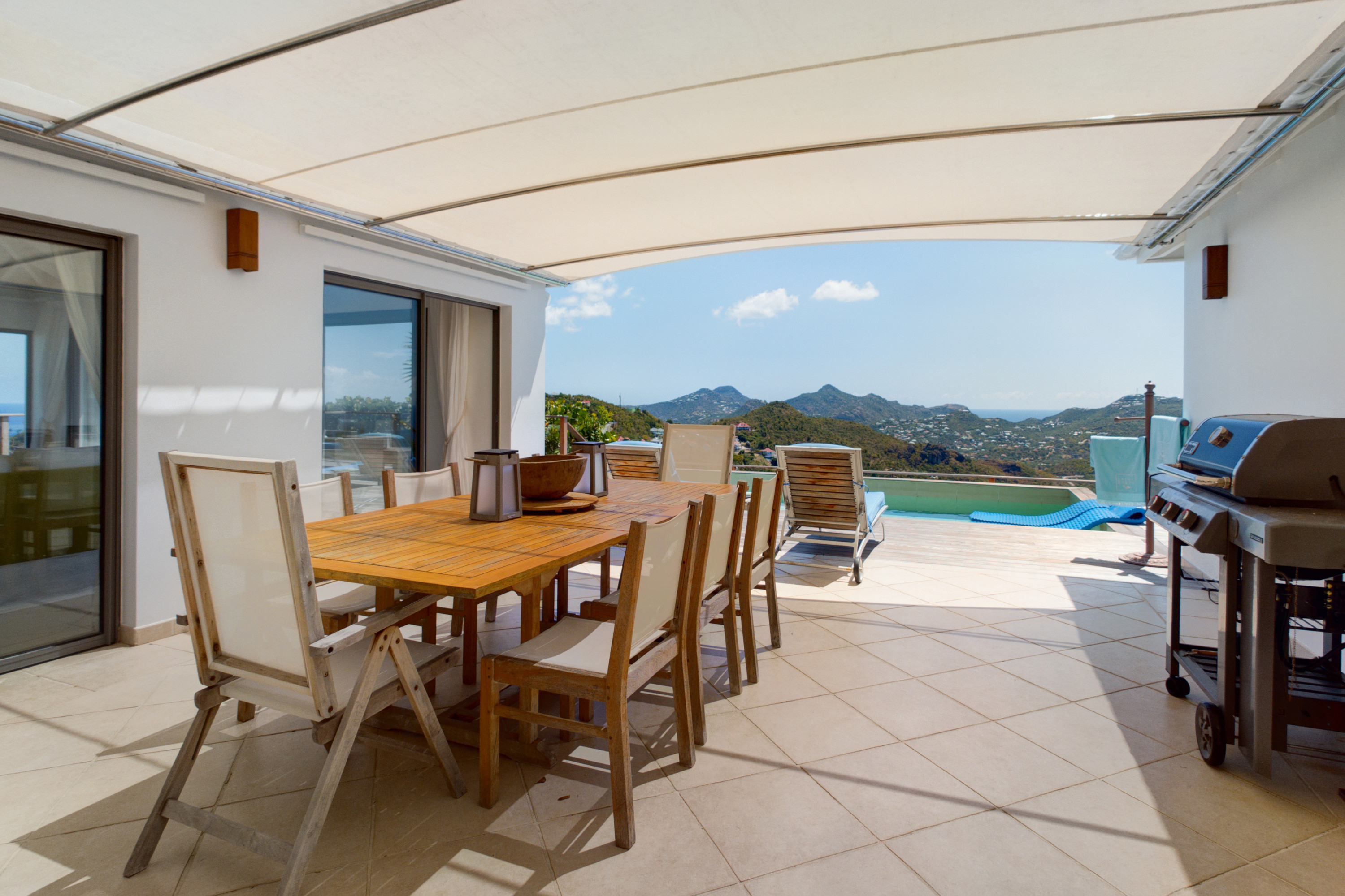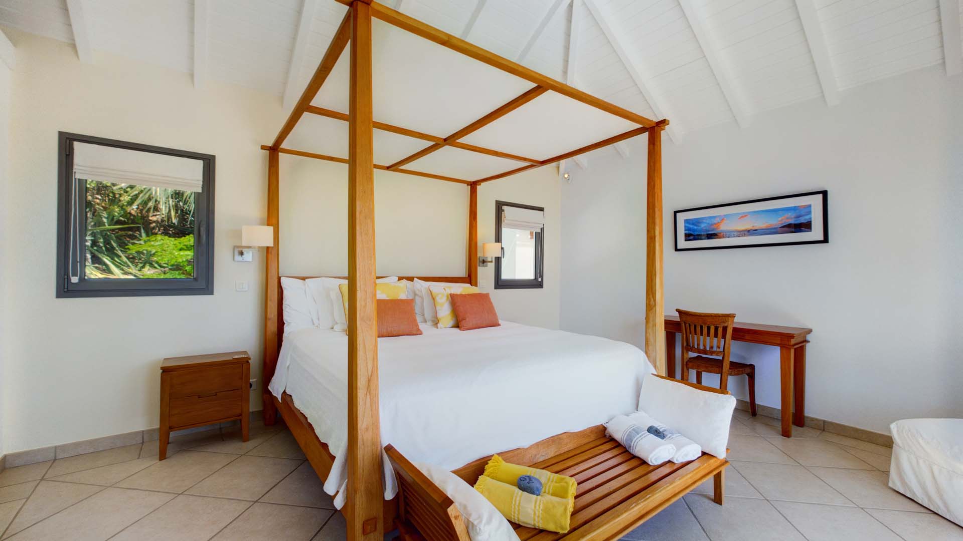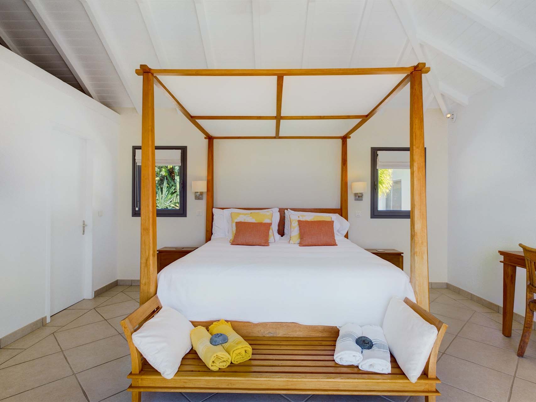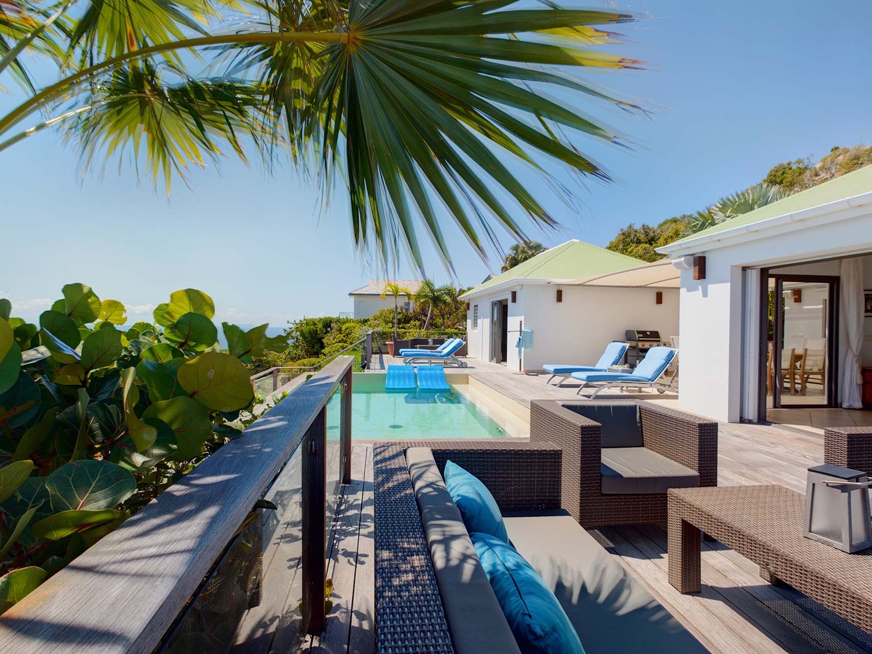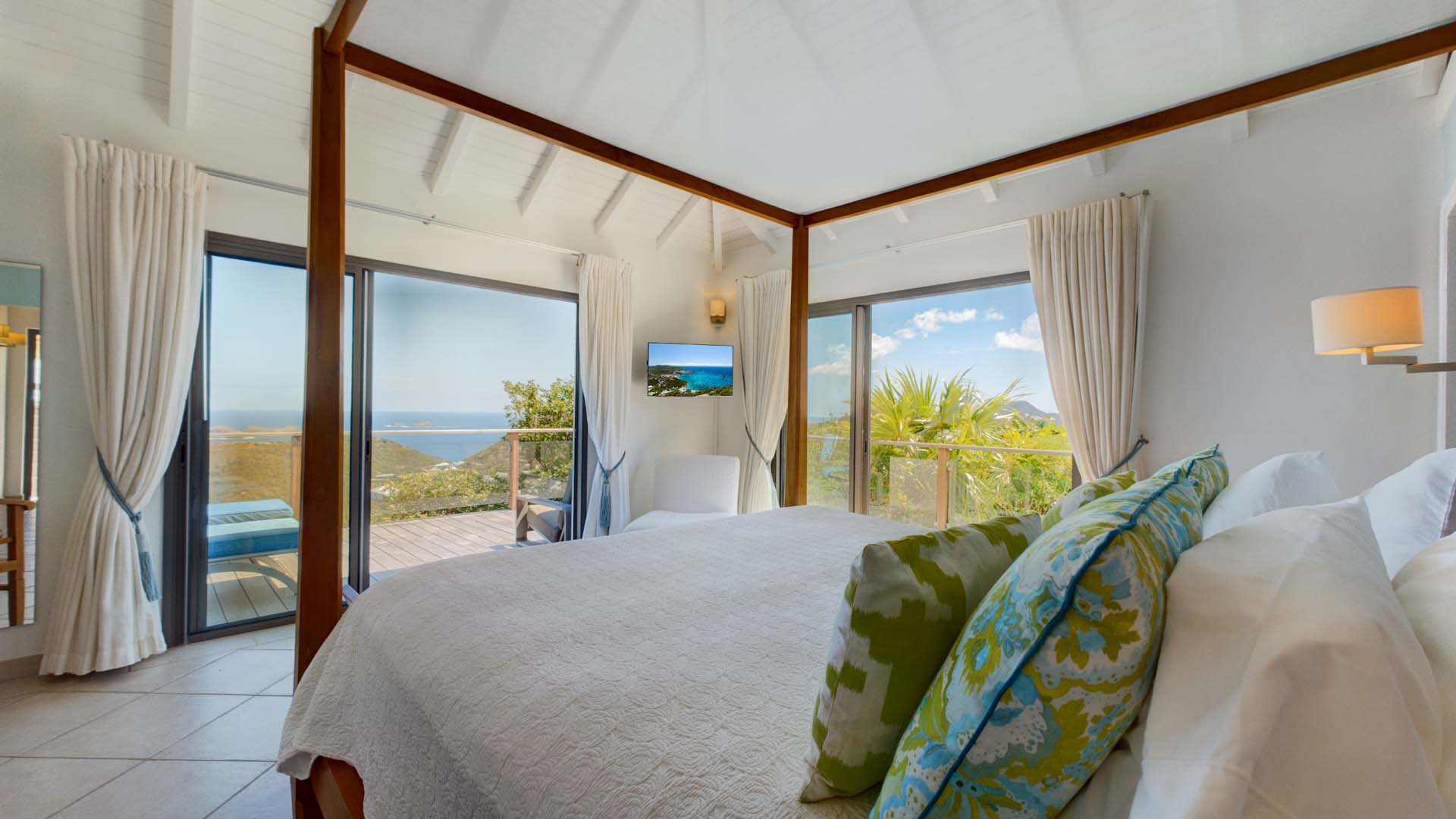 Embrace the good life at Villa Mirador (villa code: WV ING), a luxurious 4-bedroom villa located in Colombier, St. Barts. This hillside villa offers breathtaking ocean views and is a short drive from several stunning beaches. Airy and spacious, the interiors of Villa Mirador are sublime. Beautifully appointed with a minimalist style, nothing takes away from the stunning ocean views. Comfortable furnishings help you relax and unwind in this dreamy Caribbean villa. Villa Mirador is ideally located in the Colombier neighborhood on St. Barts. Looking out towards Gustavia, the beaches at Corossol and Flamands are both just a short drive away. One of the island’s best bakeries is also within driving distance, as are the shops and restaurants at both St-Jean and Gustavia. A spacious and open-concept great room is the heart of Mirador Villa, home to the living room, dining table, and kitchen. Bright and chic, doors open wide to the stunning ocean vistas and salty island breezes. The living room is in the center, with large, overstuffed sofas tempting you to sink in and unwind. It’s an ideal spot to enjoy your morning coffee, a good book, or a conversation with family and friends. The modern kitchen at Mirador Villa makes cooking a breeze. Beautiful wooden cabinetry and those dreamy views will inspire you to experiment with local flavors. Our concierge can organize grocery pre-stocking or delivery, catered meals, or arrange private chef service for a special occasion. When it’s time to dine, an elegant indoor dining table has seating for up to 8 guests. If alfresco meals are more your style, it’s as easy as whisking your plate outside onto the terrace. Here, another dining table is a romantic setting for a gourmet meal under the stars. All four bedrooms at Villa Mirador are independent of each other, ensuring privacy for guests. Soft linens promise a fantastic night’s sleep in each room. Three bedrooms have colonial four-poster king beds, each with a spacious ensuite bathroom. The fourth bedroom has twin beds that can be converted to a king-size bed, also with an ensuite. All the bedrooms have direct access to either the main terrace or a private outdoor area with a view. A large terrace with lounge chairs surrounds the pool, making this a pleasant area for either entertaining guests or sunbathing. The clear and cool water will tempt you in for a refreshing dip – you could lounge here all day. Next to the pool, the lounge area is a great setting for evening soirees as the sun goes down. Enjoying a tropical cocktail and toasting your island vacation is a great way to enjoy the famous St. Barts sunsets. From here, you can admire the undulating hills rolling down towards the Caribbean, where yachts sail to and from Gustavia Harbor. For those craving a day on the sand, the beaches at both Corossol and Flamands are both 5-minutes away. Flamands Beach is one of St. Barts's prettiest, with crystalline waters lapping at a white shore lined with palms and luxury restaurants. Anse des Cayes is also within easy driving distance. The elegant restaurants and shops of St-Jean are a 5-minute drive. Nearby, the bakery La Petite Colombe offers fresh baguettes and pastries each day. Gustavia is 10 minutes away by car. During Thanksgiving and the December holidays, the villa rents at the full occupancy rate regardless of how many bedrooms are used.Please fill out the form to begin your inquiry and we will connect you with a seasoned villa rental specialist.