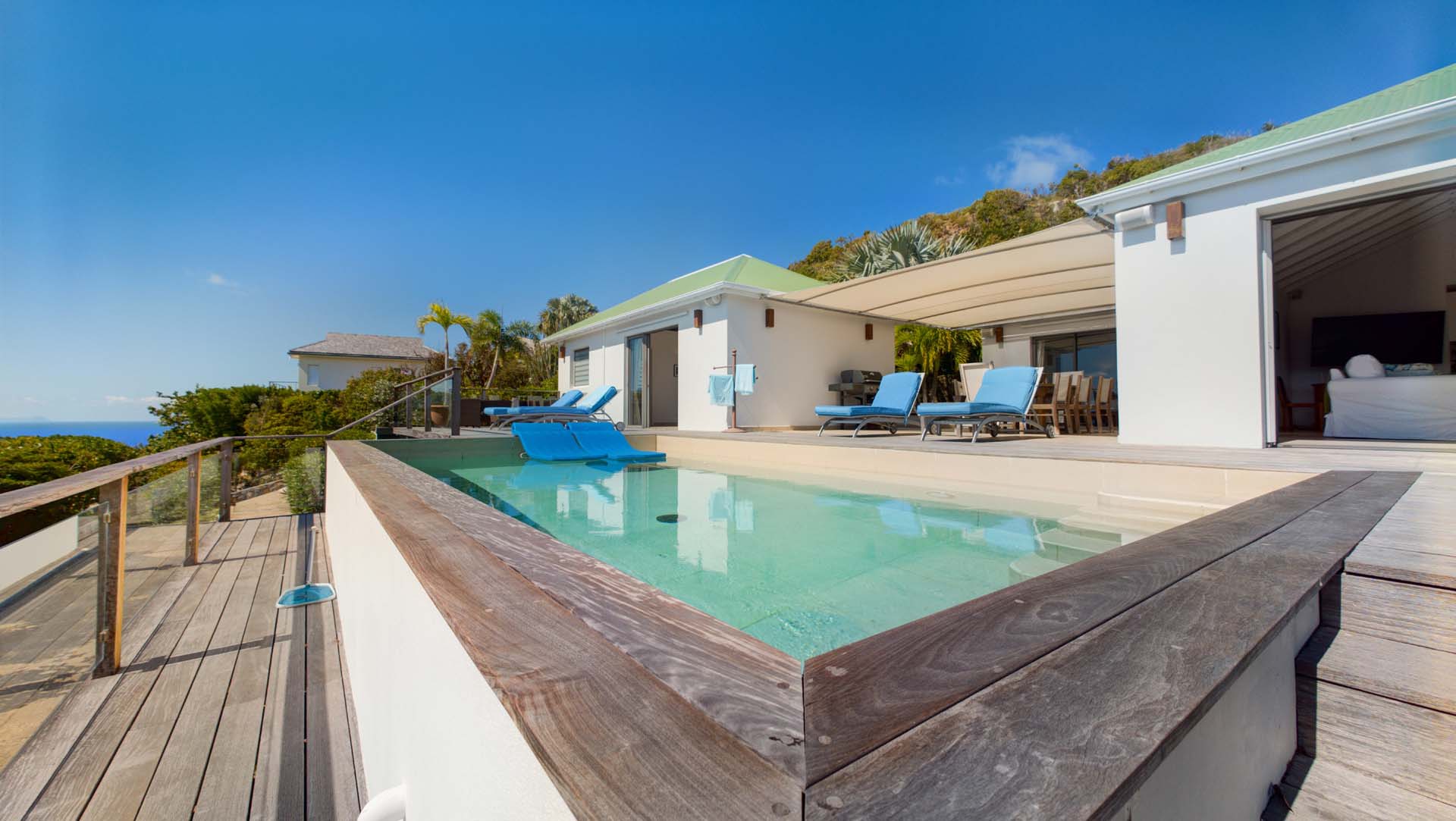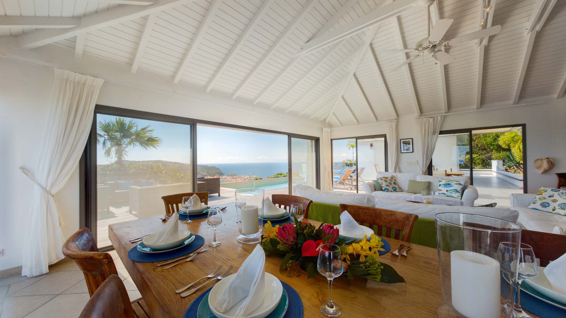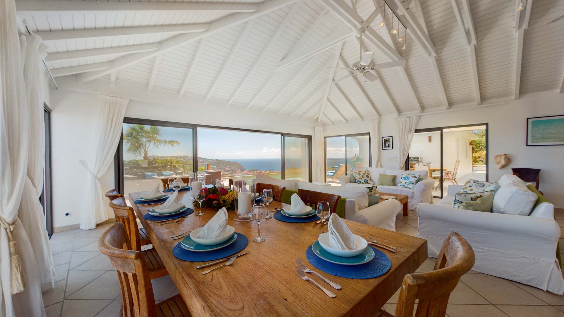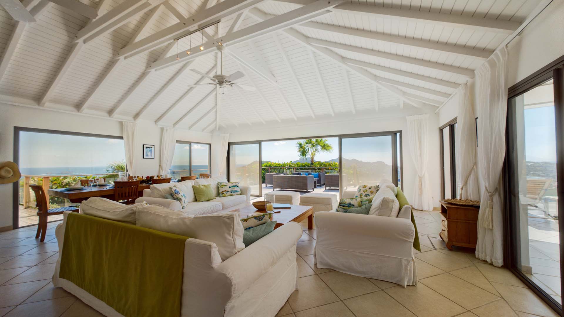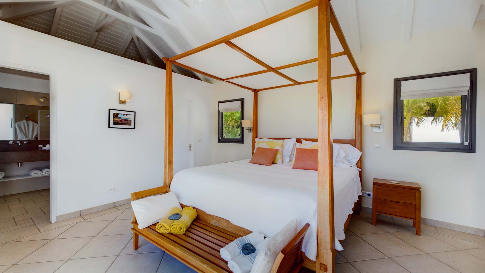 Embrace the good life at Villa Mirador (villa code: WV ING), a luxurious 4-bedroom villa located in Colombier, St. Barts. This hillside villa offers breathtaking ocean views and is a short drive from several stunning beaches. Airy and spacious, the interiors of Villa Mirador are sublime. Beautifully appointed with a minimalist style, nothing takes away from the stunning ocean views. Comfortable furnishings help you relax and unwind in this dreamy Caribbean villa. Villa Mirador is ideally located in the Colombier neighborhood on St. Barts. Looking out towards Gustavia, the beaches at Corossol and Flamands are both just a short drive away. One of the island’s best bakeries is also within driving distance, as are the shops and restaurants at both St-Jean and Gustavia. A spacious and open-concept great room is the heart of Mirador Villa, home to the living room, dining table, and kitchen. Bright and chic, doors open wide to the stunning ocean vistas and salty island breezes. The living room is in the center, with large, overstuffed sofas tempting you to sink in and unwind. It’s an ideal spot to enjoy your morning coffee, a good book, or a conversation with family and friends. The modern kitchen at Mirador Villa makes cooking a breeze. Beautiful wooden cabinetry and those dreamy views will inspire you to experiment with local flavors. Our concierge can organize grocery pre-stocking or delivery, catered meals, or arrange private chef service for a special occasion. When it’s time to dine, an elegant indoor dining table has seating for up to 8 guests. If alfresco meals are more your style, it’s as easy as whisking your plate outside onto the terrace. Here, another dining table is a romantic setting for a gourmet meal under the stars. All four bedrooms at Villa Mirador are independent of each other, ensuring privacy for guests. Soft linens promise a fantastic night’s sleep in each room. Three bedrooms have colonial four-poster king beds, each with a spacious ensuite bathroom. The fourth bedroom has twin beds that can be converted to a king-size bed, also with an ensuite. All the bedrooms have direct access to either the main terrace or a private outdoor area with a view. A large terrace with lounge chairs surrounds the pool, making this a pleasant area for either entertaining guests or sunbathing. The clear and cool water will tempt you in for a refreshing dip – you could lounge here all day. Next to the pool, the lounge area is a great setting for evening soirees as the sun goes down. Enjoying a tropical cocktail and toasting your island vacation is a great way to enjoy the famous St. Barts sunsets. From here, you can admire the undulating hills rolling down towards the Caribbean, where yachts sail to and from Gustavia Harbor. For those craving a day on the sand, the beaches at both Corossol and Flamands are both 5-minutes away. Flamands Beach is one of St. Barts's prettiest, with crystalline waters lapping at a white shore lined with palms and luxury restaurants. Anse des Cayes is also within easy driving distance. The elegant restaurants and shops of St-Jean are a 5-minute drive. Nearby, the bakery La Petite Colombe offers fresh baguettes and pastries each day. Gustavia is 10 minutes away by car. During Thanksgiving and the December holidays, the villa rents at the full occupancy rate regardless of how many bedrooms are used.Please fill out the form to begin your inquiry and we will connect you with a seasoned villa rental specialist.