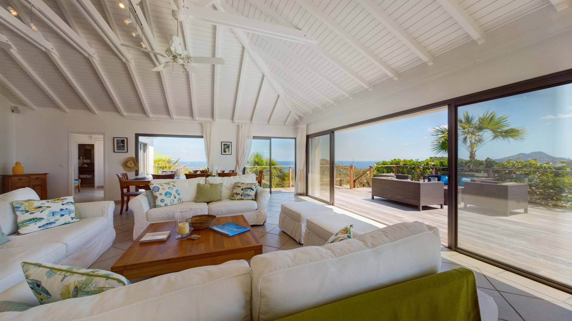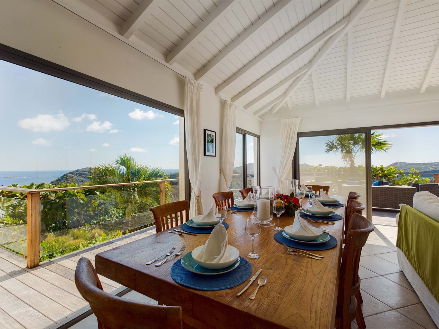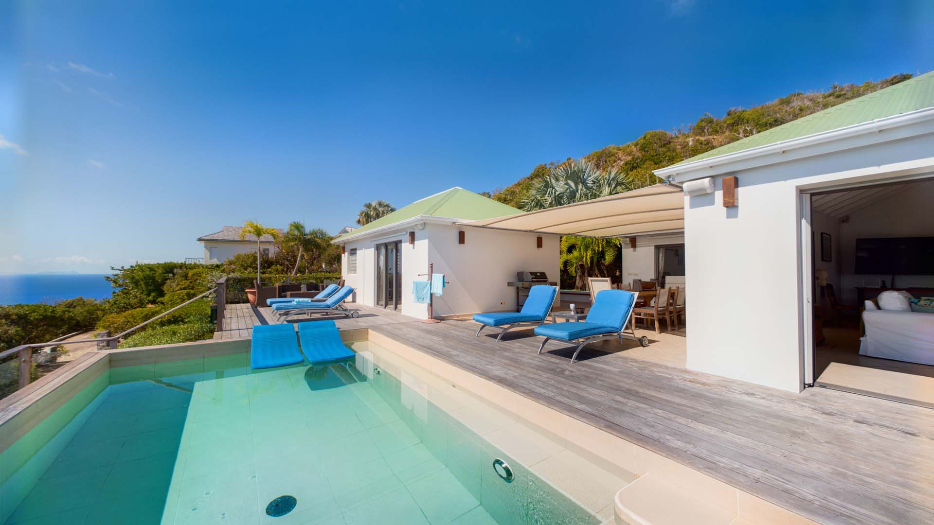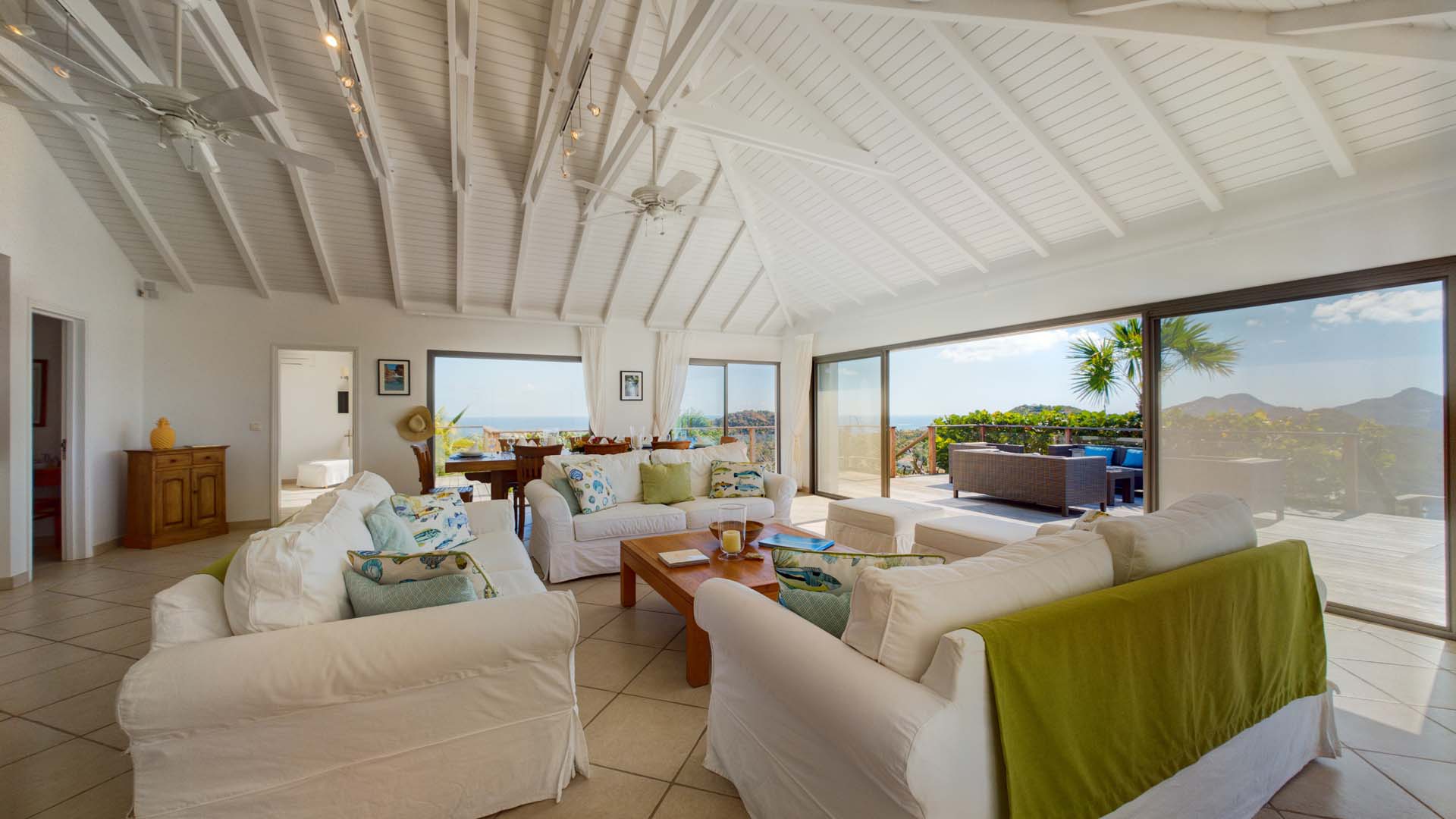 Embrace the good life at Villa Mirador (villa code: WV ING), a luxurious 4-bedroom villa located in Colombier, St. Barts. This hillside villa offers breathtaking ocean views and is a short drive from several stunning beaches. Airy and spacious, the interiors of Villa Mirador are sublime. Beautifully appointed with a minimalist style, nothing takes away from the stunning ocean views. Comfortable furnishings help you relax and unwind in this dreamy Caribbean villa. Villa Mirador is ideally located in the Colombier neighborhood on St. Barts. Looking out towards Gustavia, the beaches at Corossol and Flamands are both just a short drive away. One of the island’s best bakeries is also within driving distance, as are the shops and restaurants at both St-Jean and Gustavia. A spacious and open-concept great room is the heart of Mirador Villa, home to the living room, dining table, and kitchen. Bright and chic, doors open wide to the stunning ocean vistas and salty island breezes. The living room is in the center, with large, overstuffed sofas tempting you to sink in and unwind. It’s an ideal spot to enjoy your morning coffee, a good book, or a conversation with family and friends. The modern kitchen at Mirador Villa makes cooking a breeze. Beautiful wooden cabinetry and those dreamy views will inspire you to experiment with local flavors. Our concierge can organize grocery pre-stocking or delivery, catered meals, or arrange private chef service for a special occasion. When it’s time to dine, an elegant indoor dining table has seating for up to 8 guests. If alfresco meals are more your style, it’s as easy as whisking your plate outside onto the terrace. Here, another dining table is a romantic setting for a gourmet meal under the stars. All four bedrooms at Villa Mirador are independent of each other, ensuring privacy for guests. Soft linens promise a fantastic night’s sleep in each room. Three bedrooms have colonial four-poster king beds, each with a spacious ensuite bathroom. The fourth bedroom has twin beds that can be converted to a king-size bed, also with an ensuite. All the bedrooms have direct access to either the main terrace or a private outdoor area with a view. A large terrace with lounge chairs surrounds the pool, making this a pleasant area for either entertaining guests or sunbathing. The clear and cool water will tempt you in for a refreshing dip – you could lounge here all day. Next to the pool, the lounge area is a great setting for evening soirees as the sun goes down. Enjoying a tropical cocktail and toasting your island vacation is a great way to enjoy the famous St. Barts sunsets. From here, you can admire the undulating hills rolling down towards the Caribbean, where yachts sail to and from Gustavia Harbor. For those craving a day on the sand, the beaches at both Corossol and Flamands are both 5-minutes away. Flamands Beach is one of St. Barts's prettiest, with crystalline waters lapping at a white shore lined with palms and luxury restaurants. Anse des Cayes is also within easy driving distance. The elegant restaurants and shops of St-Jean are a 5-minute drive. Nearby, the bakery La Petite Colombe offers fresh baguettes and pastries each day. Gustavia is 10 minutes away by car. During Thanksgiving and the December holidays, the villa rents at the full occupancy rate regardless of how many bedrooms are used.Please fill out the form to begin your inquiry and we will connect you with a seasoned villa rental specialist.