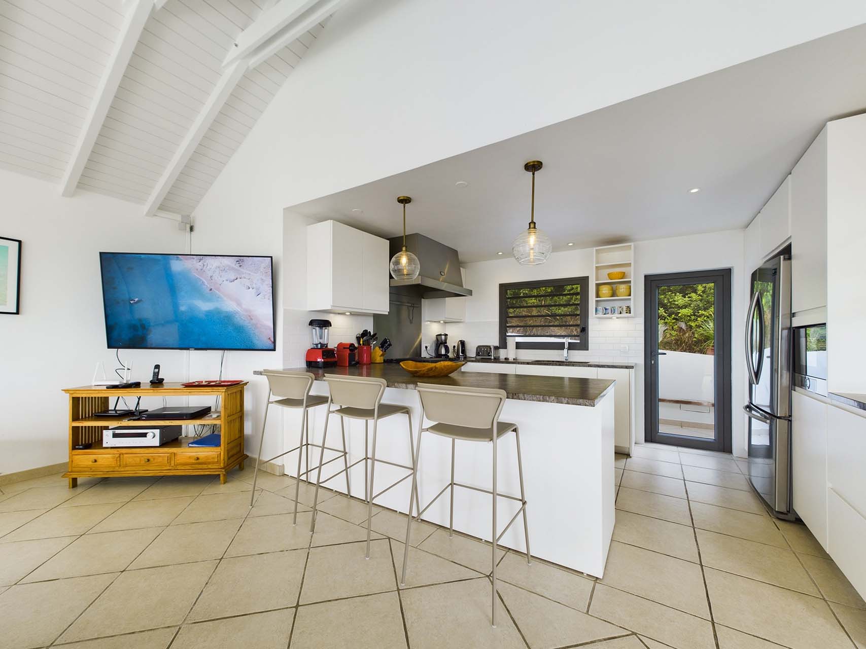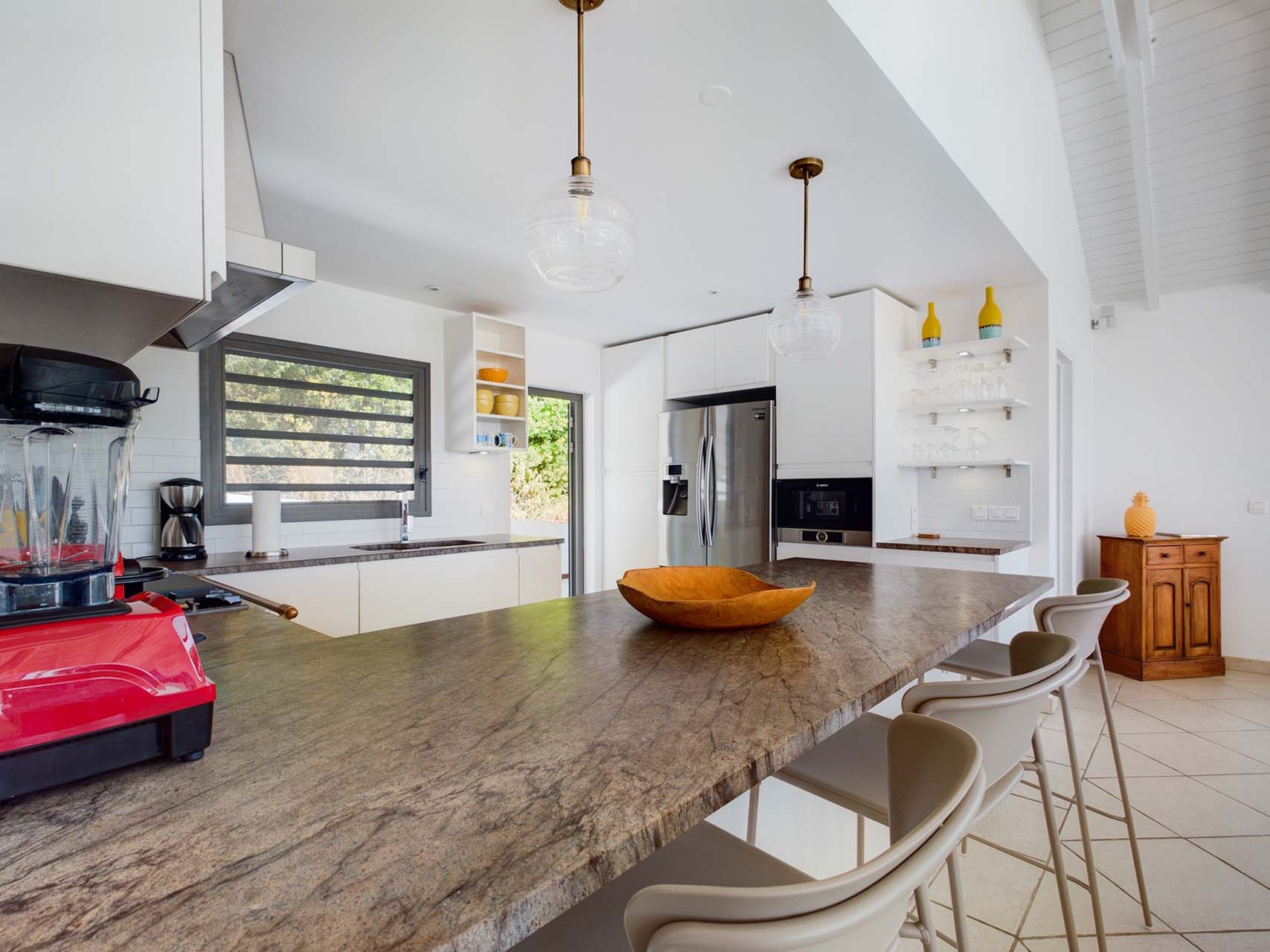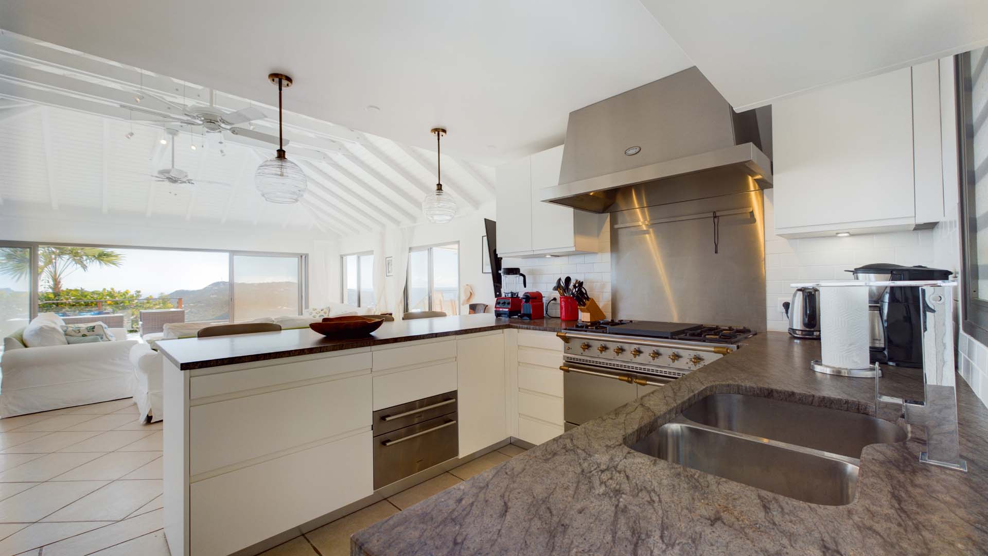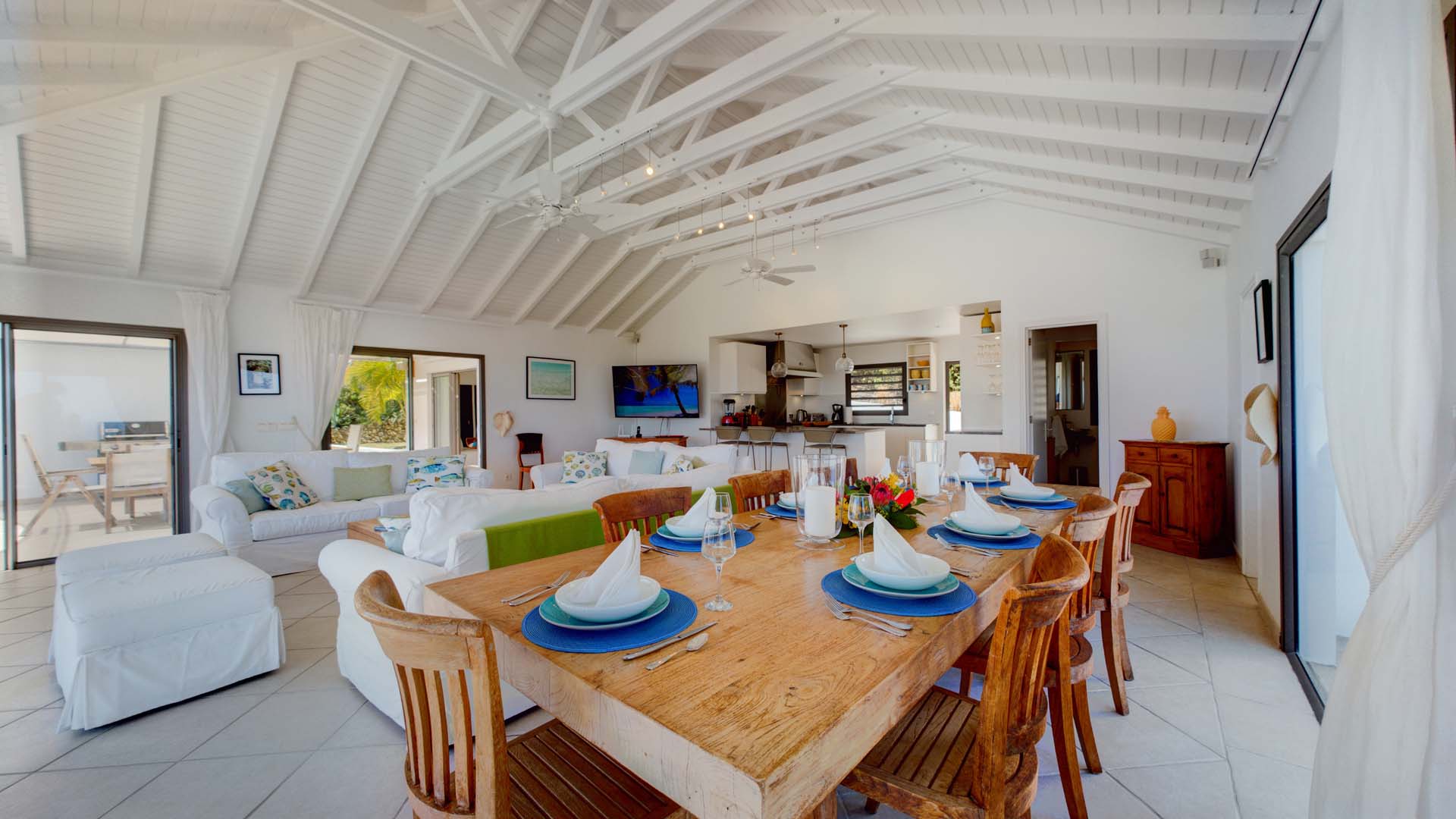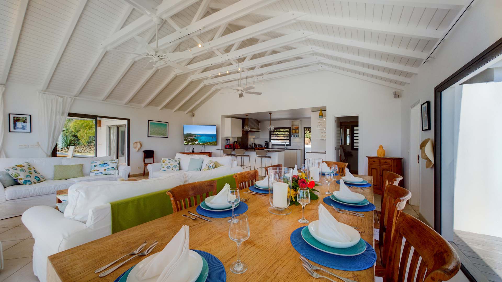 Embrace the good life at Villa Mirador (villa code: WV ING), a luxurious 4-bedroom villa located in Colombier, St. Barts. This hillside villa offers breathtaking ocean views and is a short drive from several stunning beaches. Airy and spacious, the interiors of Villa Mirador are sublime. Beautifully appointed with a minimalist style, nothing takes away from the stunning ocean views. Comfortable furnishings help you relax and unwind in this dreamy Caribbean villa. Villa Mirador is ideally located in the Colombier neighborhood on St. Barts. Looking out towards Gustavia, the beaches at Corossol and Flamands are both just a short drive away. One of the island’s best bakeries is also within driving distance, as are the shops and restaurants at both St-Jean and Gustavia. A spacious and open-concept great room is the heart of Mirador Villa, home to the living room, dining table, and kitchen. Bright and chic, doors open wide to the stunning ocean vistas and salty island breezes. The living room is in the center, with large, overstuffed sofas tempting you to sink in and unwind. It’s an ideal spot to enjoy your morning coffee, a good book, or a conversation with family and friends. The modern kitchen at Mirador Villa makes cooking a breeze. Beautiful wooden cabinetry and those dreamy views will inspire you to experiment with local flavors. Our concierge can organize grocery pre-stocking or delivery, catered meals, or arrange private chef service for a special occasion. When it’s time to dine, an elegant indoor dining table has seating for up to 8 guests. If alfresco meals are more your style, it’s as easy as whisking your plate outside onto the terrace. Here, another dining table is a romantic setting for a gourmet meal under the stars. All four bedrooms at Villa Mirador are independent of each other, ensuring privacy for guests. Soft linens promise a fantastic night’s sleep in each room. Three bedrooms have colonial four-poster king beds, each with a spacious ensuite bathroom. The fourth bedroom has twin beds that can be converted to a king-size bed, also with an ensuite. All the bedrooms have direct access to either the main terrace or a private outdoor area with a view. A large terrace with lounge chairs surrounds the pool, making this a pleasant area for either entertaining guests or sunbathing. The clear and cool water will tempt you in for a refreshing dip – you could lounge here all day. Next to the pool, the lounge area is a great setting for evening soirees as the sun goes down. Enjoying a tropical cocktail and toasting your island vacation is a great way to enjoy the famous St. Barts sunsets. From here, you can admire the undulating hills rolling down towards the Caribbean, where yachts sail to and from Gustavia Harbor. For those craving a day on the sand, the beaches at both Corossol and Flamands are both 5-minutes away. Flamands Beach is one of St. Barts's prettiest, with crystalline waters lapping at a white shore lined with palms and luxury restaurants. Anse des Cayes is also within easy driving distance. The elegant restaurants and shops of St-Jean are a 5-minute drive. Nearby, the bakery La Petite Colombe offers fresh baguettes and pastries each day. Gustavia is 10 minutes away by car. During Thanksgiving and the December holidays, the villa rents at the full occupancy rate regardless of how many bedrooms are used.Please fill out the form to begin your inquiry and we will connect you with a seasoned villa rental specialist.