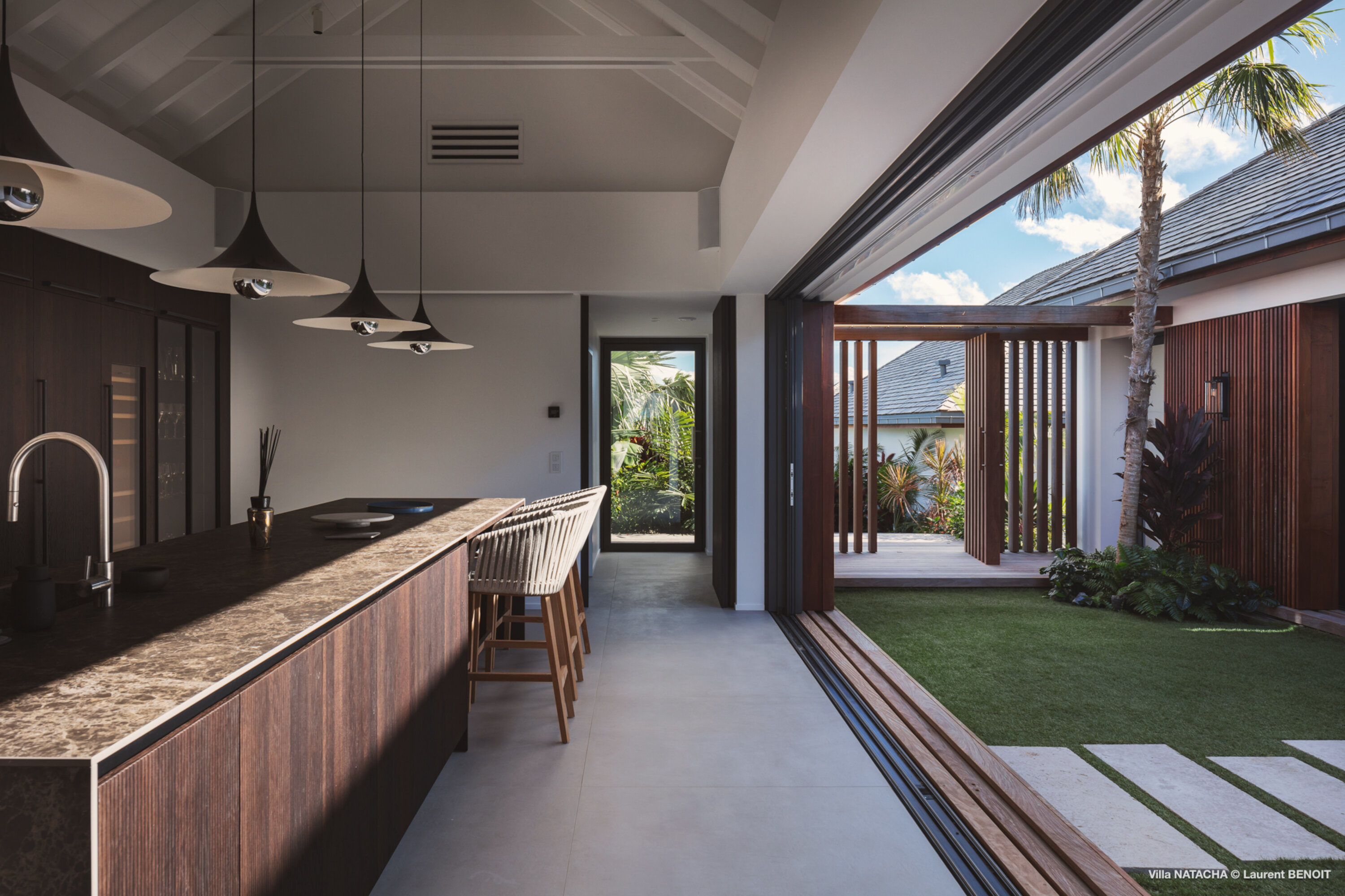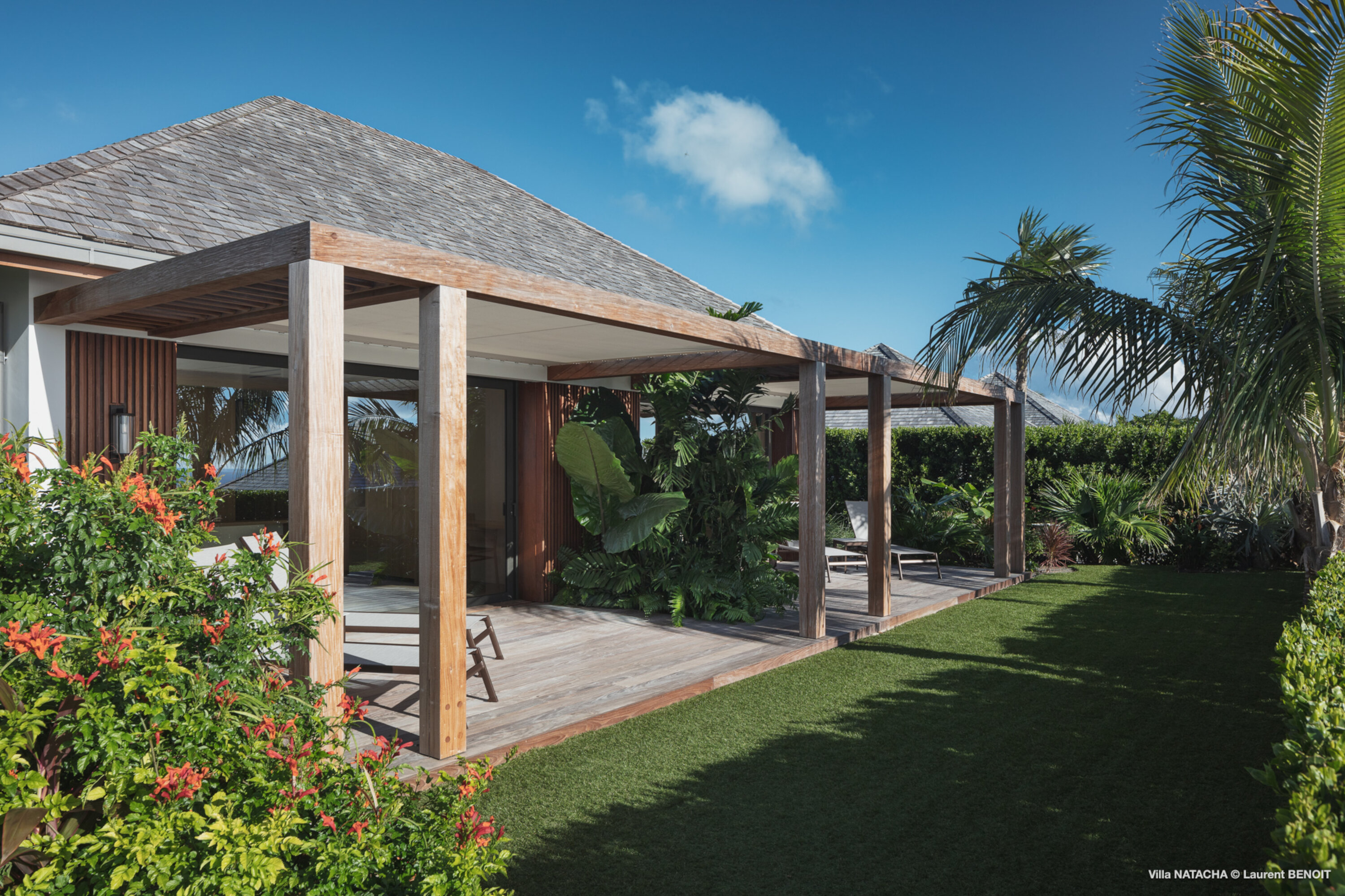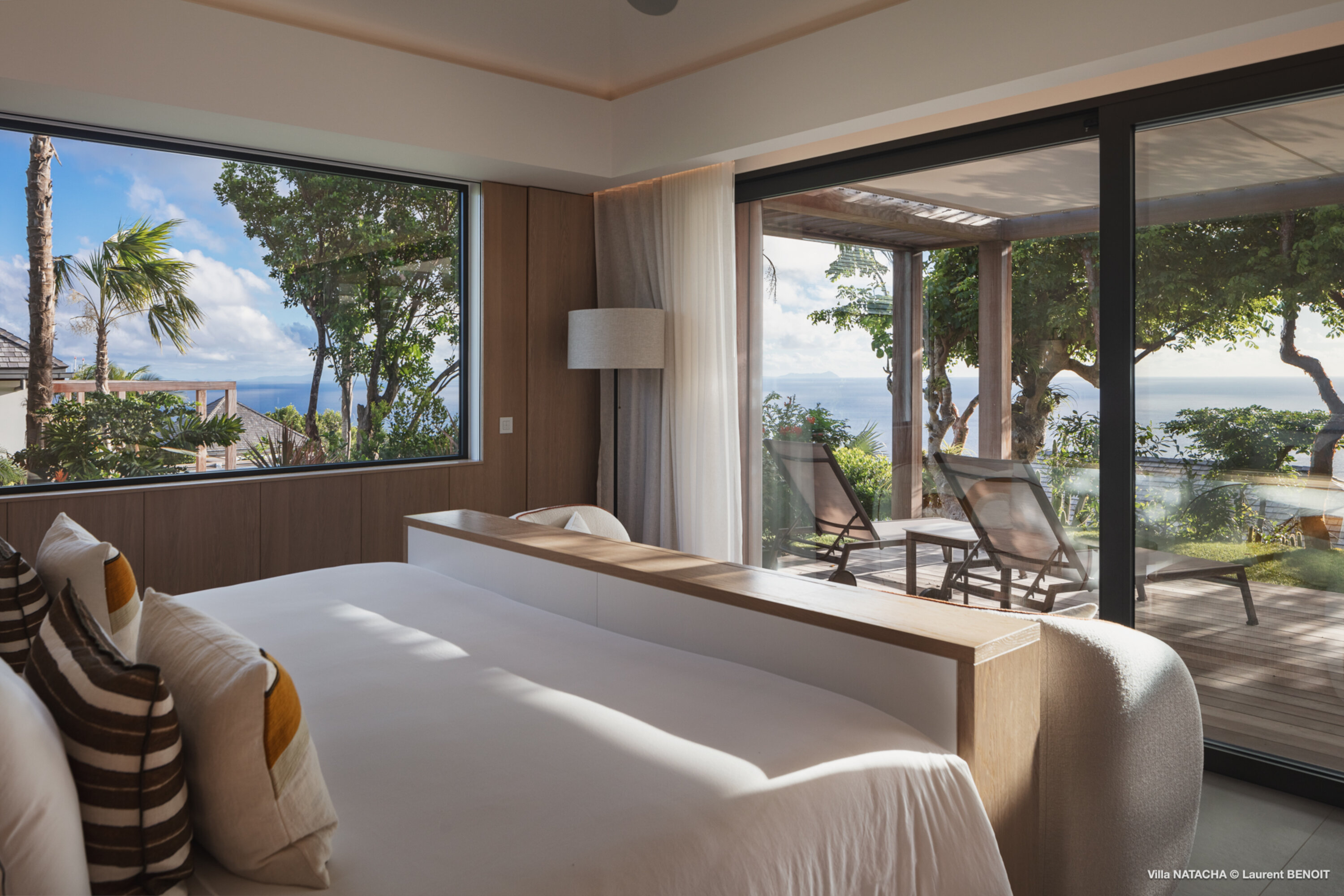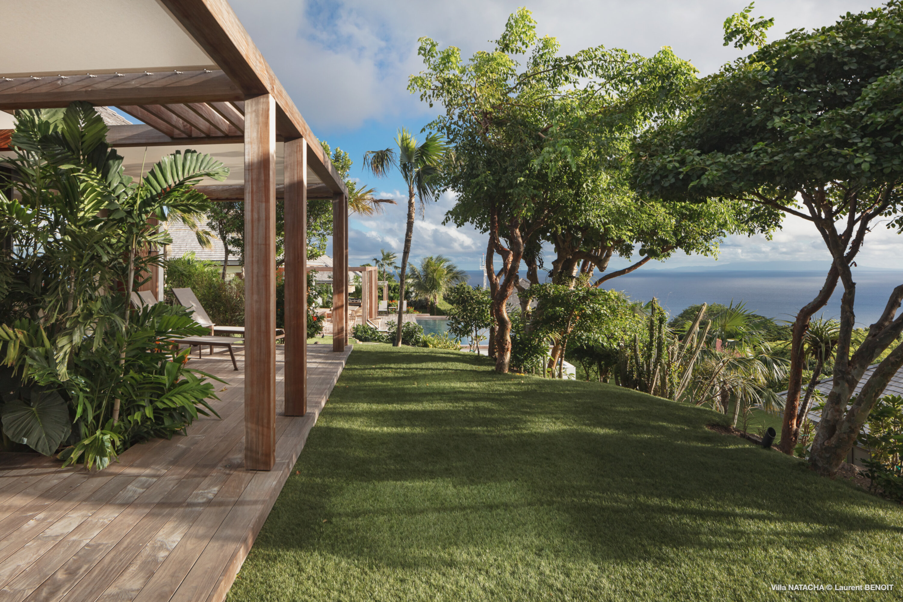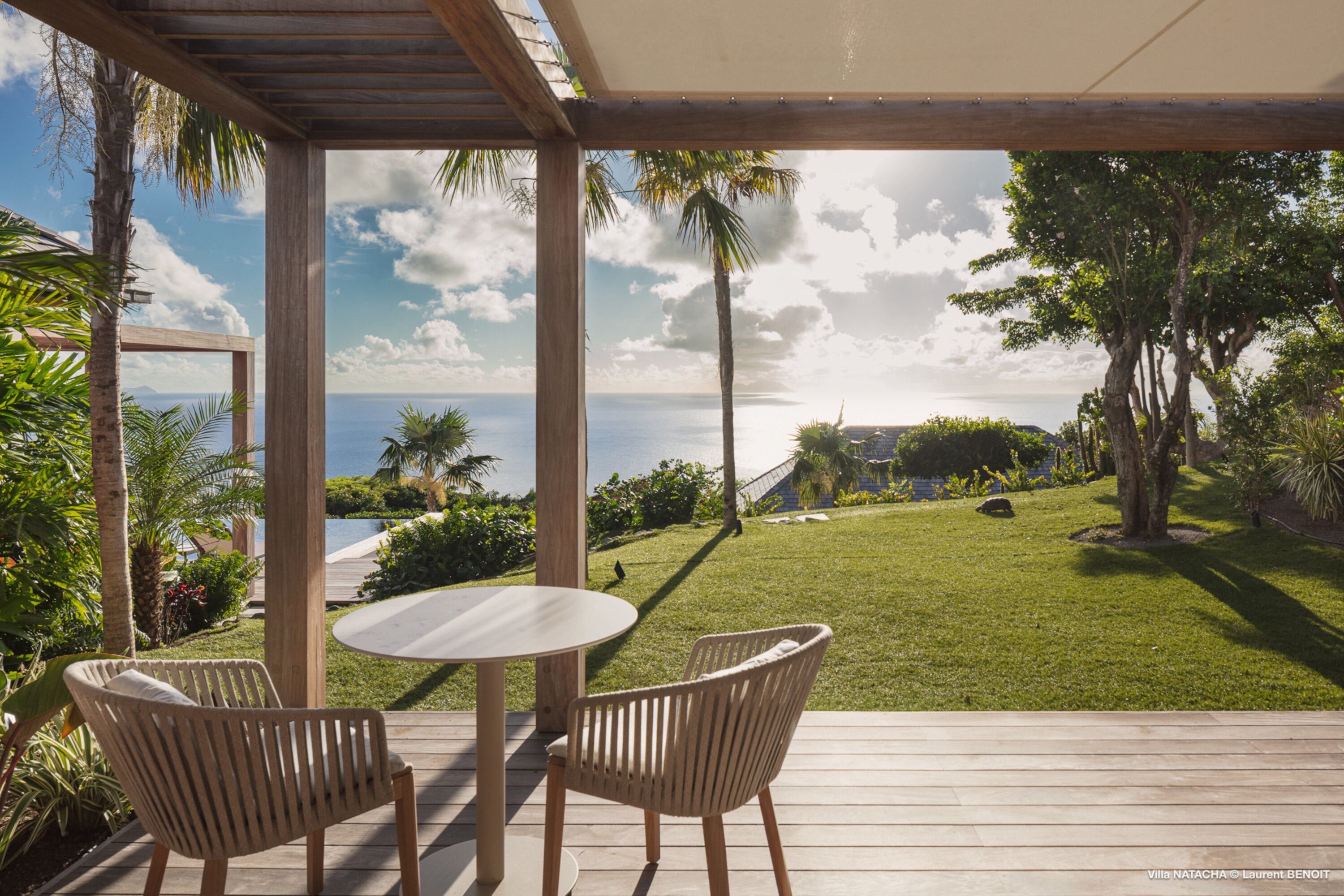 In the Lurin neighborhood, just minutes from the stunning Gouverneur Beach, Villa Natacha (villa code: WV NAT) blends contemporary elegance, privacy, and breathtaking ocean views. The villa offers five beautifully appointed bedrooms, each set in its own independent bungalow to ensure comfort and seclusion for every guest. At the heart of the property, a fully equipped, air-conditioned modern kitchen delights culinary enthusiasts. Its expansive countertop invites convivial moments with family and friends while preparing delicious meals. Large glass doors open onto a lushly planted patio, like an indoor garden, seamlessly linking the kitchen with the living area. The magnificent and spacious living room faces the horizon, offering an uninterrupted panorama. Furnished with a comfortable L-shaped sofa, cozy armchairs, an elegant dining table for ten, and a refined bar, the space exudes both warmth and sophistication. Glass doors extend the room onto a broad terrace with a majestic infinity pool that appears to merge with the ocean. The outdoor spaces are designed as a true lifestyle experience: a lounge area, an al fresco dining spot, a convivial plancha grill, and numerous sun loungers invite guests to bask in the Caribbean sun. Further down the property, surrounded by lush lawns, are two exclusive wellness areas: a gym bungalow with a private terrace—perfect for fitness sessions immersed in nature—and a massage bungalow designed for couples, complete with its own terrace, sun loungers, and adjoining shower room, creating moments of pure relaxation. Villa Natacha embodies the perfect balance of elegance, privacy, and refinement in an exceptional natural setting, where every detail has been designed to provide an unforgettable experience. During the December holiday the villa rents at the full occupancy rate regardless of how many bedrooms are usedPlease fill out the form to begin your inquiry and we will connect you with a seasoned villa rental specialist.