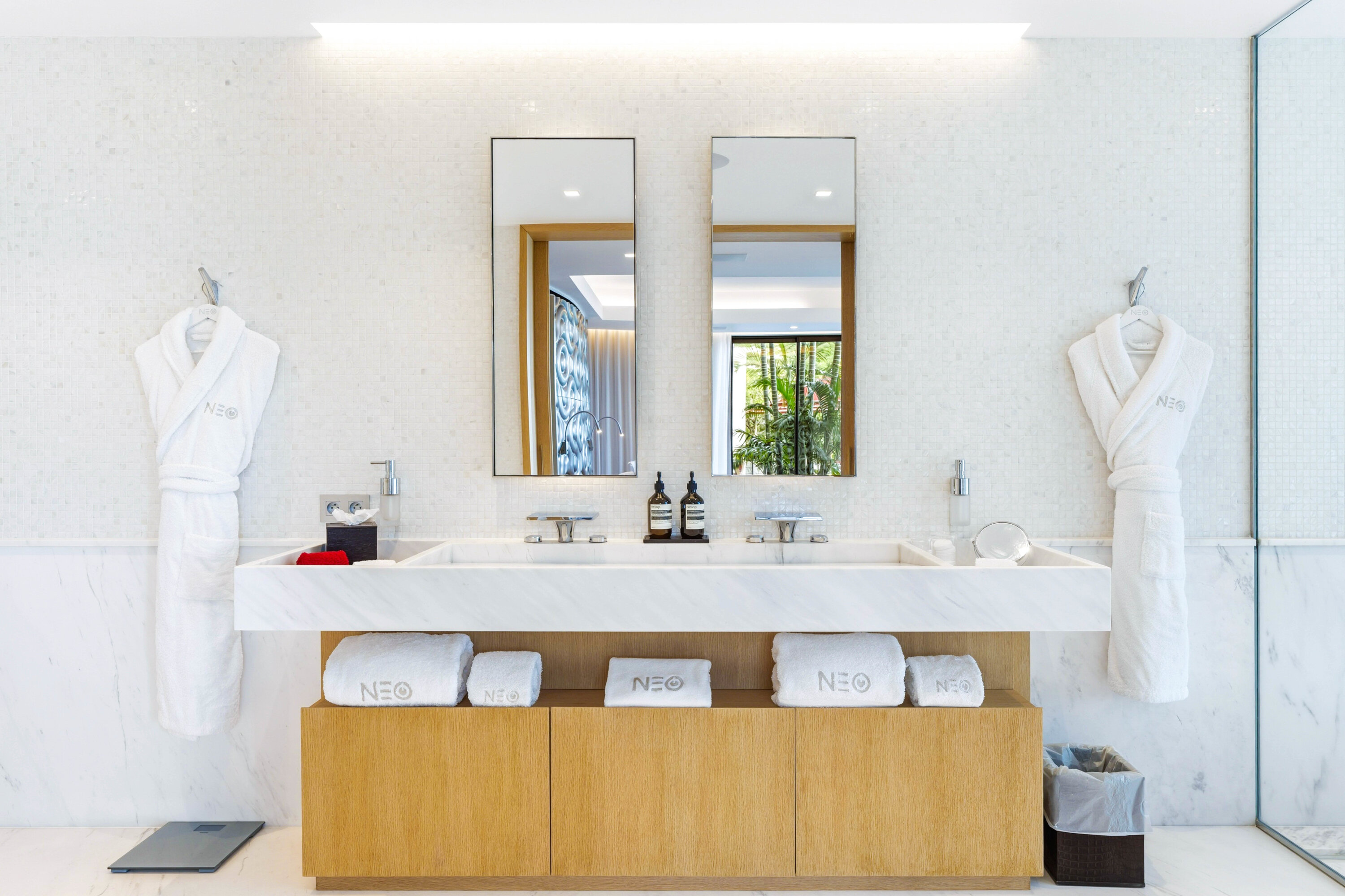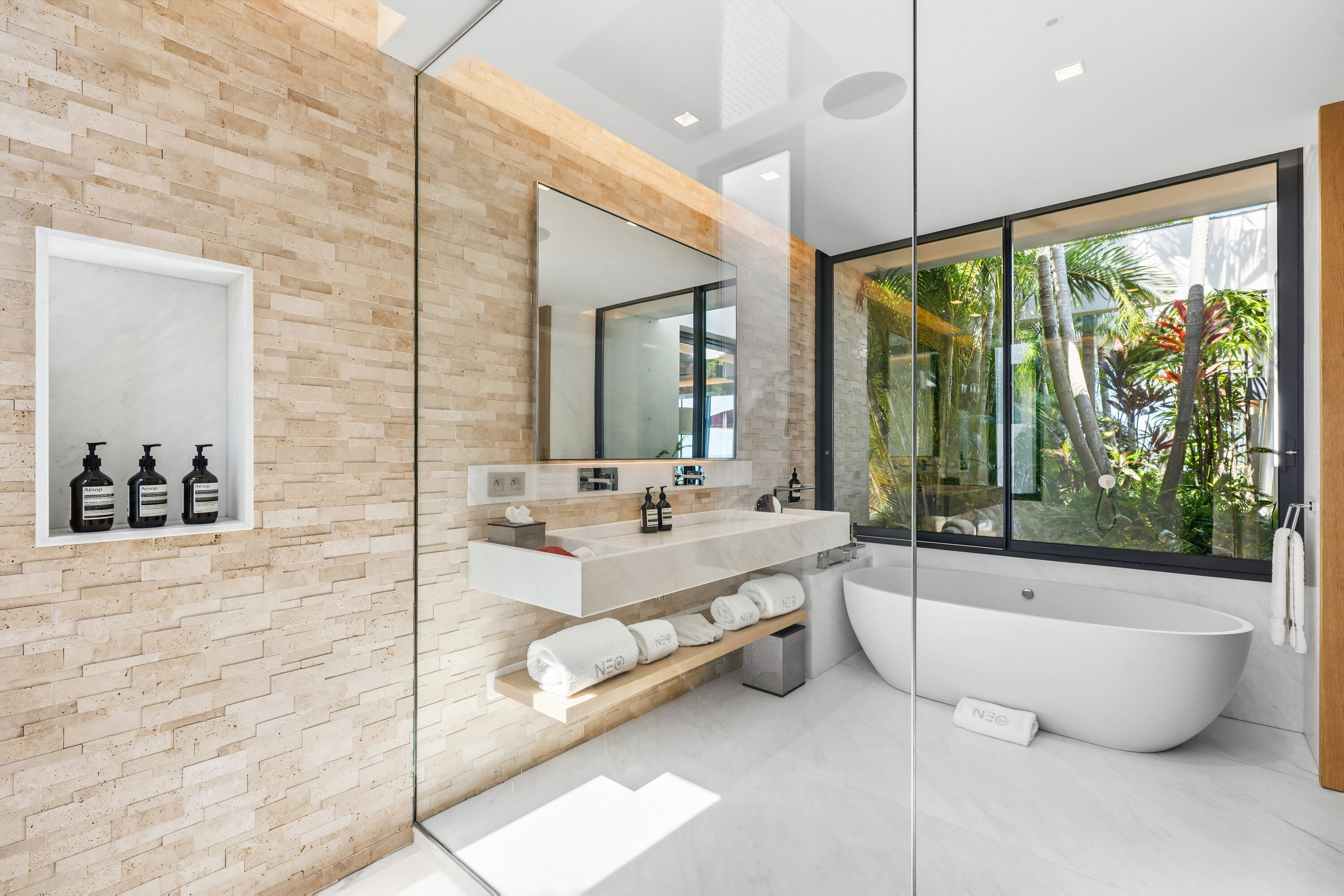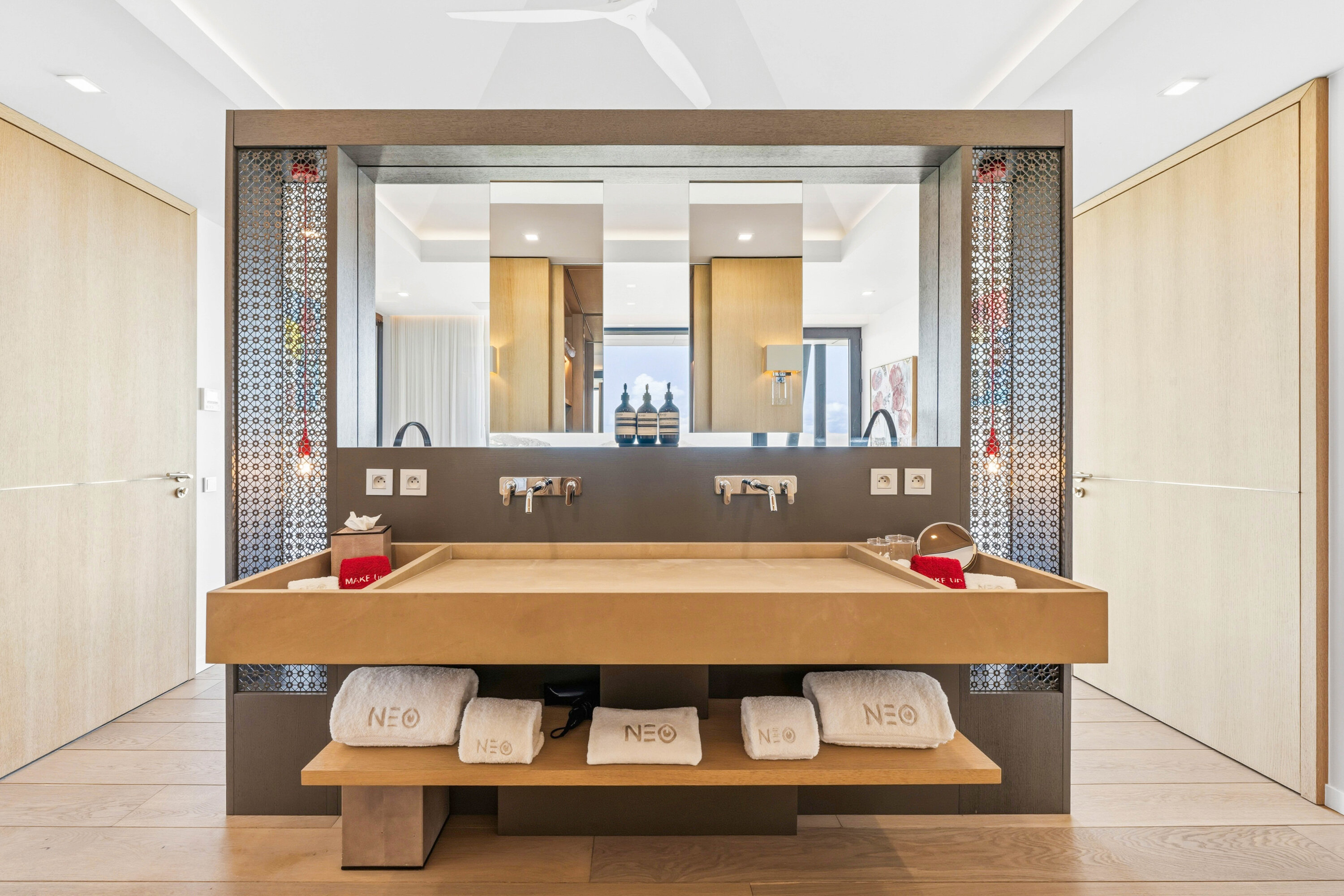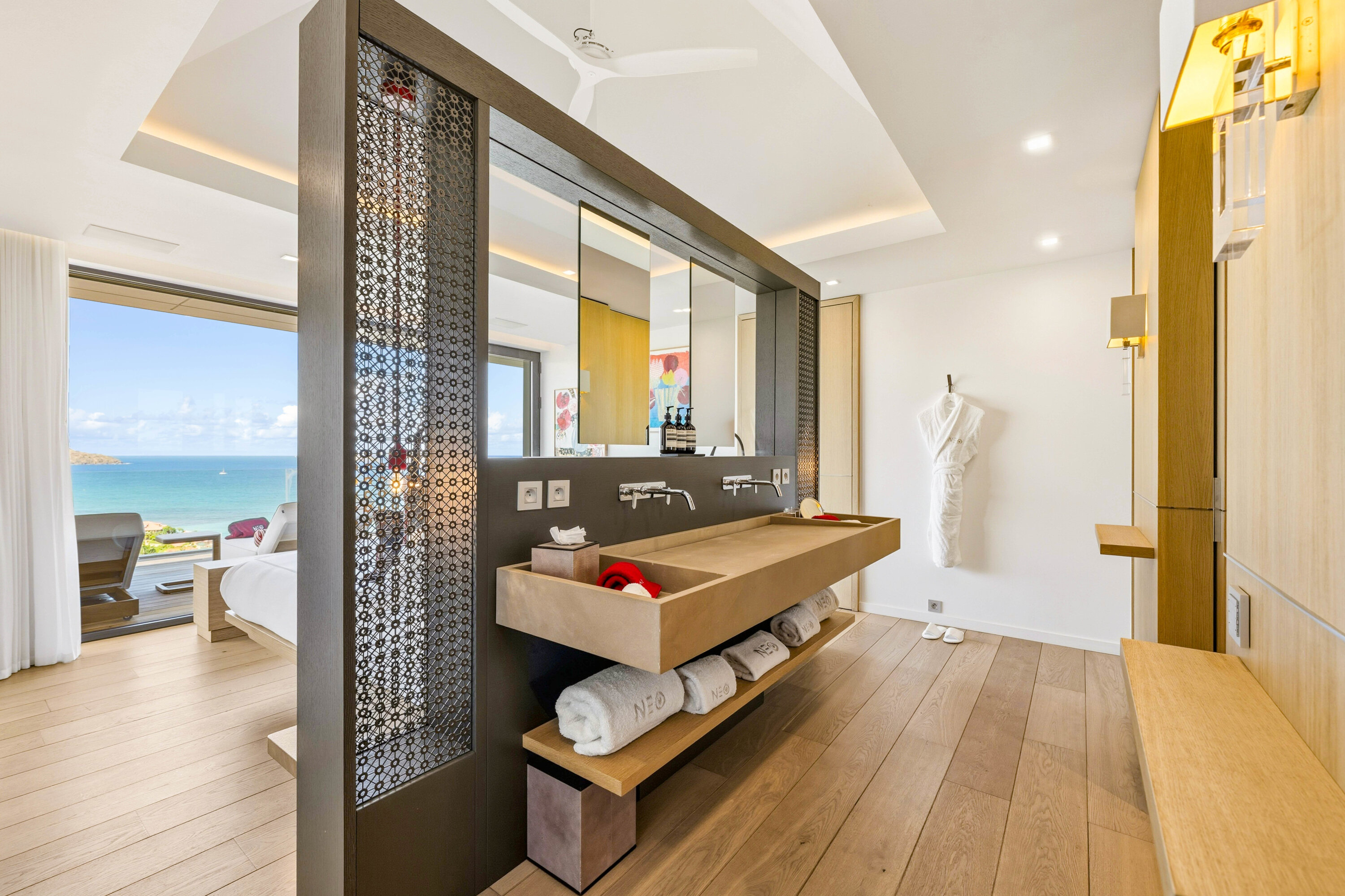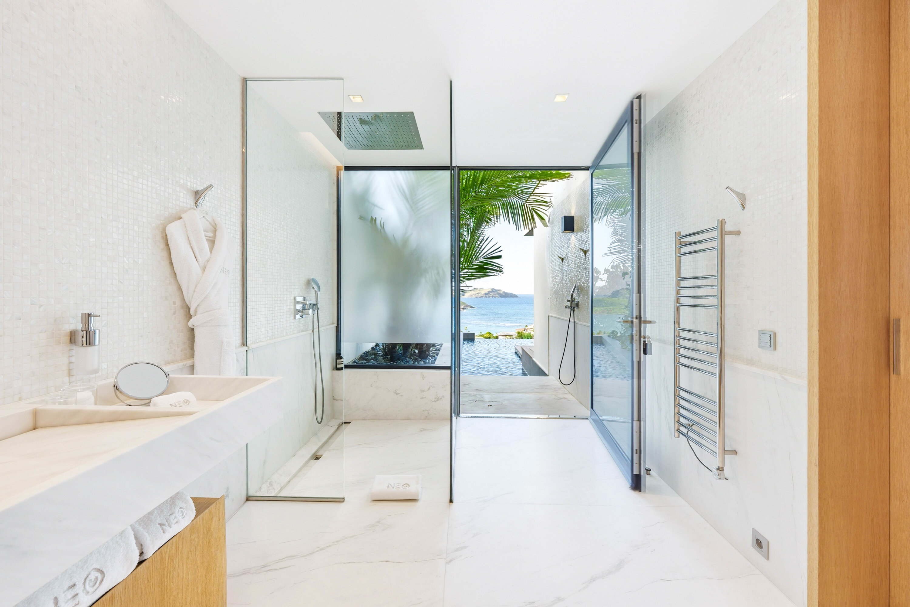 The bedrooms spread across Villa Neo, each a quiet and luxurious place to recharge. On the main level are the first three bedrooms, including the decadent master suite. This room features a separate seating area and a private terrace with direct access to the pool. The large ensuite has a lavish bathtub, as well as an indoor and outdoor shower. The second bedroom is on the other side of Villa Neo, behind the kitchen. This bedroom also has direct access to the terrace and ocean views. The third bedroom on this level is located off the inner courtyard, with partial ocean views.