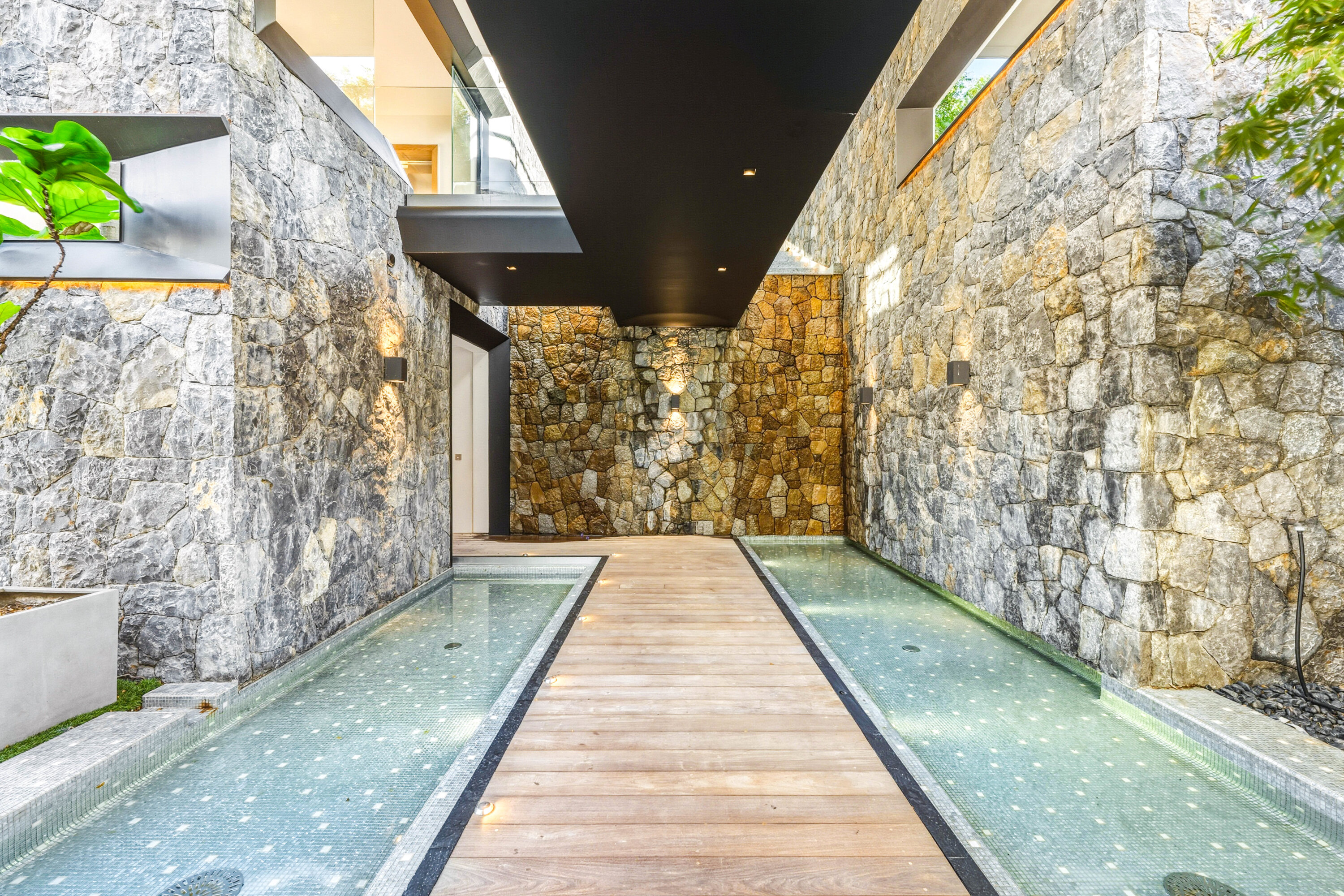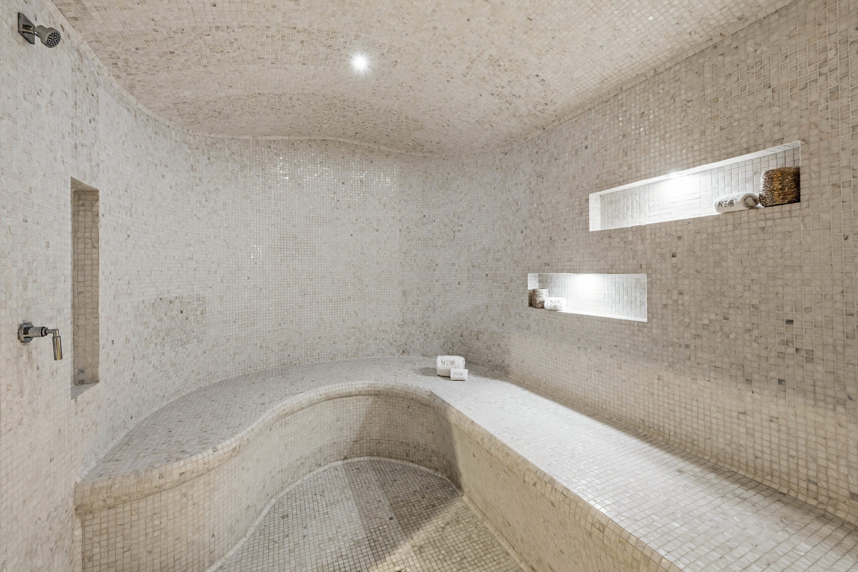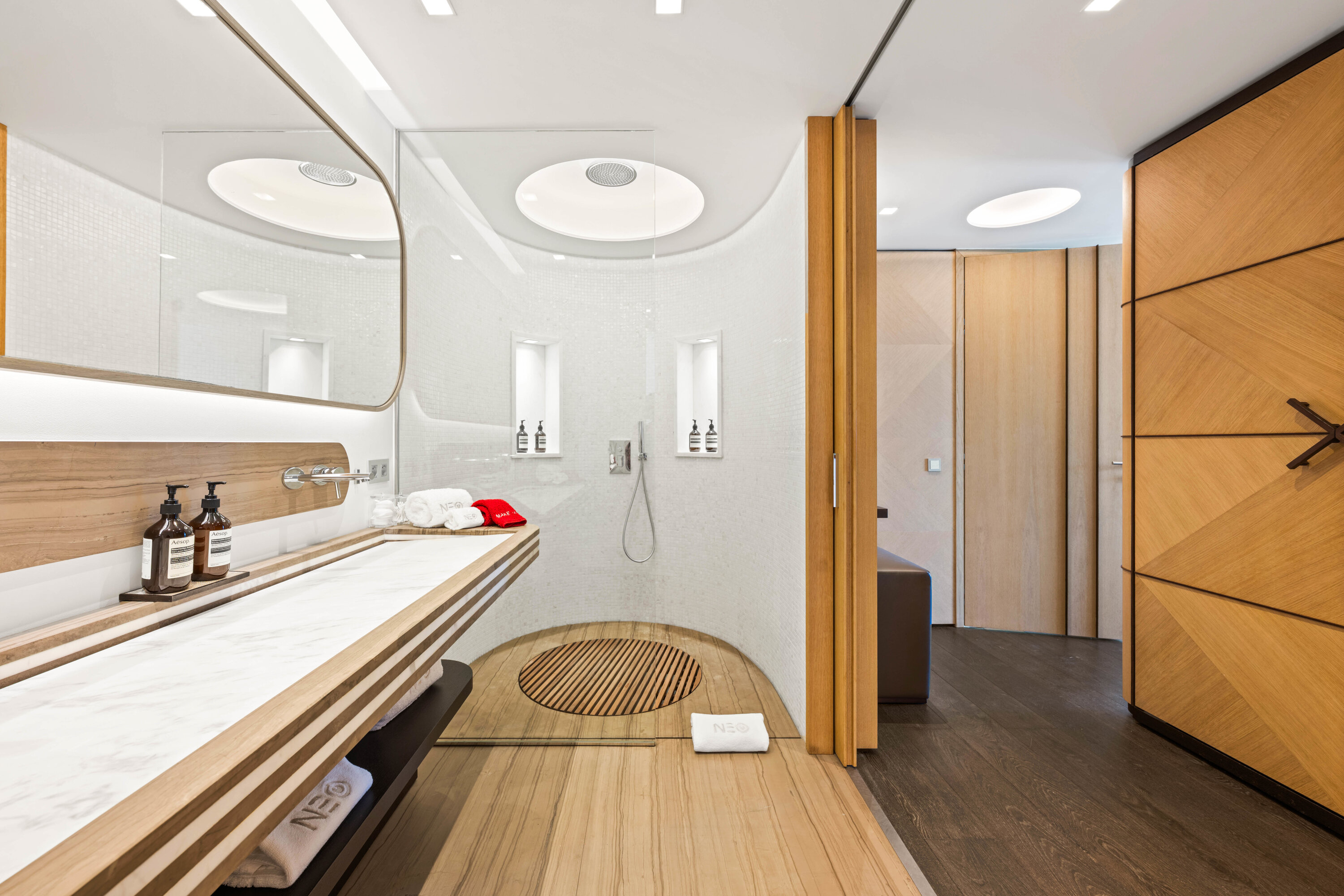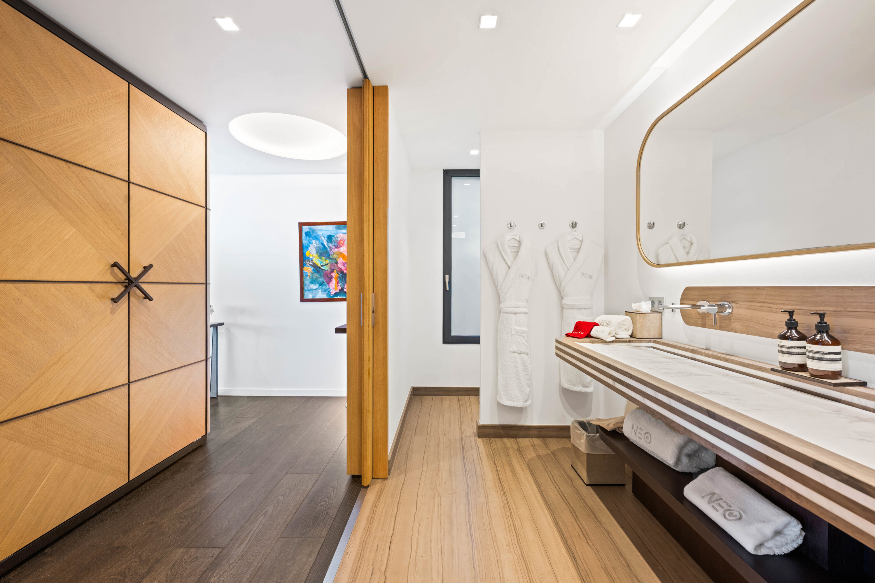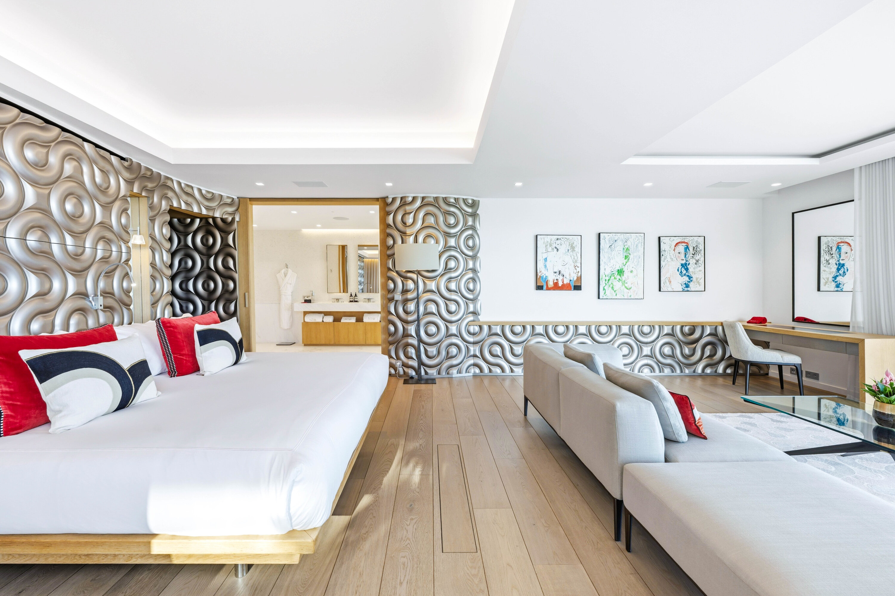 The bedrooms spread across Villa Neo, each a quiet and luxurious place to recharge. On the main level are the first three bedrooms, including the decadent master suite. This room features a separate seating area and a private terrace with direct access to the pool. The large ensuite has a lavish bathtub, as well as an indoor and outdoor shower. The second bedroom is on the other side of Villa Neo, behind the kitchen. This bedroom also has direct access to the terrace and ocean views. The third bedroom on this level is located off the inner courtyard, with partial ocean views.