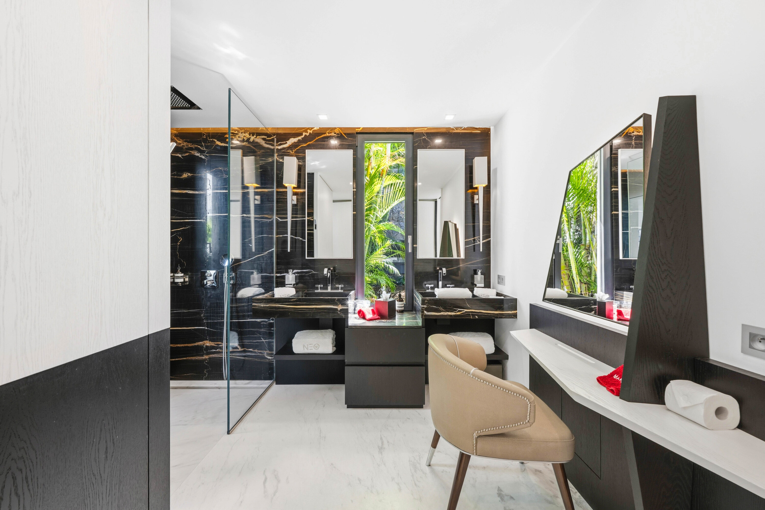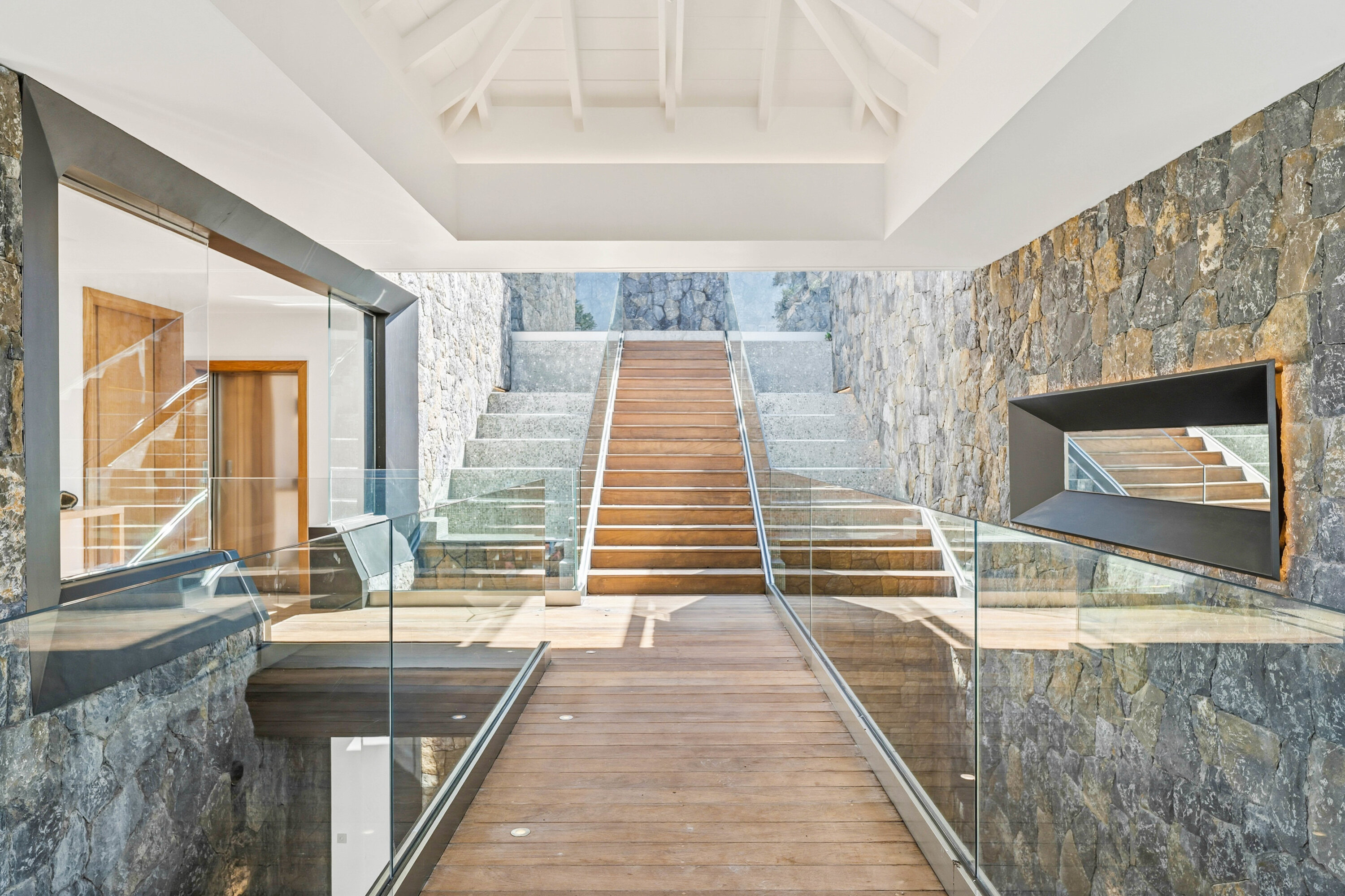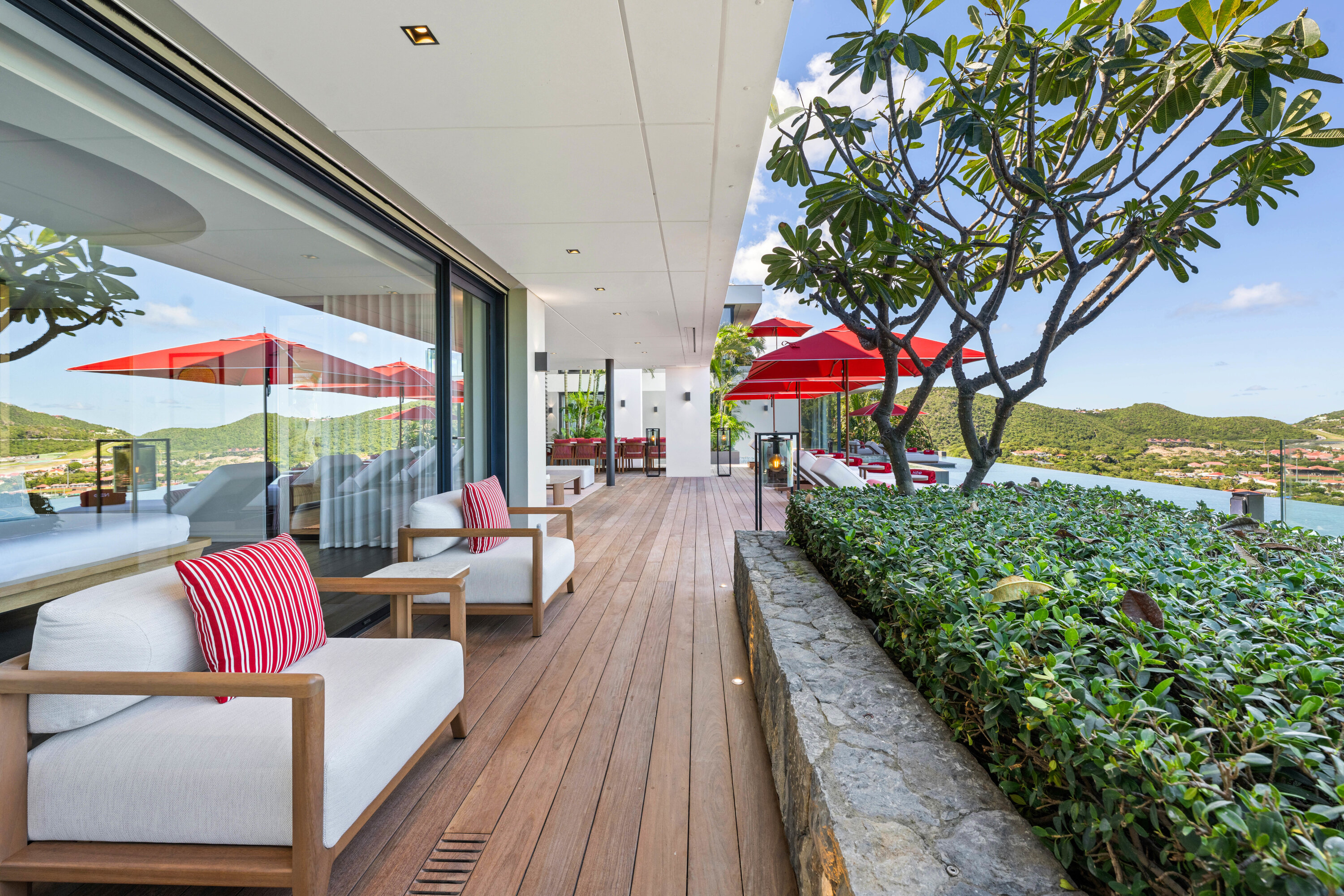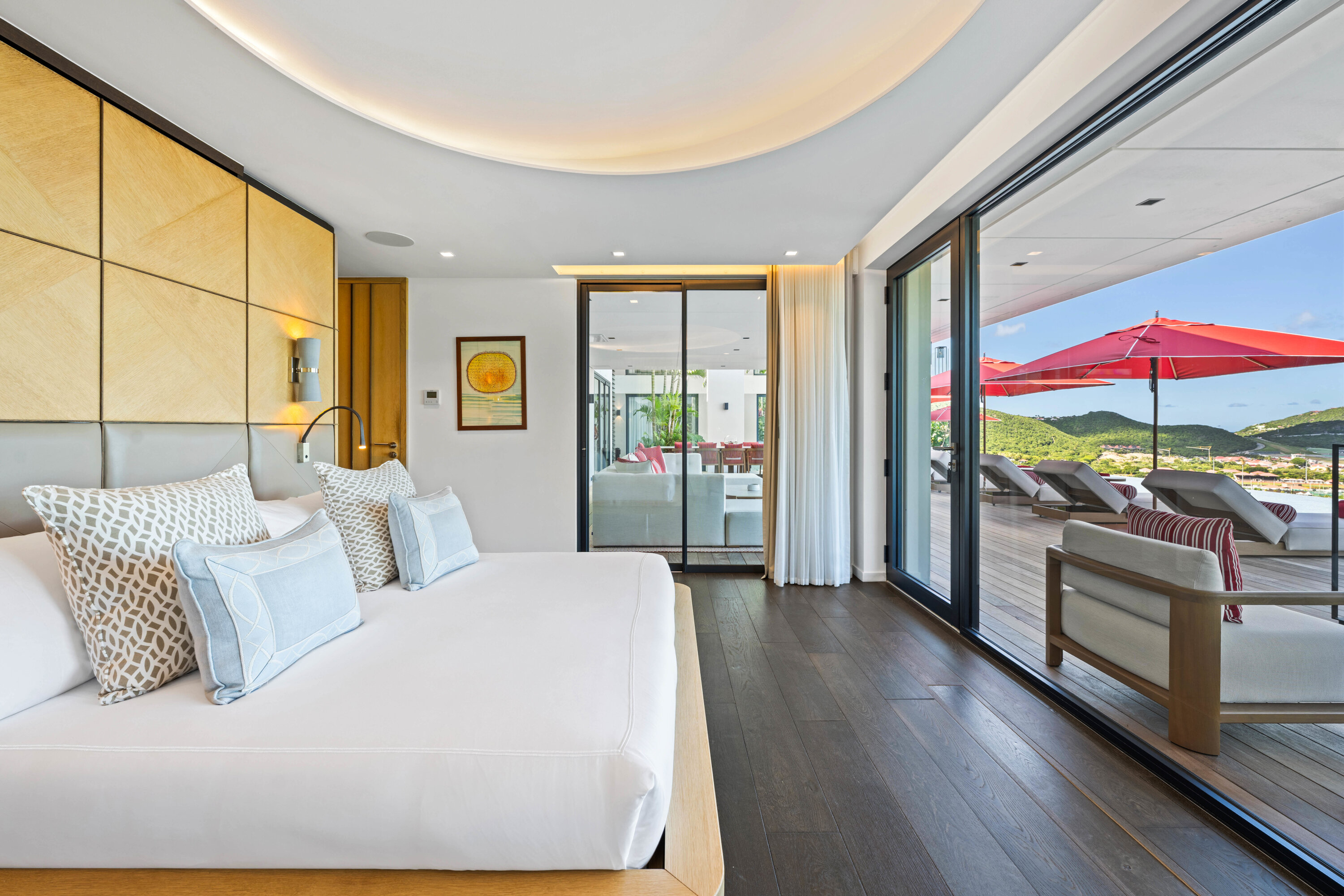 A glass stairway leads to the upper level, which can also be accessed directly from the parking area. Two bedrooms on this level connect, sharing their own private furnished terrace. The third bedroom on this level features a seating, dressing area, and a private terrace with loungers.