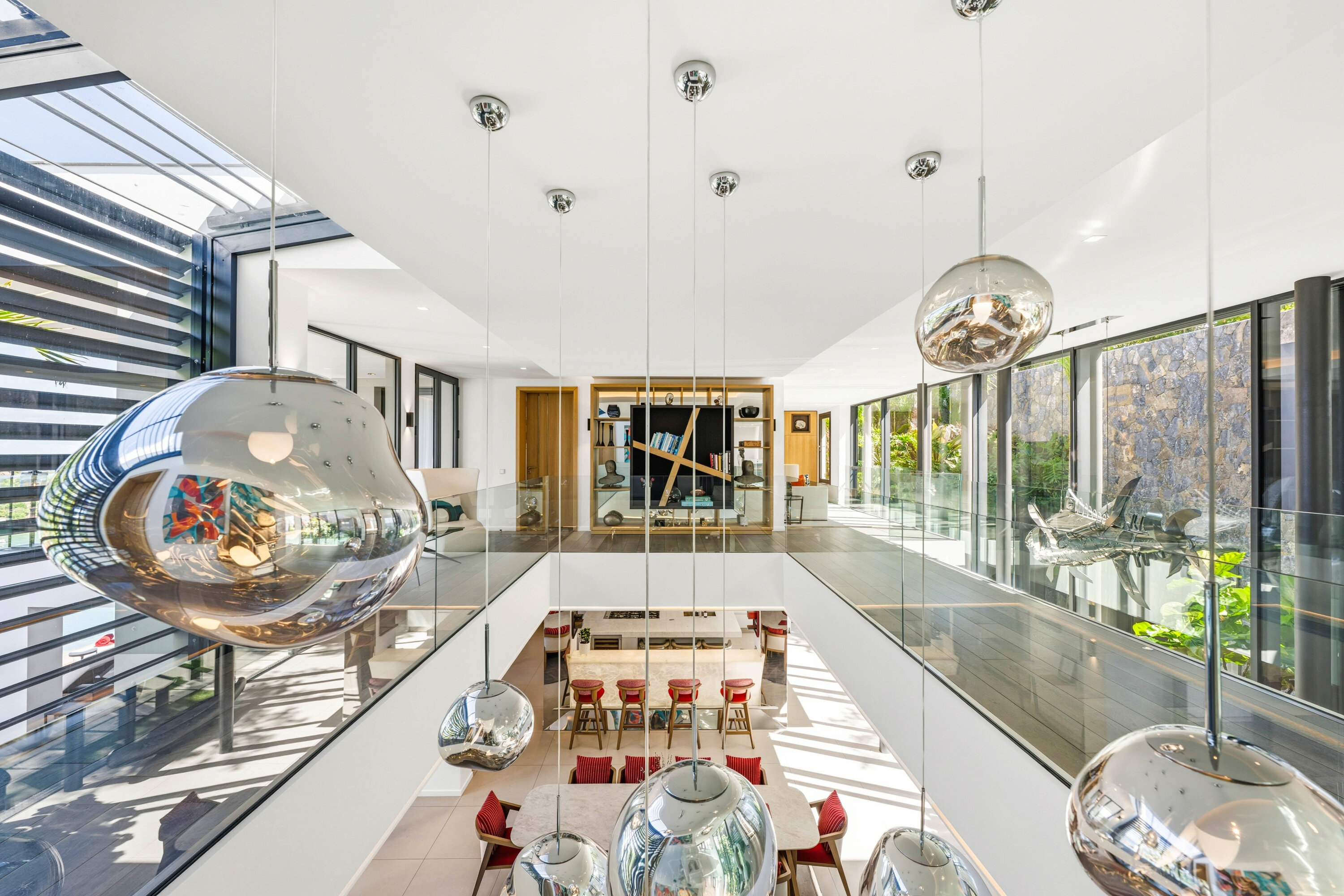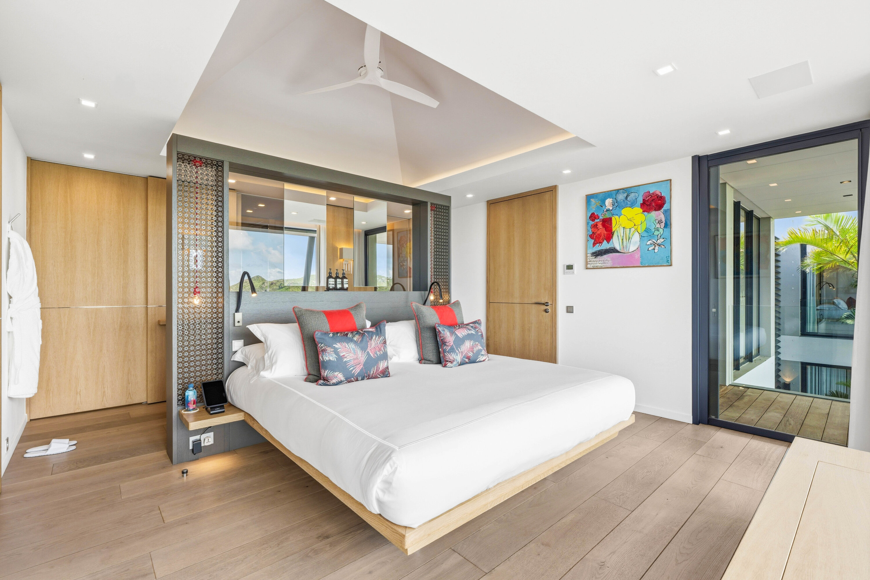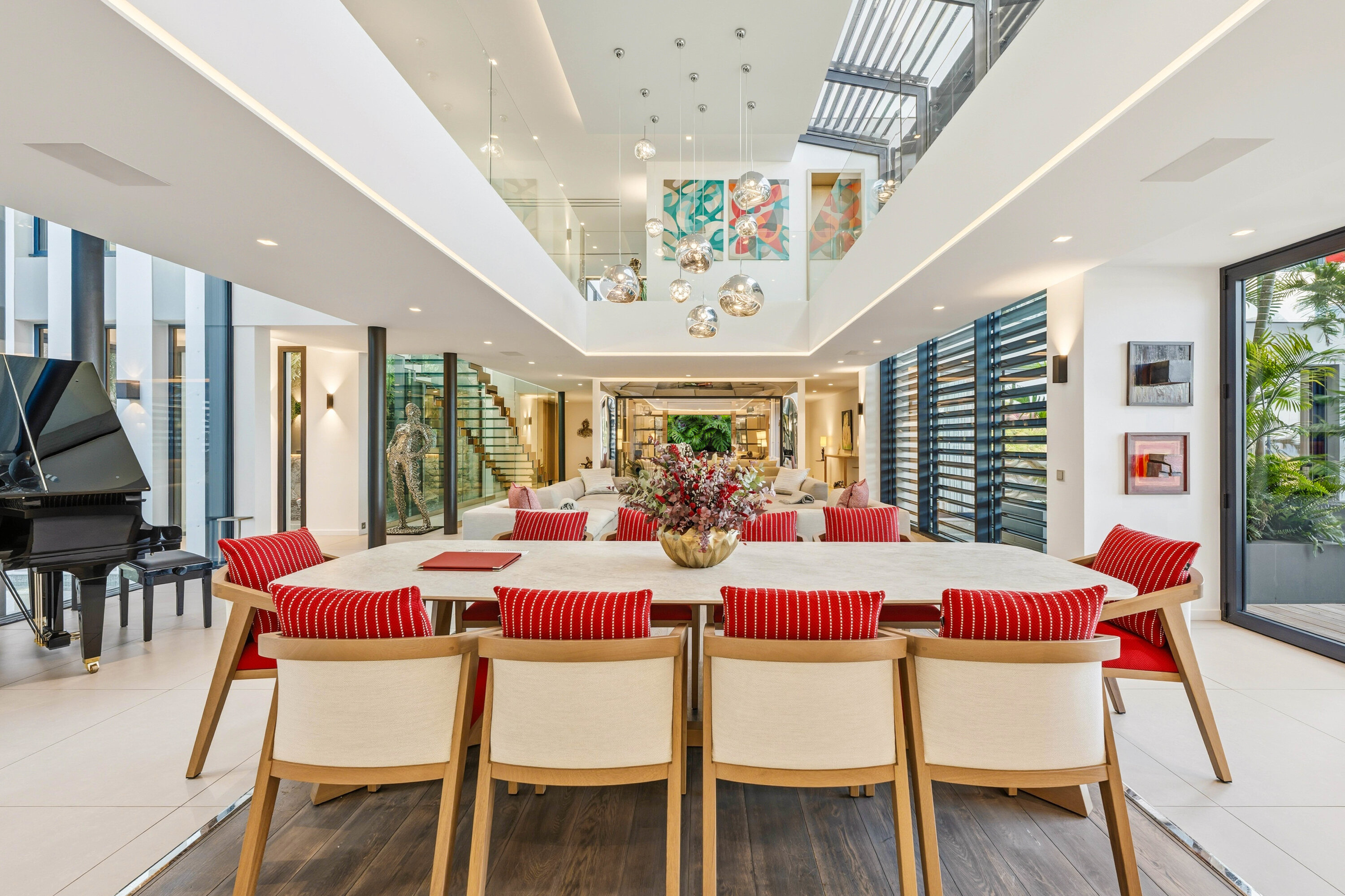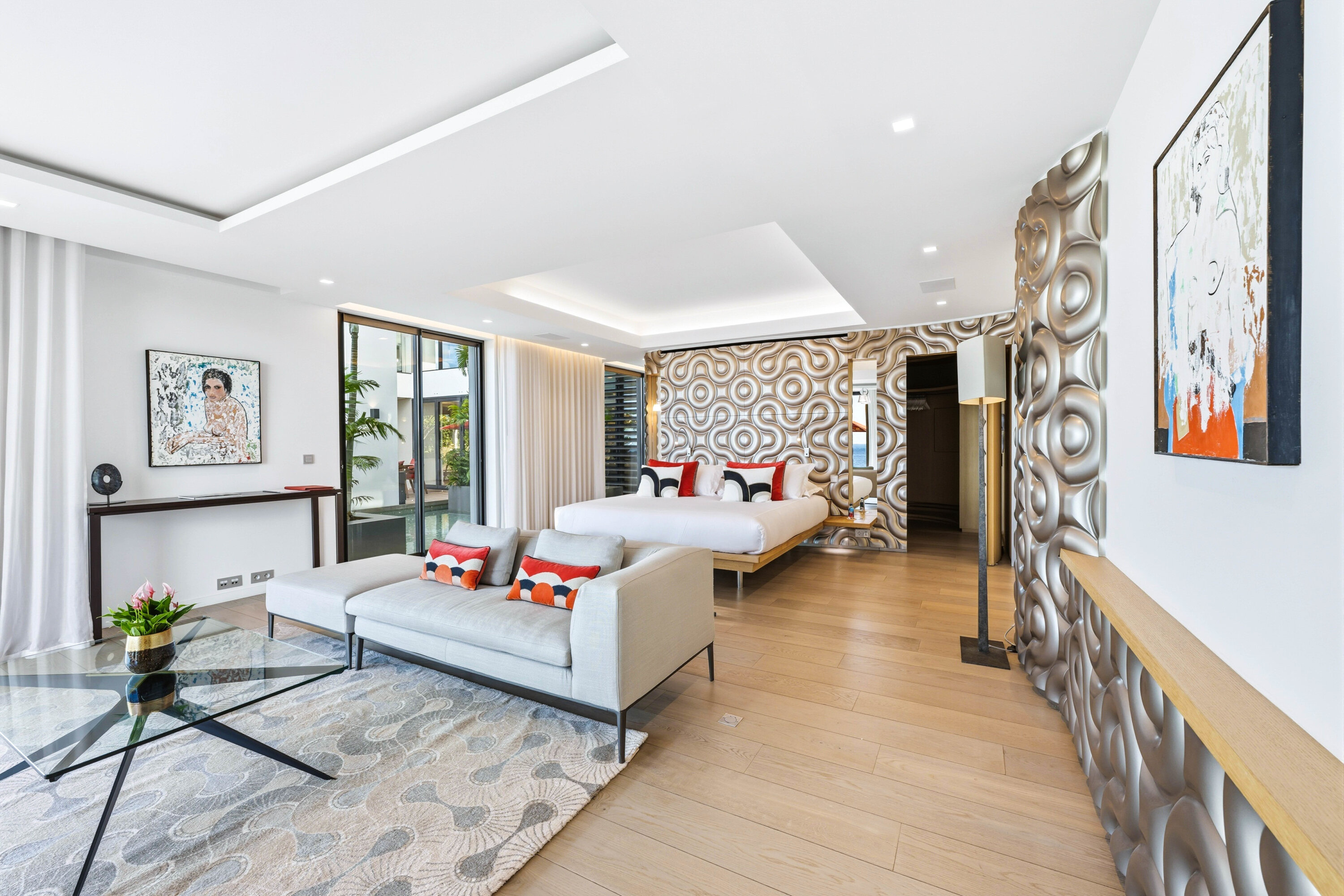 A glass stairway leads to the upper level, which can also be accessed directly from the parking area. Two bedrooms on this level connect, sharing their own private furnished terrace. The third bedroom on this level features a seating, dressing area, and a private terrace with loungers.