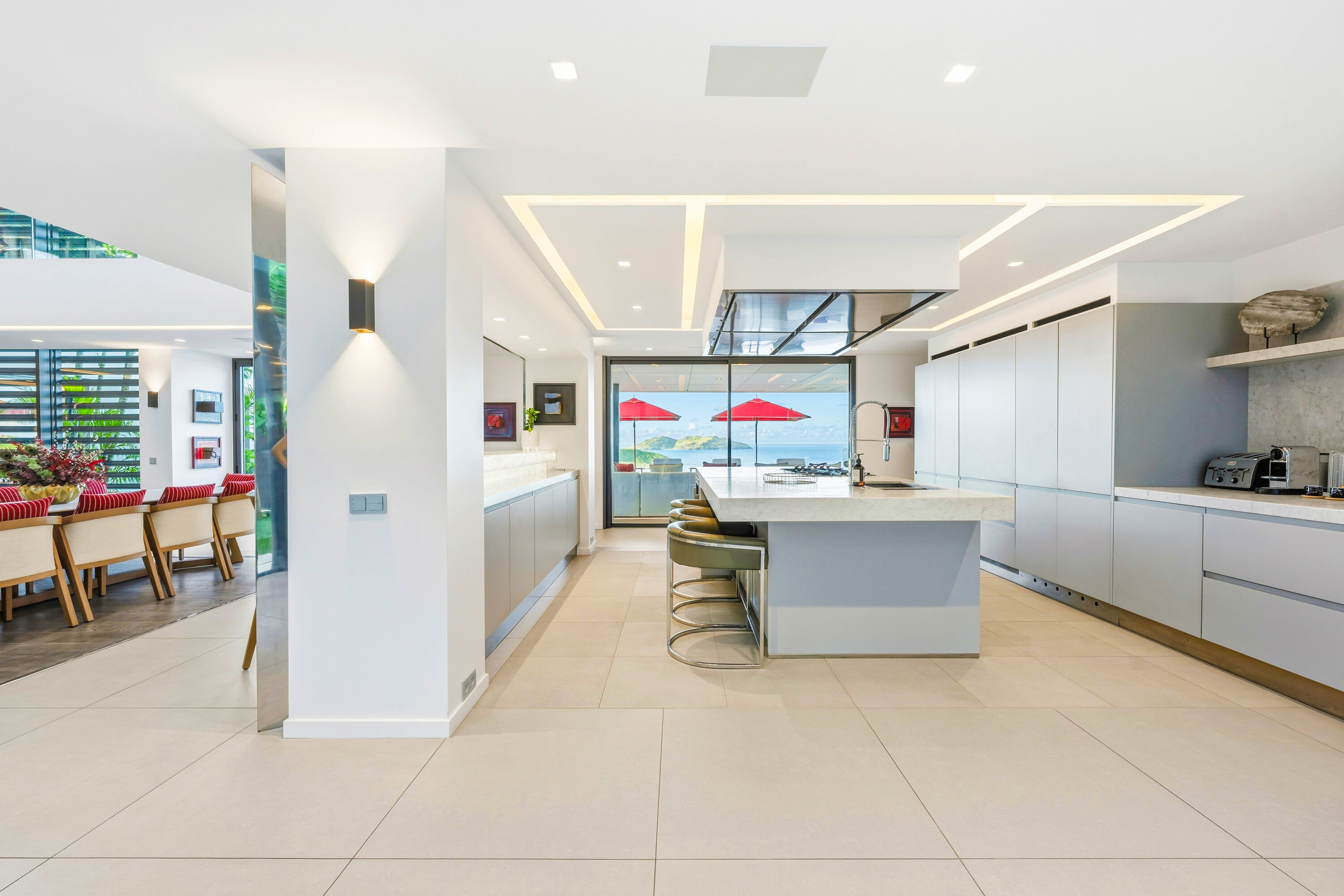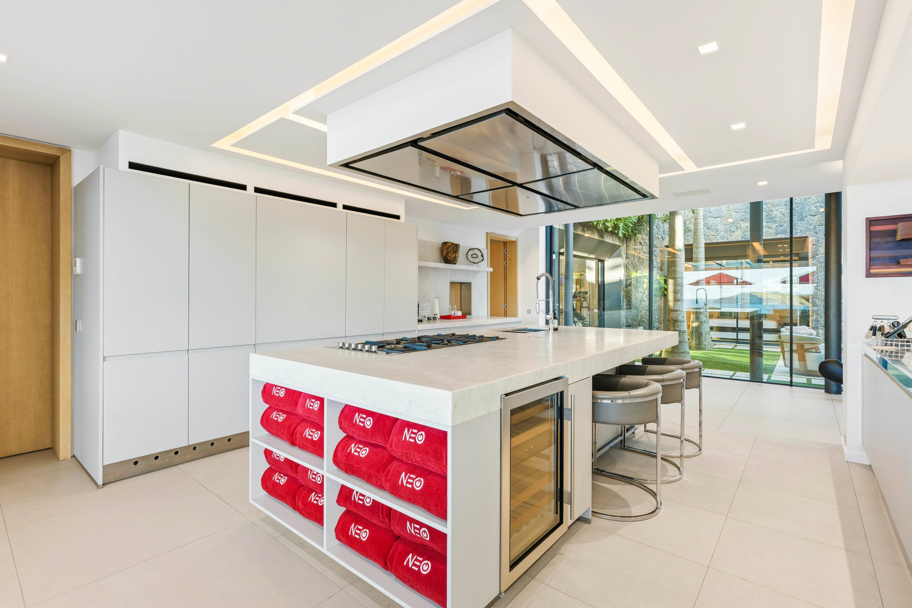 The modern and well-equipped kitchen at Villa Neo makes cooking a breeze. Our concierge can even organize grocery pre-stocking or delivery, catered meals, or arrange a private chef service for a special occasion.