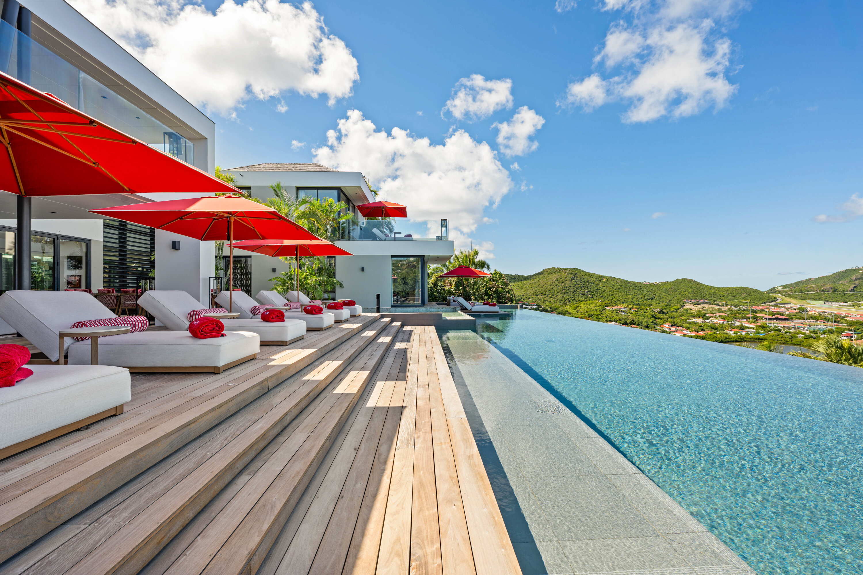 The deck continues down towards the heated pool, one of the largest on the island. Refreshing and cool, you could lounge in the water all day, gazing out at those views. Below the pool is an outdoor bar, where you can toast to your island vacation.