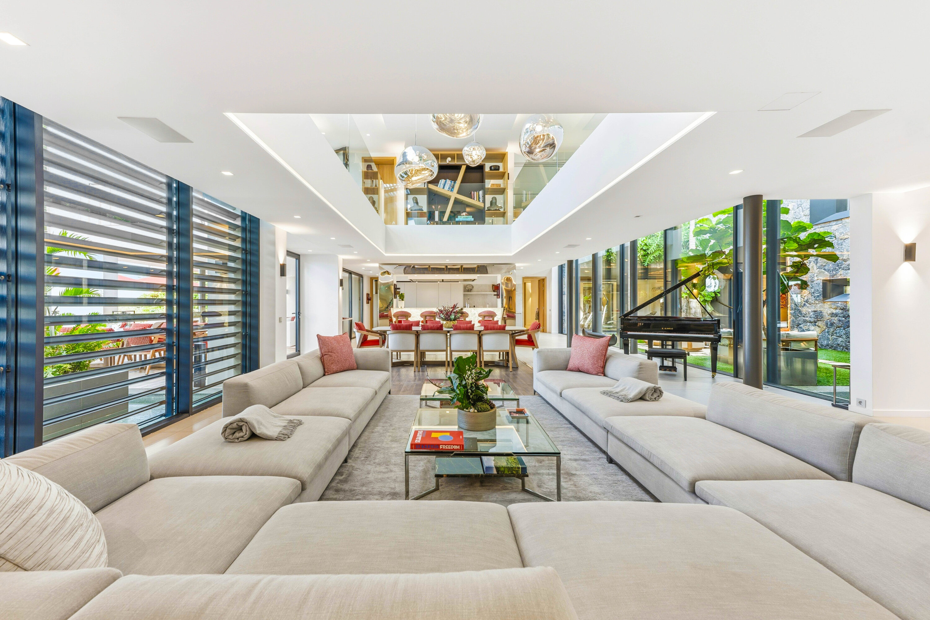 Soft, sectional sofas in the living room are luxurious spots to unwind or settle in for some conversation with family and friends. The light fixture above is eye-catching, hanging down from the tall ceilings.
