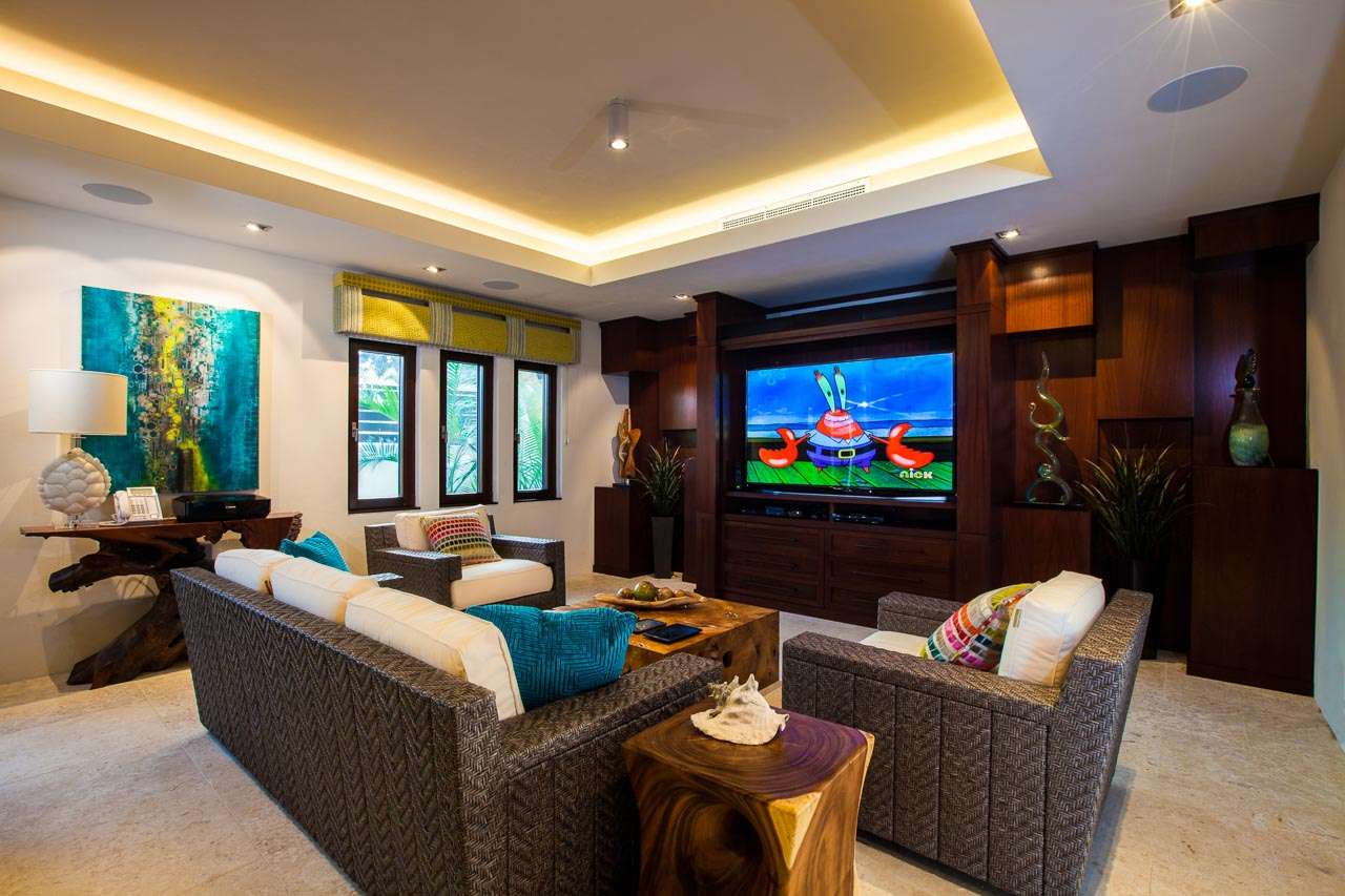 To the right is the media lounge, featuring a 70” TV with a Blu-ray player and XBox gaming console. With a Sonos sound system and complimentary Netflix access, this is a fantastic place to unwind with a movie or your favorite series. The guest house also features a home movie theatre, with a 120” high-definition black diamond screen and nine reclining leather seats.