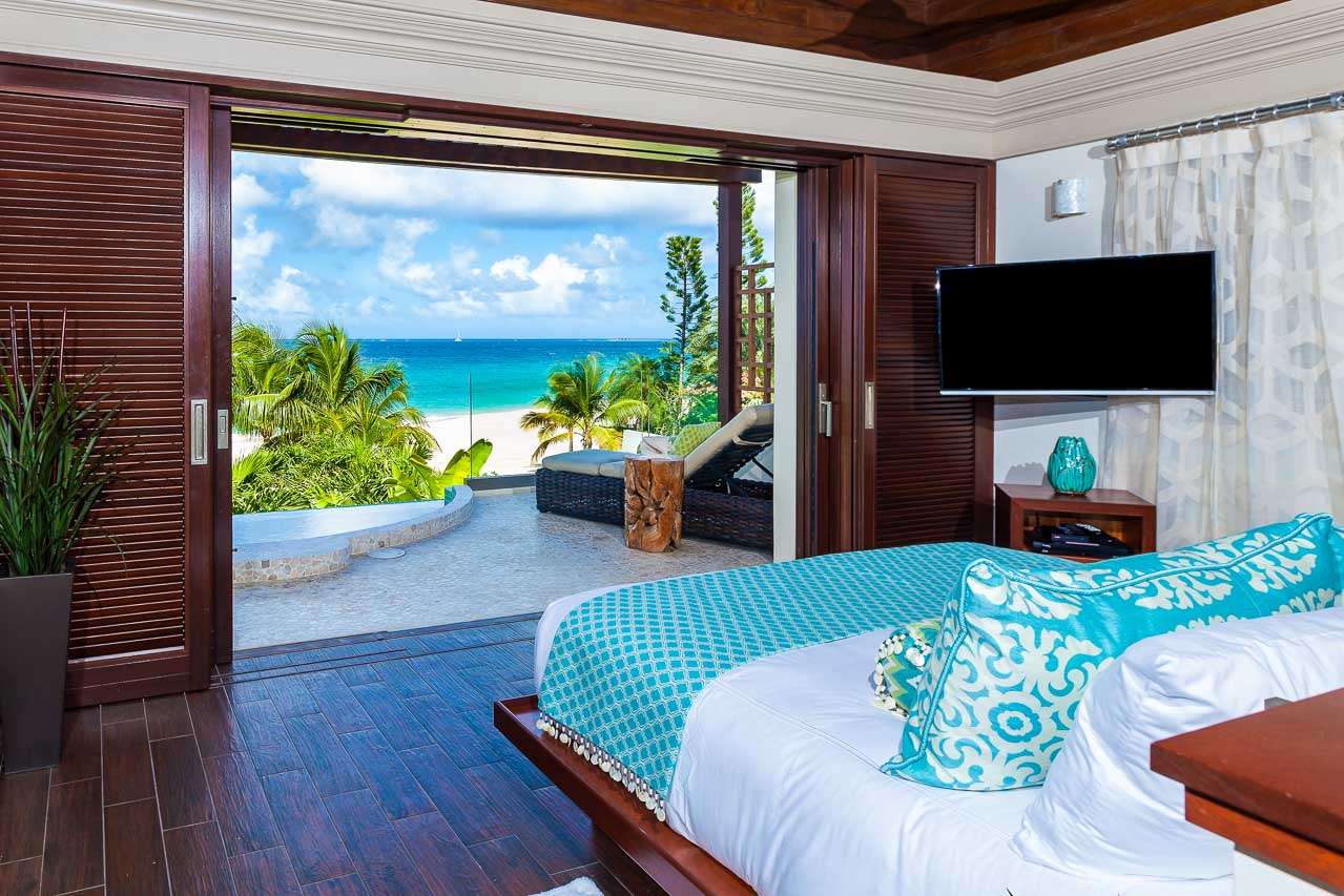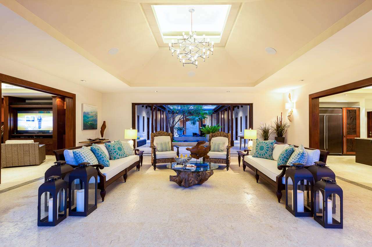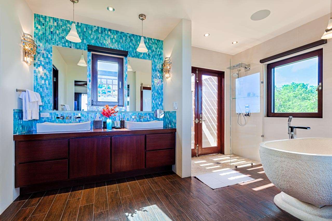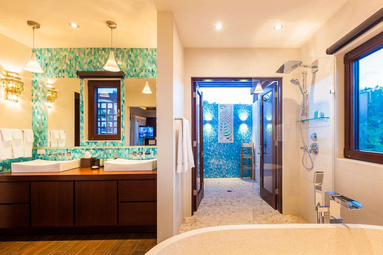 Balinese-inspired architecture and décor create a relaxing atmosphere throughout, with integrated indoor and outdoor living spaces. From everywhere, open vistas of the sparkling Caribbean are framed by the doors and windows. The centerpiece is a Japanese courtyard with a traditional garden, water feature, and beautiful Balinese temple doors.