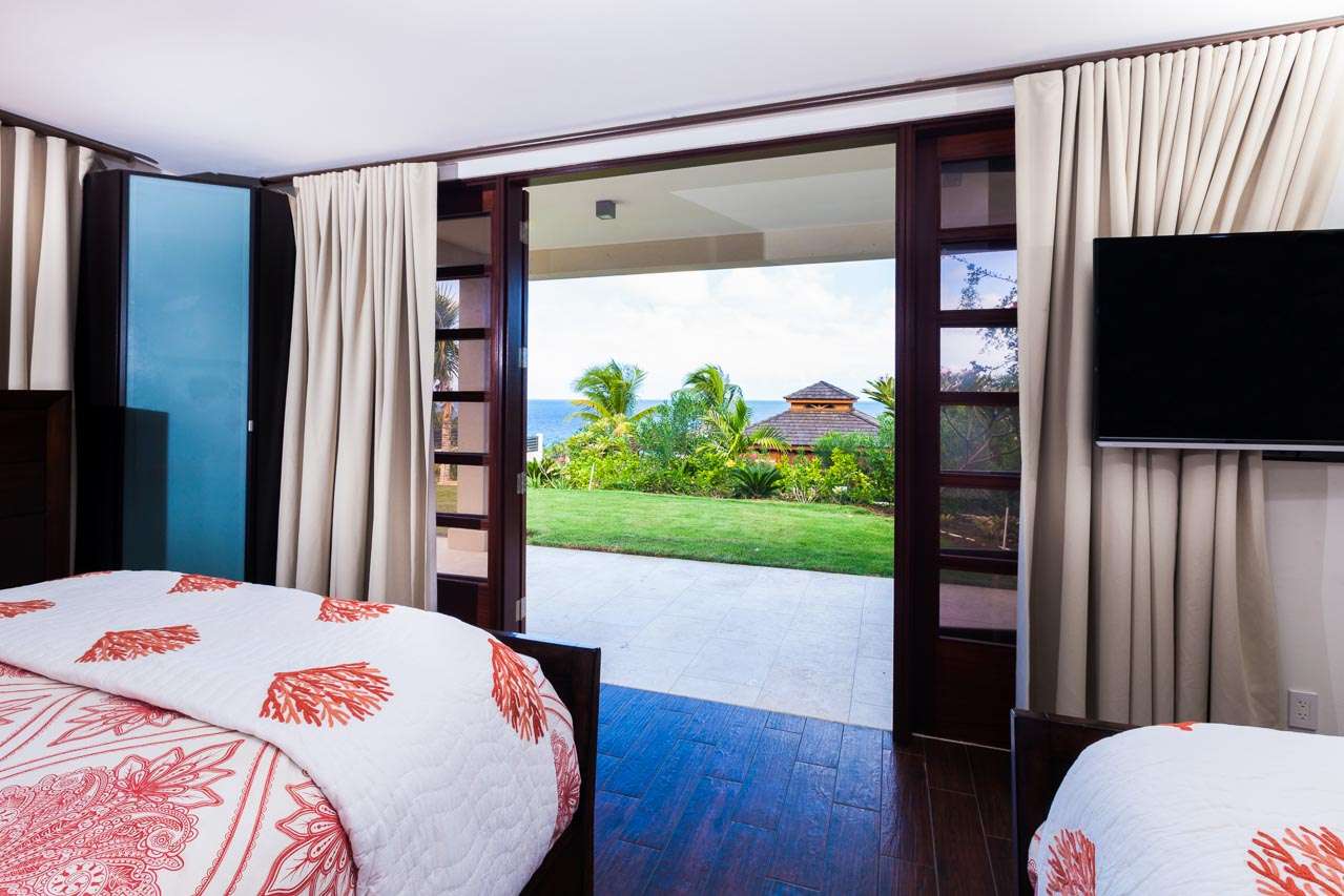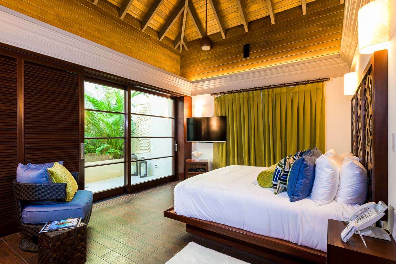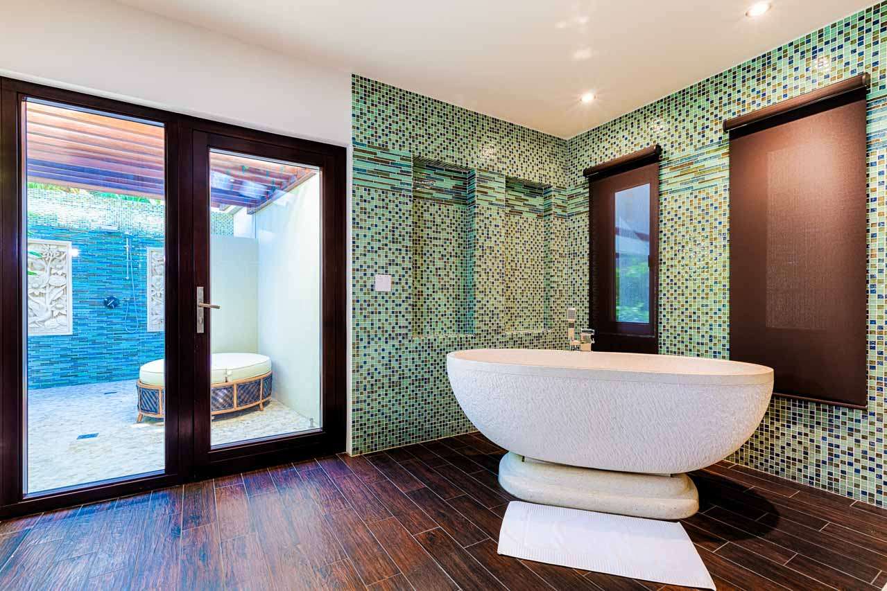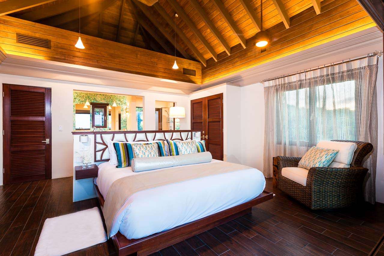 Balinese-inspired architecture and décor create a relaxing atmosphere throughout, with integrated indoor and outdoor living spaces. From everywhere, open vistas of the sparkling Caribbean are framed by the doors and windows. The centerpiece is a Japanese courtyard with a traditional garden, water feature, and beautiful Balinese temple doors.