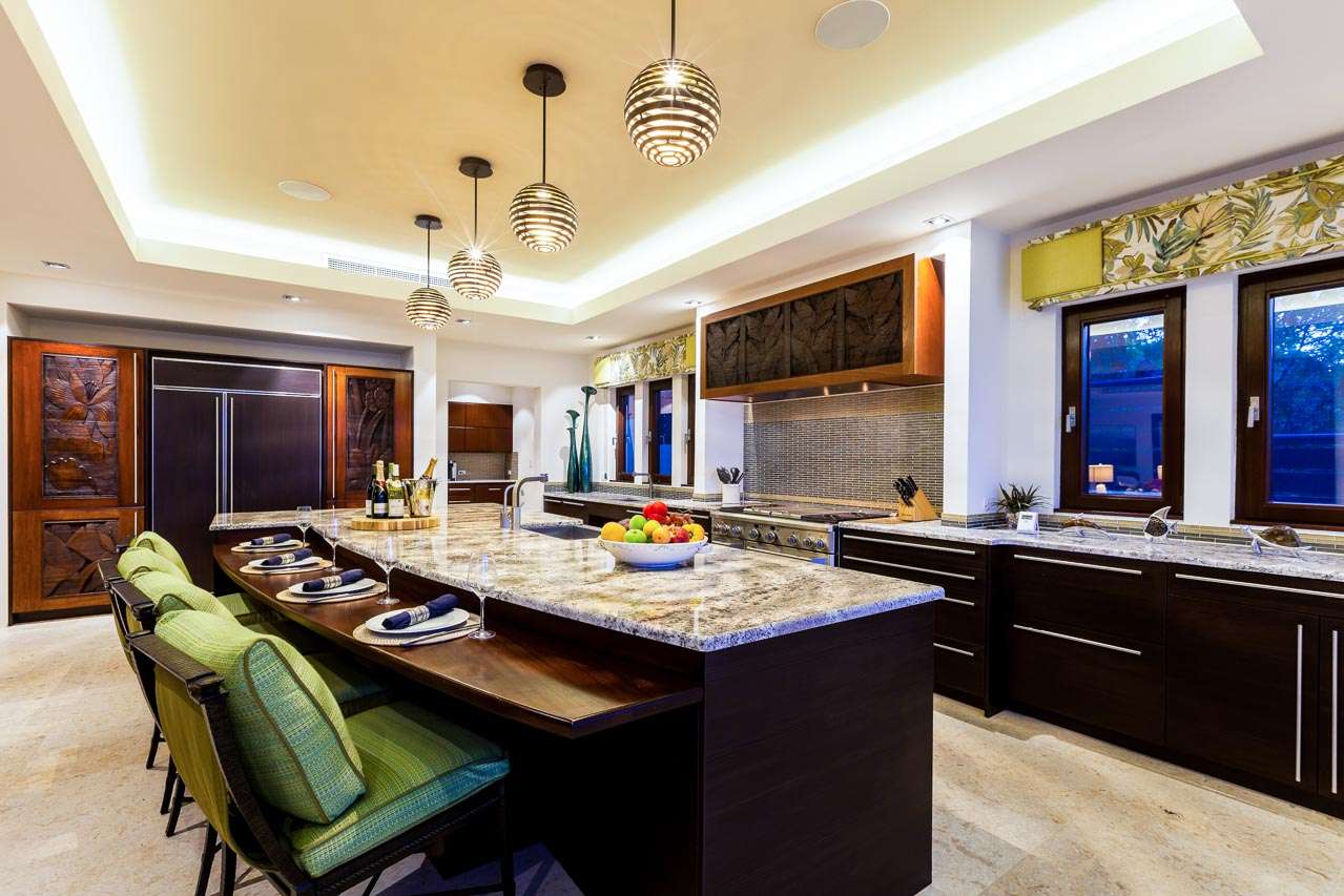 Island seating is a fantastic spot for a casual breakfast or morning espresso. Fully-retractable doors lead from the kitchen onto the covered terrace, where the dining table is a magnificent setting for alfresco meals in paradise.