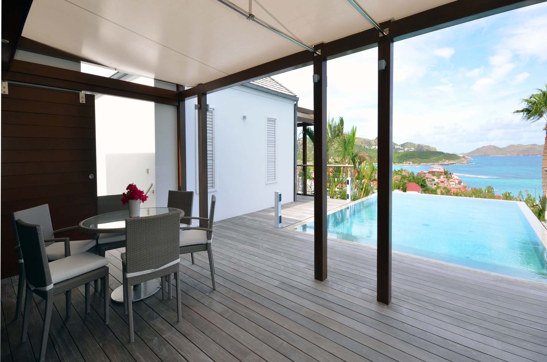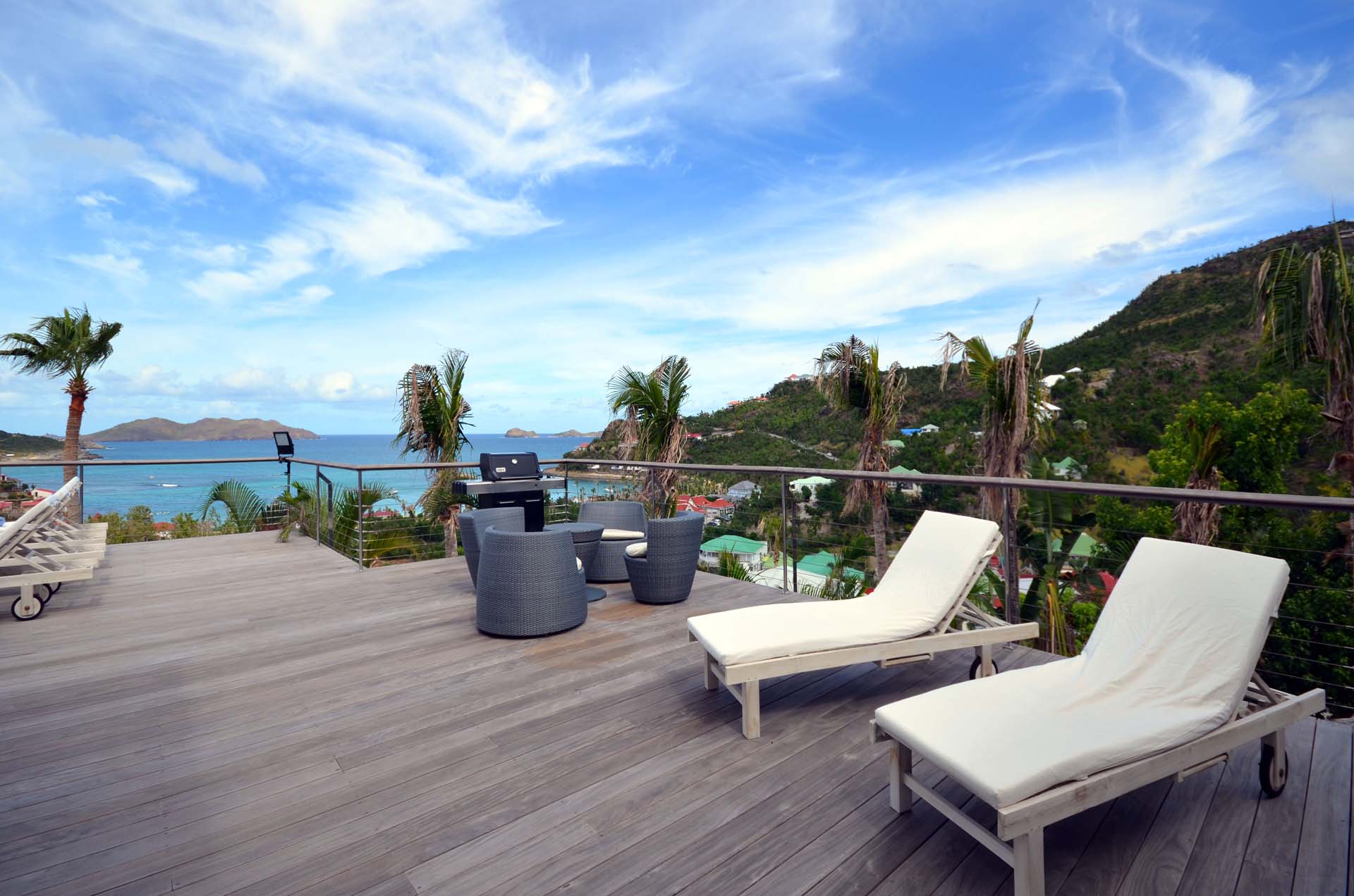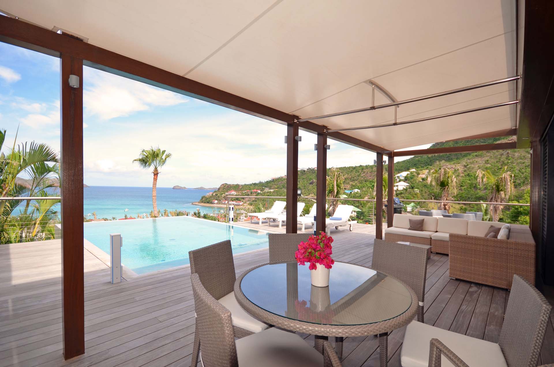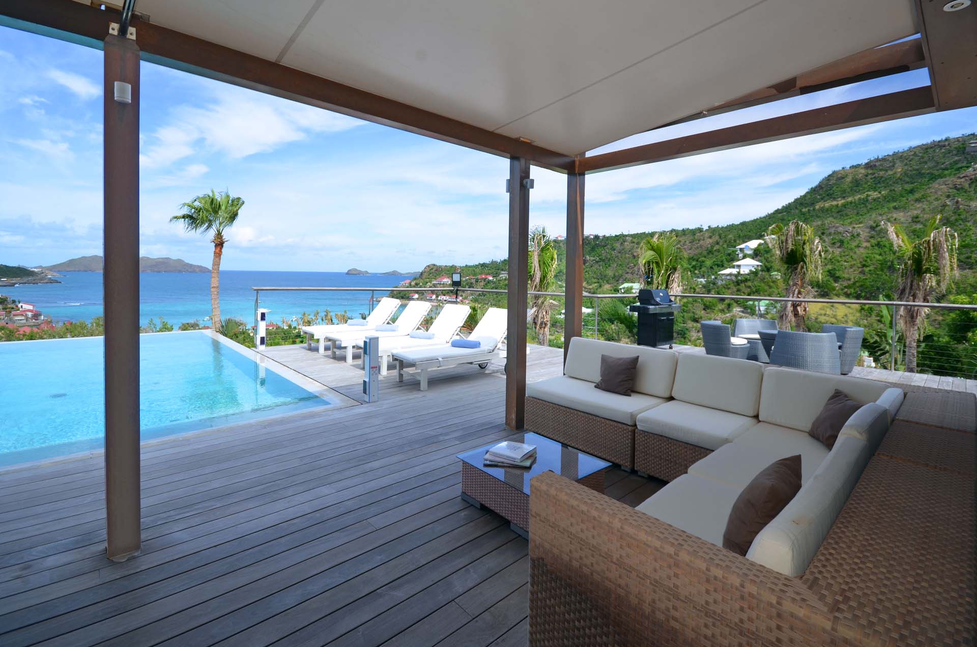 Poised hillside in popular St. Jean, this 3 bedroom villa offers casually elegant comfort making it ideal for a St. Barth villa vacation. An infinity edge pool is the focal point of an expansive deck and is an optimum spot to relax – toes up – and take in the stunning views, delightful breezes and the sound of rustling palms. A pergola is comfortably furnished for outdoor living and dining. Compact and sleek, the kitchen is outfitted to please a gourmet cook. It opens to a dining area that flows into the living space - ideal for TV viewing (Apple TV). The 3 spacious air-conditioned bedrooms all have en suite baths. Two (with king beds) are at opposite ends of the villa; pool level, they boast ocean views. The third is lower-level (its king bed is convertible to twins) and has a garden view. All are nice retreats.St.Jean Beach is just a short (but steep) walk away.Please fill out the form to begin your inquiry and we will connect you with a seasoned villa rental specialist.